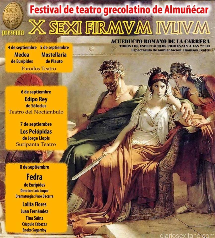 La obra “Fedra”, protagonizada por Lolita, pone el broche final este sábado, a las 22 horas, al X Festival Grecolatino “Sexi Iulium Firmum” de Almuñécar que se viene celebrando desde el pasado martes en el auditorio del Acueducto romano y que, por anuncio de lluvia, se traslada esta representación hasta el escenario del teatro José Martín Recuerda de la Casa de la Cultura sexitana.