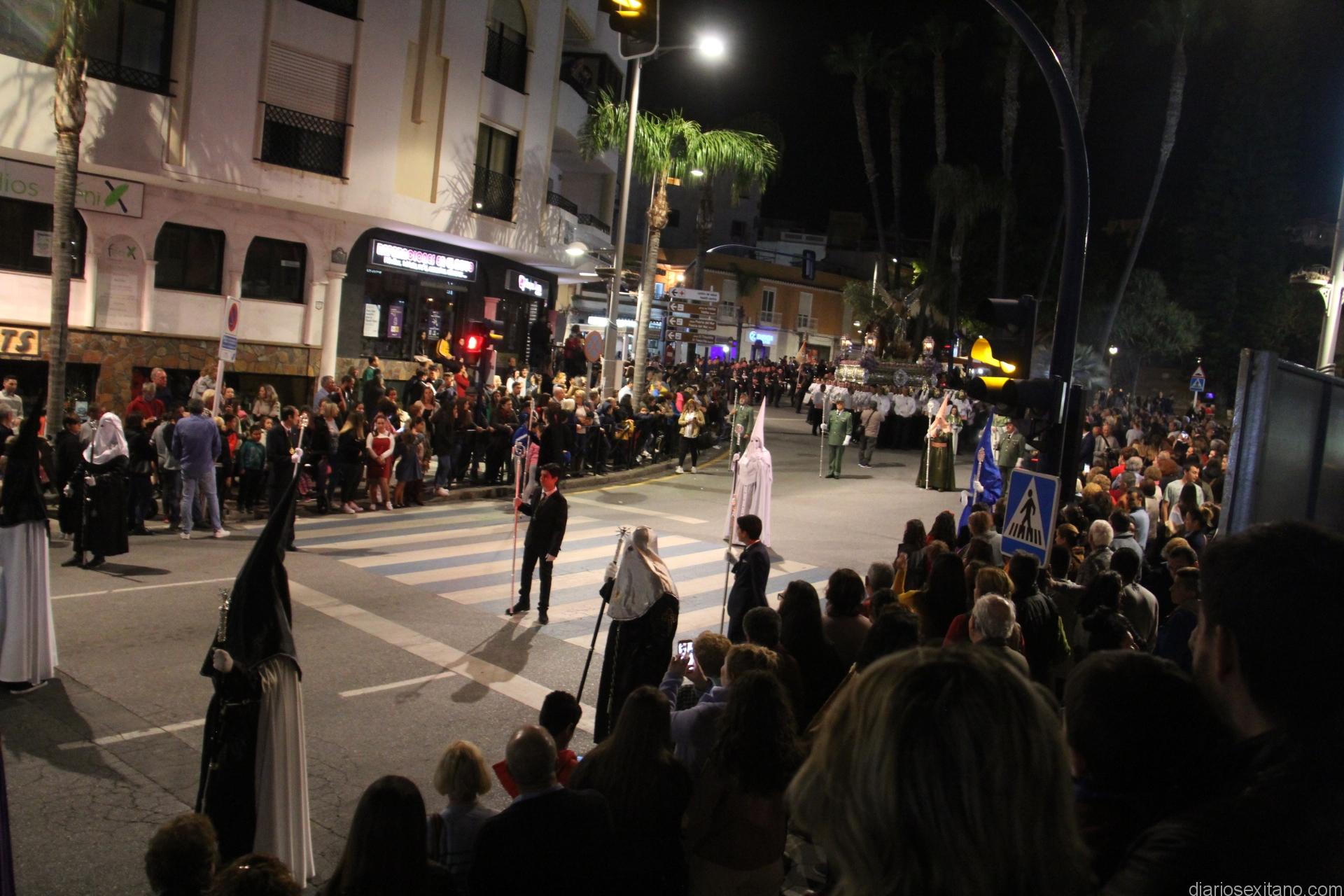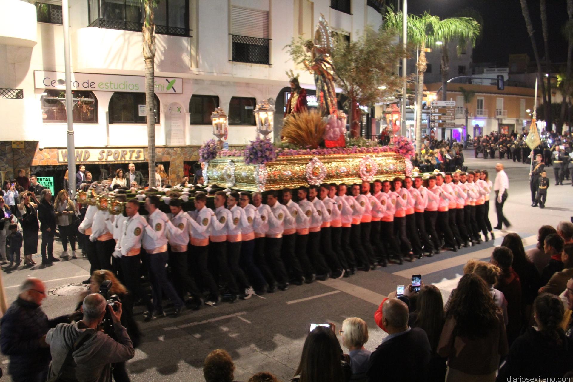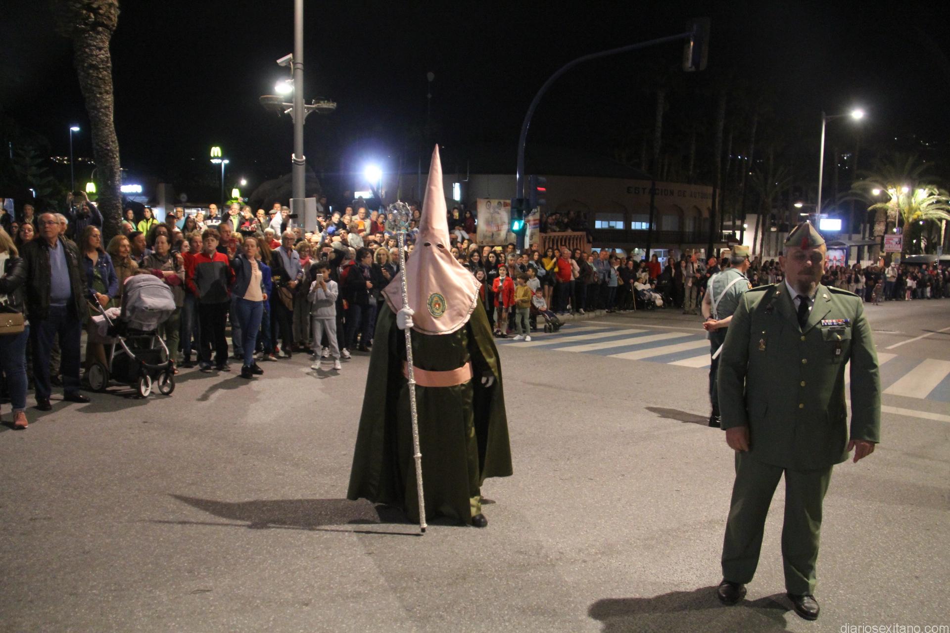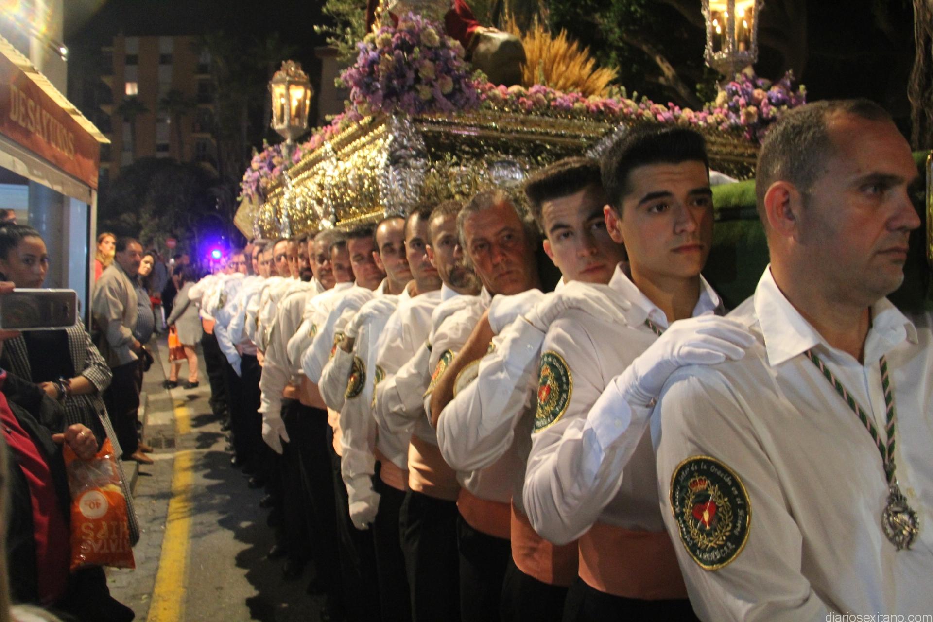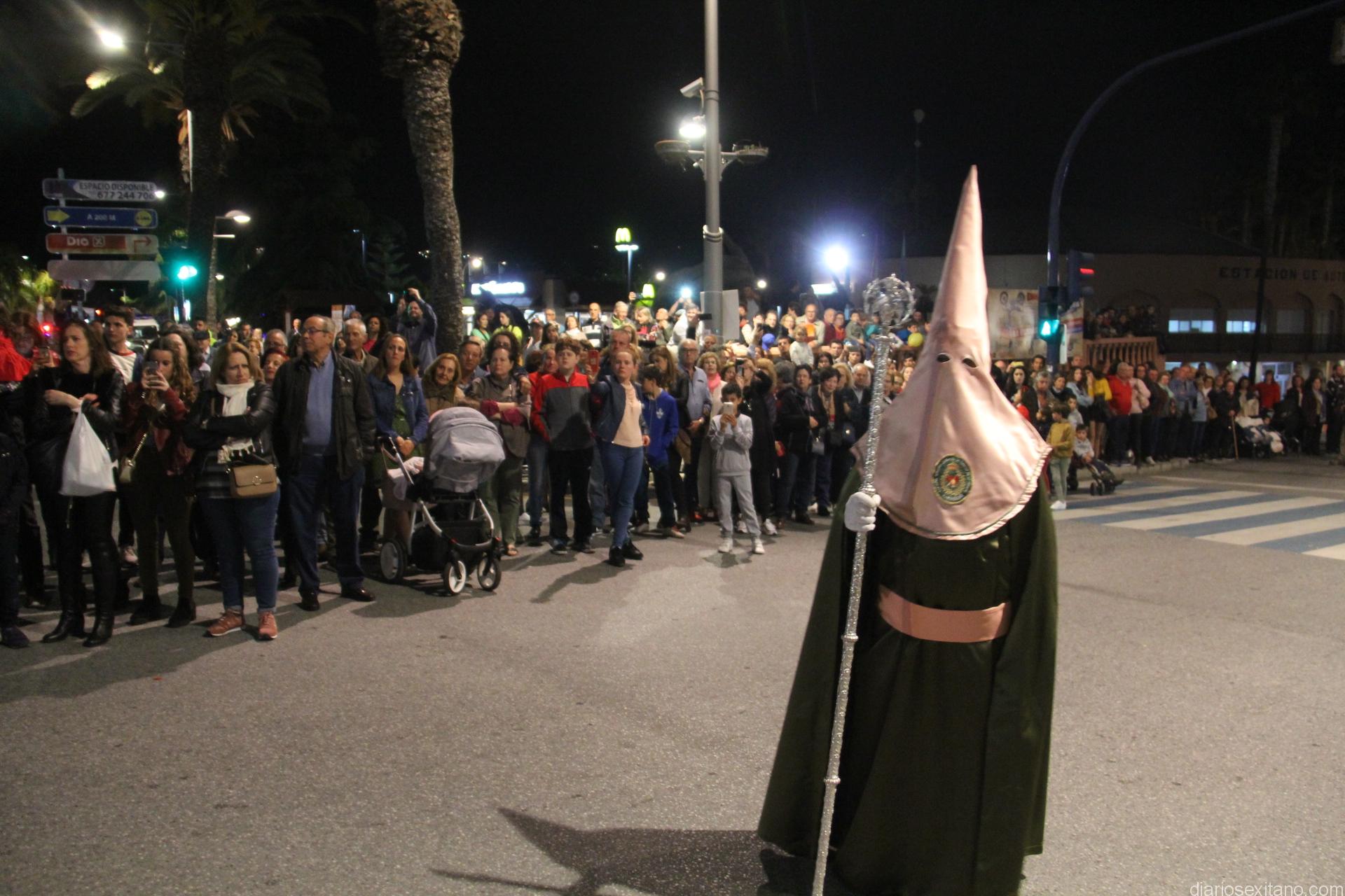 Tal y como estaba previsto, el paso de misterio que talló el imaginero granadino, Miguel Zúñiga, salió del templo parroquial por vigésimacuarta ocasión ya entrada la noche para realizar su recorrido por las calles y avenidas de la localidad sexitana portado por varias decenas de horquilleros. El blanco, salmón y verde oliva eran los colores que destacaban entre la multitud que aguardaba en la Puerta de Granada. Rozando el pórtico de la Encarnación y a los sones del Himno Nacional interpretado por la Agrupación Musical de la Encarnación de Almuñécar comenzaba la cofradía almuñequera la estación de penitencia.