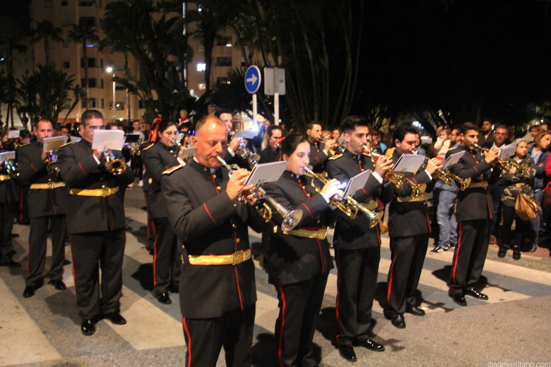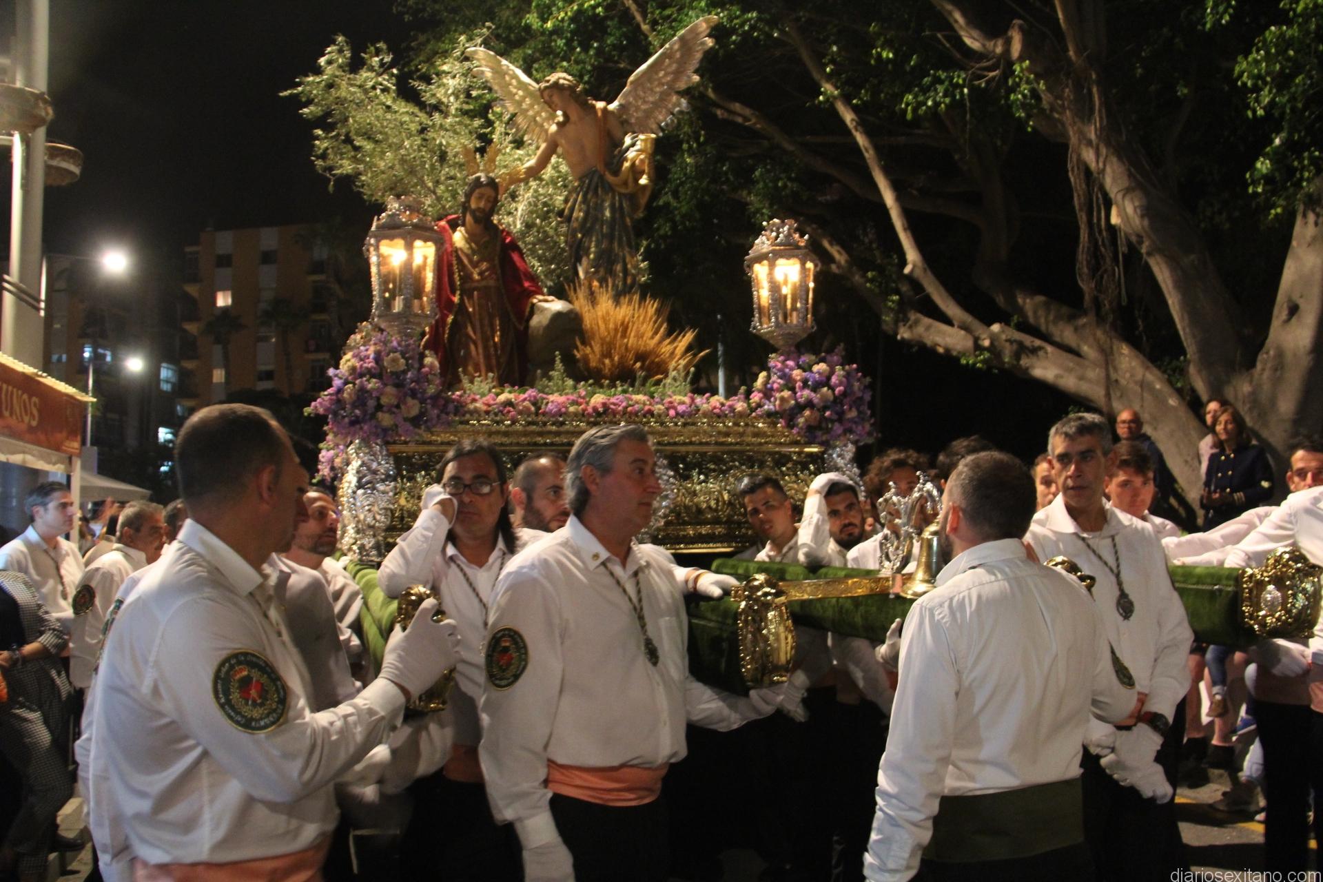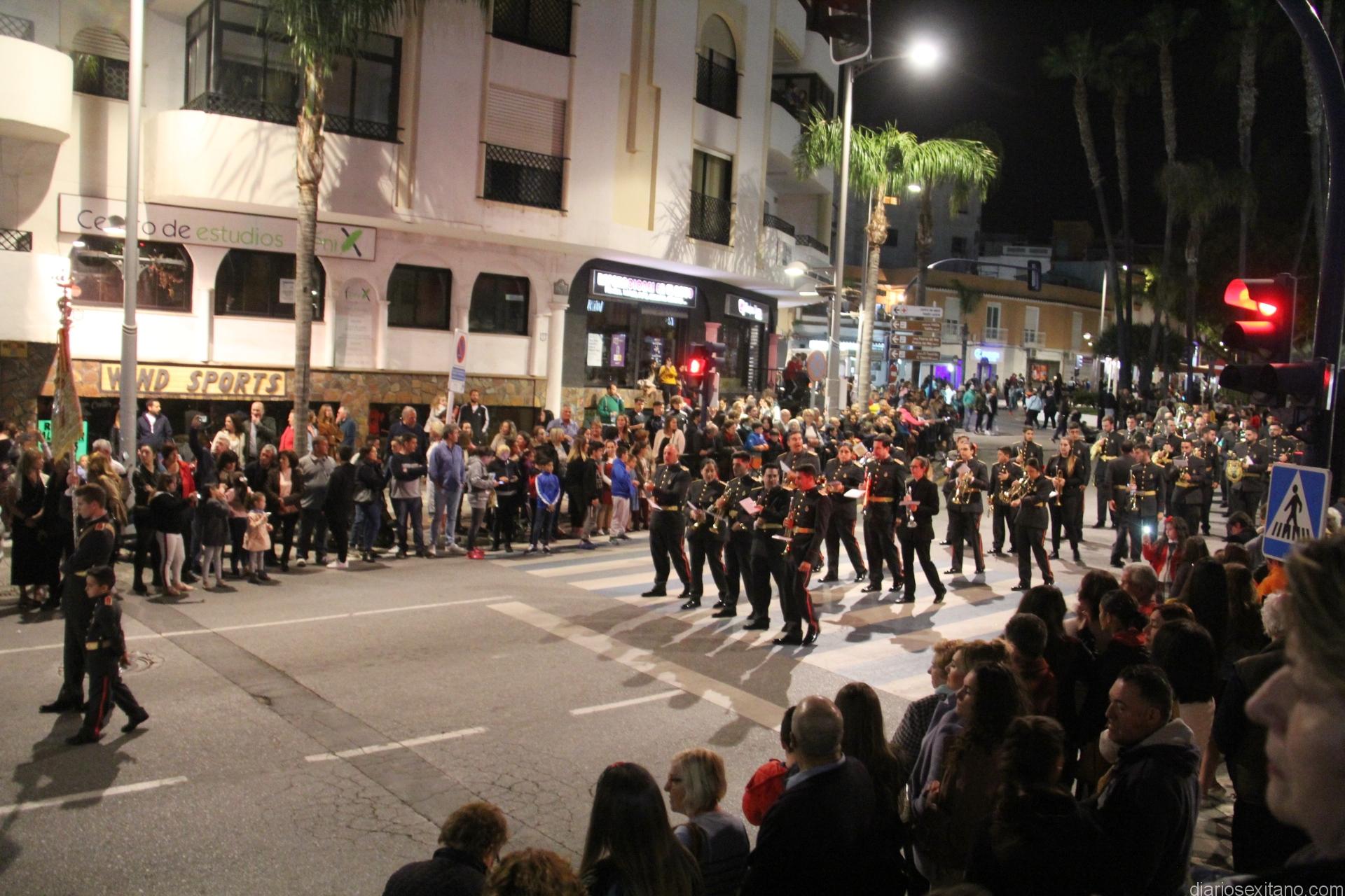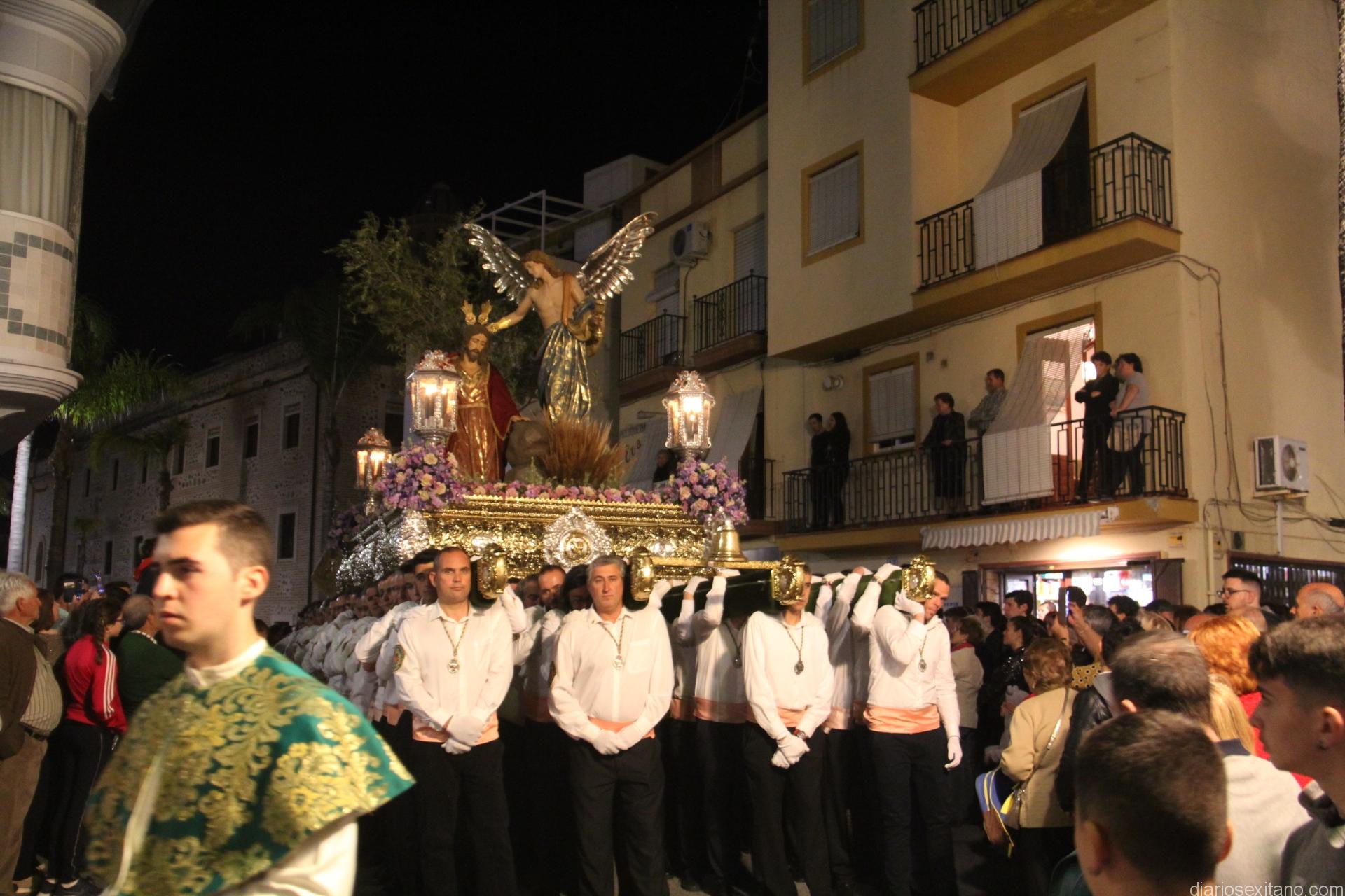Tal y como estaba previsto, el paso de misterio que talló el imaginero granadino, Miguel Zúñiga, salió del templo parroquial por vigésimacuarta ocasión ya entrada la noche para realizar su recorrido por las calles y avenidas de la localidad sexitana portado por varias decenas de horquilleros. El blanco, salmón y verde oliva eran los colores que destacaban entre la multitud que aguardaba en la Puerta de Granada. Rozando el pórtico de la Encarnación y a los sones del Himno Nacional interpretado por la Agrupación Musical de la Encarnación de Almuñécar comenzaba la cofradía almuñequera la estación de penitencia.