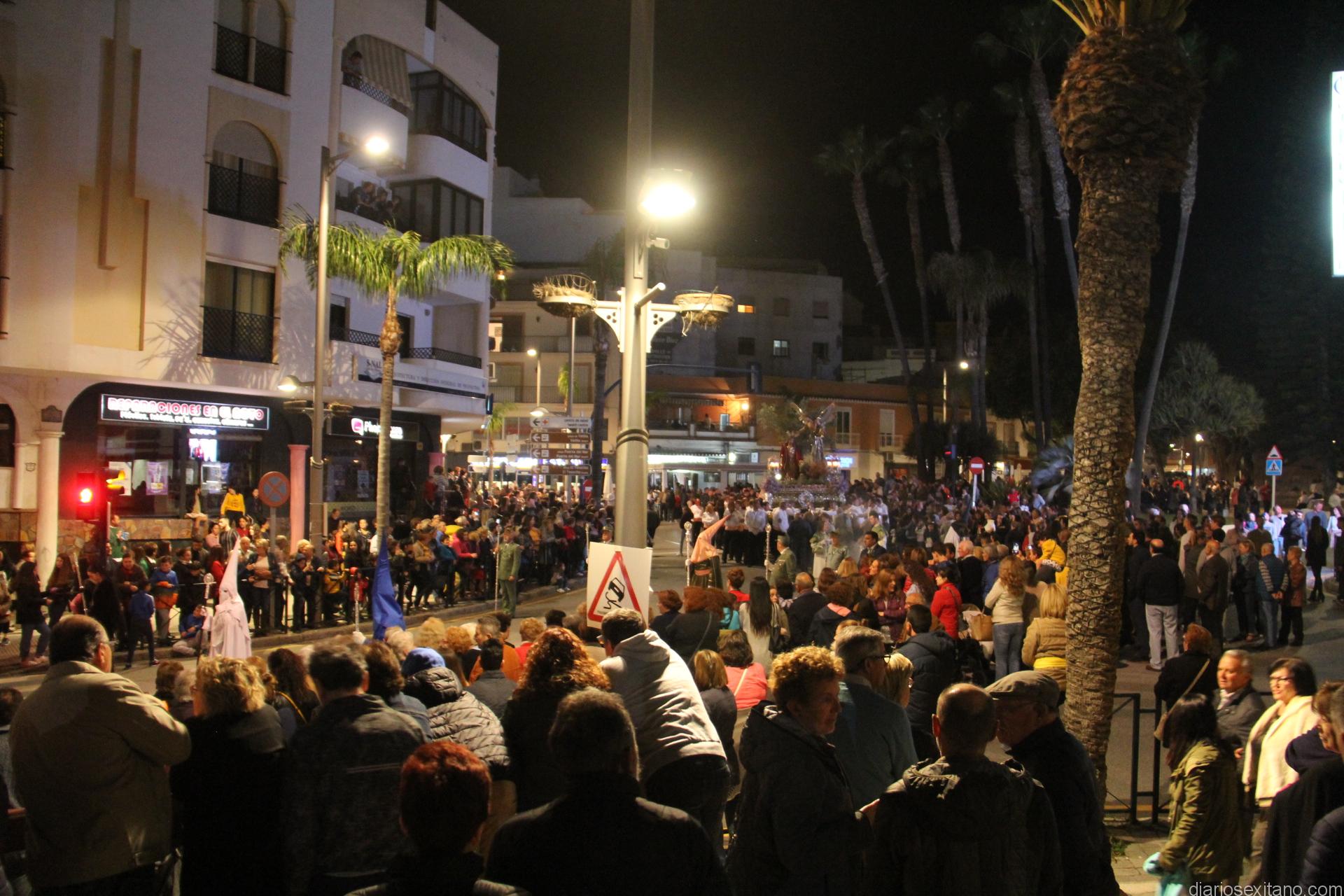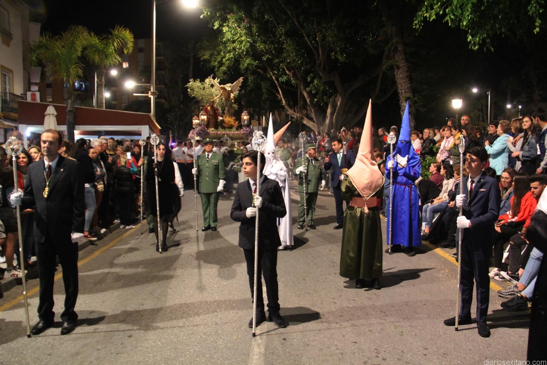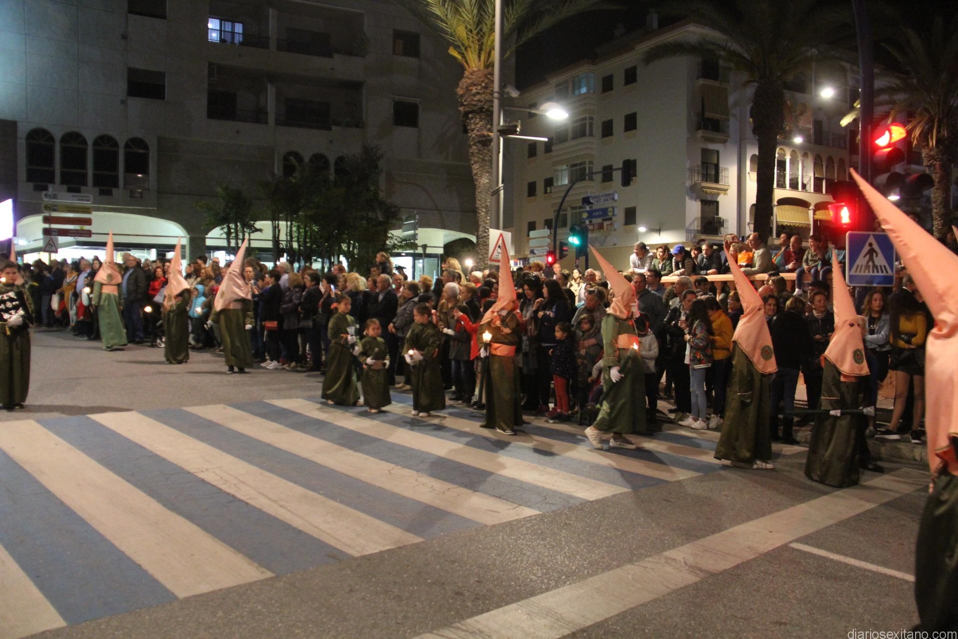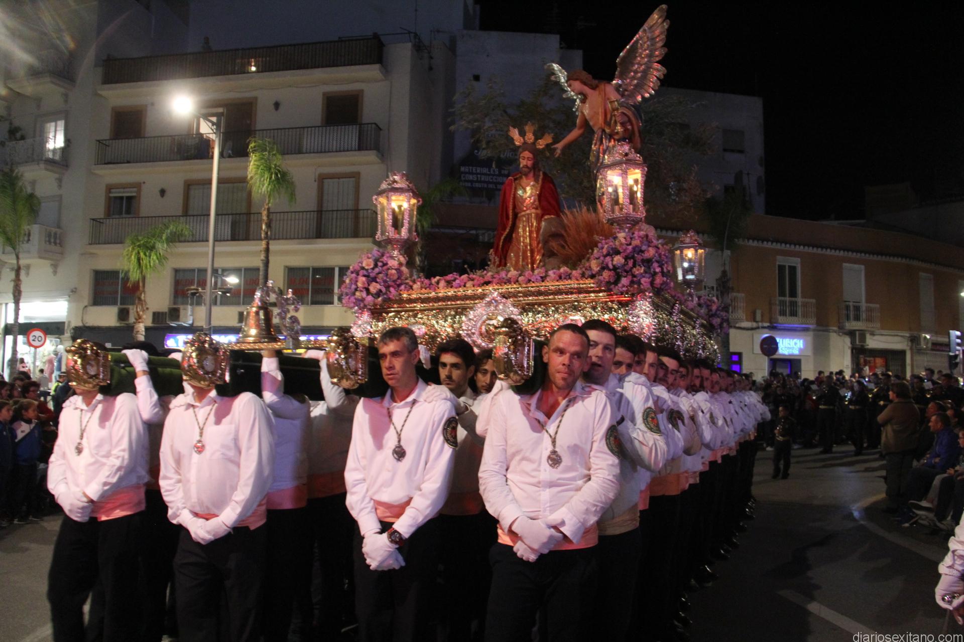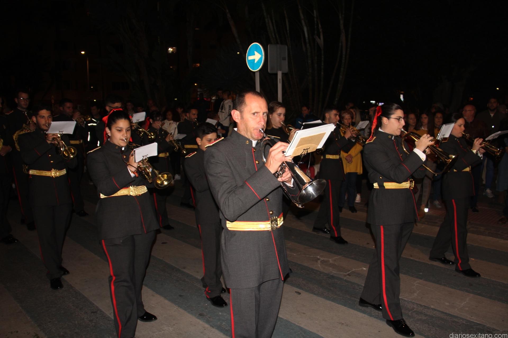 Tal y como estaba previsto, el paso de misterio que talló el imaginero granadino, Miguel Zúñiga, salió del templo parroquial por vigésimacuarta ocasión ya entrada la noche para realizar su recorrido por las calles y avenidas de la localidad sexitana portado por varias decenas de horquilleros. El blanco, salmón y verde oliva eran los colores que destacaban entre la multitud que aguardaba en la Puerta de Granada. Rozando el pórtico de la Encarnación y a los sones del Himno Nacional interpretado por la Agrupación Musical de la Encarnación de Almuñécar comenzaba la cofradía almuñequera la estación de penitencia.