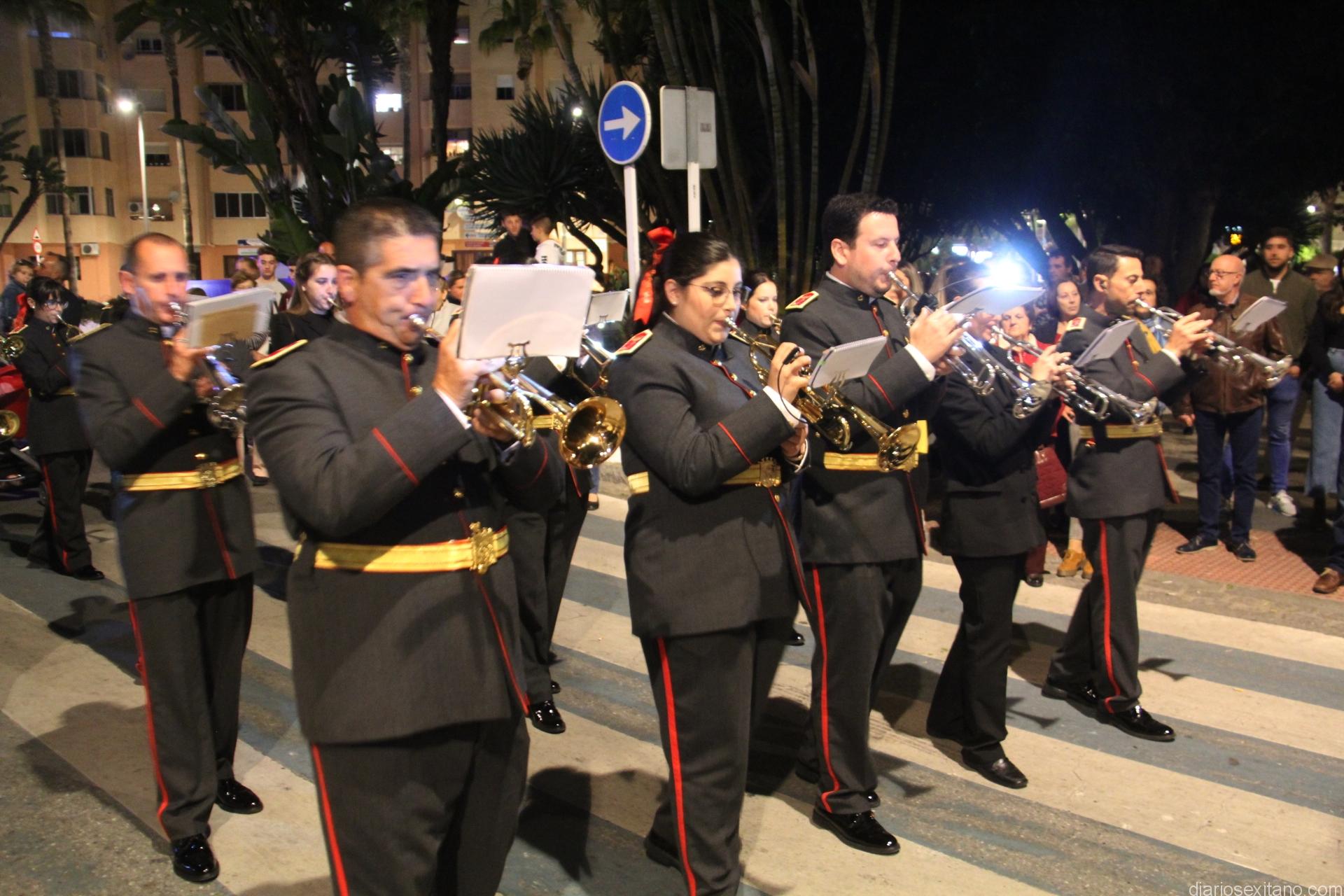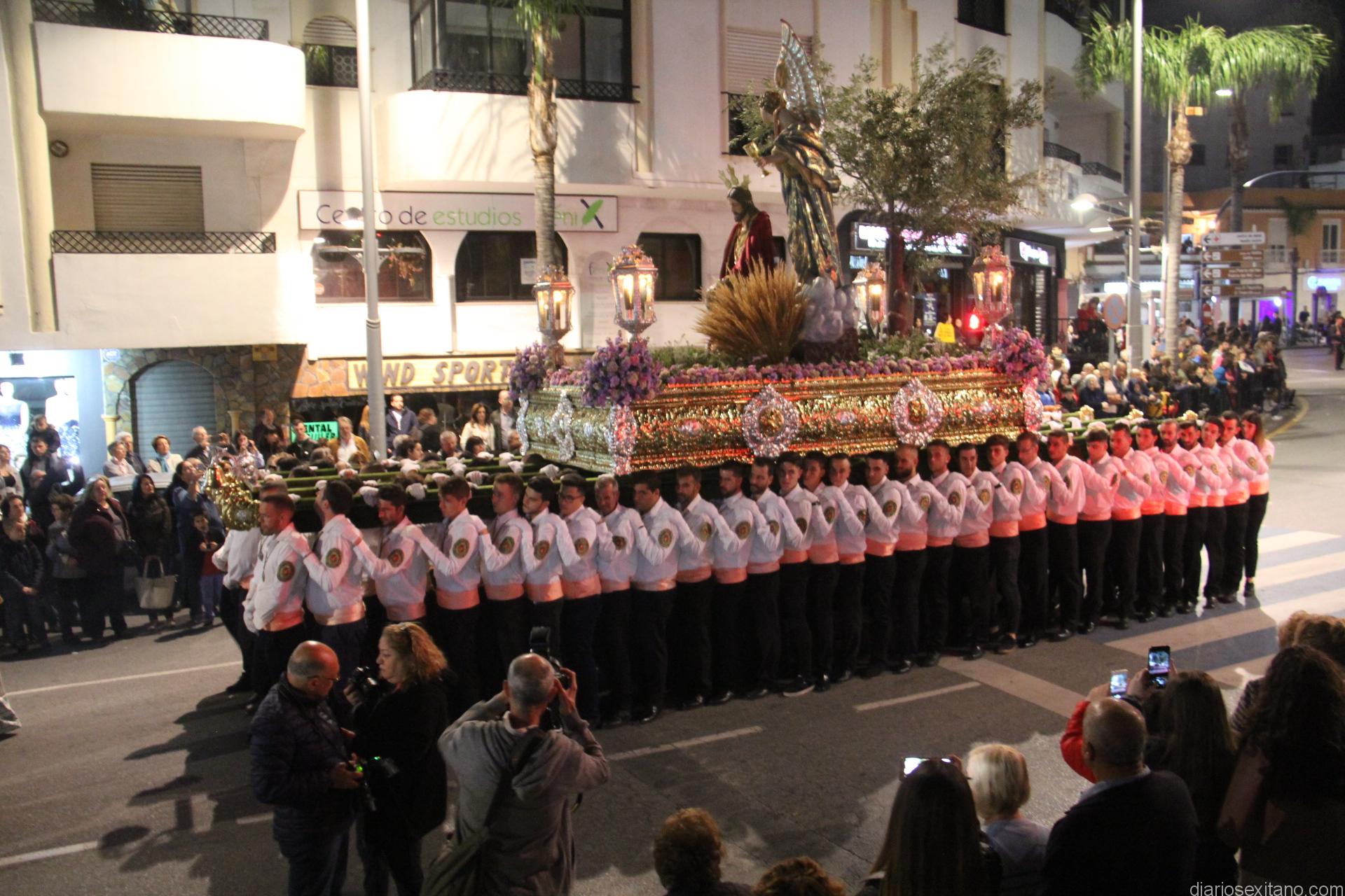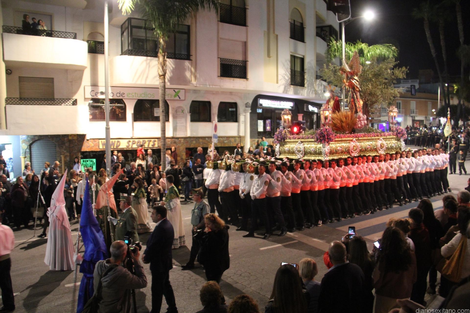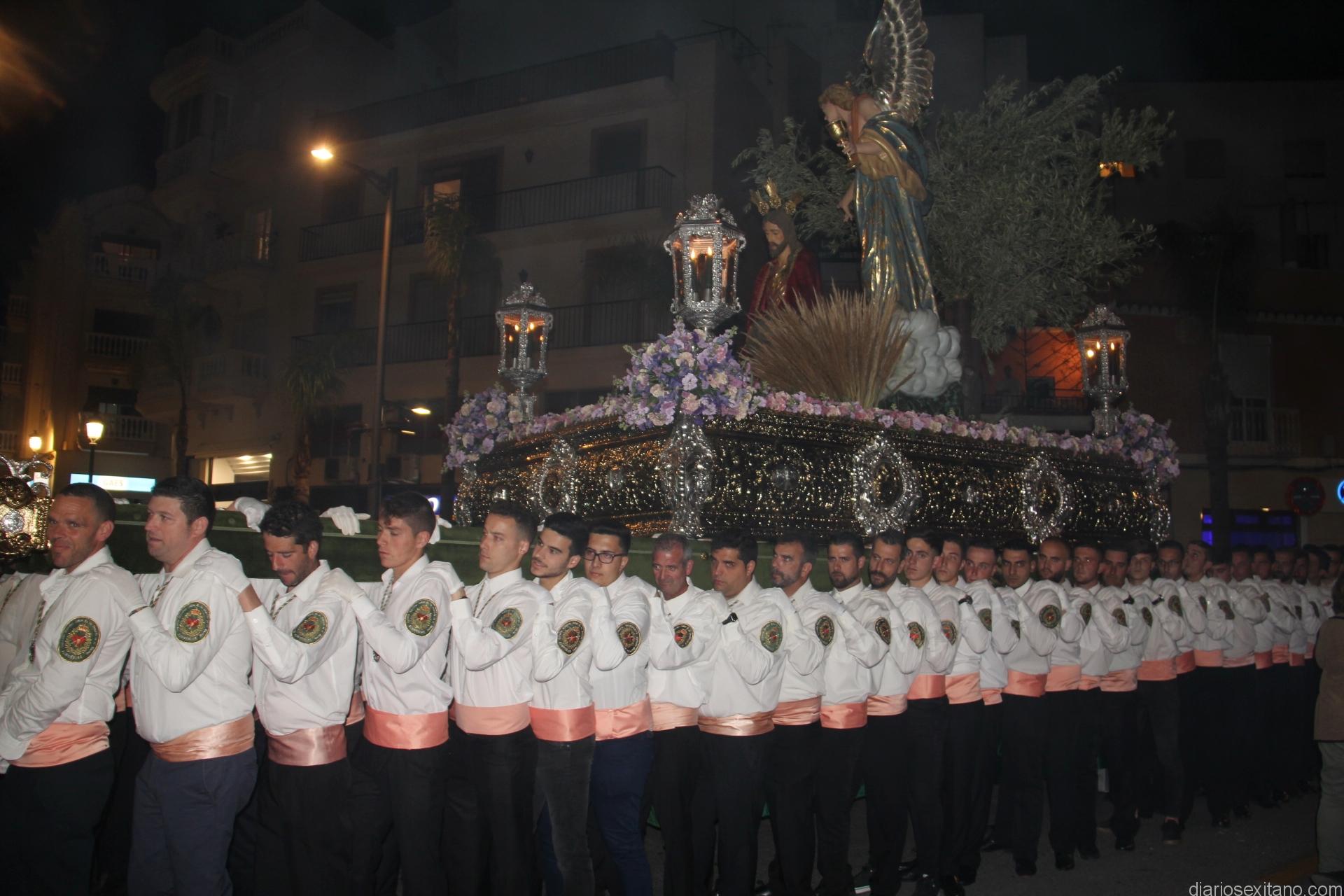 Tal y como estaba previsto, el paso de misterio que talló el imaginero granadino, Miguel Zúñiga, salió del templo parroquial por vigésimacuarta ocasión ya entrada la noche para realizar su recorrido por las calles y avenidas de la localidad sexitana portado por varias decenas de horquilleros. El blanco, salmón y verde oliva eran los colores que destacaban entre la multitud que aguardaba en la Puerta de Granada. Rozando el pórtico de la Encarnación y a los sones del Himno Nacional interpretado por la Agrupación Musical de la Encarnación de Almuñécar comenzaba la cofradía almuñequera la estación de penitencia.
