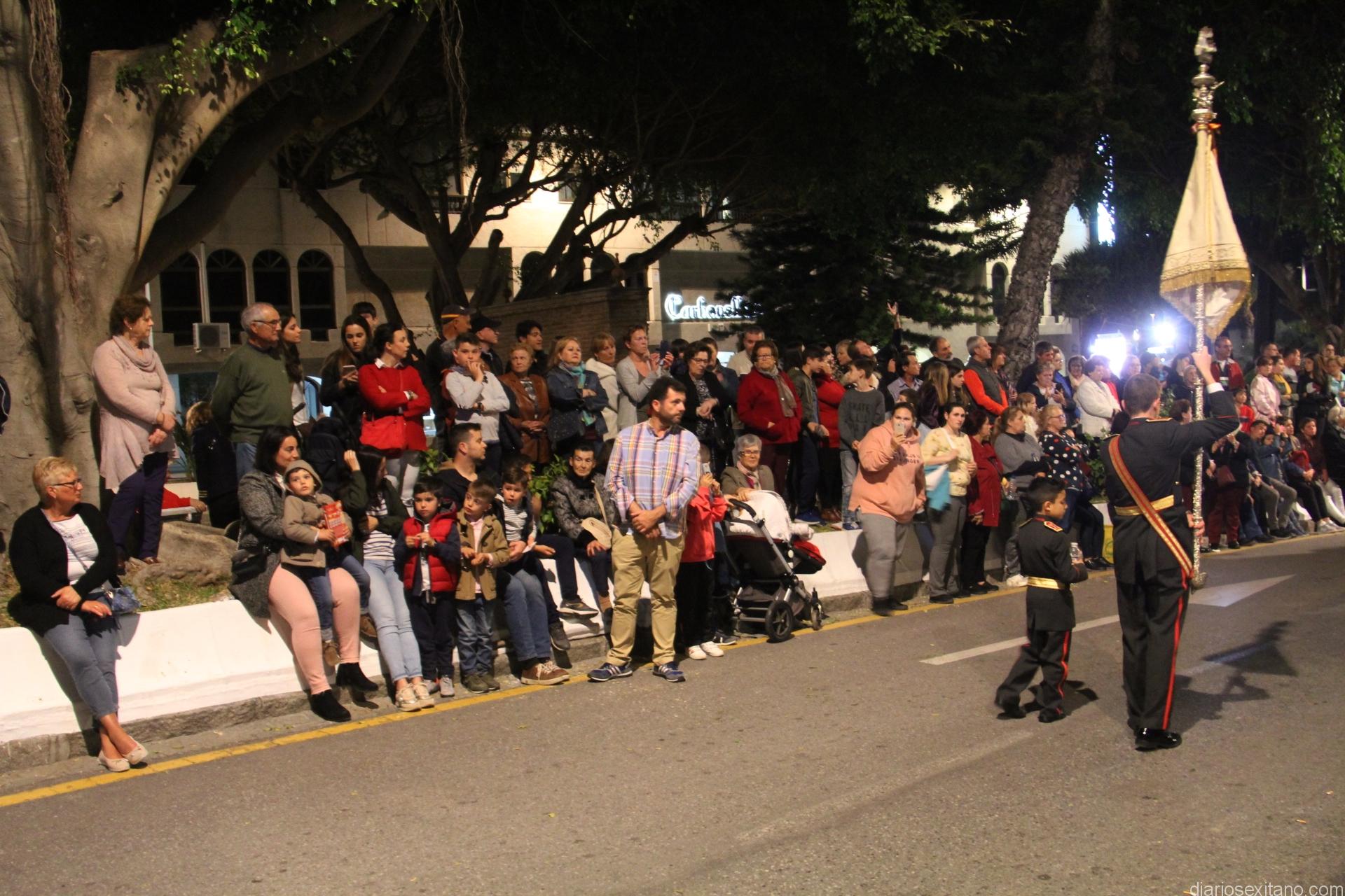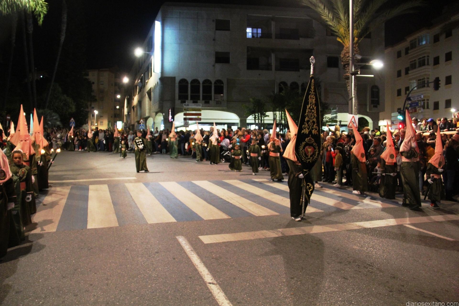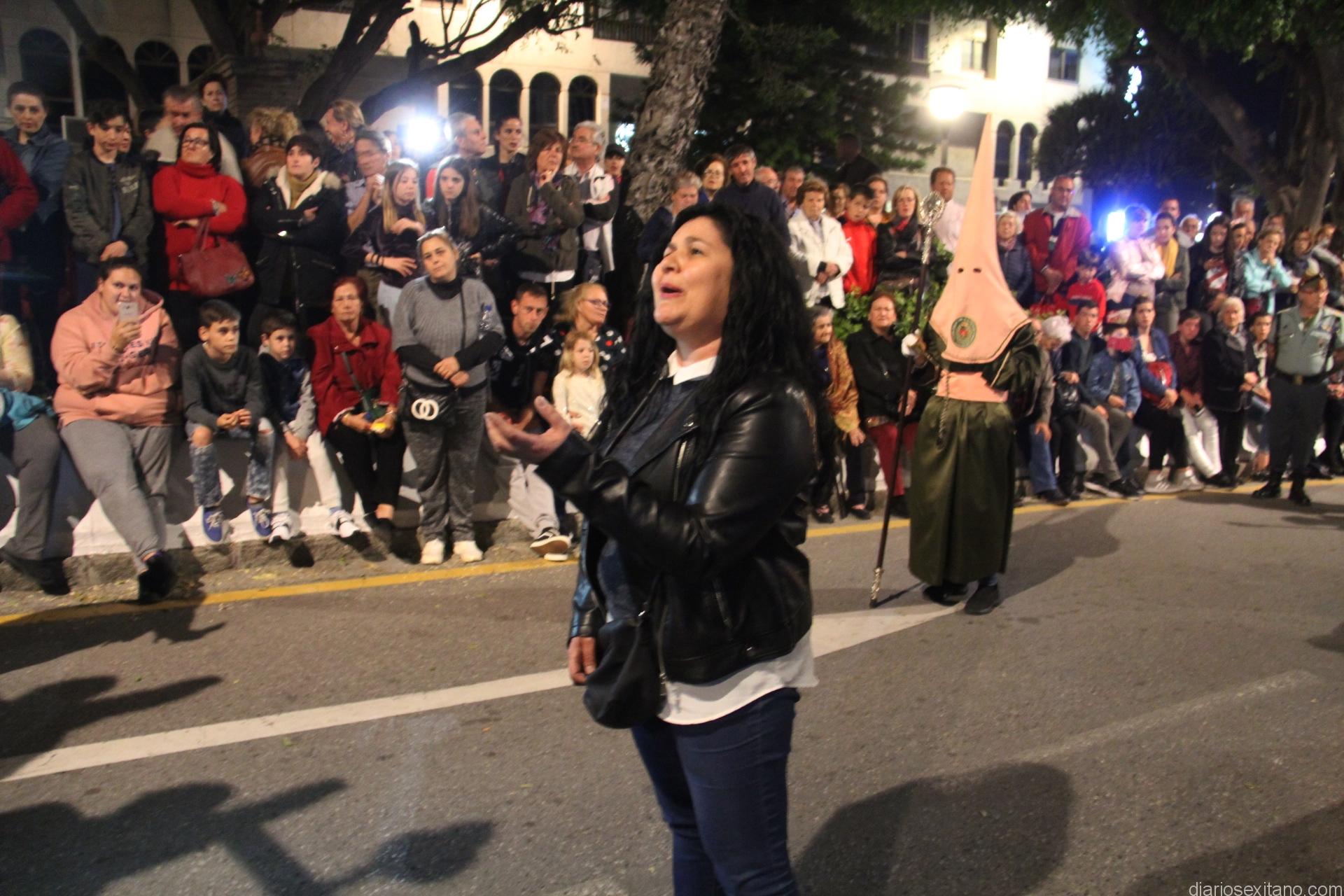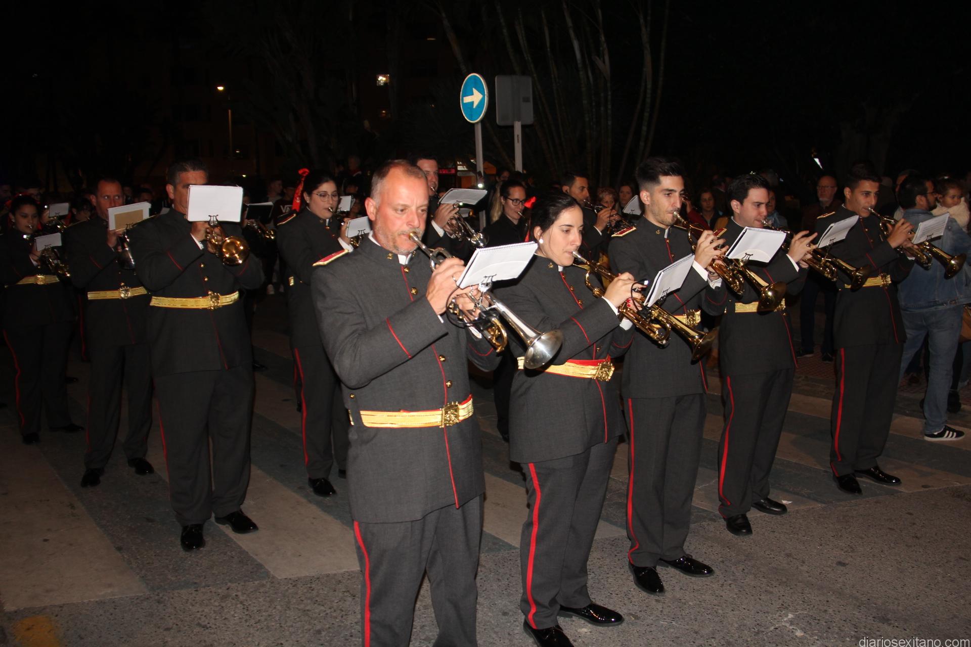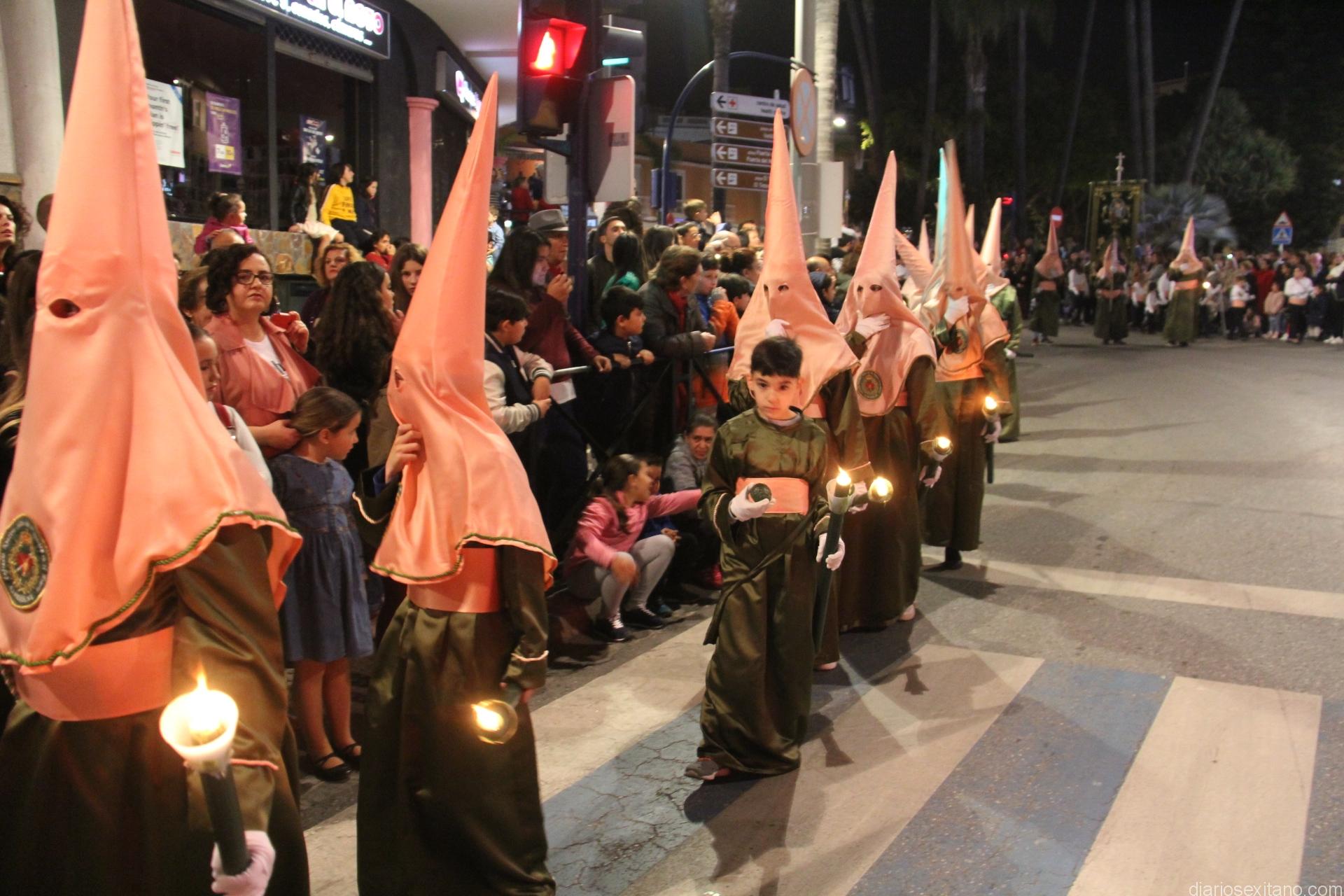 Tal y como estaba previsto, el paso de misterio que talló el imaginero granadino, Miguel Zúñiga, salió del templo parroquial por vigésimacuarta ocasión ya entrada la noche para realizar su recorrido por las calles y avenidas de la localidad sexitana portado por varias decenas de horquilleros. El blanco, salmón y verde oliva eran los colores que destacaban entre la multitud que aguardaba en la Puerta de Granada. Rozando el pórtico de la Encarnación y a los sones del Himno Nacional interpretado por la Agrupación Musical de la Encarnación de Almuñécar comenzaba la cofradía almuñequera la estación de penitencia.