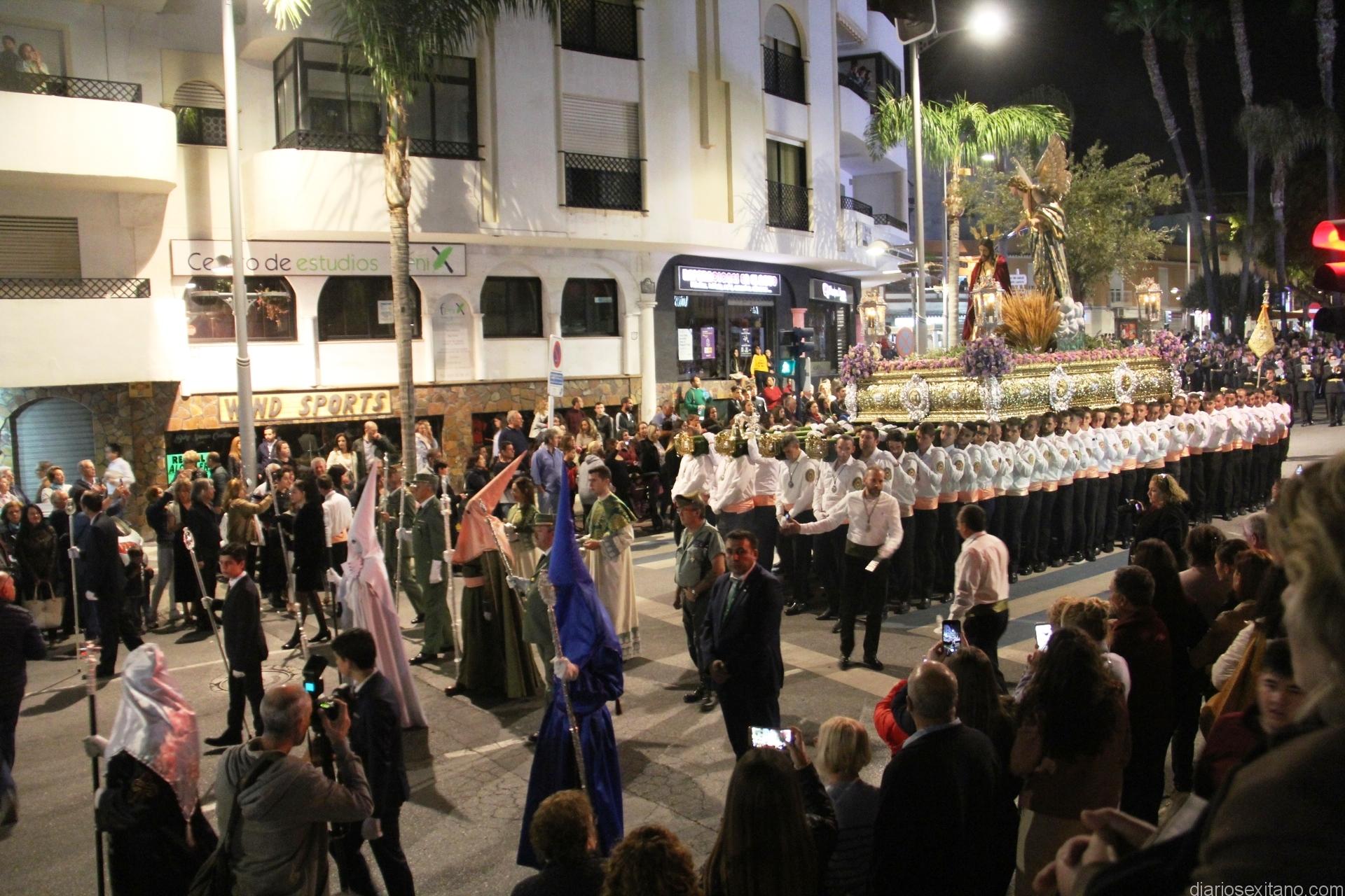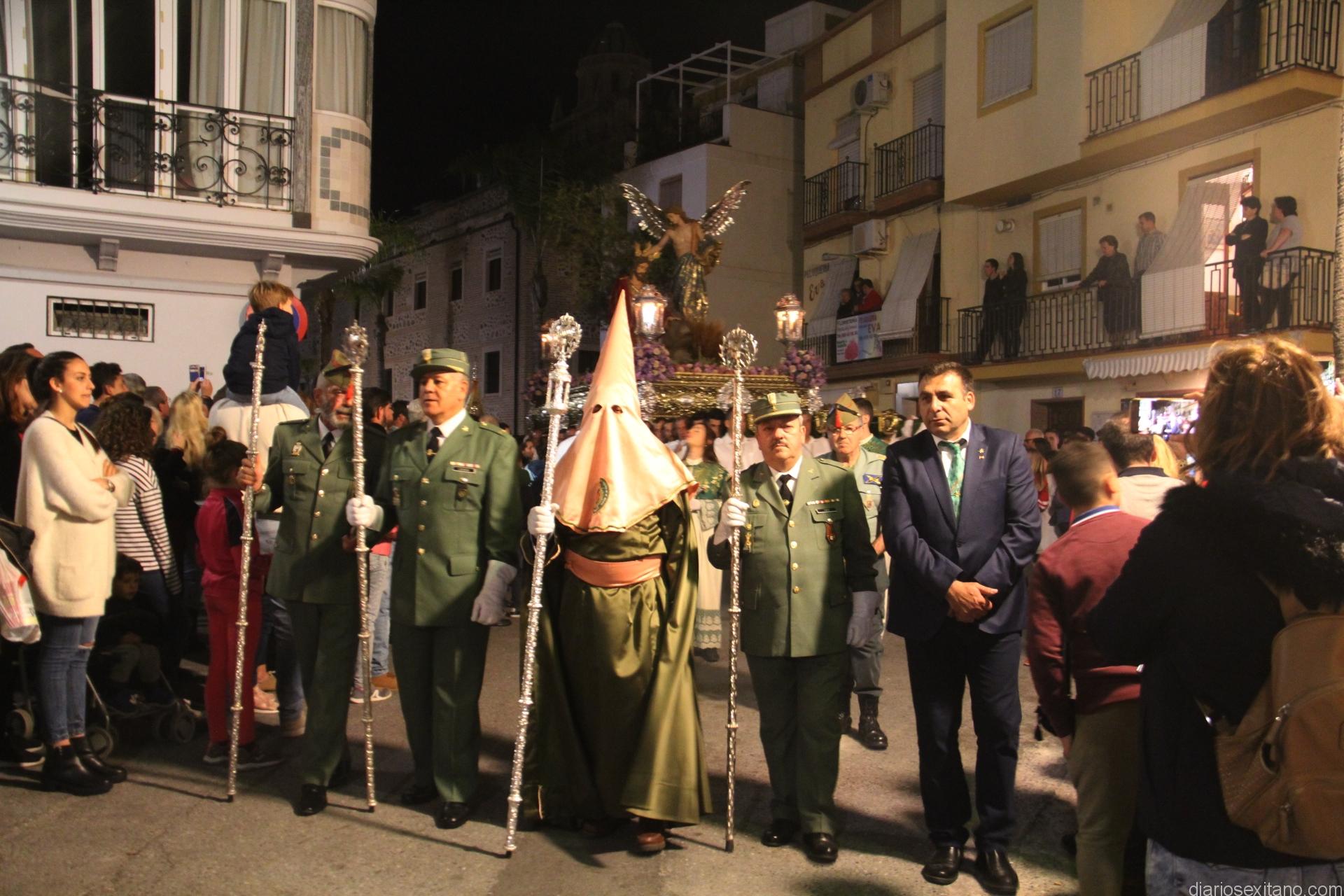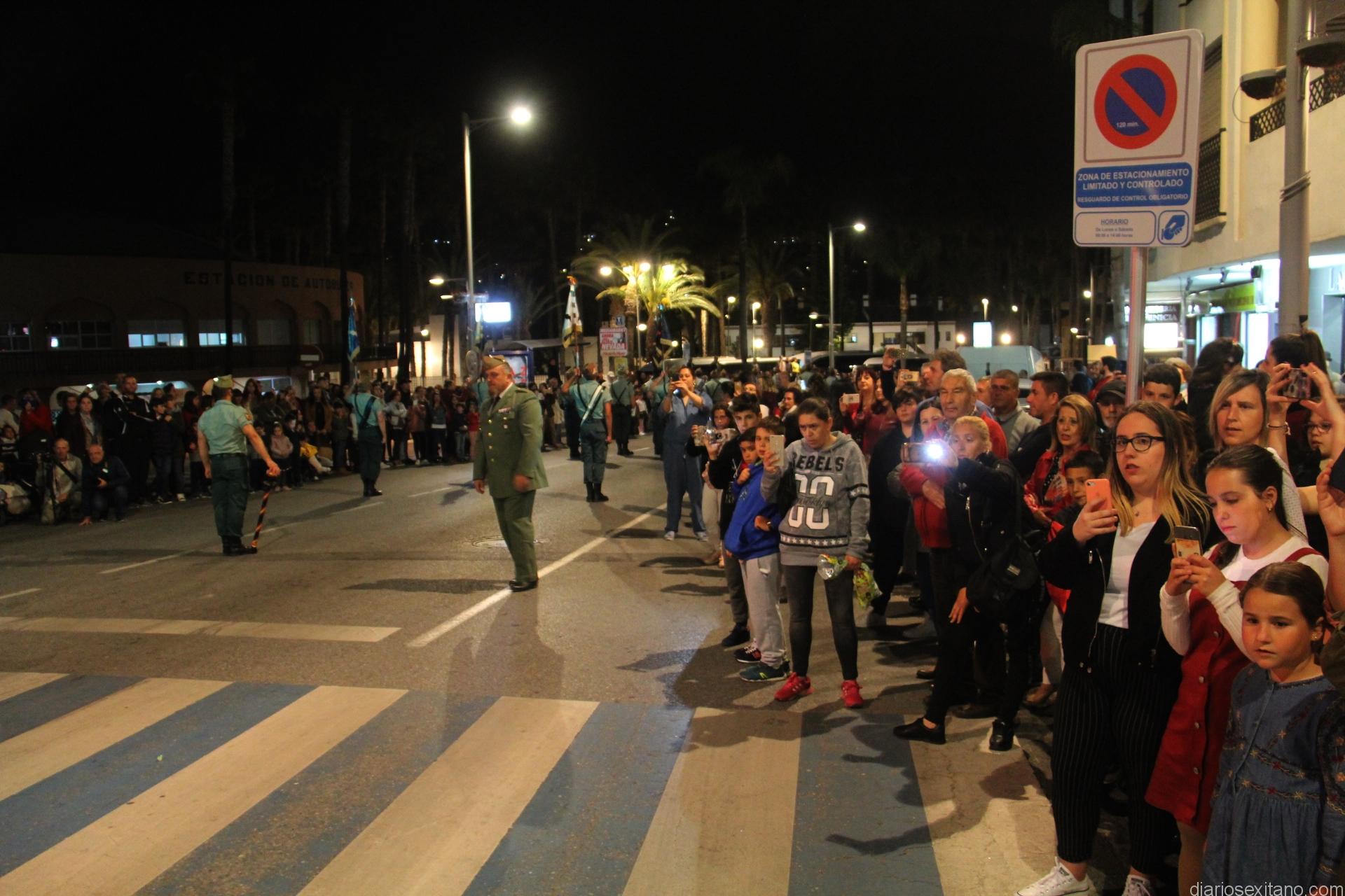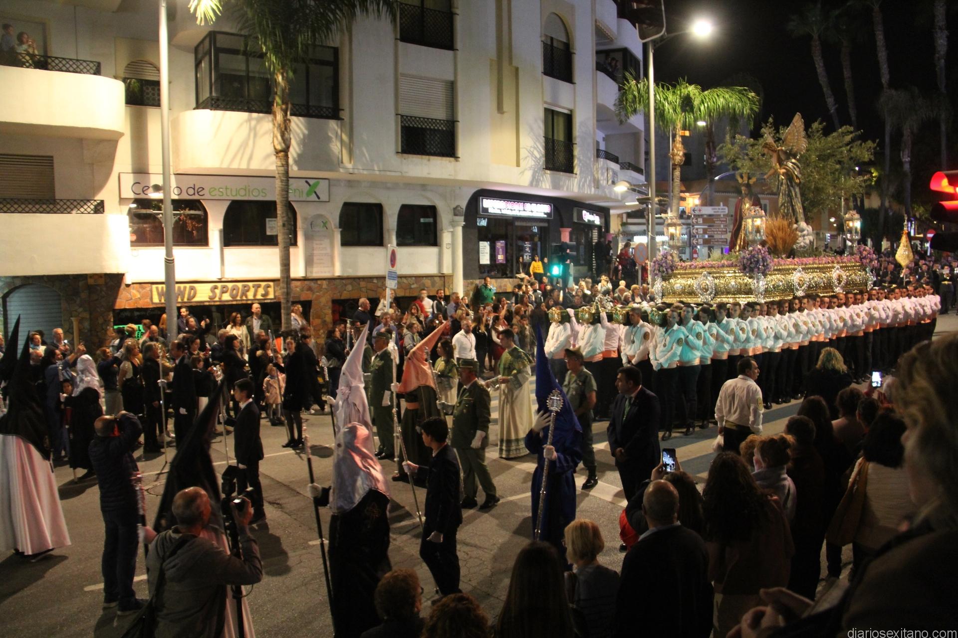 Tal y como estaba previsto, el paso de misterio que talló el imaginero granadino, Miguel Zúñiga, salió del templo parroquial por vigésimacuarta ocasión ya entrada la noche para realizar su recorrido por las calles y avenidas de la localidad sexitana portado por varias decenas de horquilleros. El blanco, salmón y verde oliva eran los colores que destacaban entre la multitud que aguardaba en la Puerta de Granada. Rozando el pórtico de la Encarnación y a los sones del Himno Nacional interpretado por la Agrupación Musical de la Encarnación de Almuñécar comenzaba la cofradía almuñequera la estación de penitencia.
