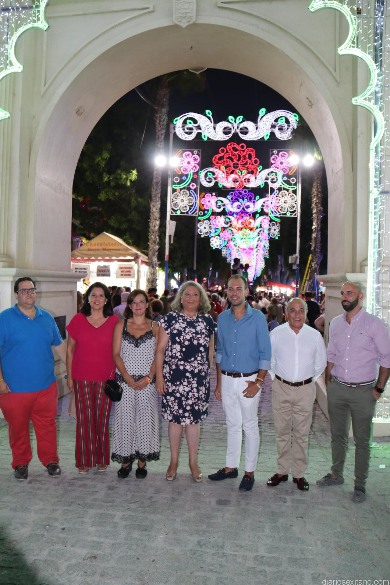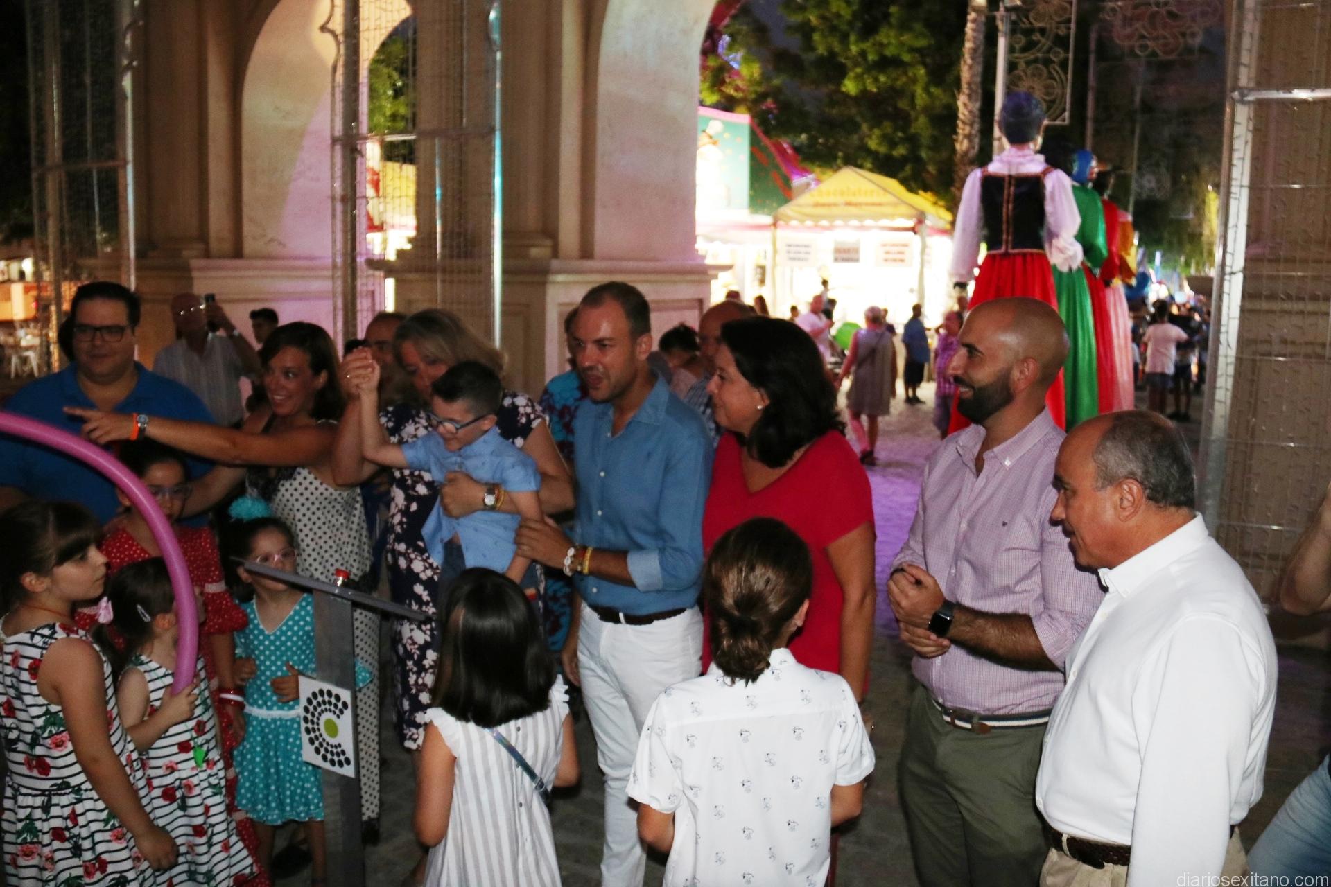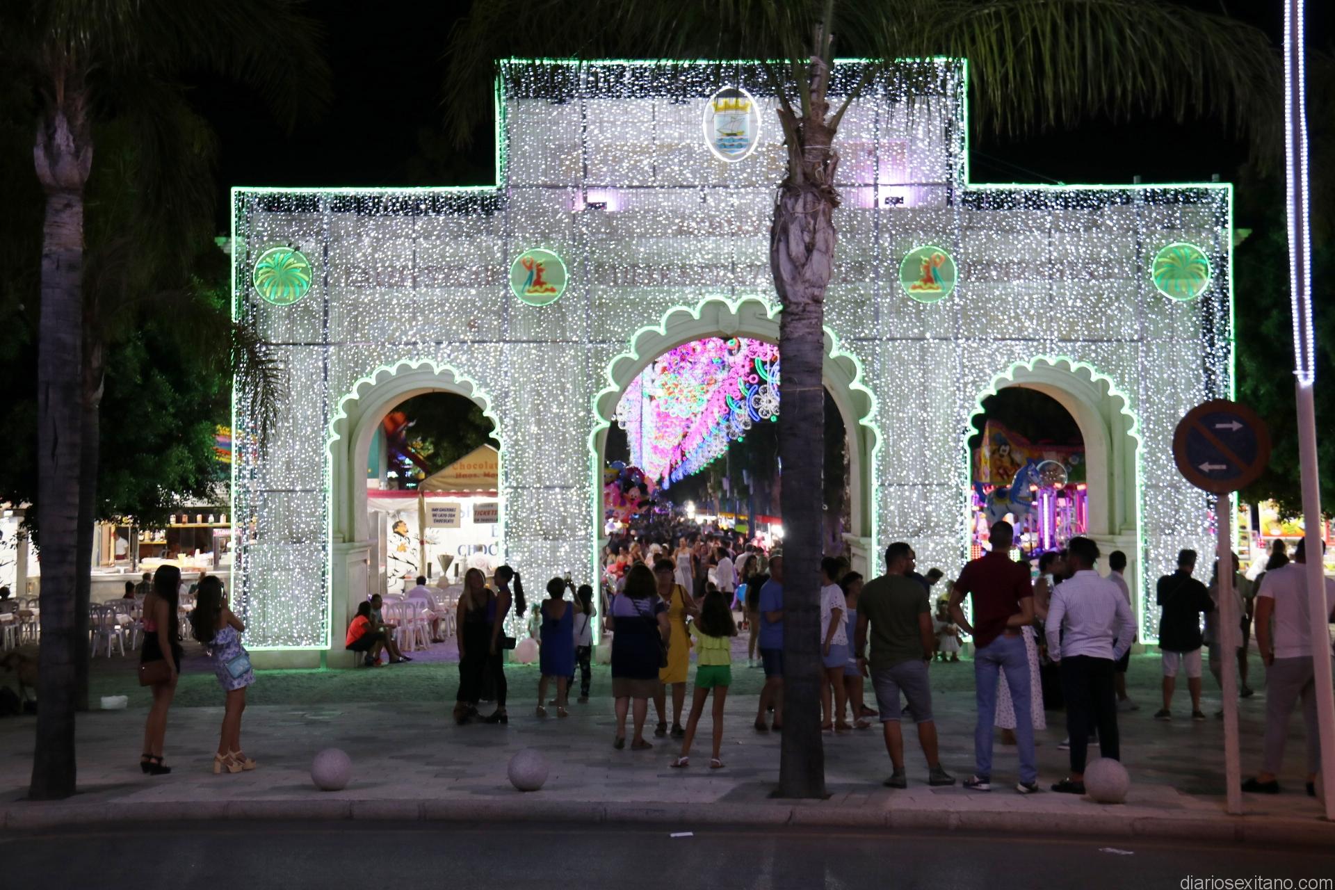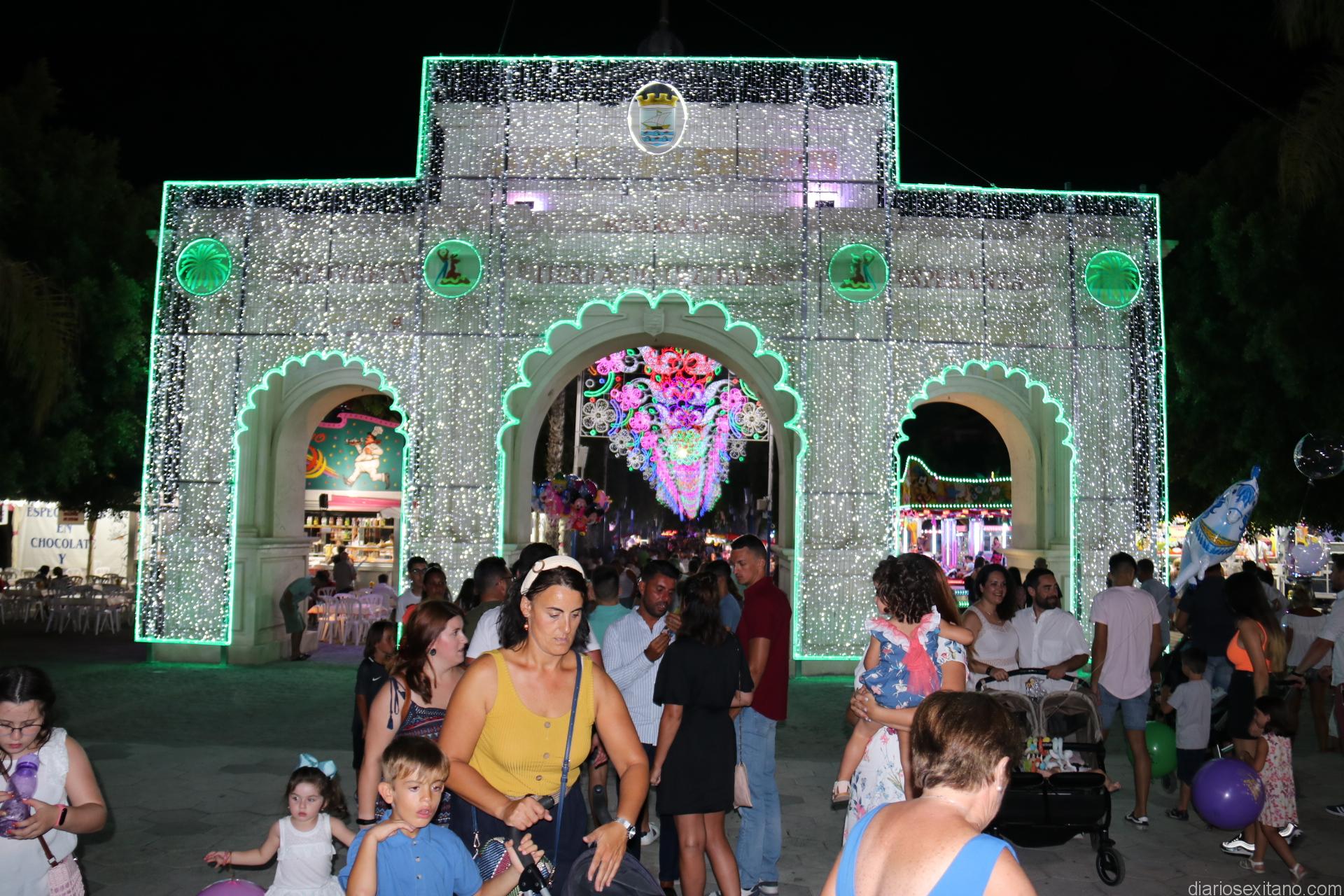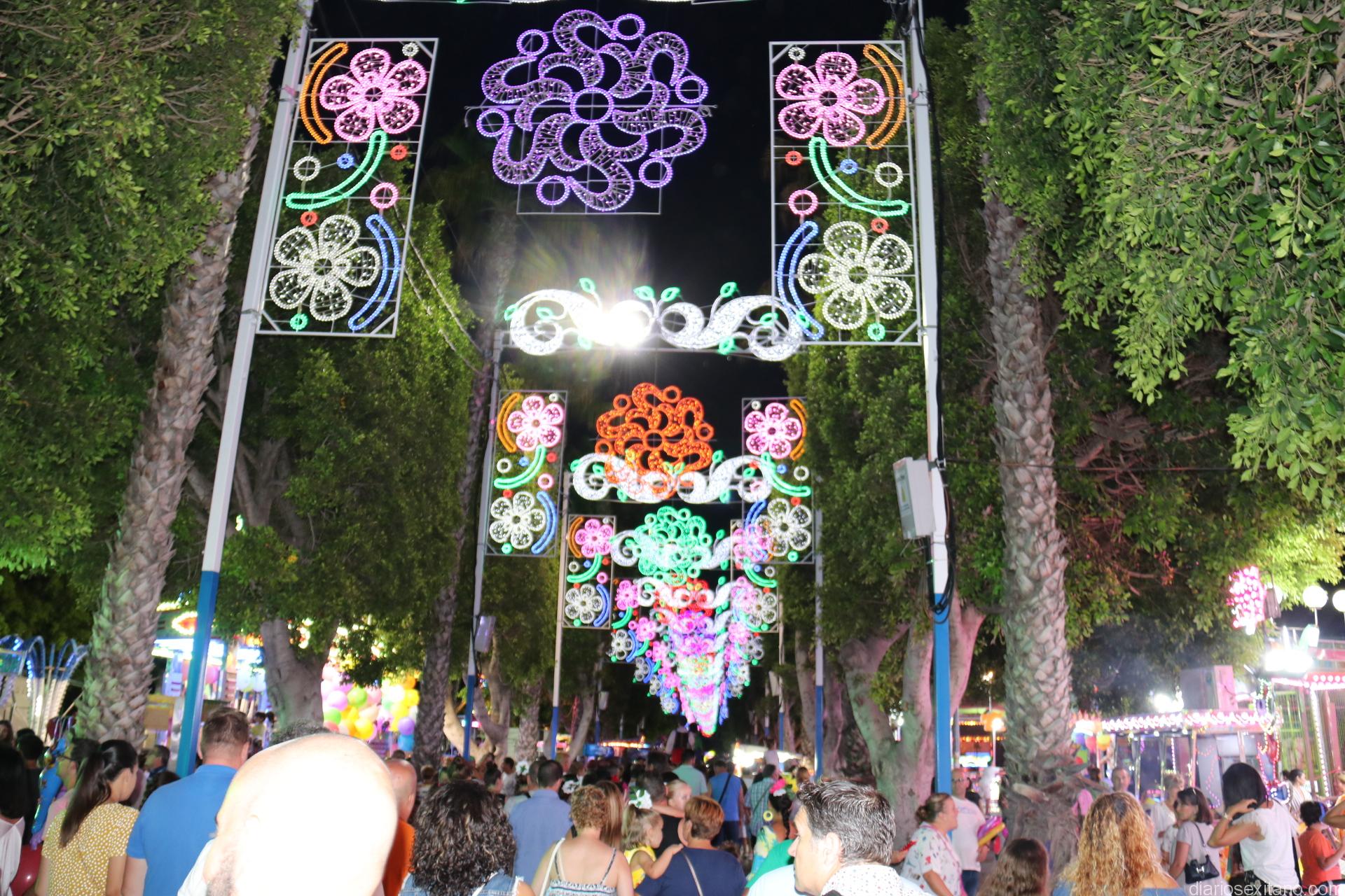 El encendido del alumbrado animó la noche en las atracciones y casetas que ocupan el recinto ferial. La alcaldesa, Trinidad Herrera, acompañada de miembros del equipo de gobierno, se rodeó de varios pequeños que apretaron el interruptor de la iluminación situado en la Puerta de Almuñécar, principal acceso al paseo Blas Infante.