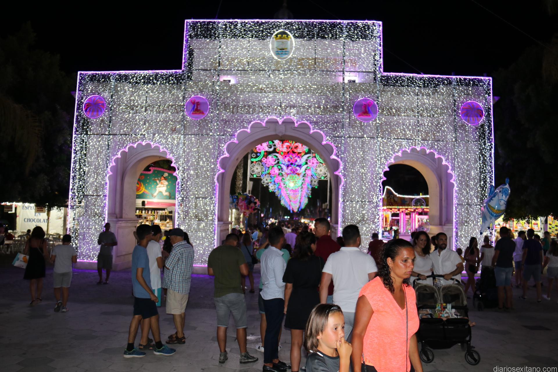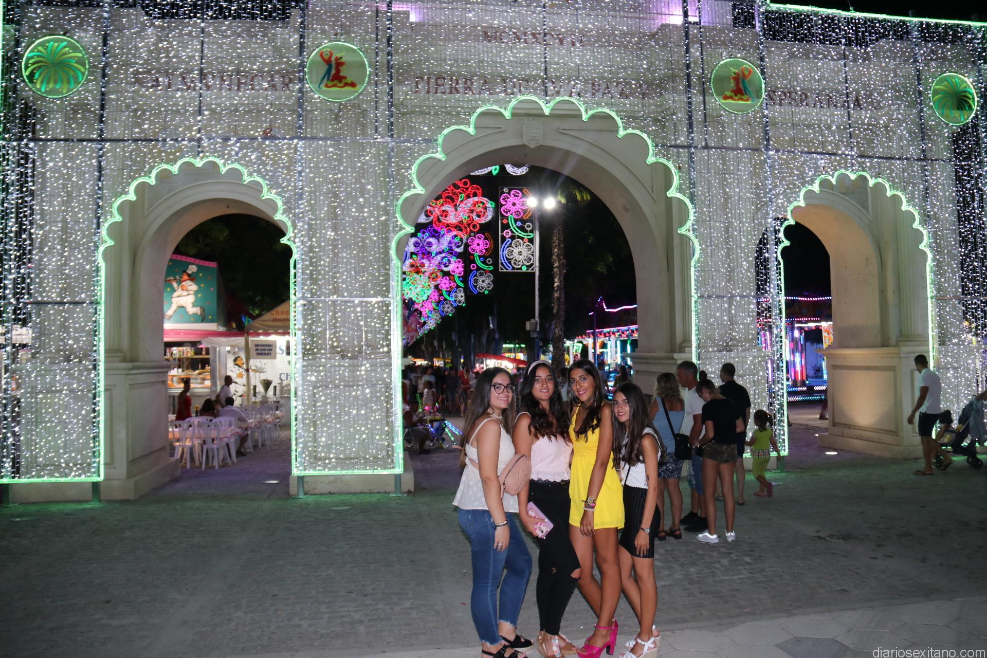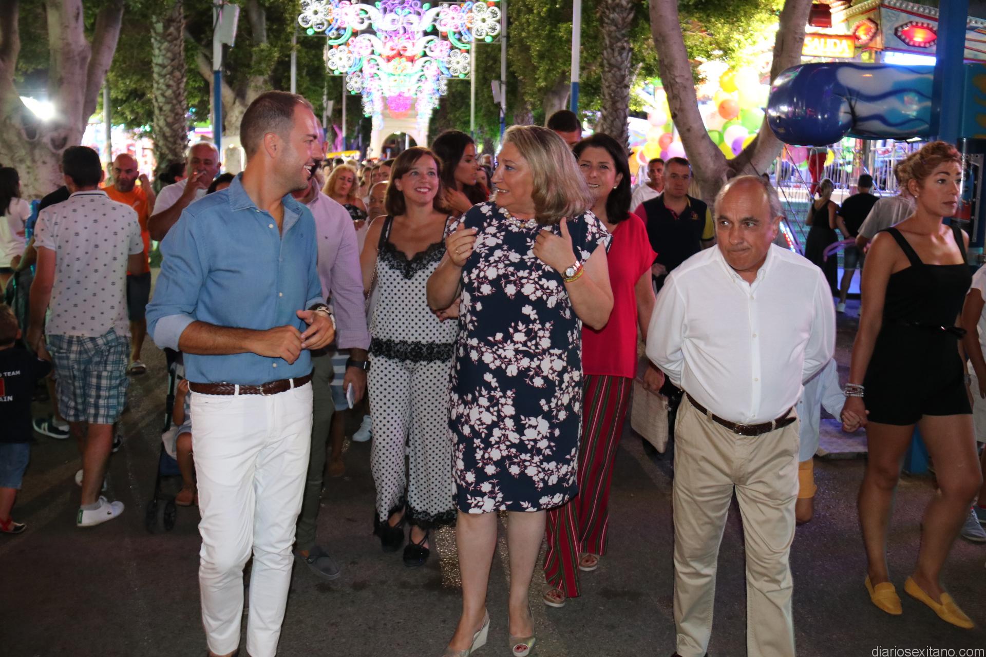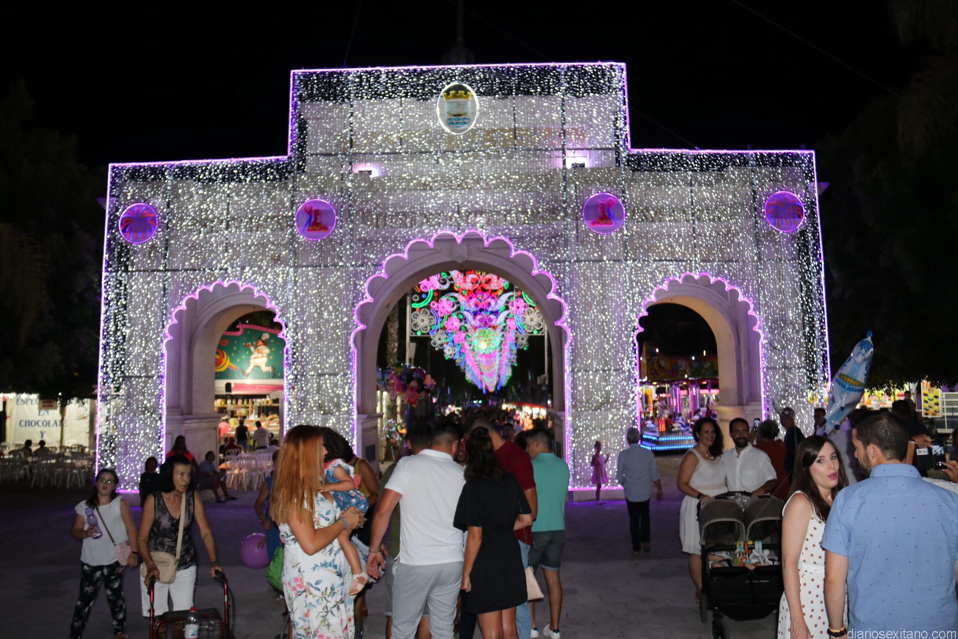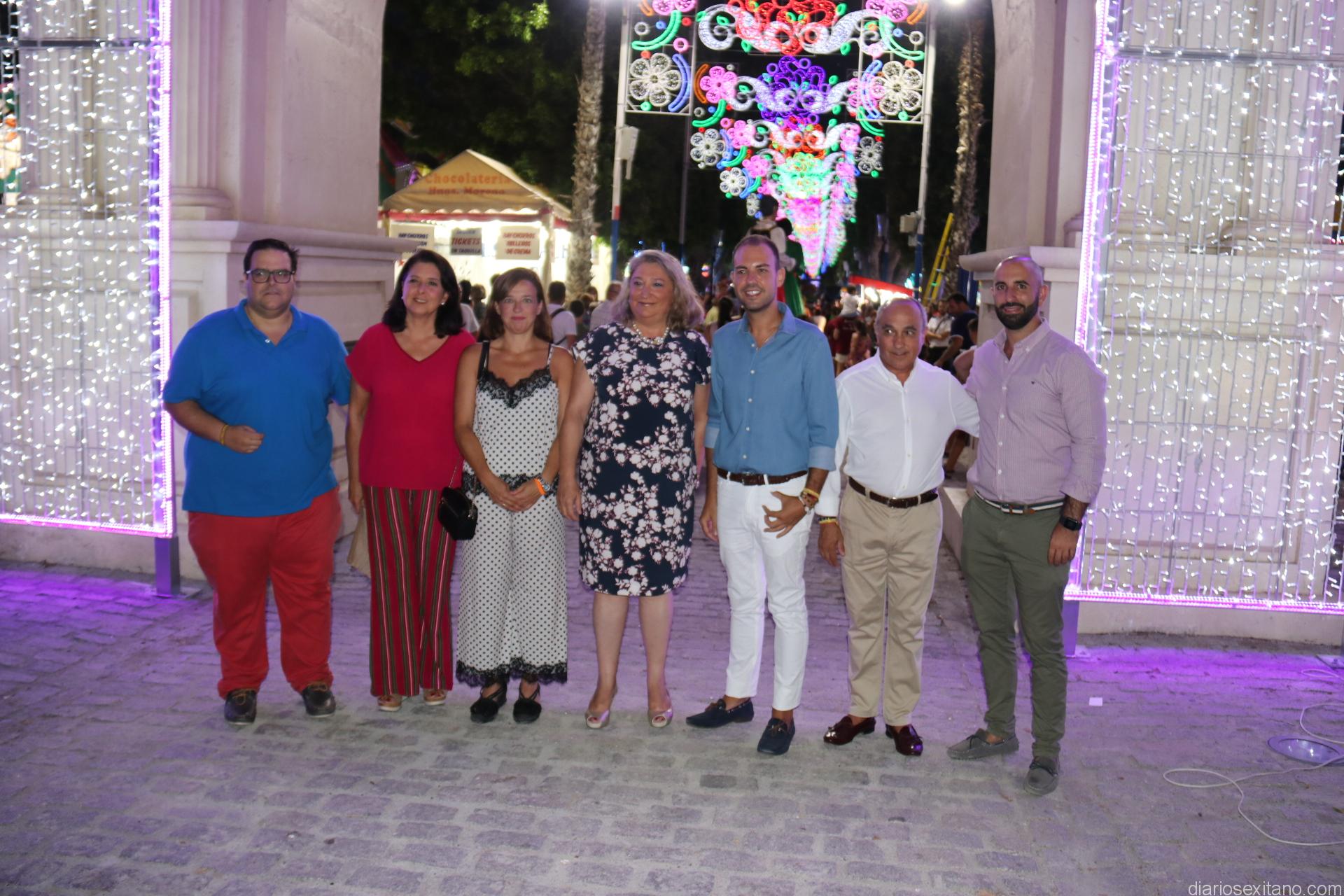 El encendido del alumbrado animó la noche en las atracciones y casetas que ocupan el recinto ferial. La alcaldesa, Trinidad Herrera, acompañada de miembros del equipo de gobierno, se rodeó de varios pequeños que apretaron el interruptor de la iluminación situado en la Puerta de Almuñécar, principal acceso al paseo Blas Infante.