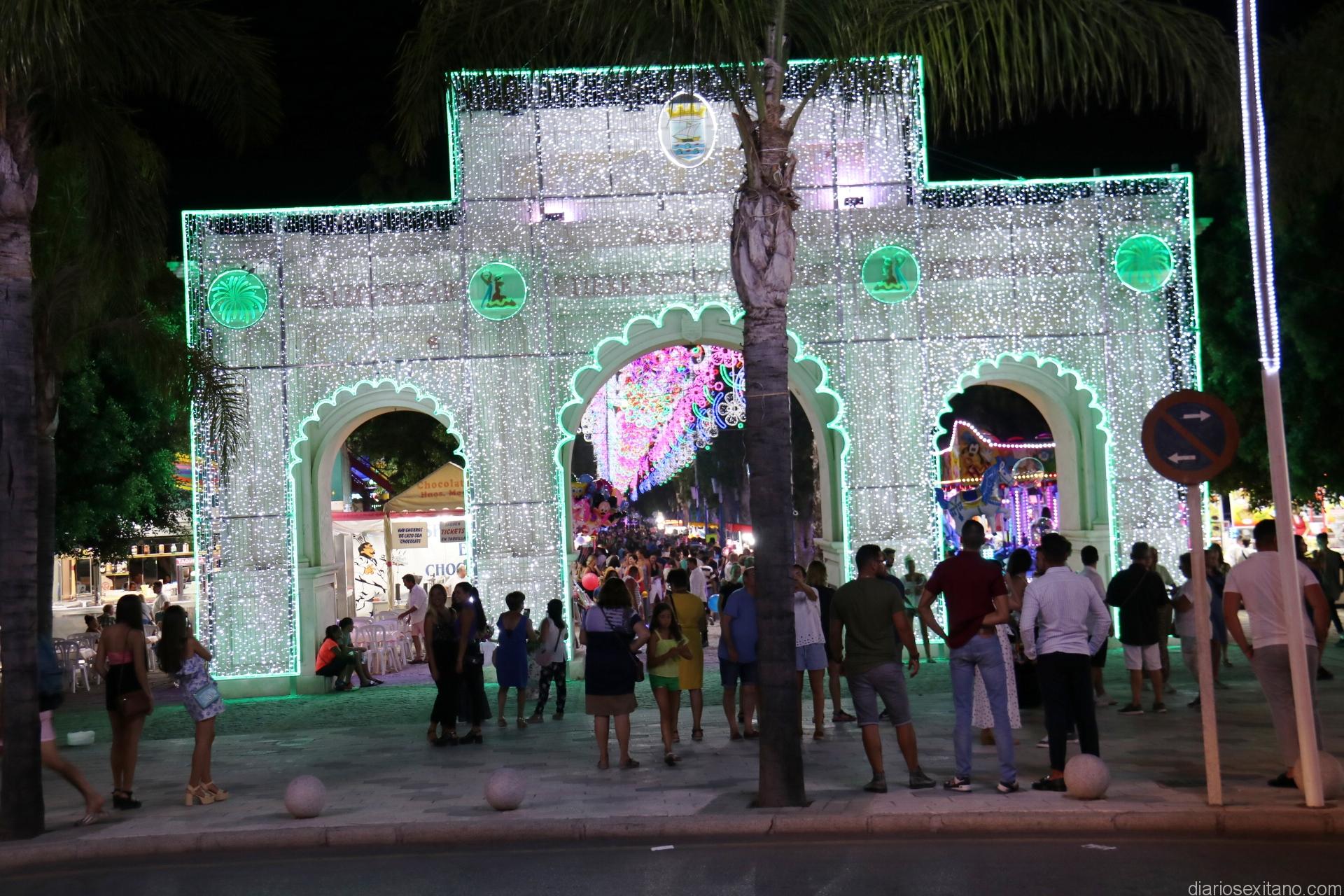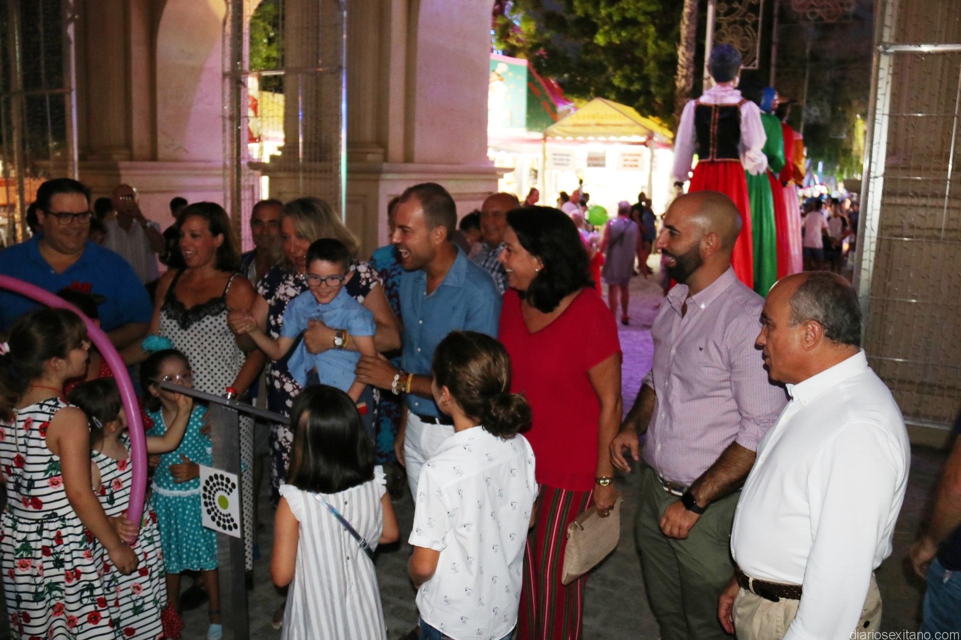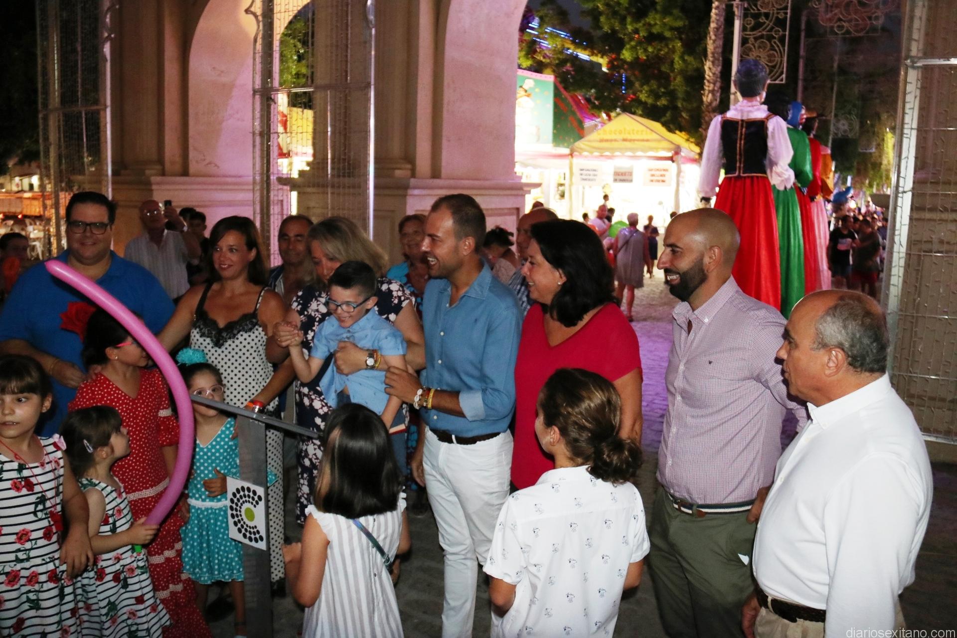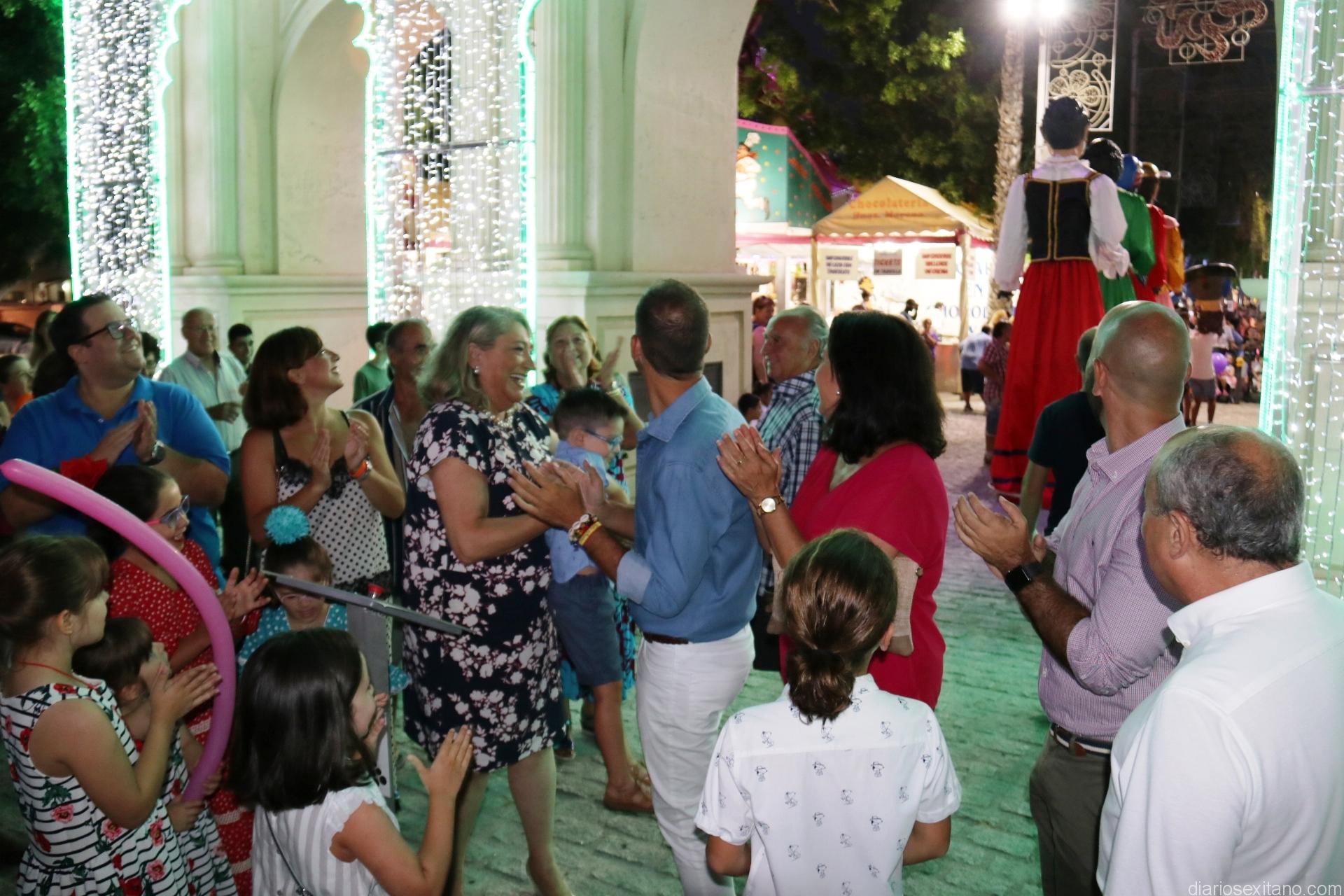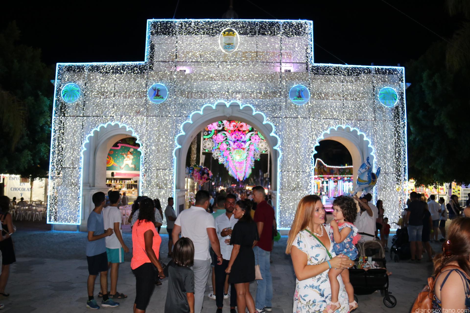El encendido del alumbrado animó la noche en las atracciones y casetas que ocupan el recinto ferial. La alcaldesa, Trinidad Herrera, acompañada de miembros del equipo de gobierno, se rodeó de varios pequeños que apretaron el interruptor de la iluminación situado en la Puerta de Almuñécar, principal acceso al paseo Blas Infante.