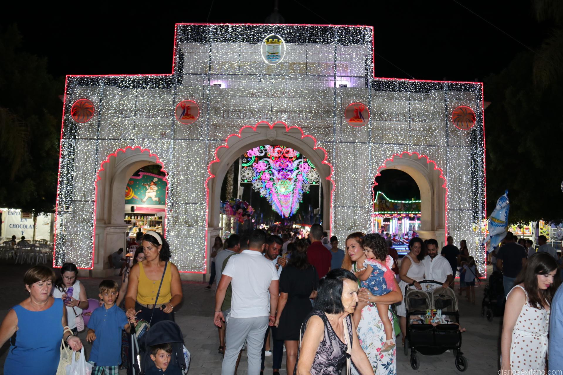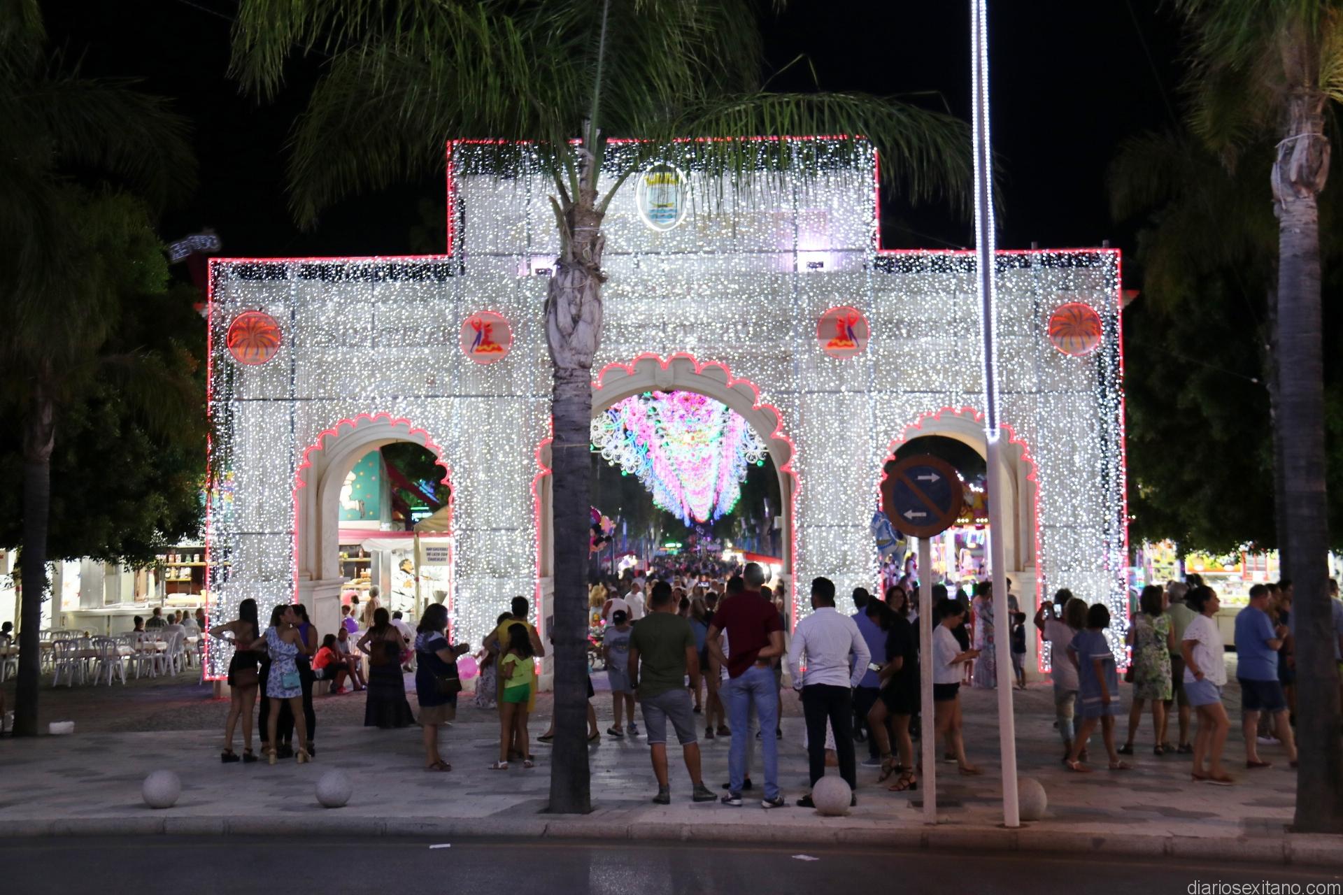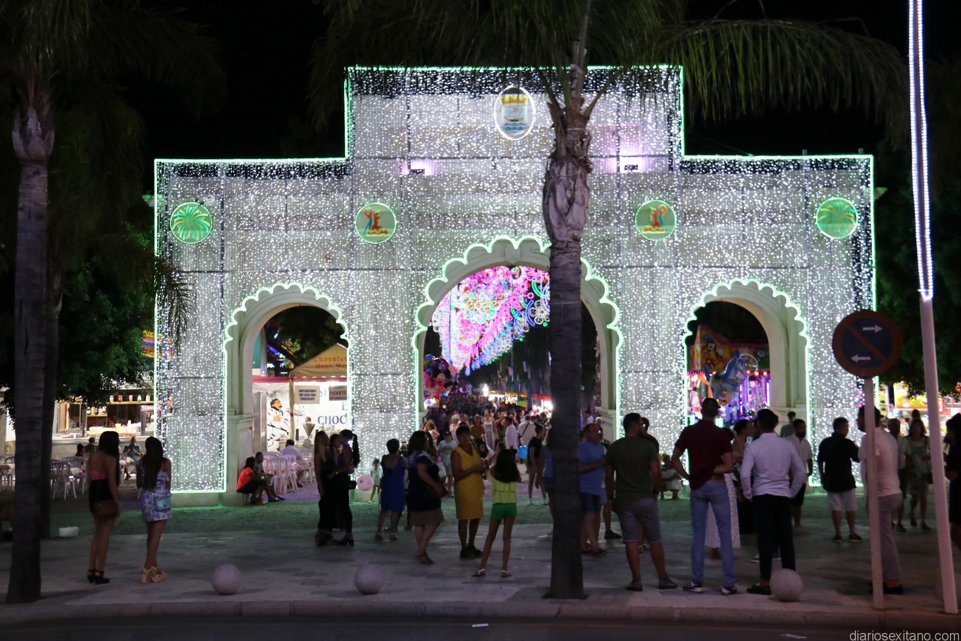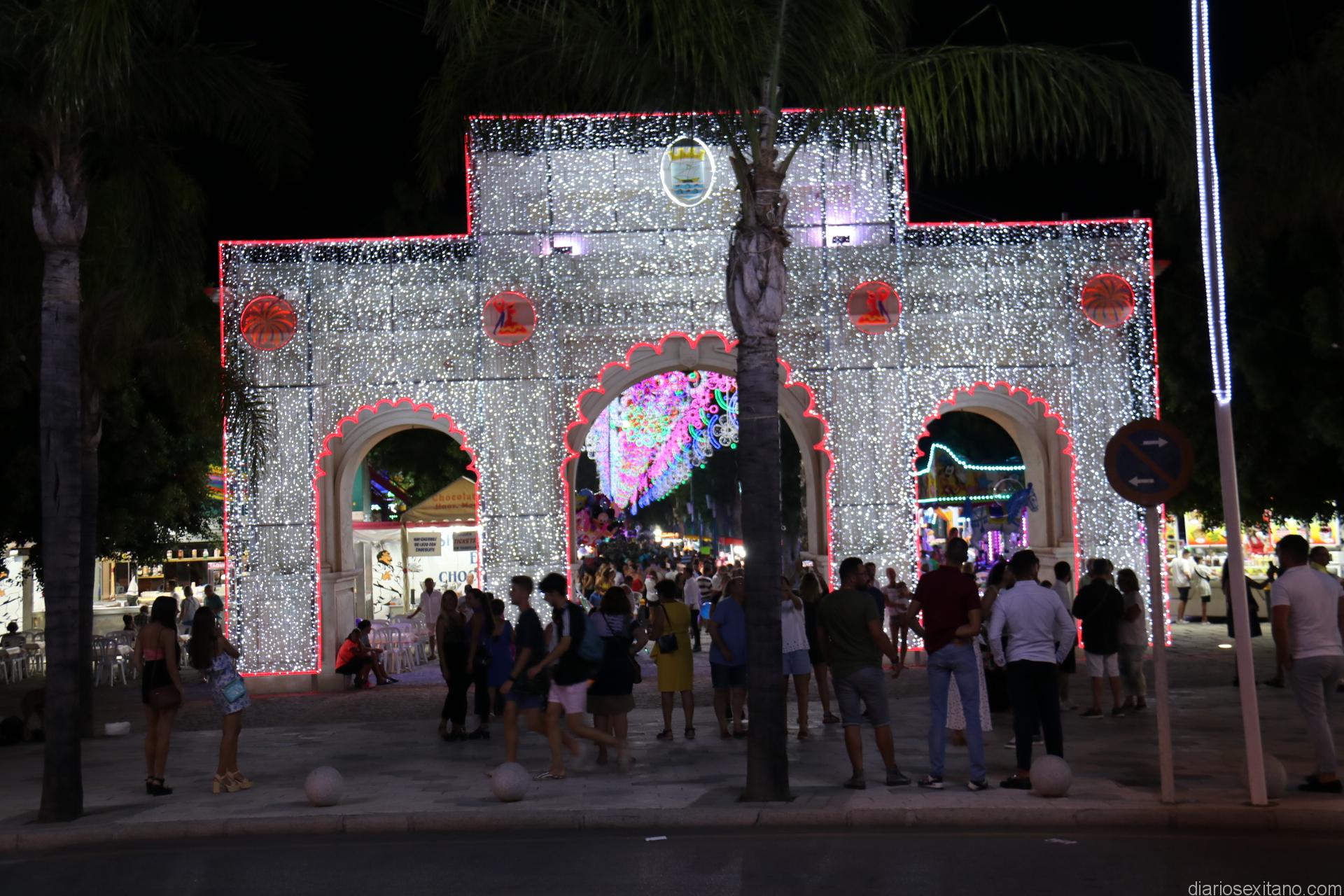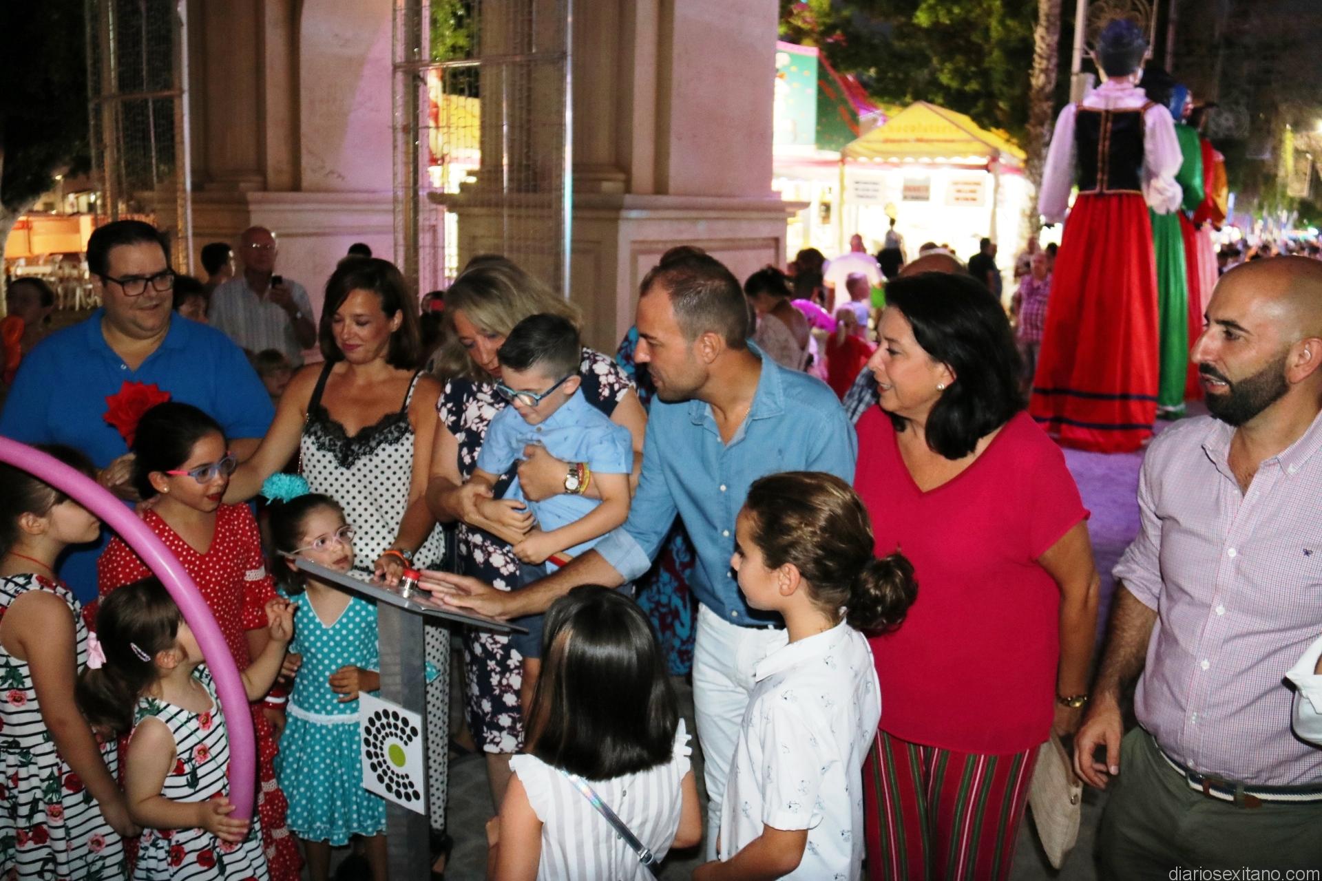 El encendido del alumbrado animó la noche en las atracciones y casetas que ocupan el recinto ferial. La alcaldesa, Trinidad Herrera, acompañada de miembros del equipo de gobierno, se rodeó de varios pequeños que apretaron el interruptor de la iluminación situado en la Puerta de Almuñécar, principal acceso al paseo Blas Infante.