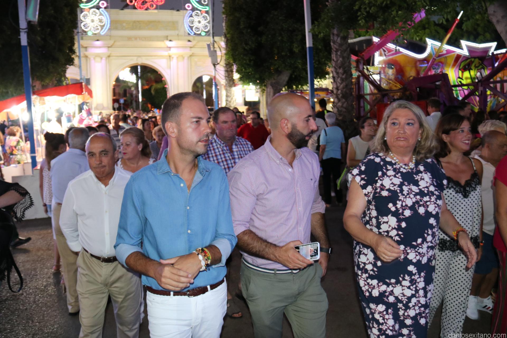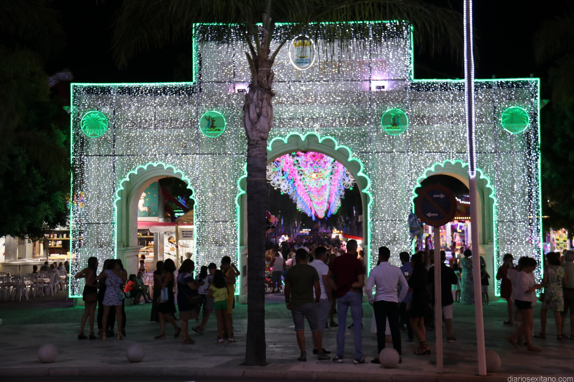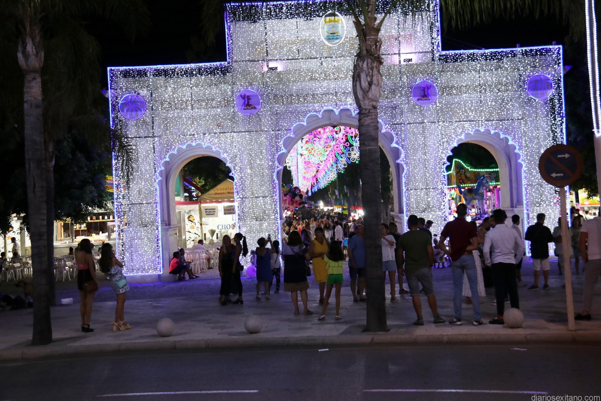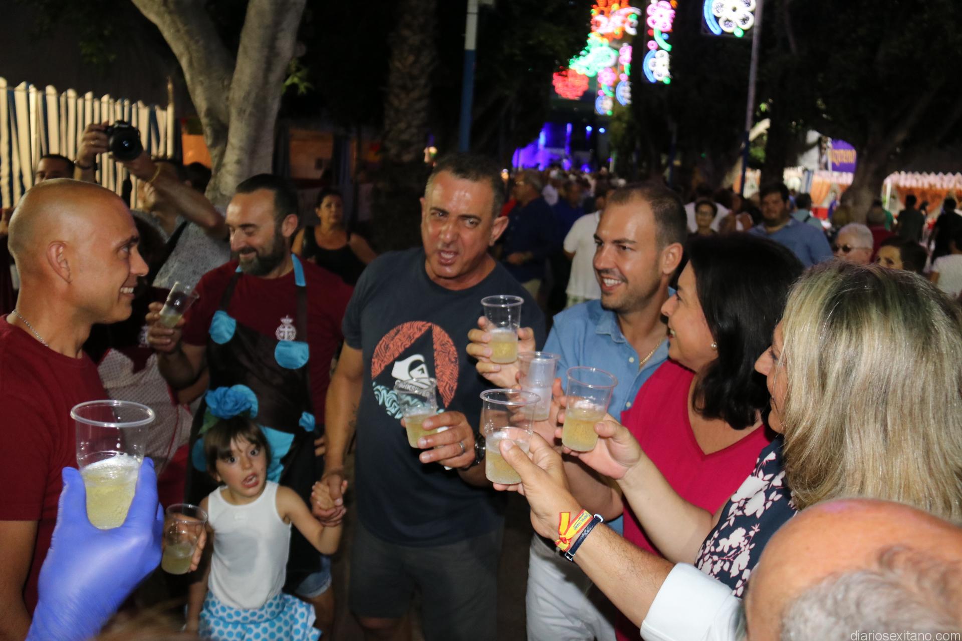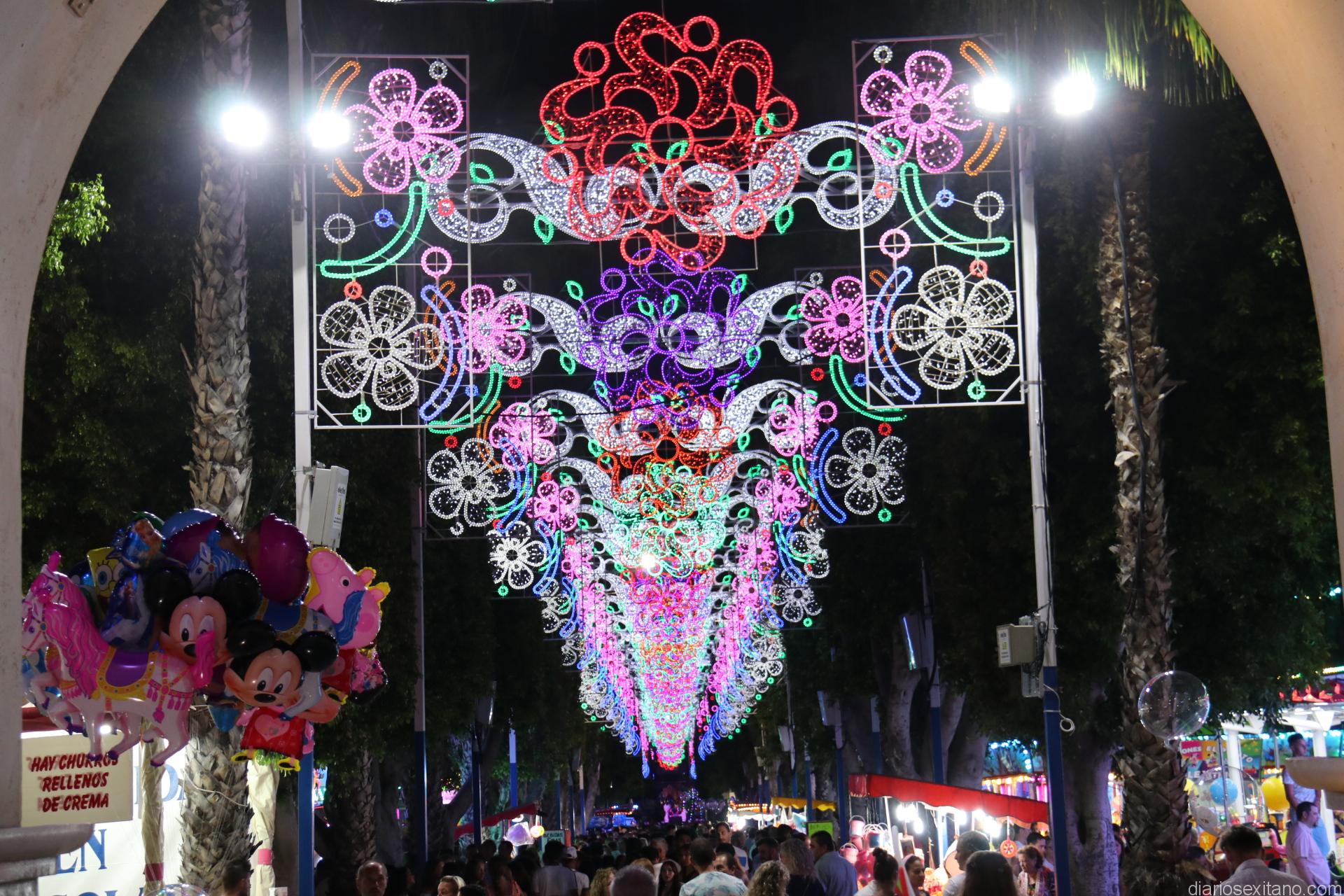 El encendido del alumbrado animó la noche en las atracciones y casetas que ocupan el recinto ferial. La alcaldesa, Trinidad Herrera, acompañada de miembros del equipo de gobierno, se rodeó de varios pequeños que apretaron el interruptor de la iluminación situado en la Puerta de Almuñécar, principal acceso al paseo Blas Infante.