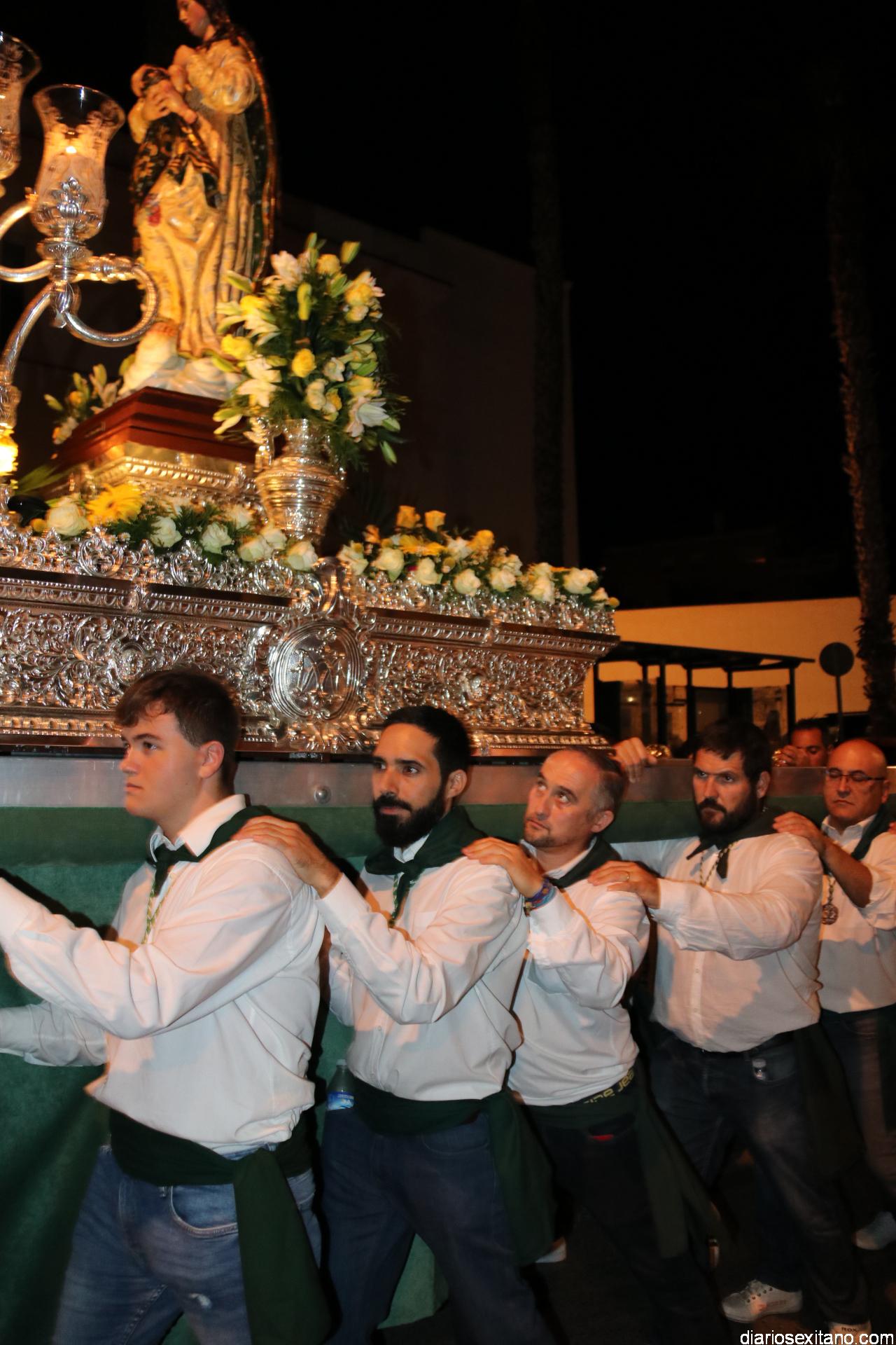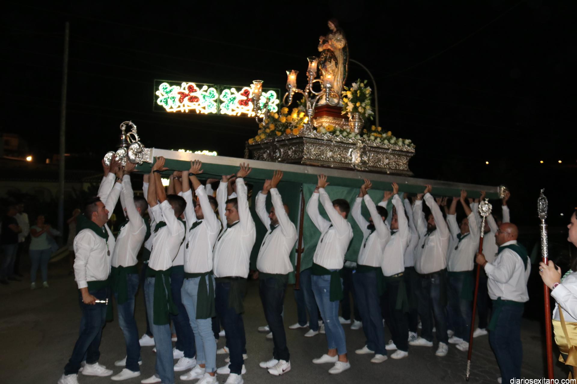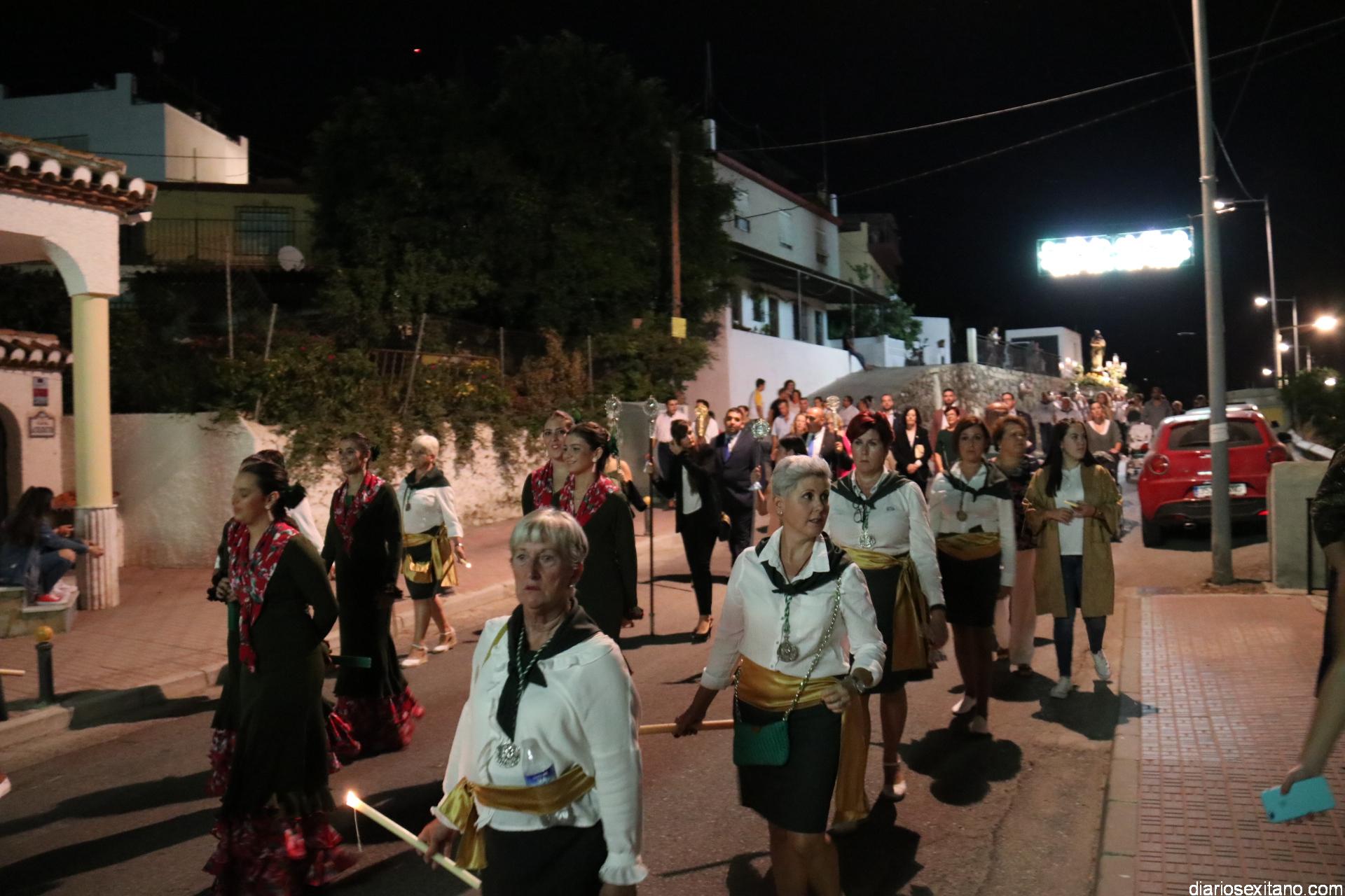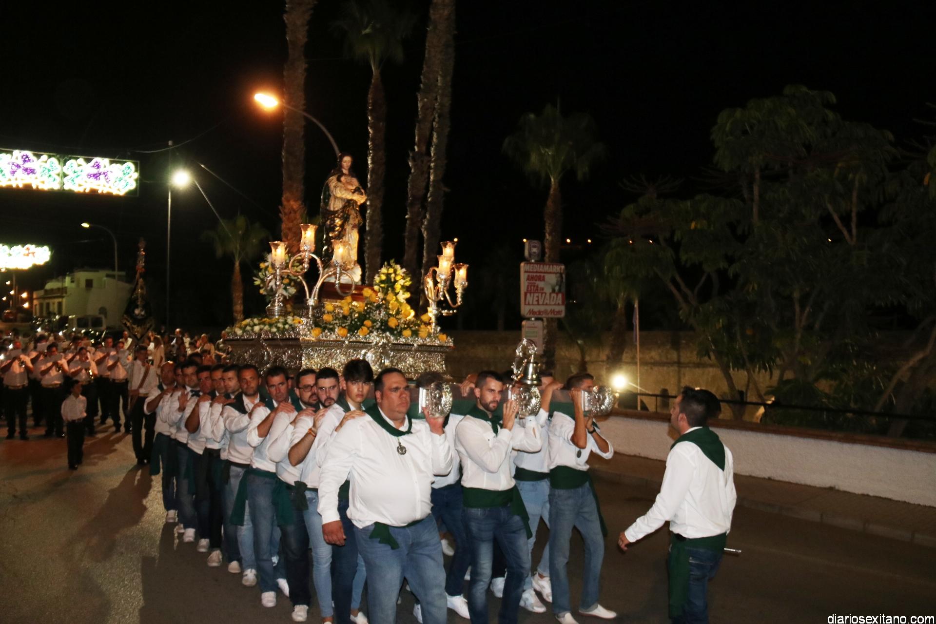 Ya por la tarde la Hermandad Virgen Madre tomaba su protagonismo en la organización de la procesión por el barrio, tras la celebración de la santa misa. La Imagen, acompañada por la Agrupación Musical Nuestra Señora de la Encarnación de Almuñécar, salió de la capilla y puso rumbo a la zona de Caicillos. En la salida no faltaron los bailes que ofrecieron Paola Almodóvar y su grupo de Andalucía Baila. Al cortejo se sumaron, en representación del Ayuntamiento, los ediles de Cultura y Fiestas, Alberto García Gilabert, junto con Rafael Caballero y Javier García, que fueron recibidos por el Hermano Mayor de la Hermandad, Lucas Vallejo.