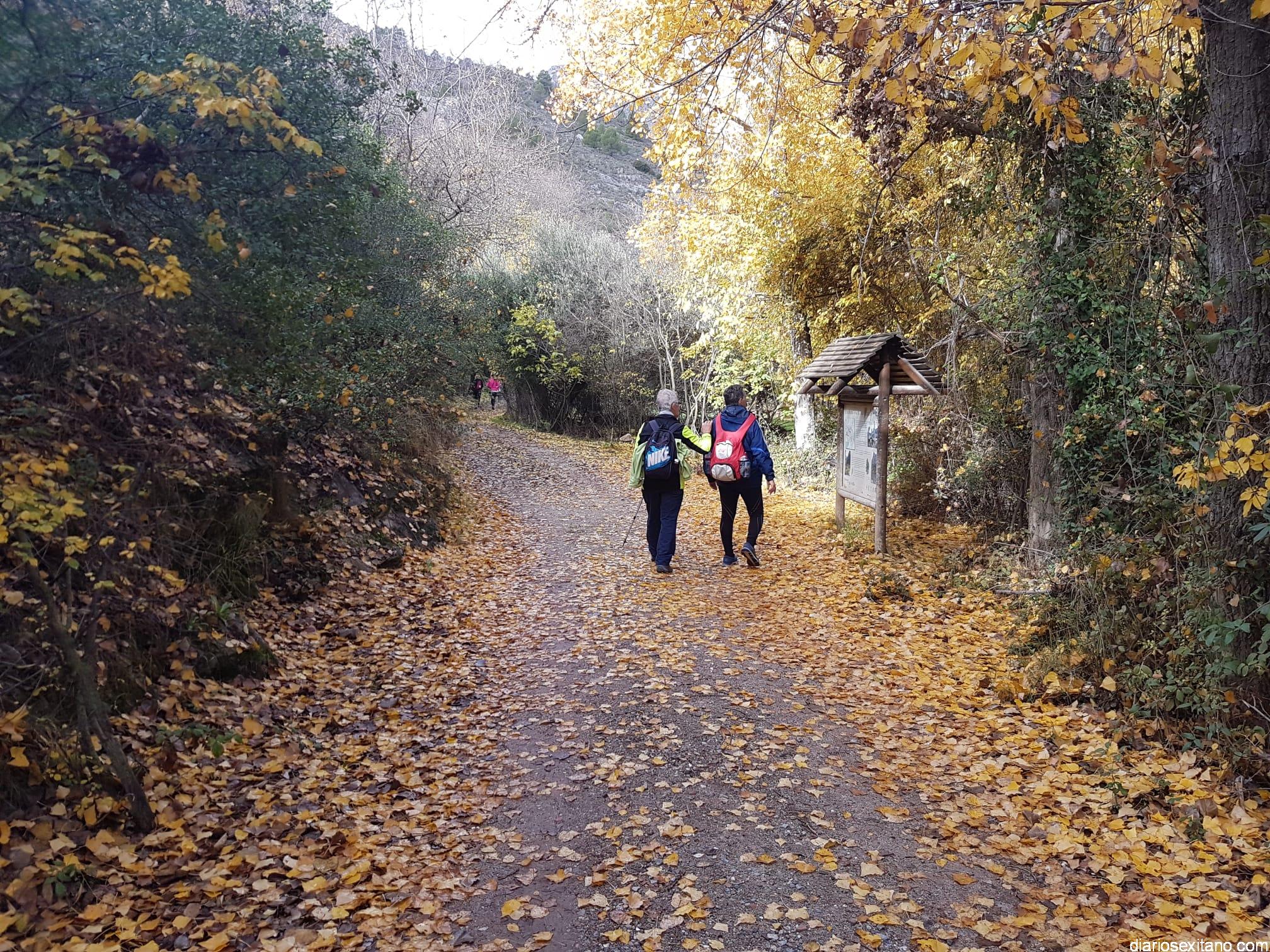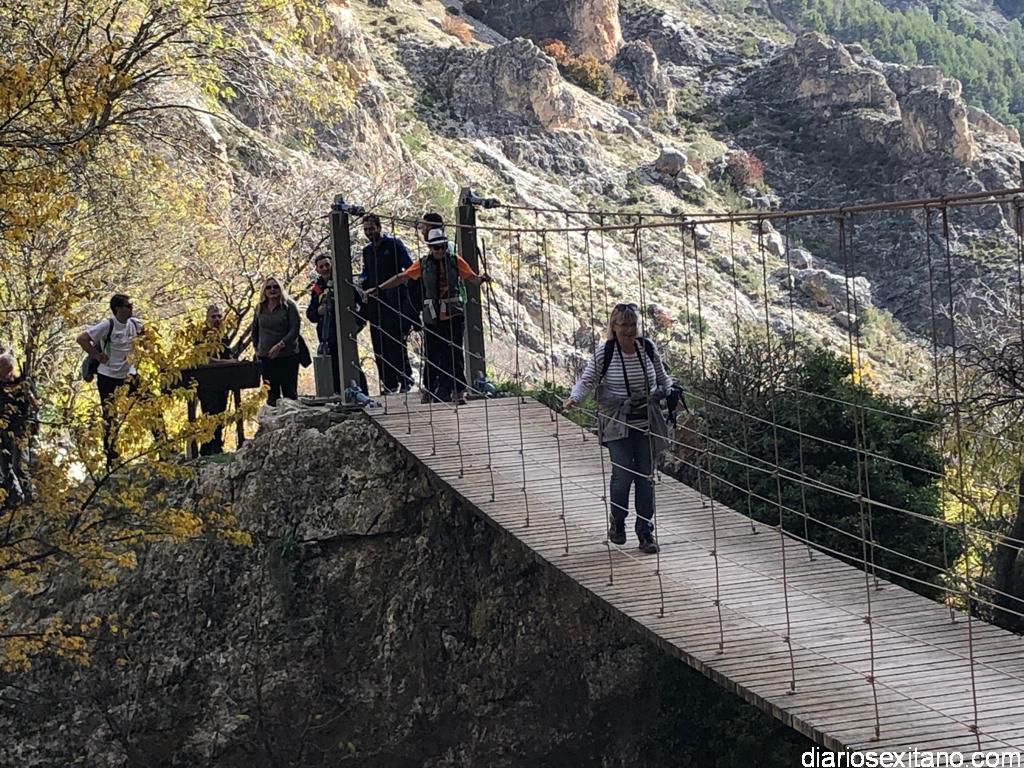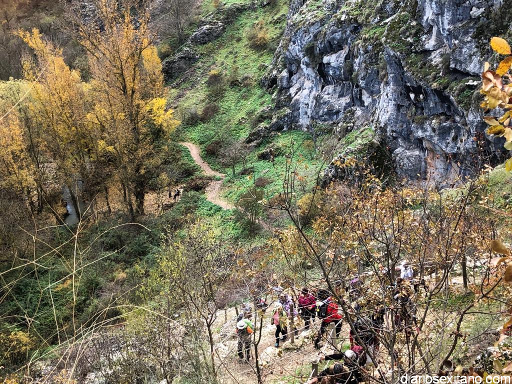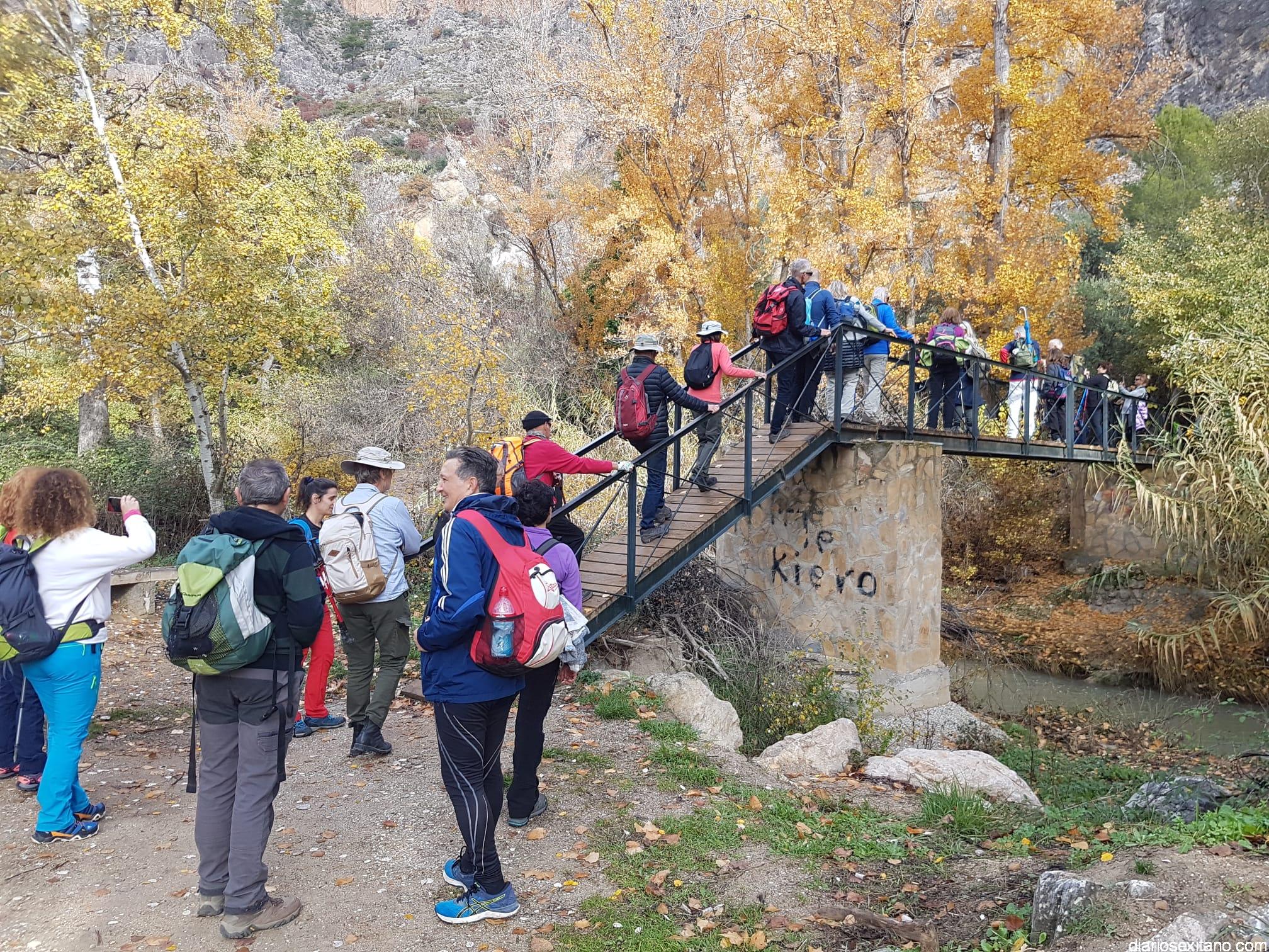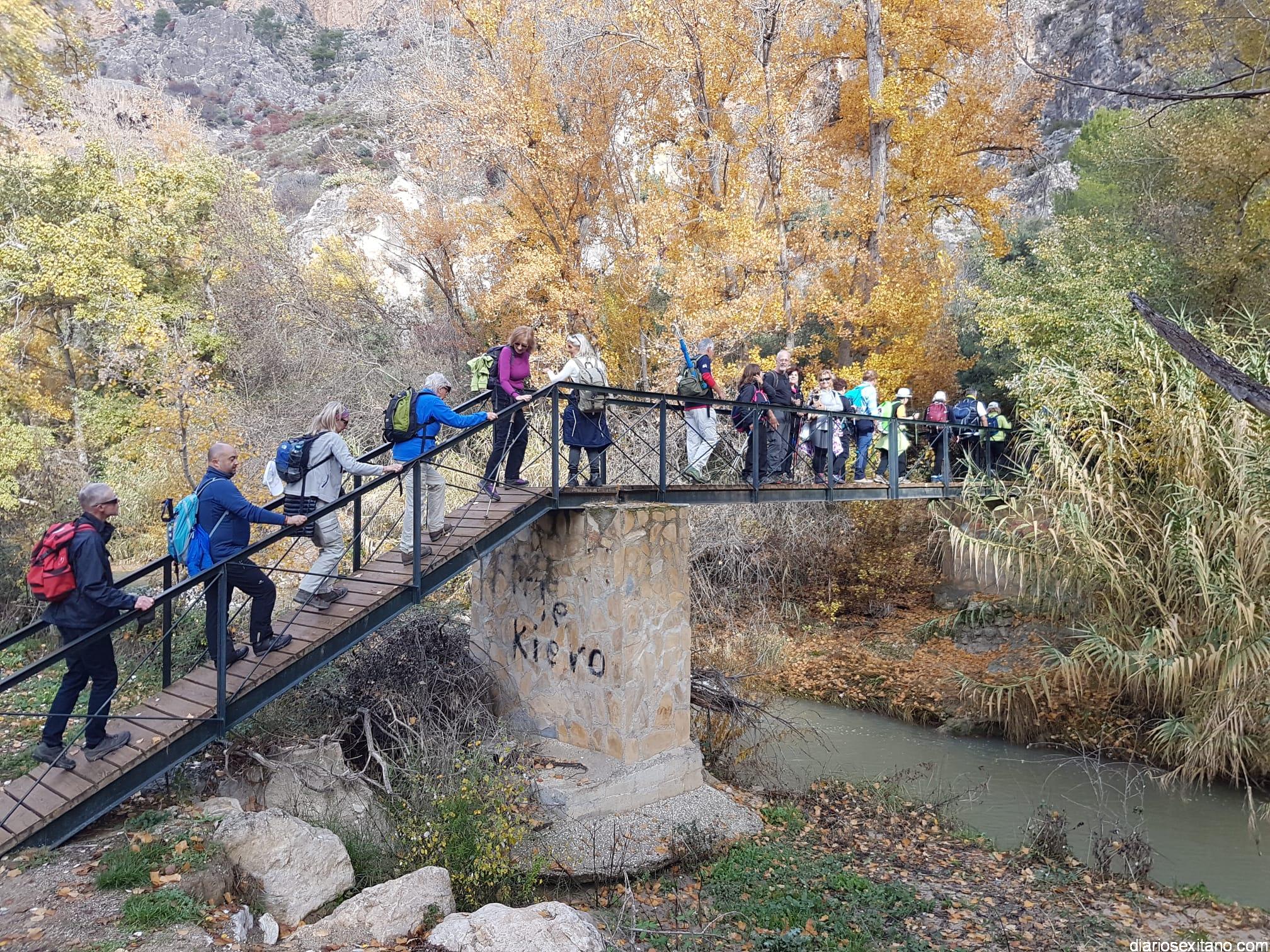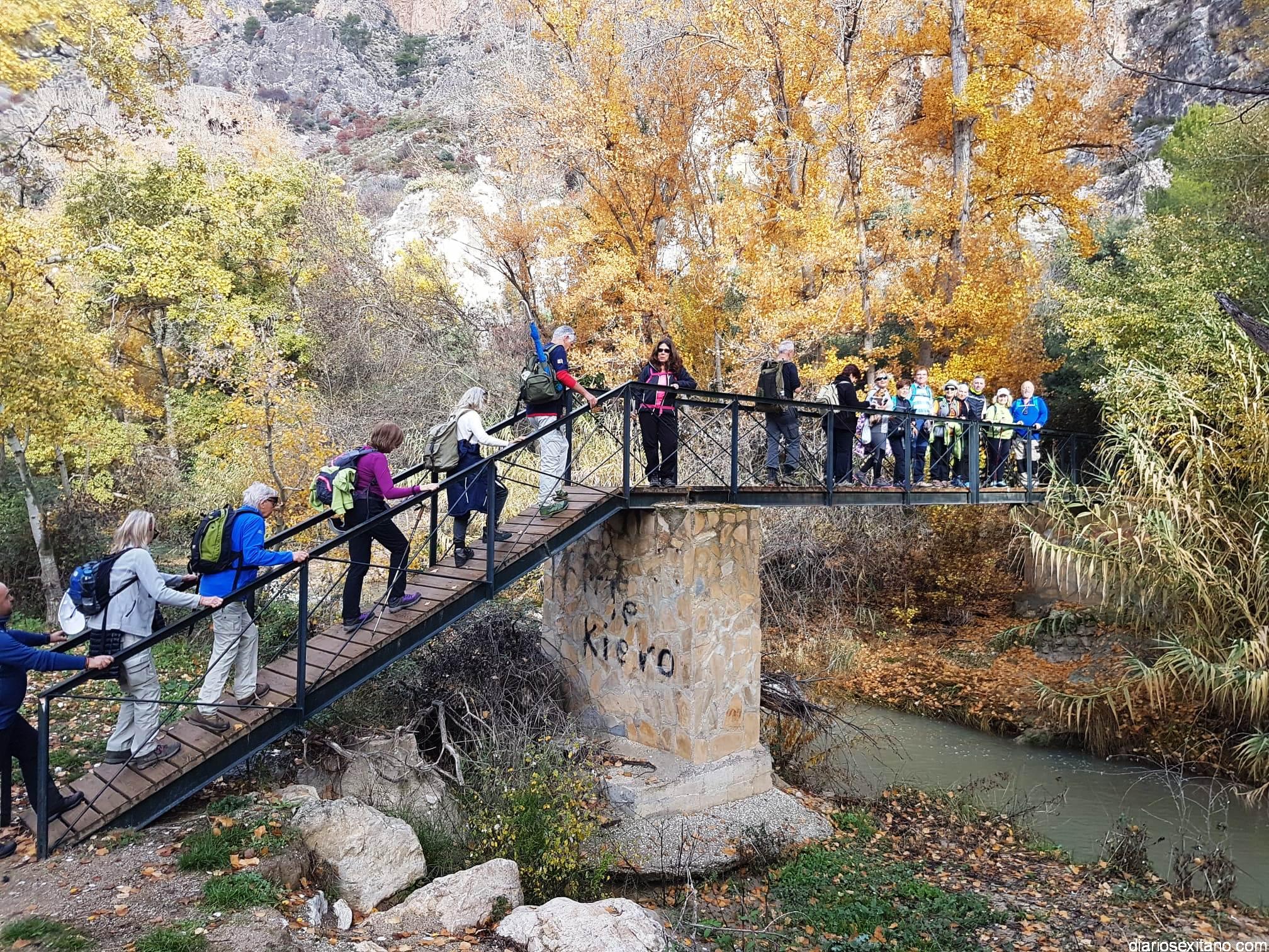 Los participantes, bajo la coordinación guía de Javier del Castillo y Rubén García, disfrutaron de los coloridos otoñales y los suelos alfombrados de hojas. No faltó la visita al Castillo-Alcazaba o al Cristo del Paño. A continuación los senderistas cruzaron el río Velillos y antes de alcanzar Olivares pasar por el sendero colgante para ver pinturas rupestres.