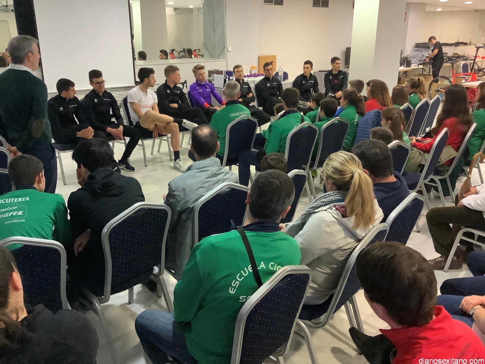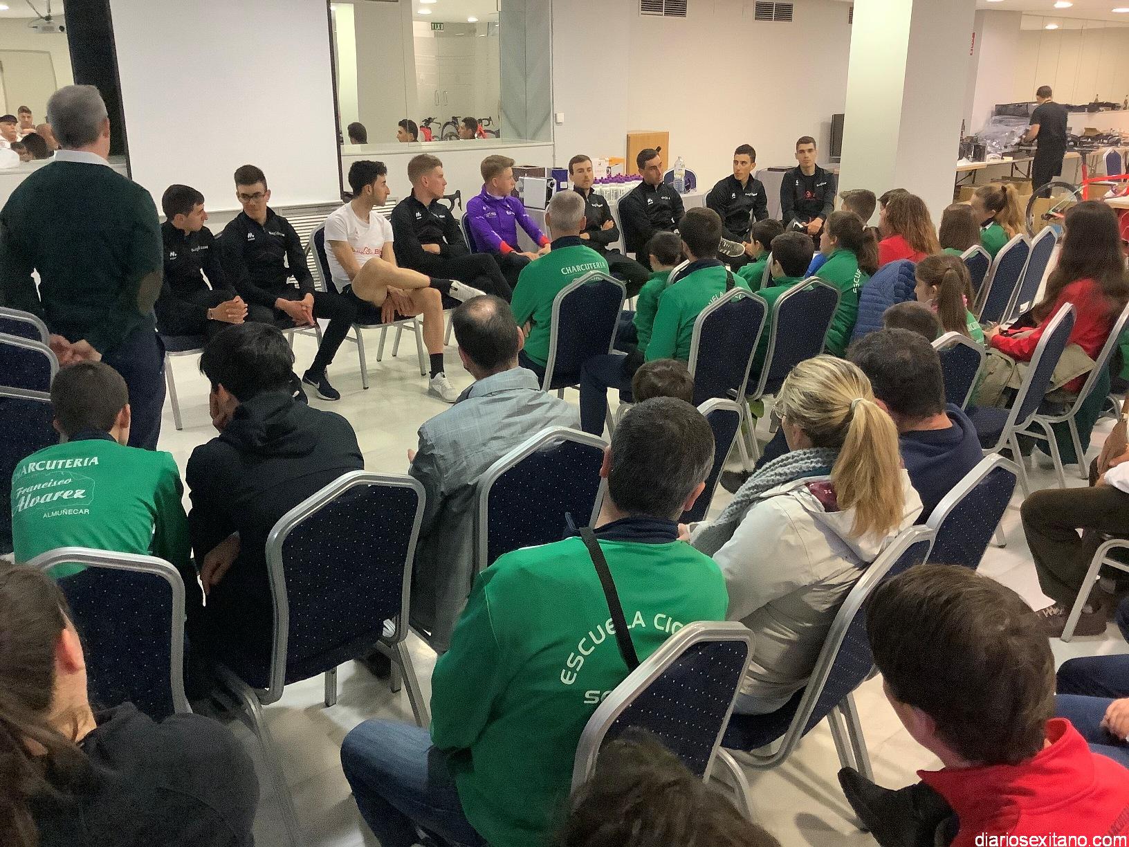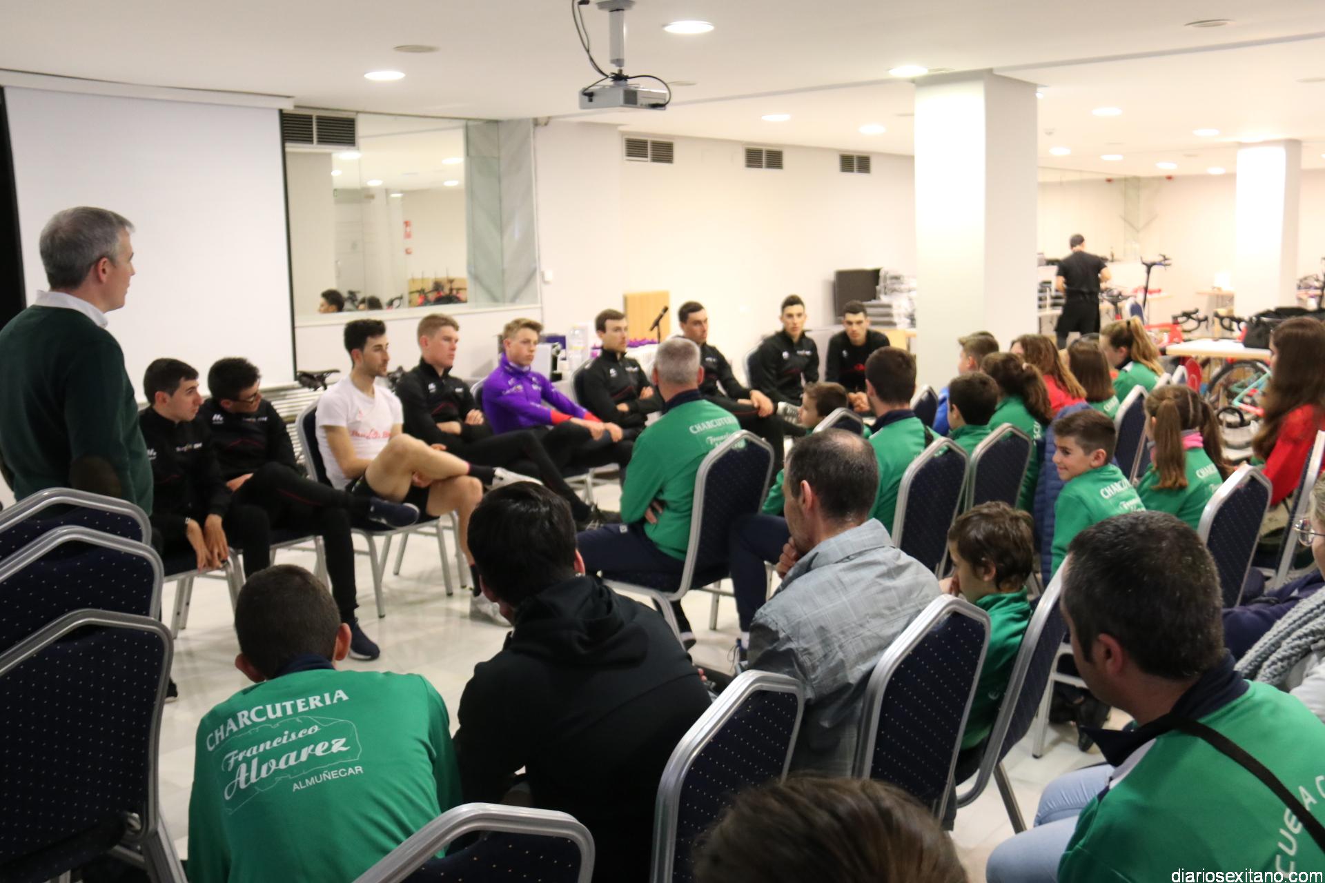 Los ciclistas de la Escuela de Ciclismo Sexitana, dependiente del Club Ciclista Almuñécar, vivieron este sábado una interesante experiencia al conocer mejor a los componentes del al equipo ciclista profesional Burgos BH que se encuentran concentrado estos días en el hotel Helios de Almuñécar.
