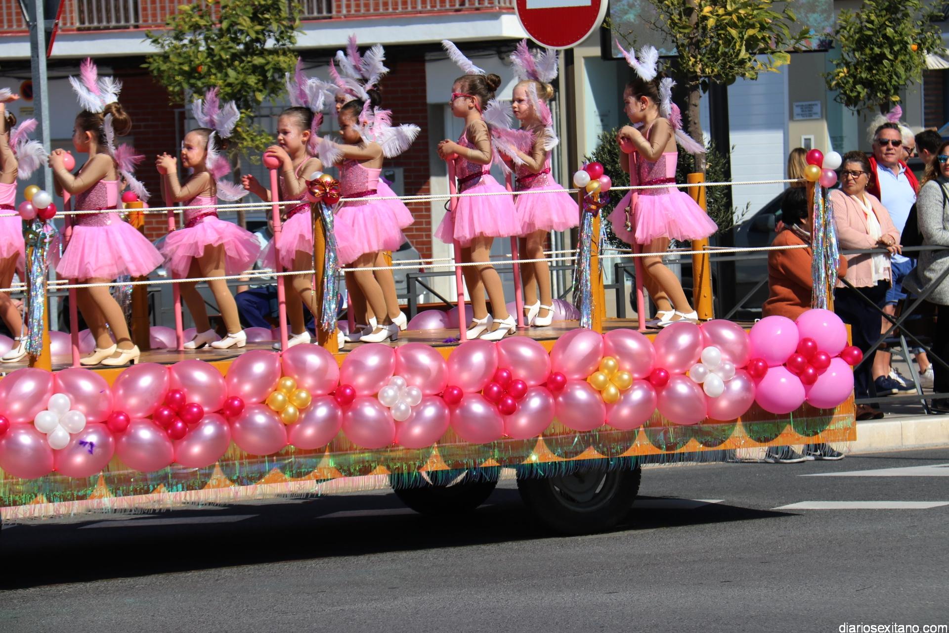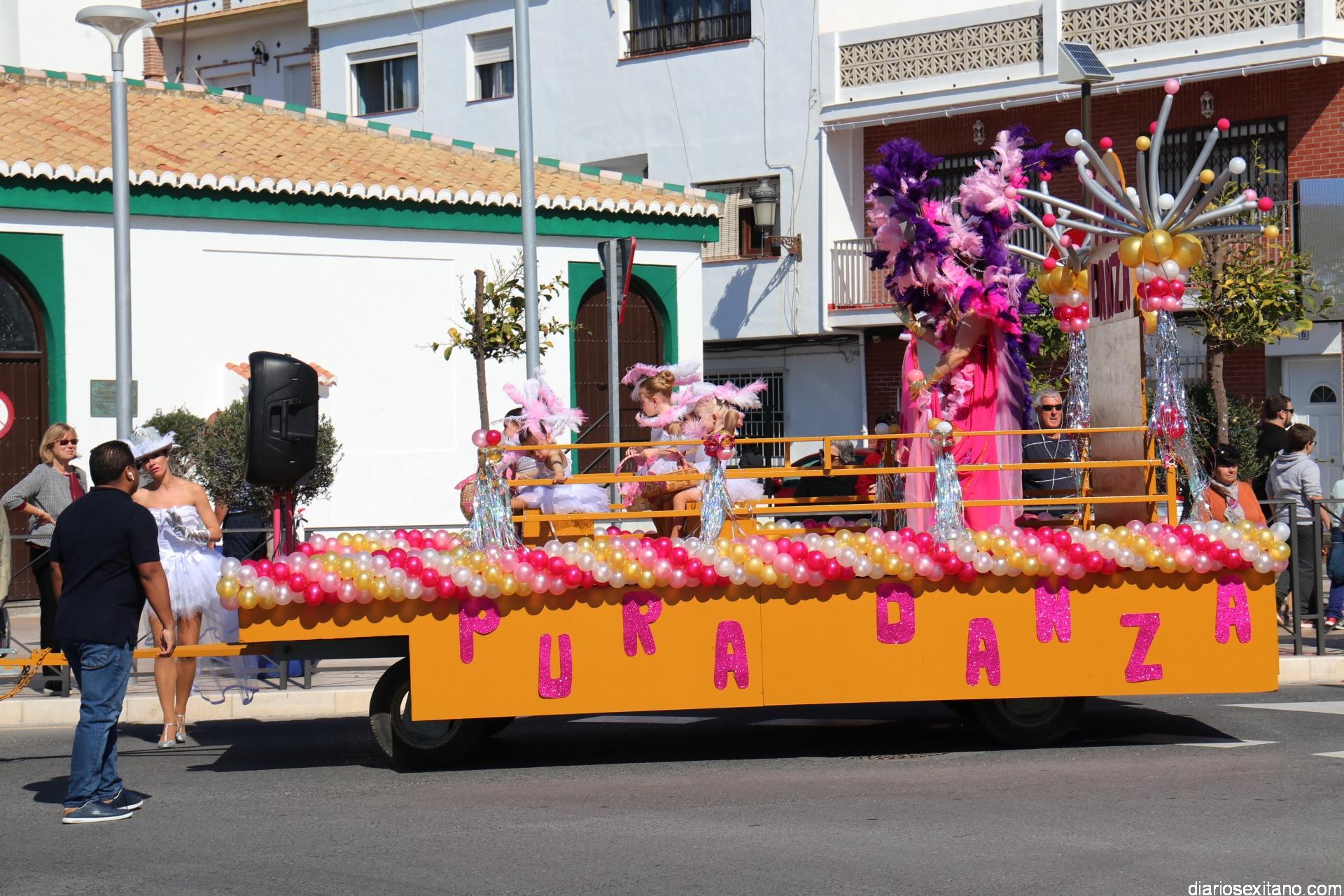 Batukada abría el cortejo donde no falto el baile y la coreografía de Animación que puso Pura Danza, a pie y también sobre dos carrozas ocupadas por las más pequeñas.