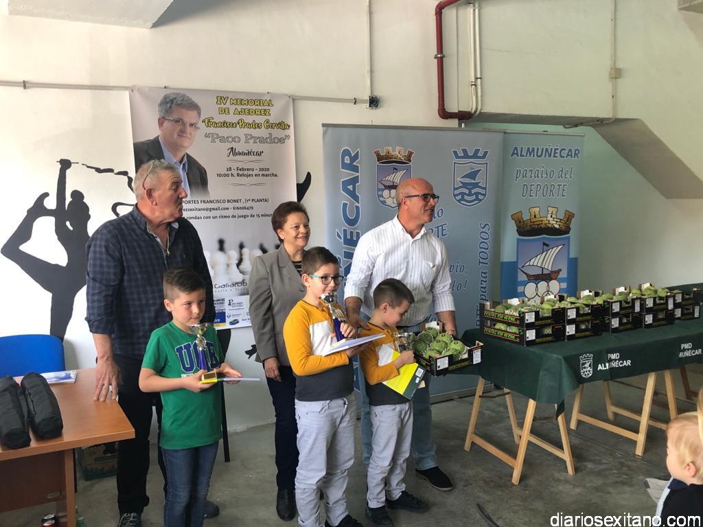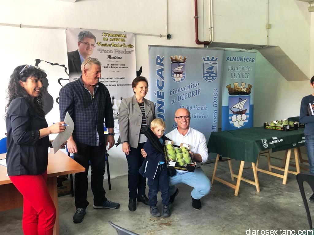 En el acto de entrega de premios, presidido por el concejal de Deportes, Luis Aragón: la viuda de Paco Prados, Ana Vigo, y el coordinador del torneo, Andrés Palacios, destacar los podios por categorías. En supra 50 de Jesús Carreño Losilla (Dama de Baza), en supra 65, el sexitano, Ricardo Puerta Rodríguez (Almuñécar); U8, David Pabón Hermann. En la categoría U10, Gael Ramos Sanjuan (Almuñécar); en U12, Antonio Fernández García (Motril); U14, Raúl Montes Bonet (Almuñécar); en U 16, Francisco Alejandro Herrera Salvador (Caballo de Plata) y en féminas, Anna Pabón (Coín), según los resultados que determinó la árbitro principal Toñi Martín Martín.