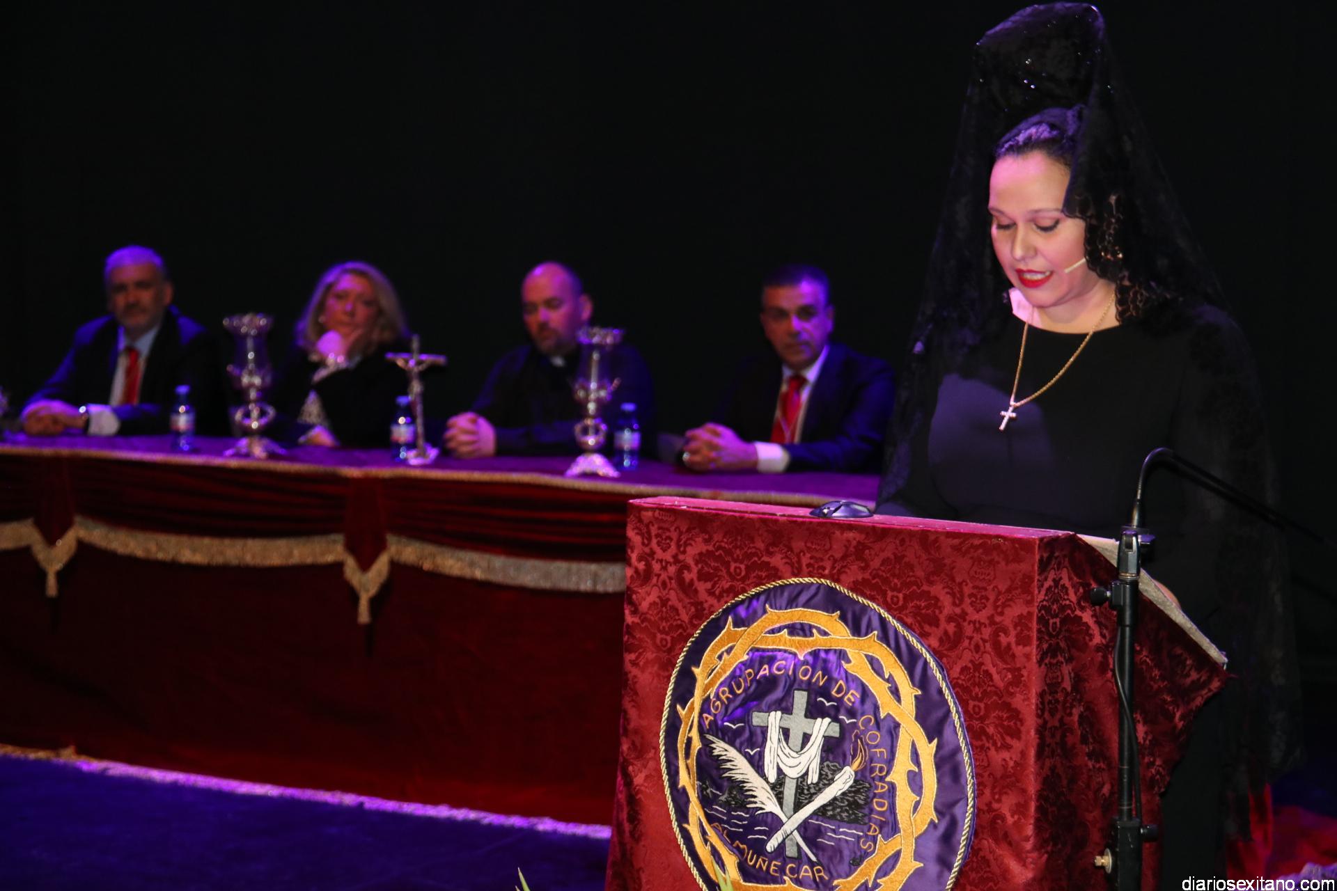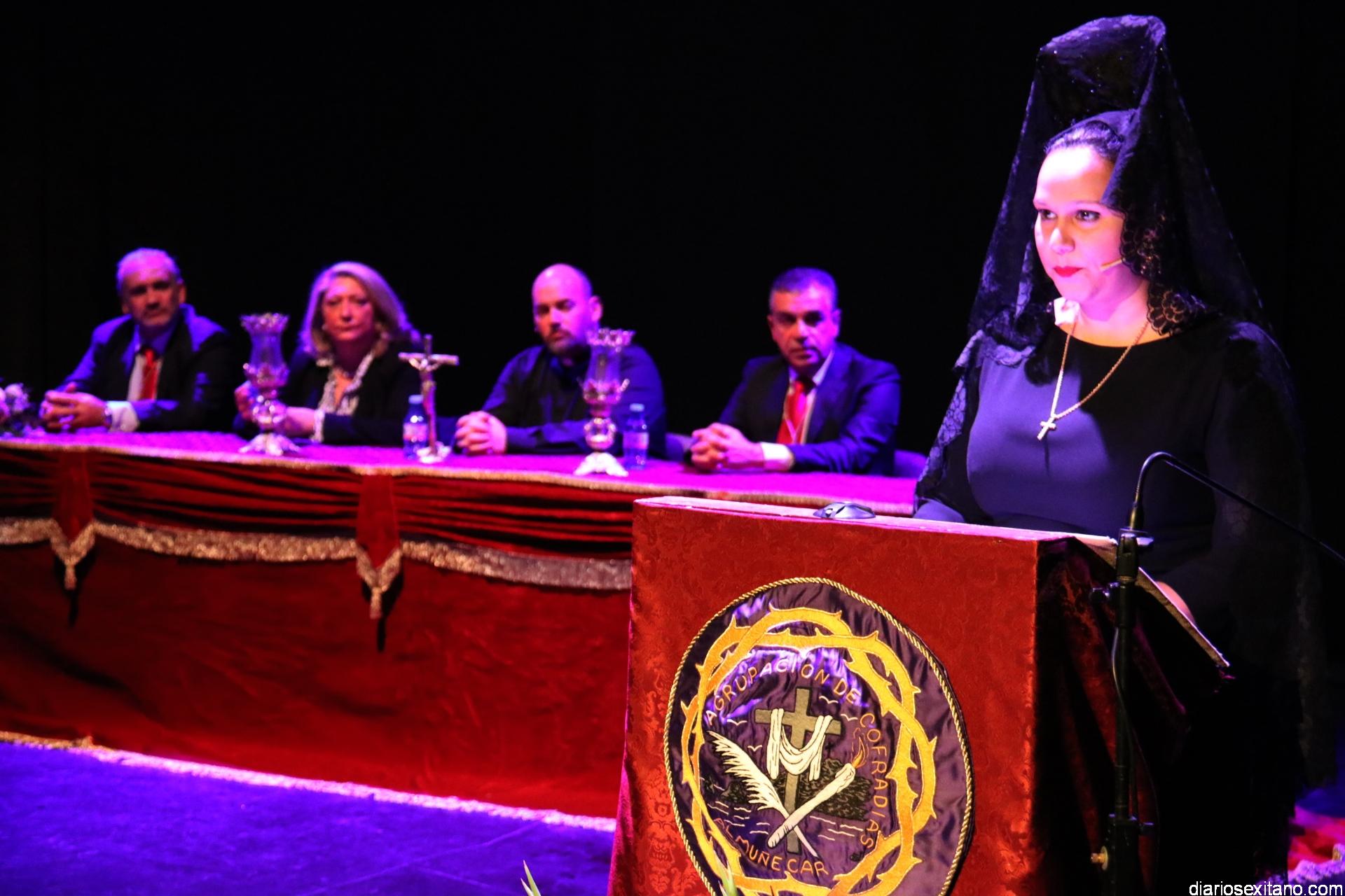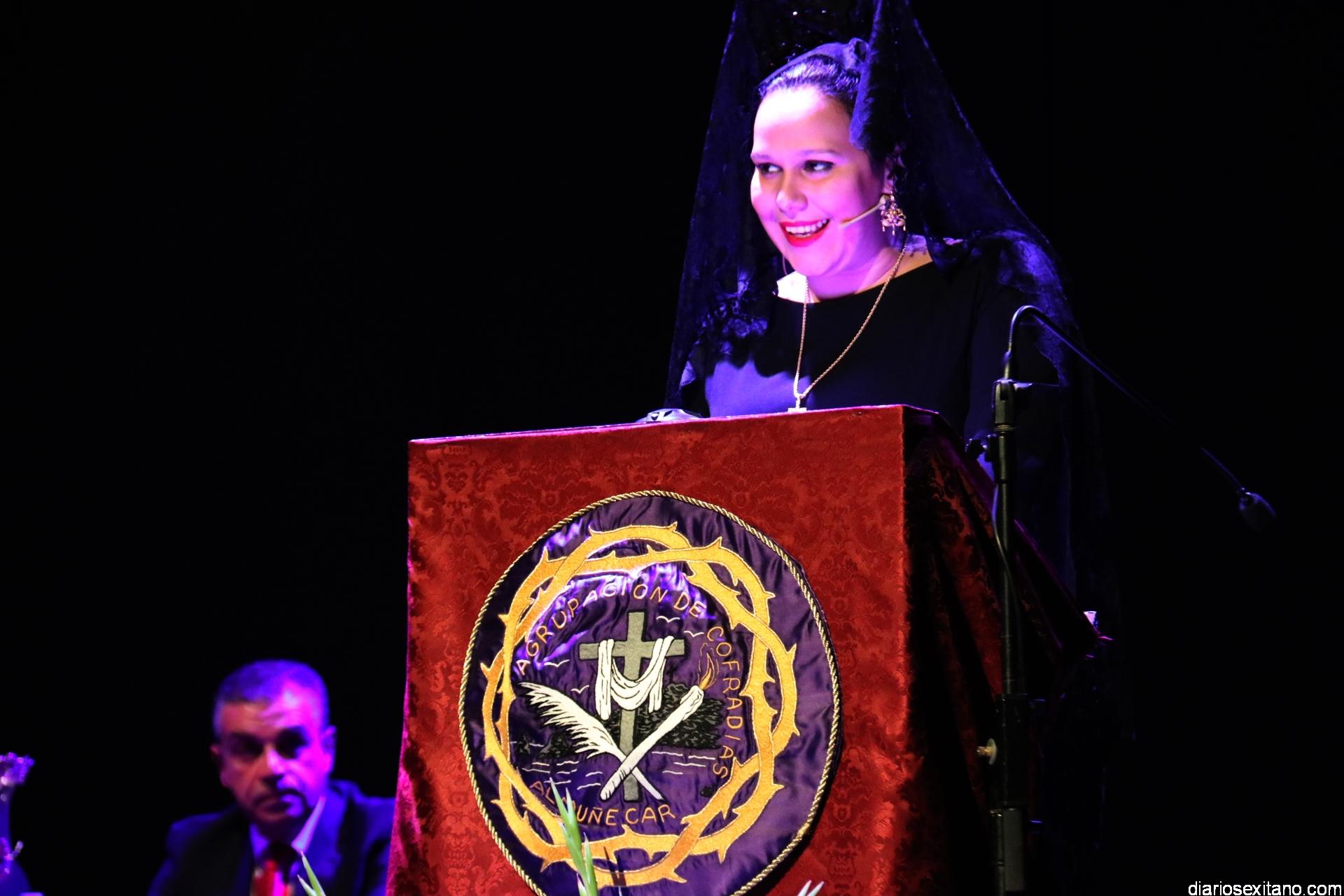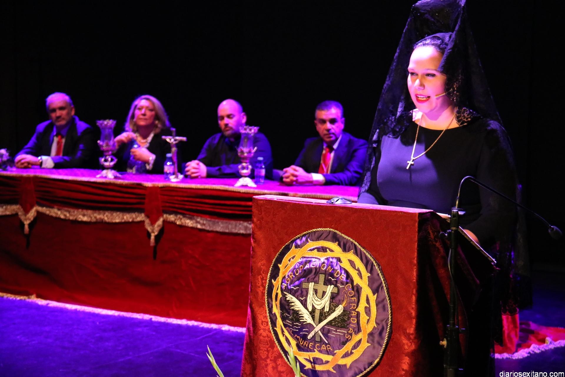 Rocío Moltó García, recibió numerosos aplausos durante su intervención, recordó cómo se vive por el mundo cofrade el tiempo de espera de la Cuaresma, antes de ir desgranando de una forma bella, poética y religiosa la vivencia de los cofrades con todos los titulares de cada una de las cofradías y hermandades de la Semana Santa de Almuñécar. Desde la Entrada de Jesús en Almuñécar pasando por la Salud y continuar con el Huerto y los Gitanos. Por cierto, que en este momento recordó al desaparecido cantaor flamenco Antonio de Canillas, atreviéndose a recordar una saeta de éste interpretada en la Semana Santa de Málaga y de la que la pregonera fue testigo.