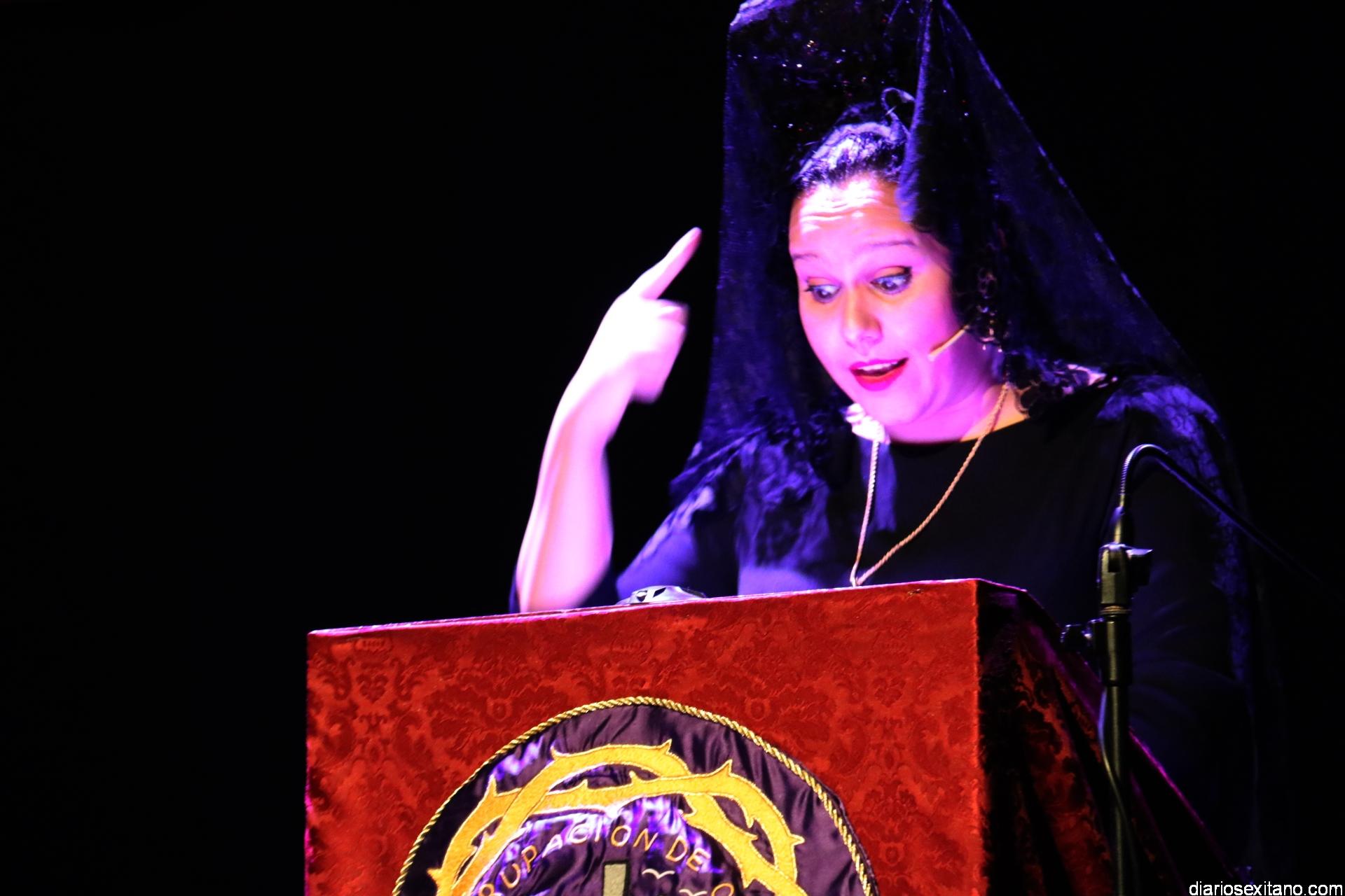 La pregonera, que fue presentada por Bartolomé Martos Cobo, presentador y productor en Canal Sur Radio y Televisión, llegó al escenario del auditorio de la Casa de la Cultura de Almuñécar vestida de rigurosa mantilla negra, tras destacar, a modo de introducción, su vinculación con la Semana Santa almuñequera y la belleza natural, atractivos históricos y la riqueza agrícola de los subtropicales… y por supuesto el momento de la llegada de la Semana de Pasión con la primavera, pasó a realizar una defensa de la mujer y su papel en la familia y la sociedad, después de preguntar: “¿Qué sería del mundo sin las mujeres?. Se digo yo, y se lo digo claro: Nada. La mujer es la que da la vida: madre, mujer, hermana… No quiero que mis palabras se entiendan que la mujer tiene que estar por encima del hombre, que nada más lejos de mis palabras”. En este sentido destacó la Virgen y su papel como madre, destacando así la madre, como creadora de vida.