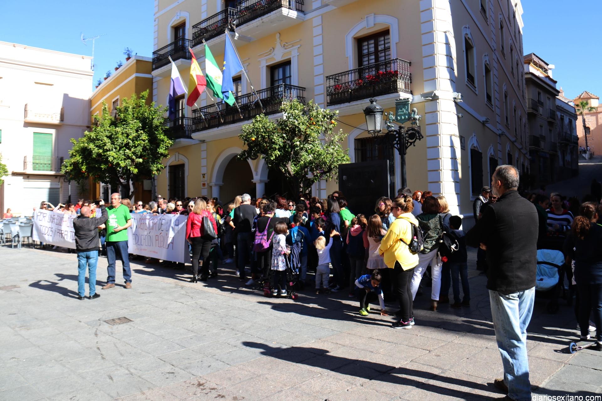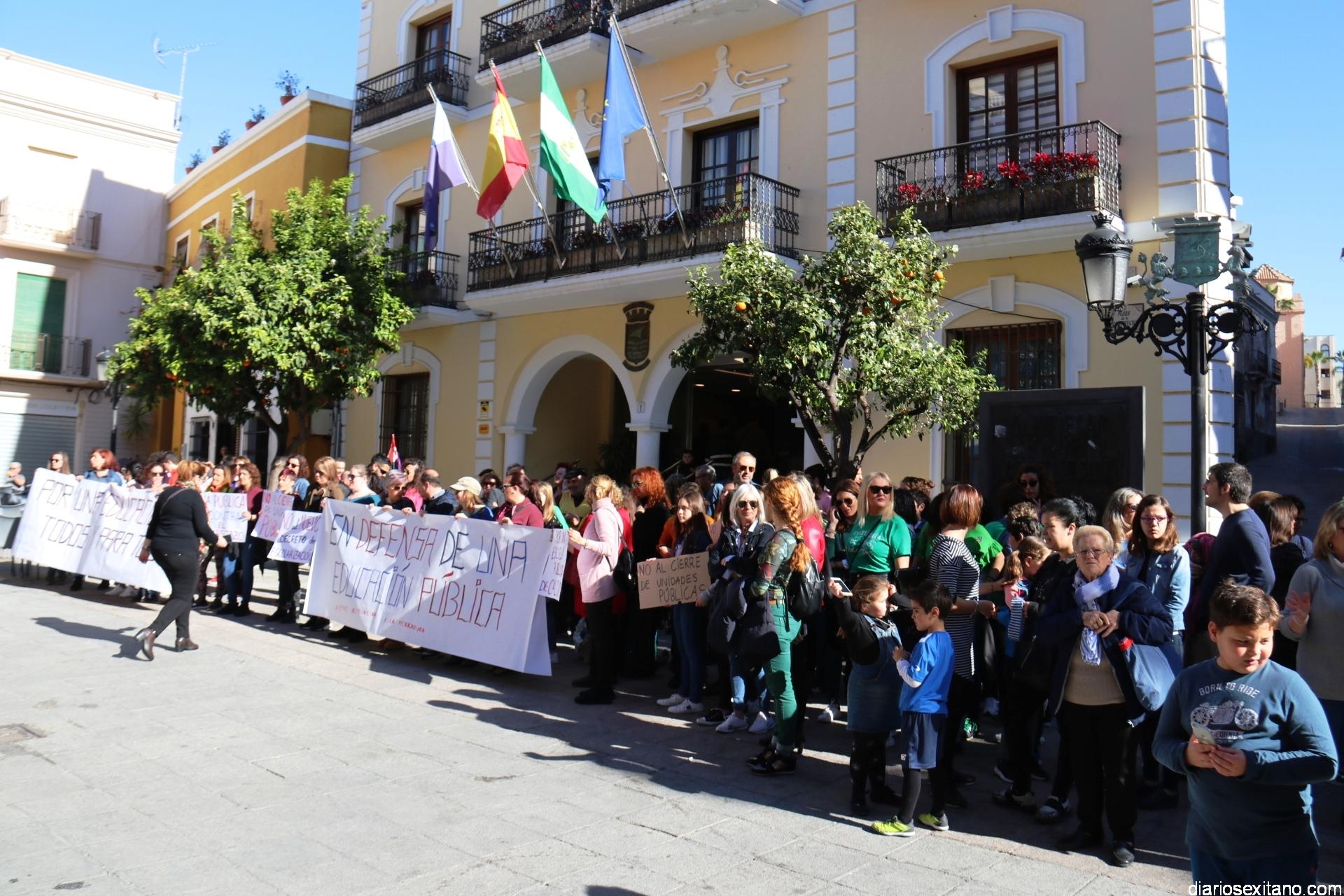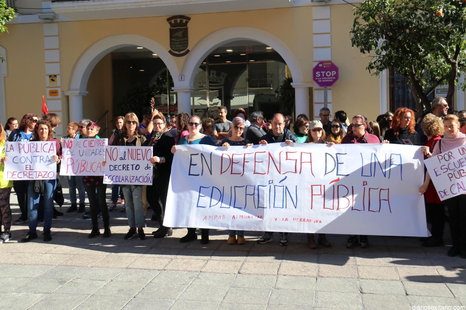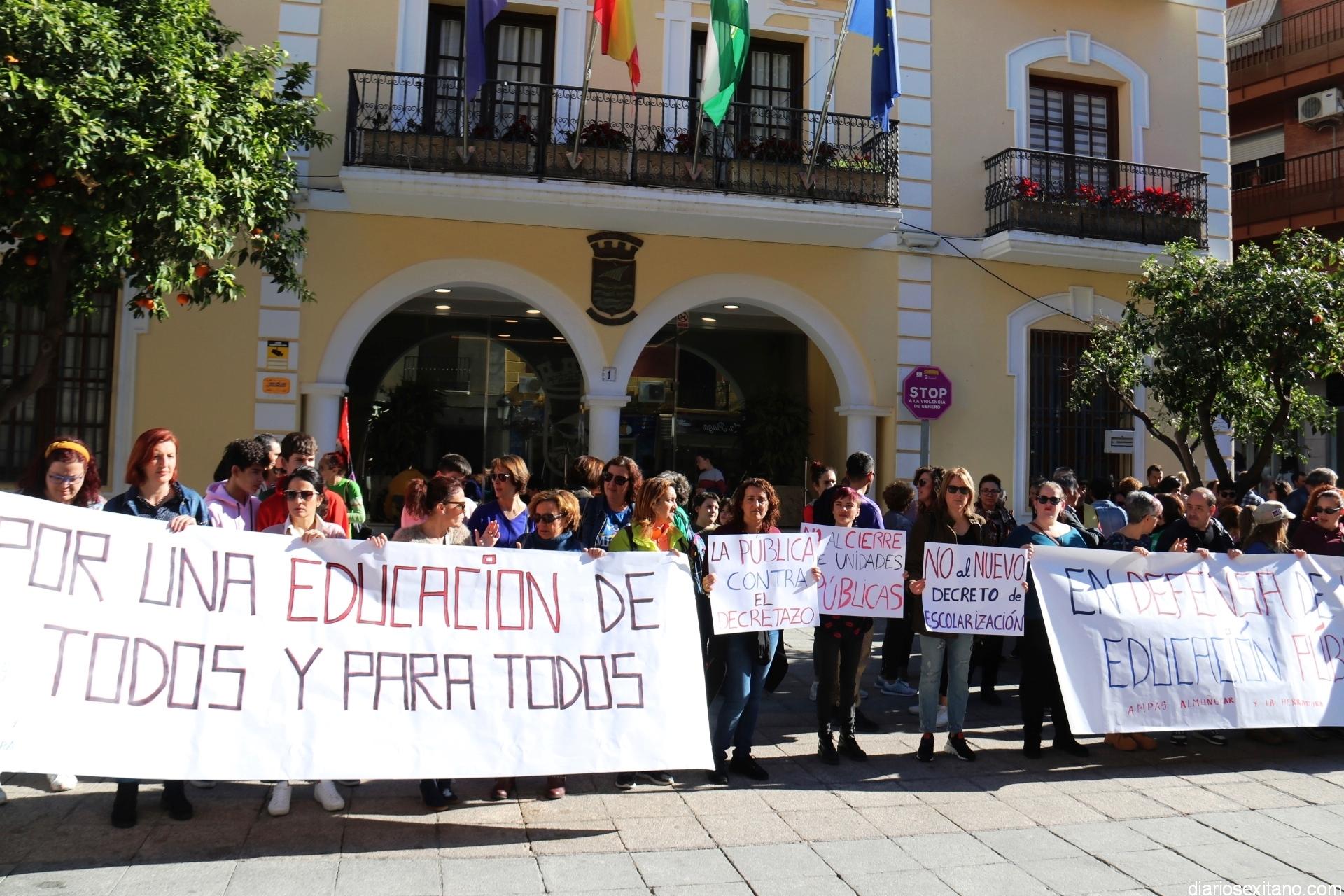 Bajo el lema “No al cierre de unidades públicas” y “No al decreto de escolarización, las AMPAS de varios centros de Almuñécar y La Herradura han llevado a cabo una concentración protesta este miércoles en la plaza de la Constitución, a las puertas del Ayuntamiento, donde acudieron alumnos, madres, padres y profesores.