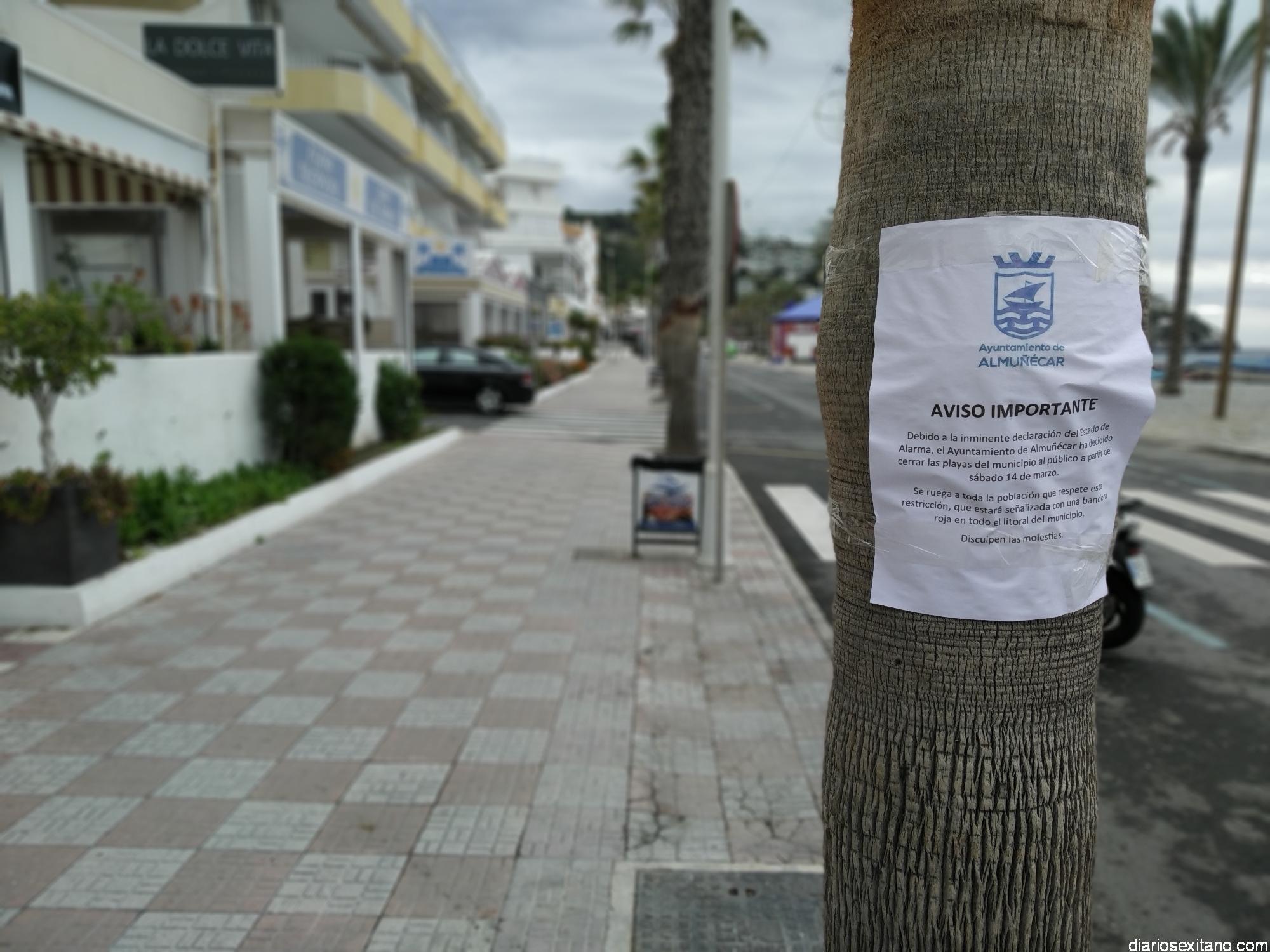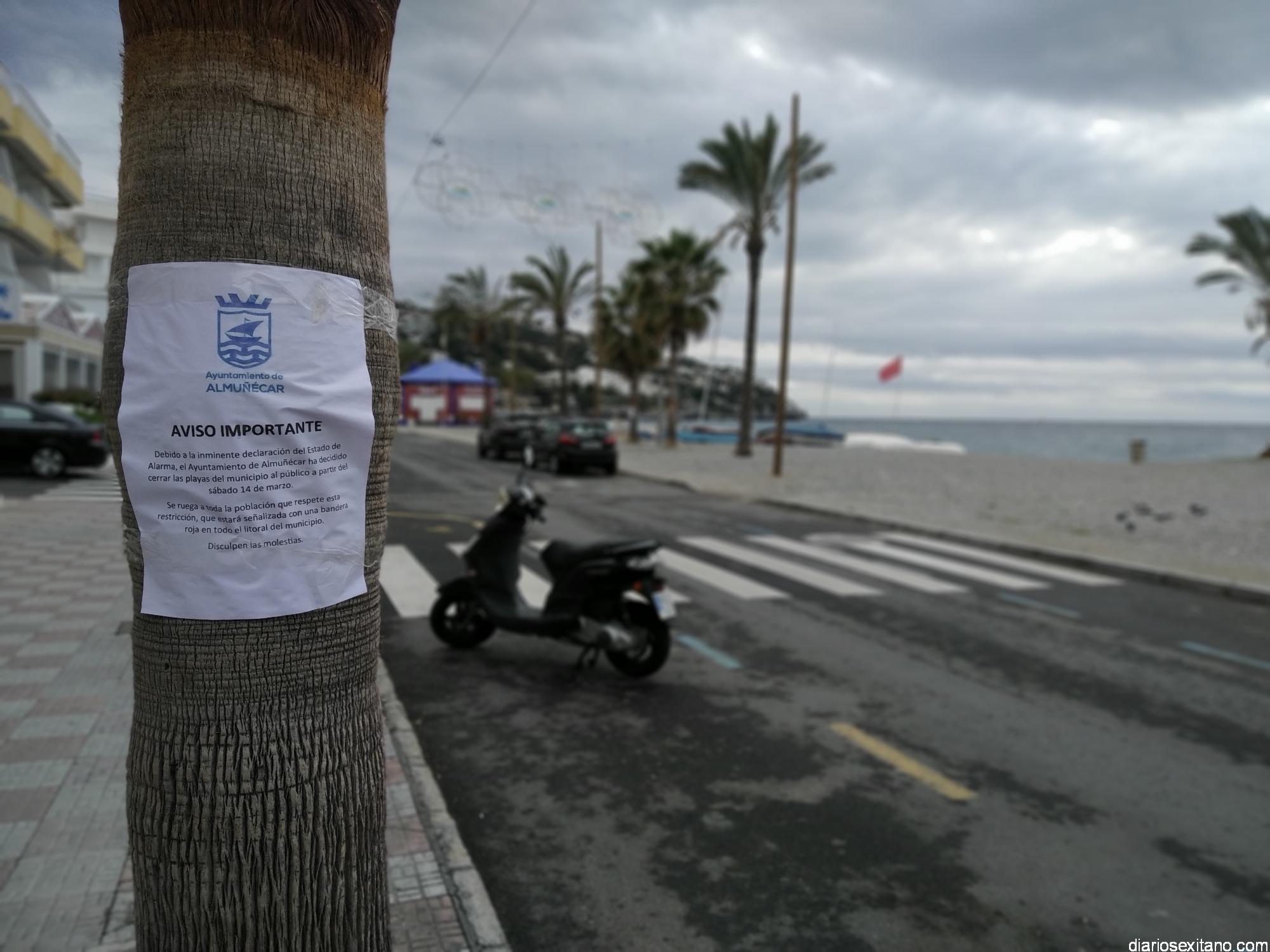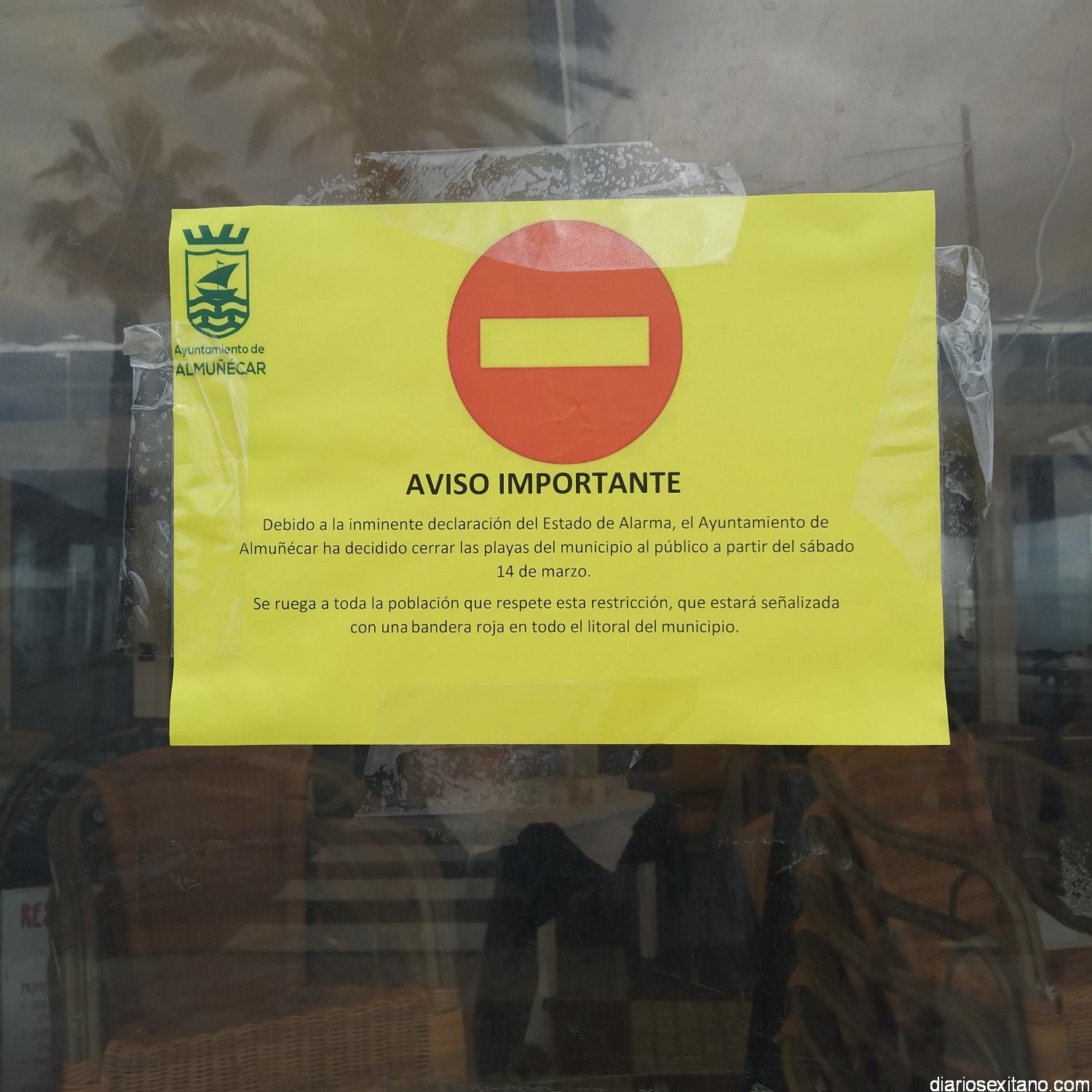 Las imágenes de terrazas de la primera línea de playa con las mesas recogidas y cerradas. El silencio roto por algún coche esporádico y algunas colas en las puertas de establecimientos de alimentación, panadería o frutería por decisión de los propios clientes y guardando la distancia… son imágenes que se han visto en esta primera jornada laboral del estado de alerta en La Herradura.