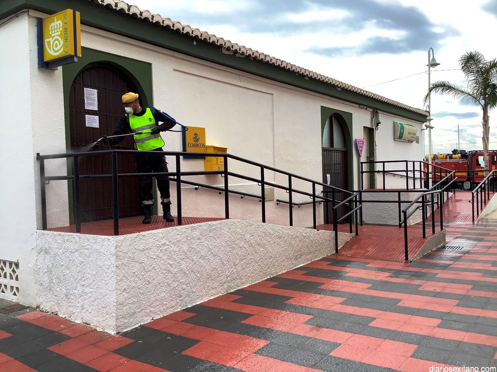 Fue el concejal herradureño de Turismo, Daniel Barbero, quien los recibió y acompañó mientras realizaron las tareas de desinfección por el exterior del edificio, que acoge el Mercado Municipal, Correos y el Centro de Salud, para seguir por los accesos y el interior de la sala de espera y consultorios del Área de Salud.