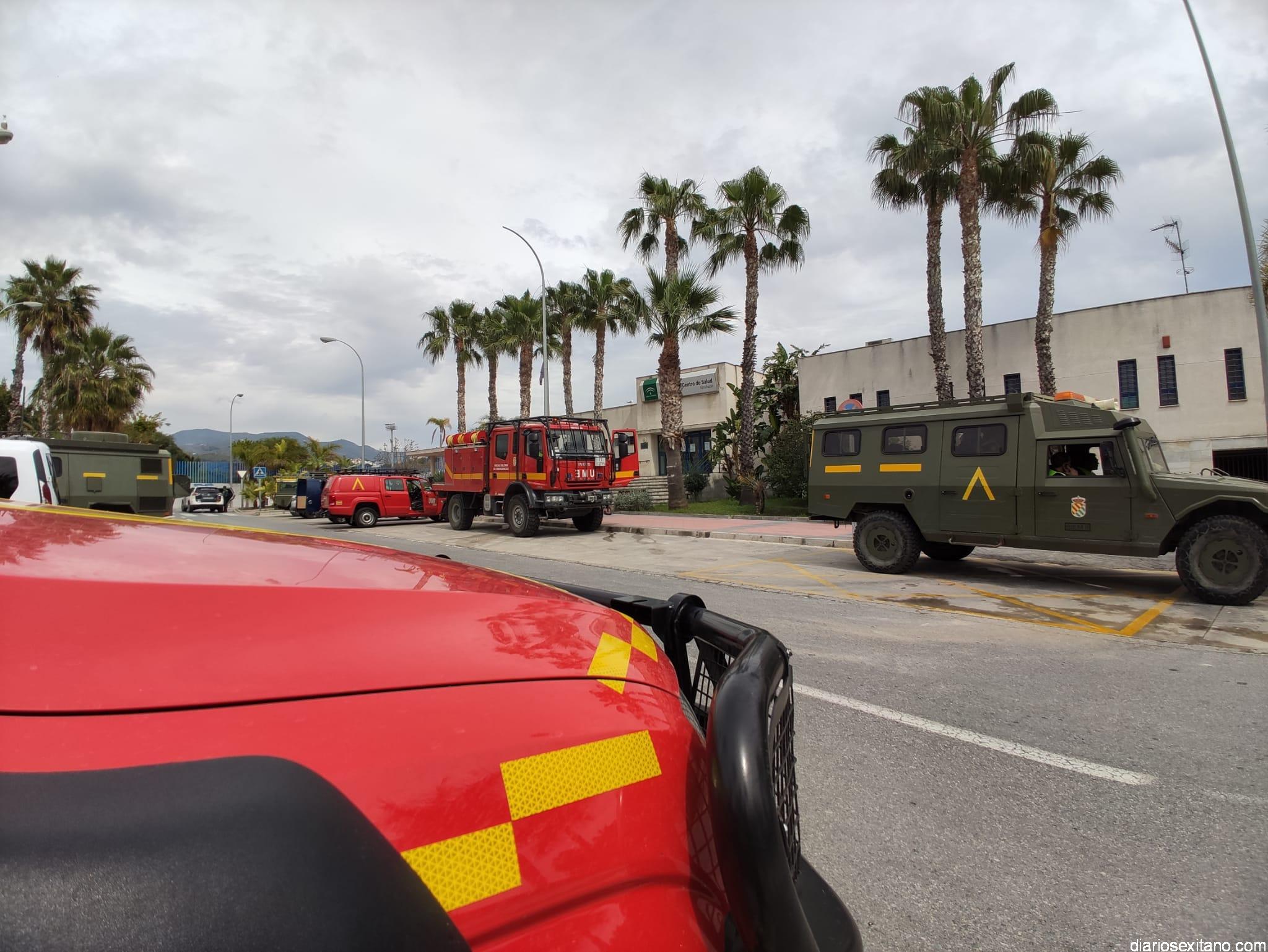 Un pelotón de la Unidad Militar de Emergencia (UME), junto con tres policías militares, ha llevado a cabo desde primera hora de la tarde labores densinfectación de los centro de salud de Almuñécar y La Herradura.