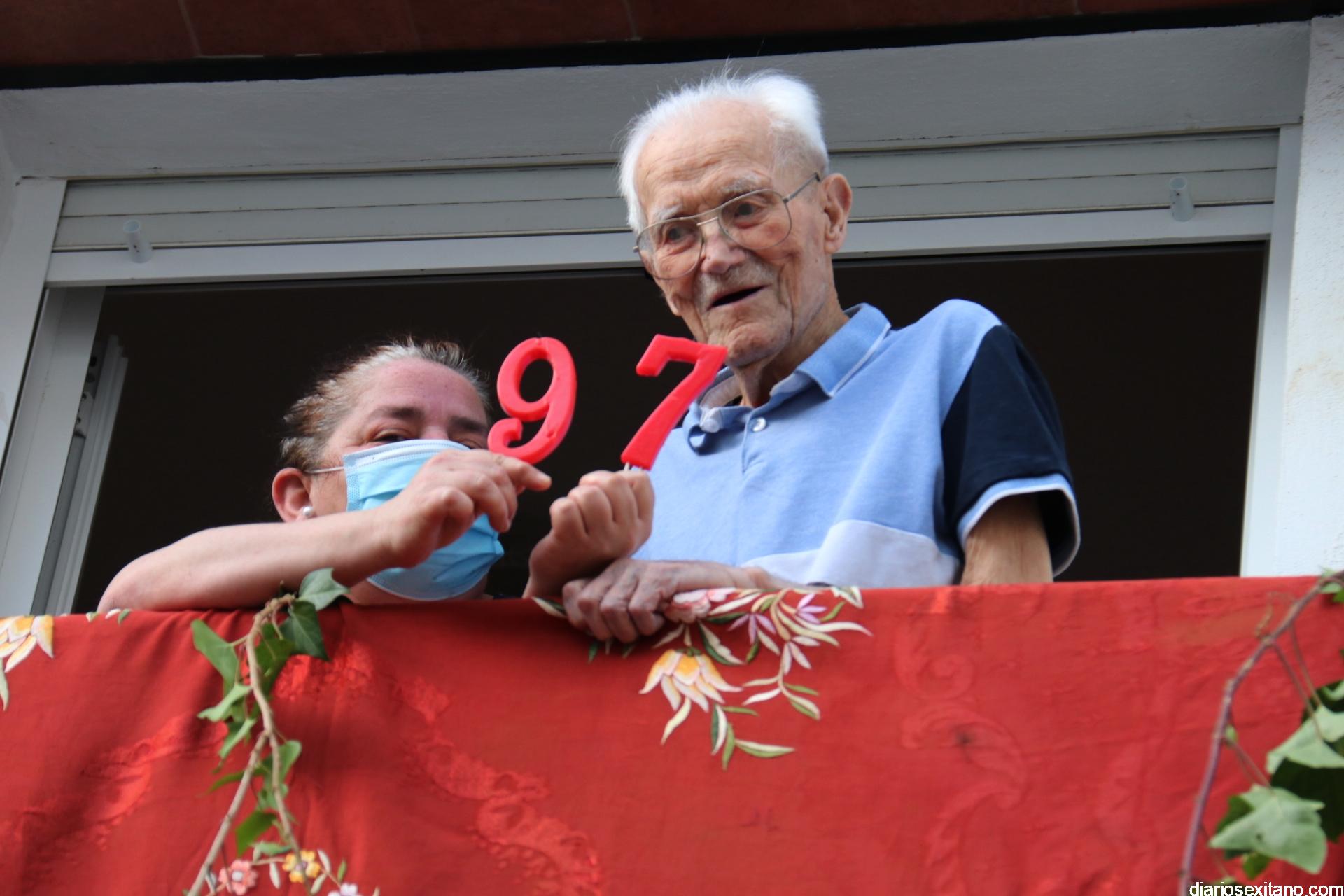 Sus vecinos no quisieron que la fecha y el momento pasaran desapercibidos, a pesar del confinamiento y, coincidiendo con la hora del paseo, desde los balcones y portales le cantaron, además del cumpleaños feliz, un repertorio de canciones que animó y hasta tarareó el propio Evaristo.