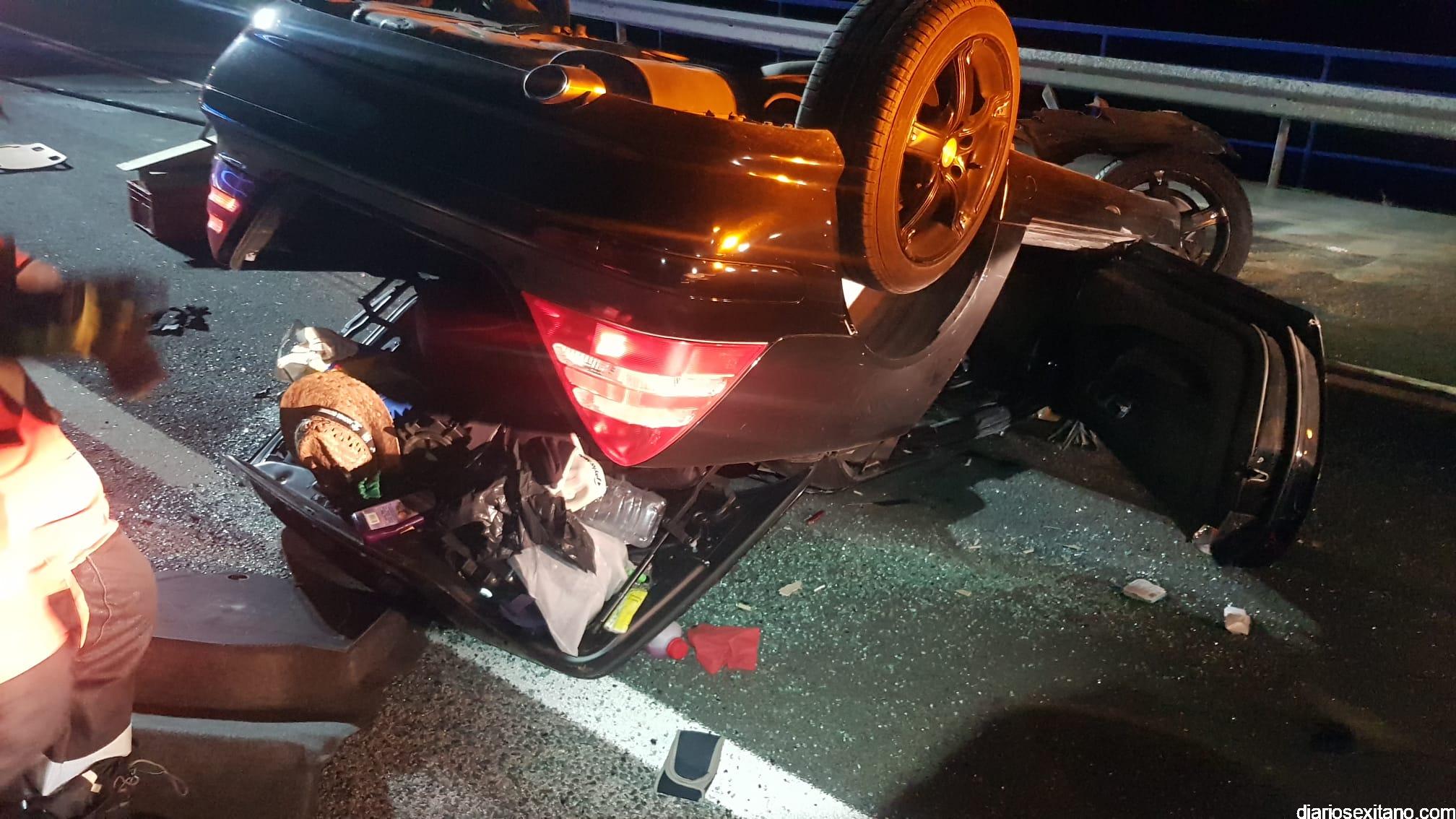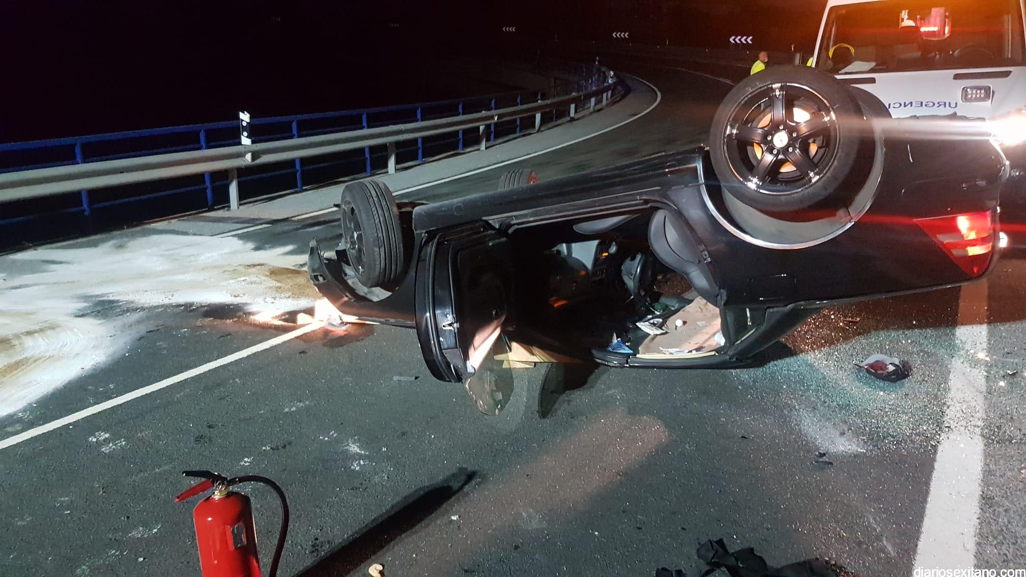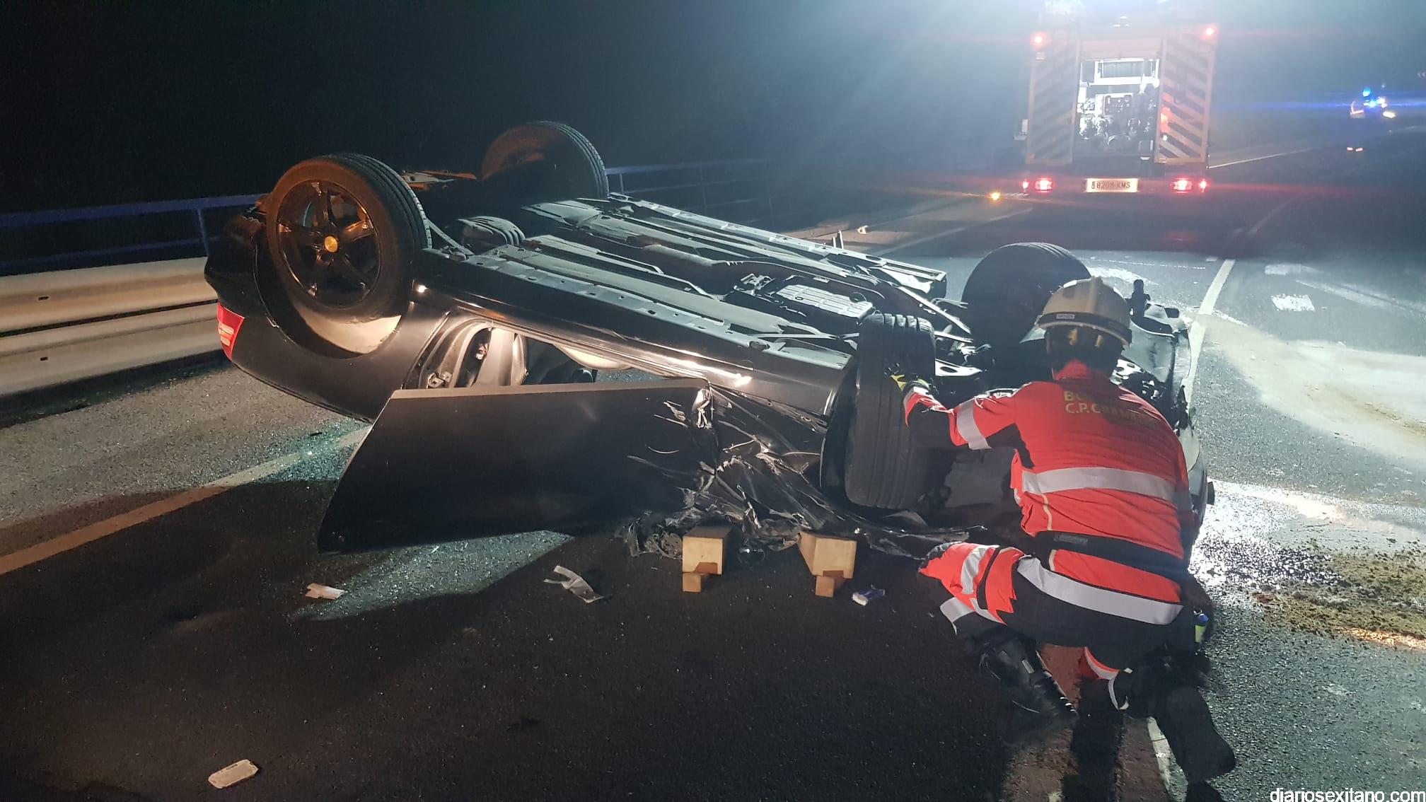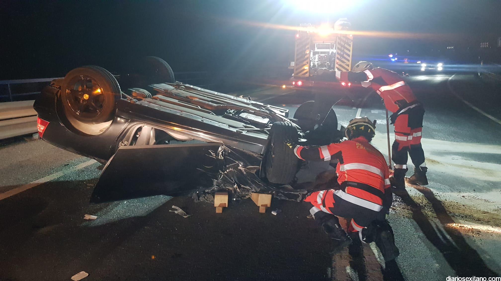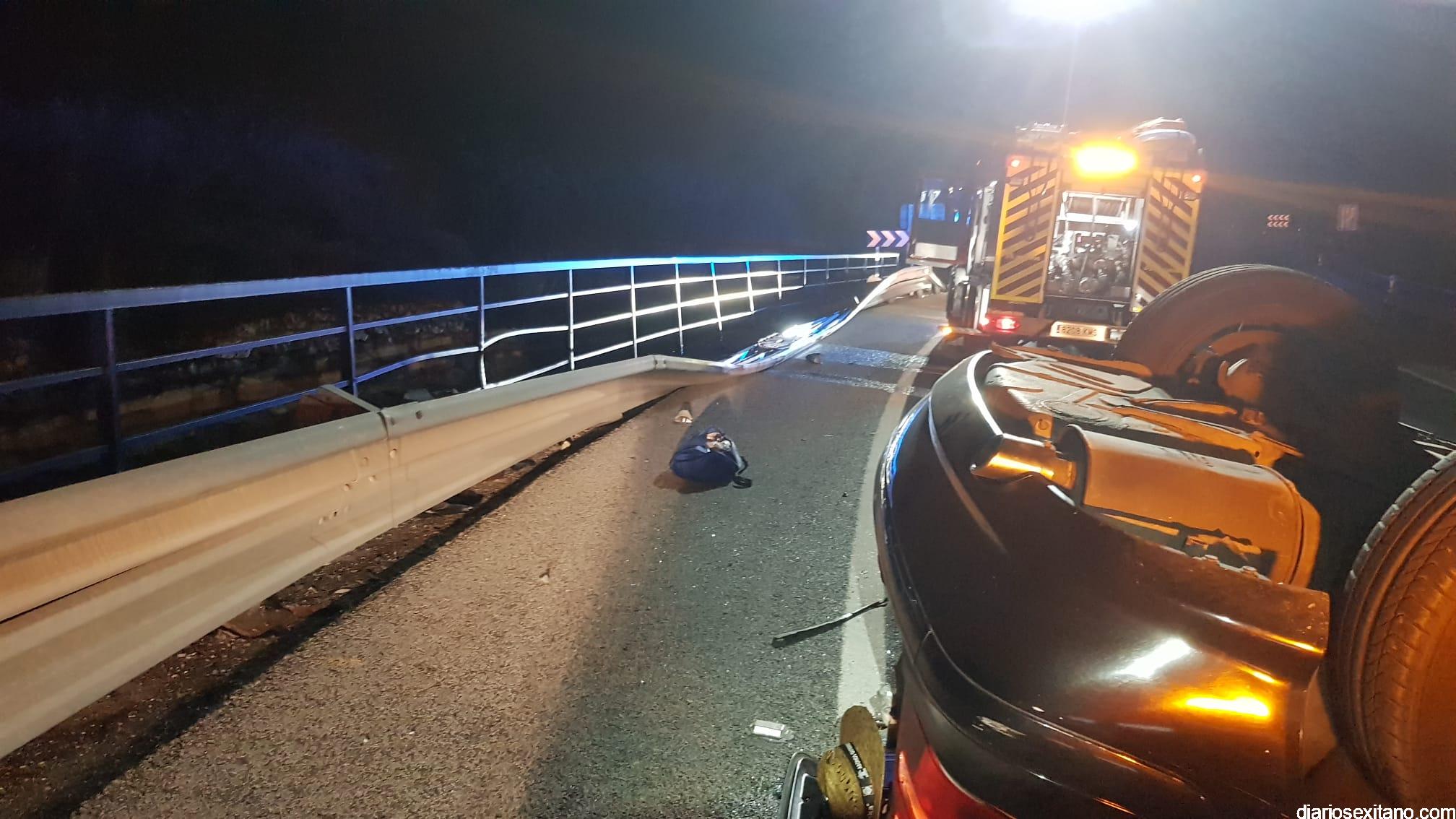 Los Bomberos de Almuñécar tuvieron que rescatar anoche al conductor de un vehículo que resultó herido, tras chocar contra la valla de un puente volcó y quedó el coche con las ruedas hacia arriba en un aparatado accidente, donde afortunadamente no se vieron implicados otros vehículos, según ha informado un portavoz de los Bomberos sexitanos.
