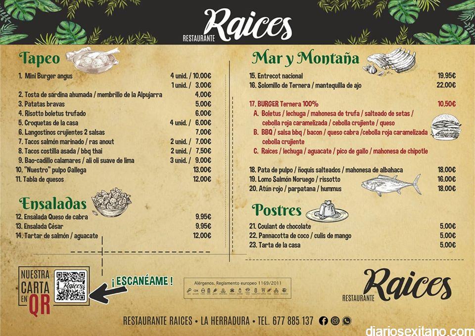 Restaurante Raíces. Paseo Andrés Segovia, 38. 677 885 137 La Herradura