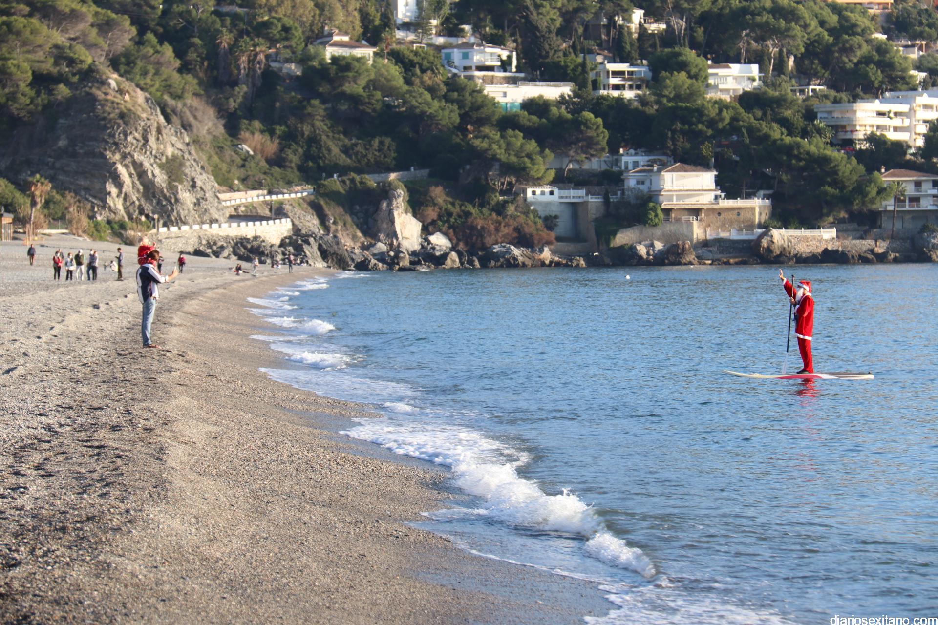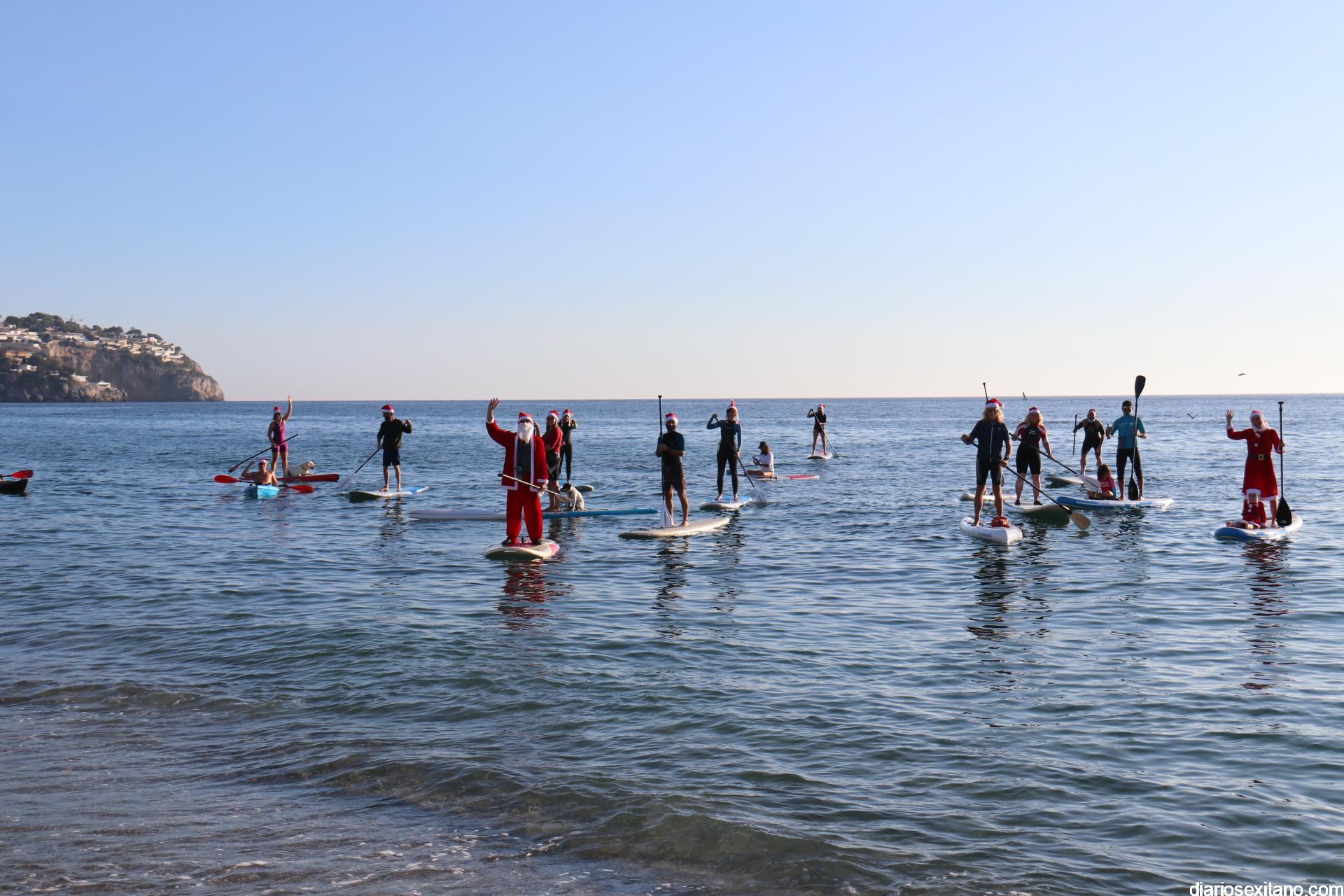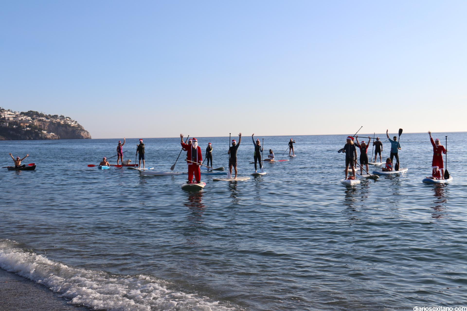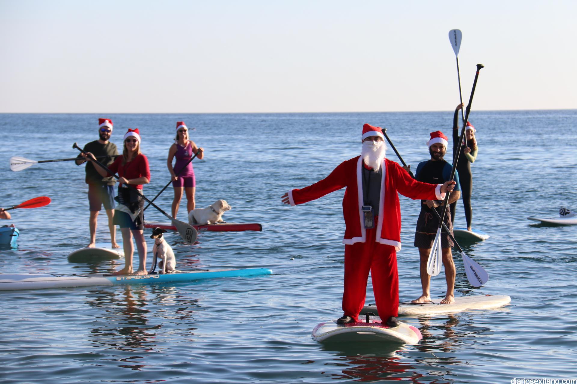 Esta tarde llegó a La Herradura Papá Noel. Lo hizo por mar y sobre paddel surf aprovechando las buenas condiciones que presentaba la bahía herradureña. Una comitiva formada por más de una docena de tablas y kayak acompañaron al Ilustre embajador en una jornada tan especial, ante la atenta mirada de numerosas personas que aprovechaban la tarde soleada y excelente temperatura que disfrutaban en las terrazas de bares y cafeterías.