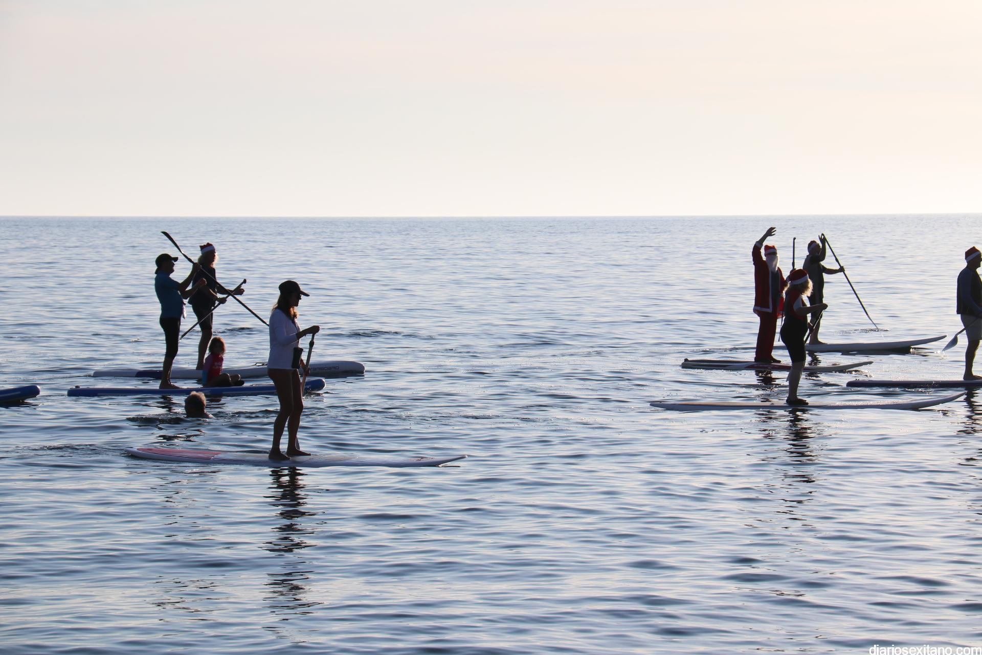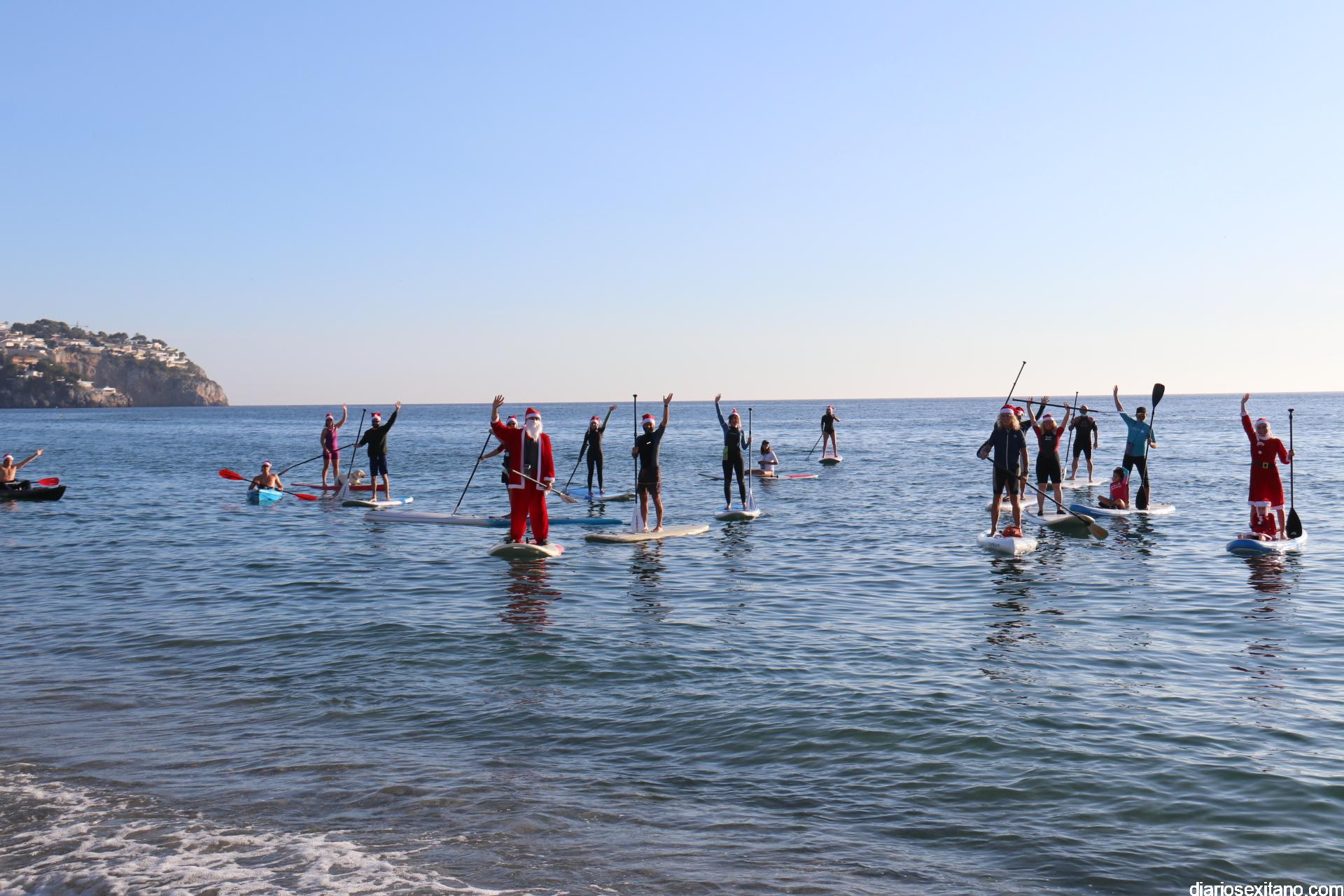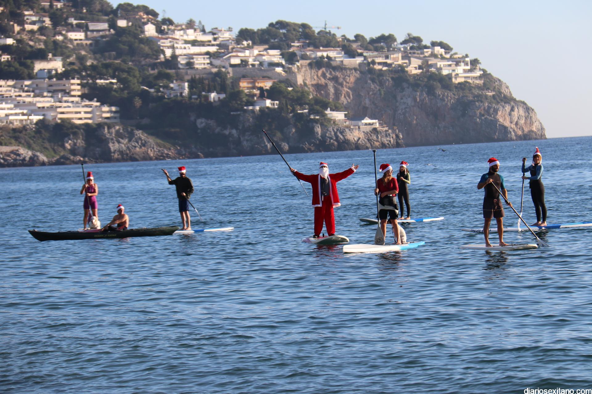 Esta tarde llegó a La Herradura Papá Noel. Lo hizo por mar y sobre paddel surf aprovechando las buenas condiciones que presentaba la bahía herradureña. Una comitiva formada por más de una docena de tablas y kayak acompañaron al Ilustre embajador en una jornada tan especial, ante la atenta mirada de numerosas personas que aprovechaban la tarde soleada y excelente temperatura que disfrutaban en las terrazas de bares y cafeterías.
