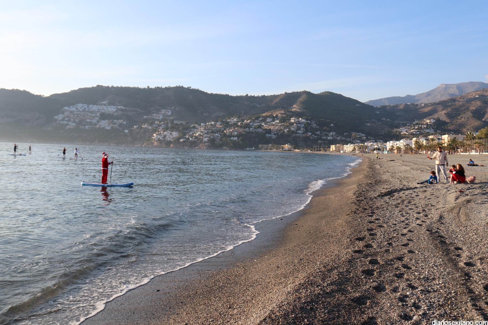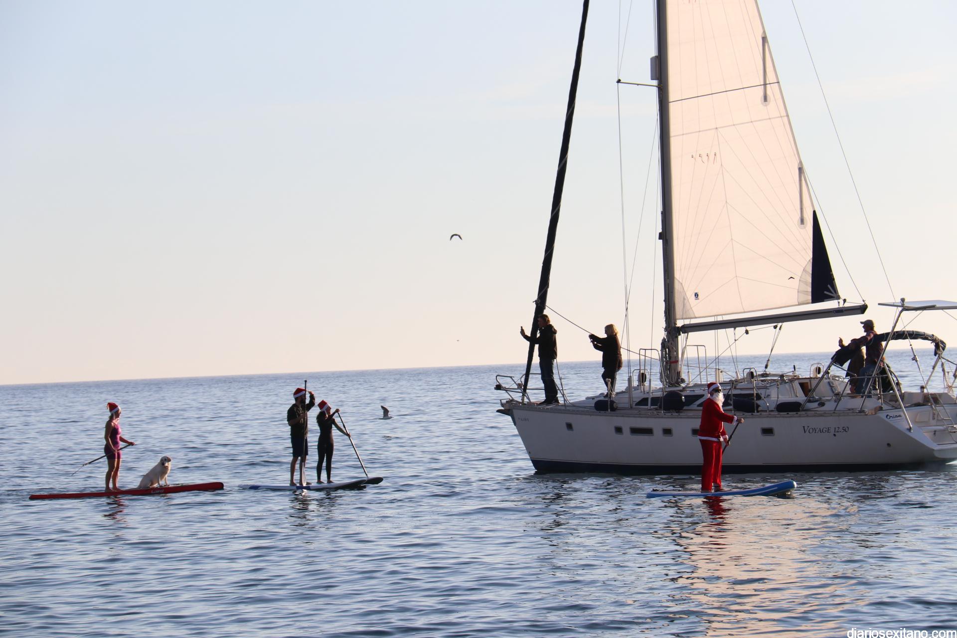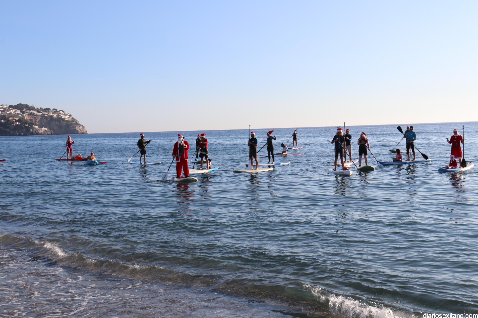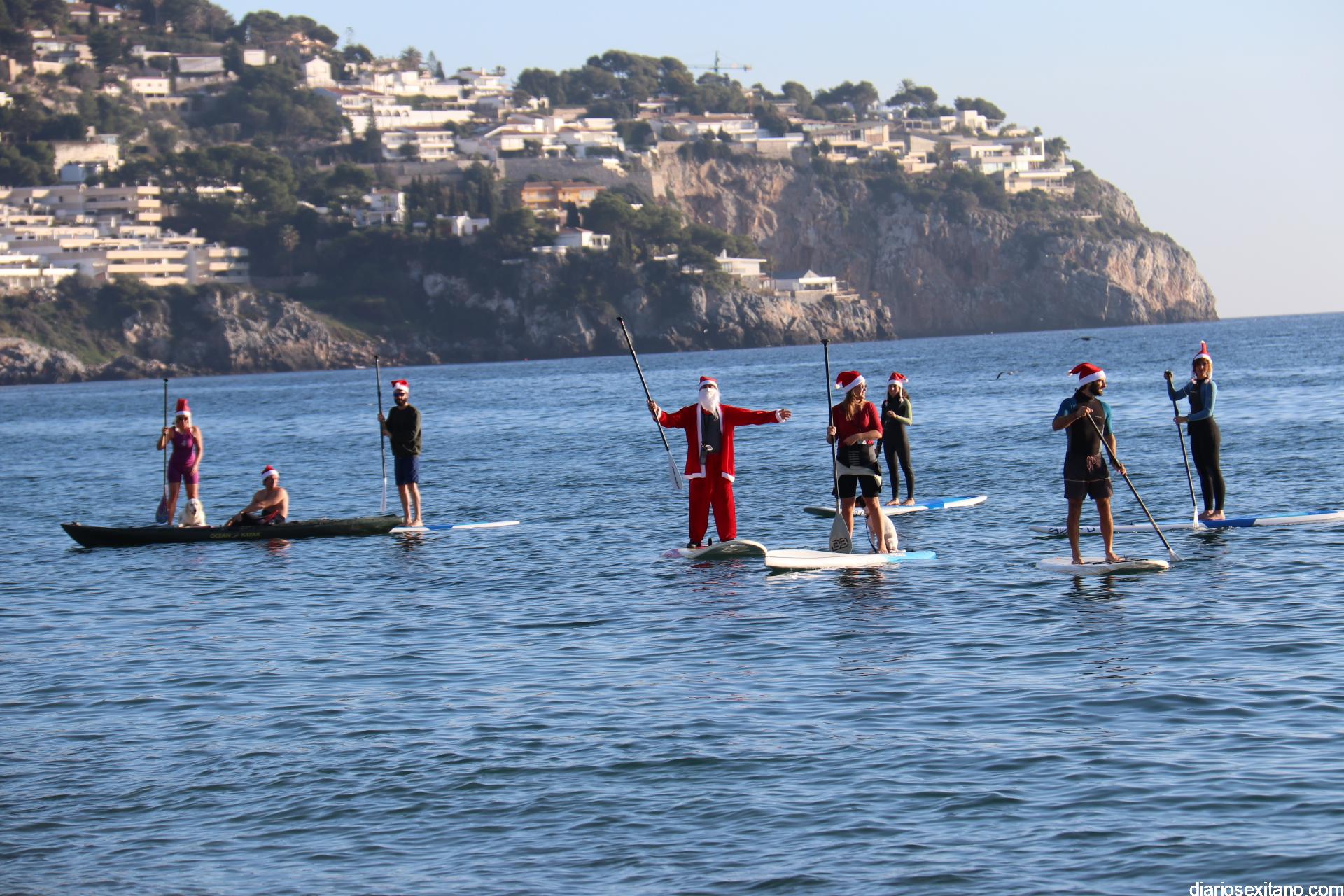 Esta tarde llegó a La Herradura Papá Noel. Lo hizo por mar y sobre paddel surf aprovechando las buenas condiciones que presentaba la bahía herradureña. Una comitiva formada por más de una docena de tablas y kayak acompañaron al Ilustre embajador en una jornada tan especial, ante la atenta mirada de numerosas personas que aprovechaban la tarde soleada y excelente temperatura que disfrutaban en las terrazas de bares y cafeterías.