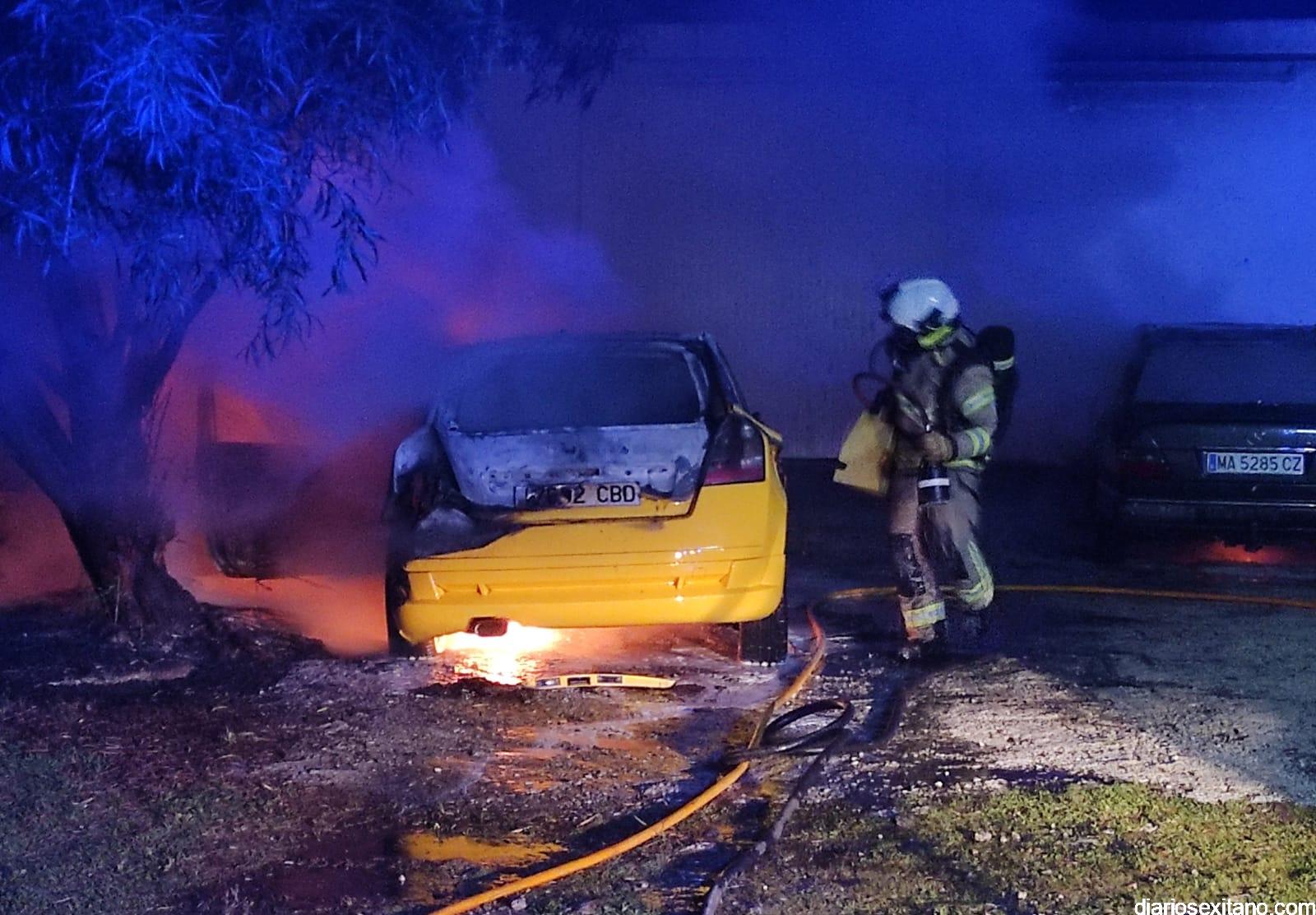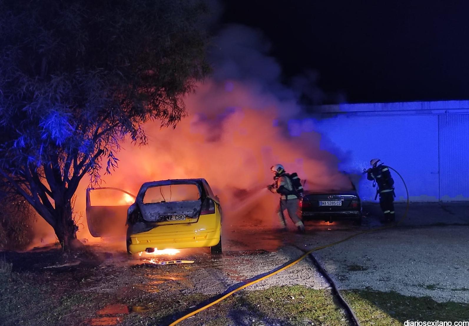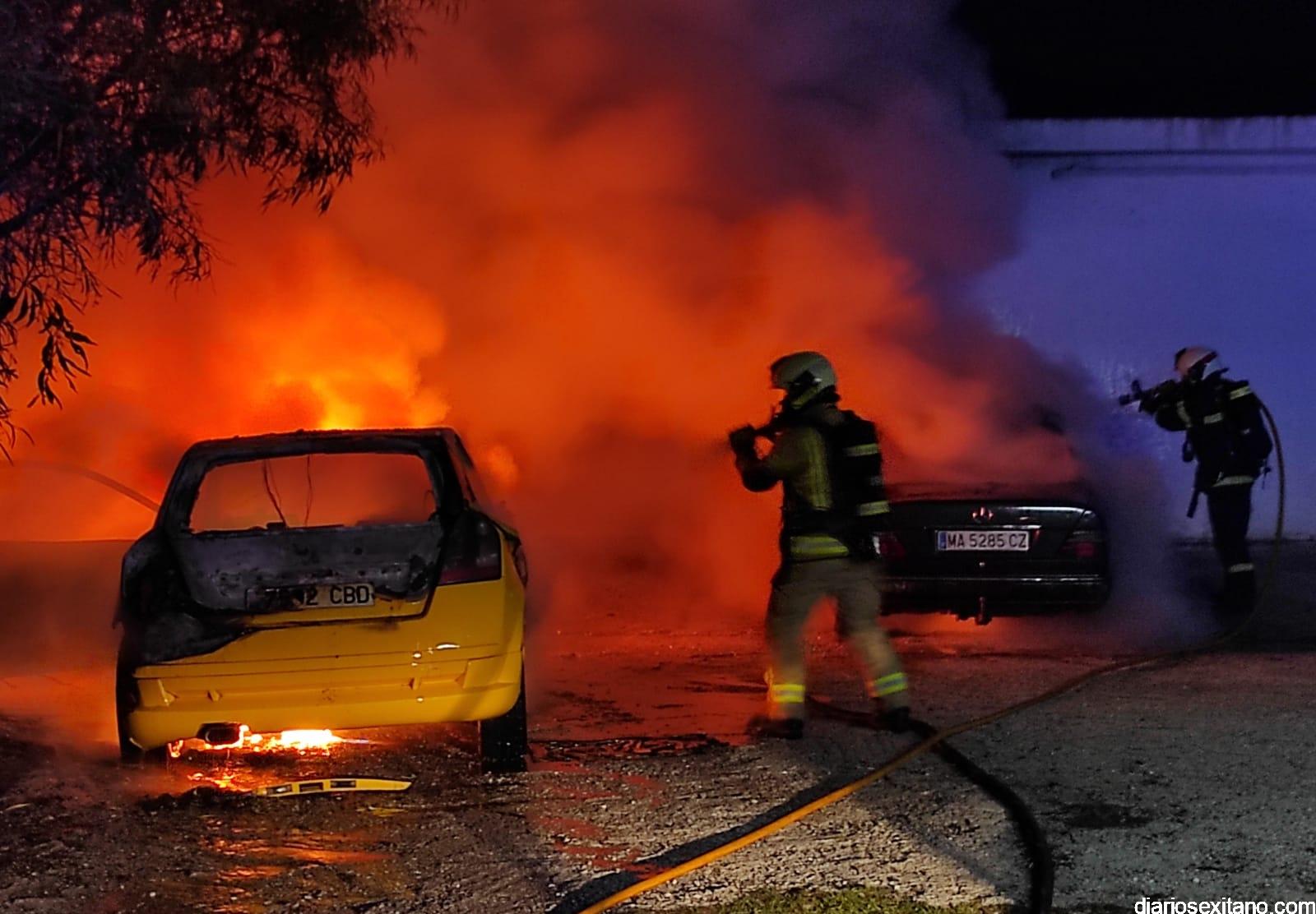 “El fuego comenzó pasadas la 2 horas de esta madrugada en un vehículo “Fiat Stylo” de color amarillo y a continuación se propagó a otro coche Mercedes 300 que se encontraba estacionado al lado. Hasta el lugar se personó una patrulla de Policía Local que inició los trabajos de extinción del mismo hasta que llegamos los bomberos sexitanos y concluimos los trabajos”, según relató un portavoz de Bomberos, quien junto a la Policía investigan las causas del mismo.