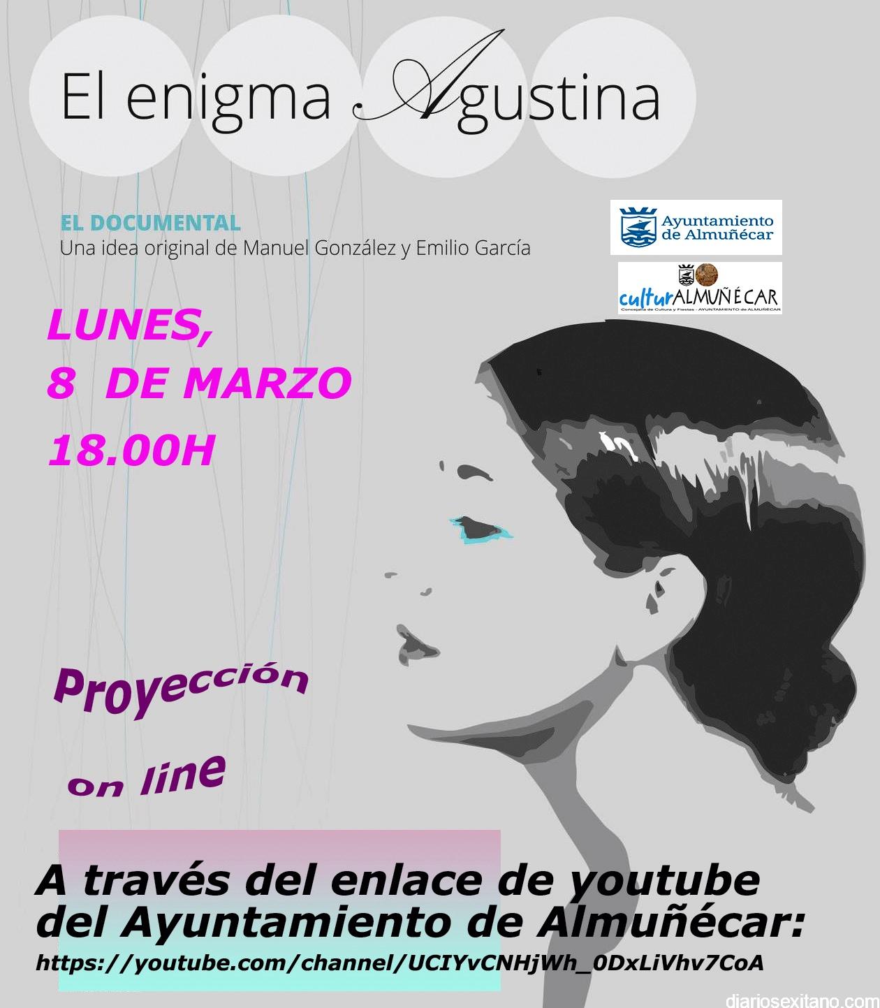 Otra actividad destacada se anuncia para para este próximo lunes, 8 de marzo, a las 18 horas, a través del canal del Ayuntamiento de Almuñécar en Youtube se podrá acceder al enlace de la película “El enigma de Agustina”.