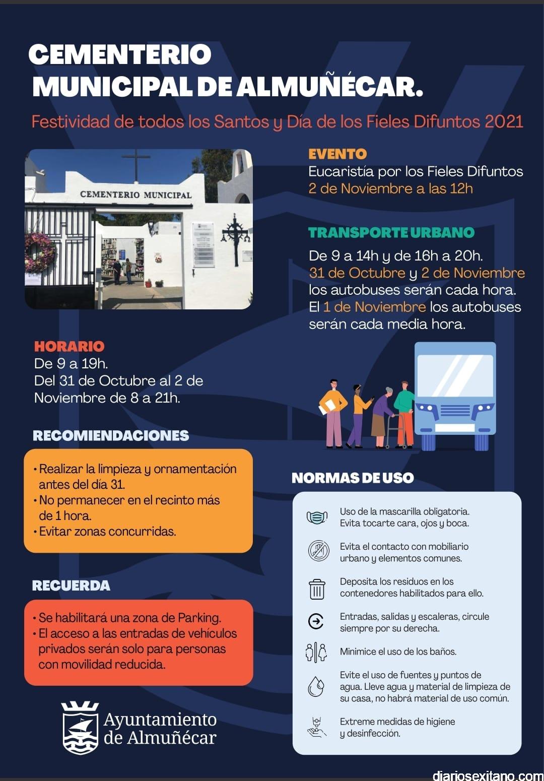 El servicio de Transporte Urbano con el Cementerio de Almuñécar mantendrá este martes, 2 de noviembre, la línea especial con una periodicidad de cada hora, desde las 9 horas a 14 horas, y desde las 16 horas a las 20 horas.