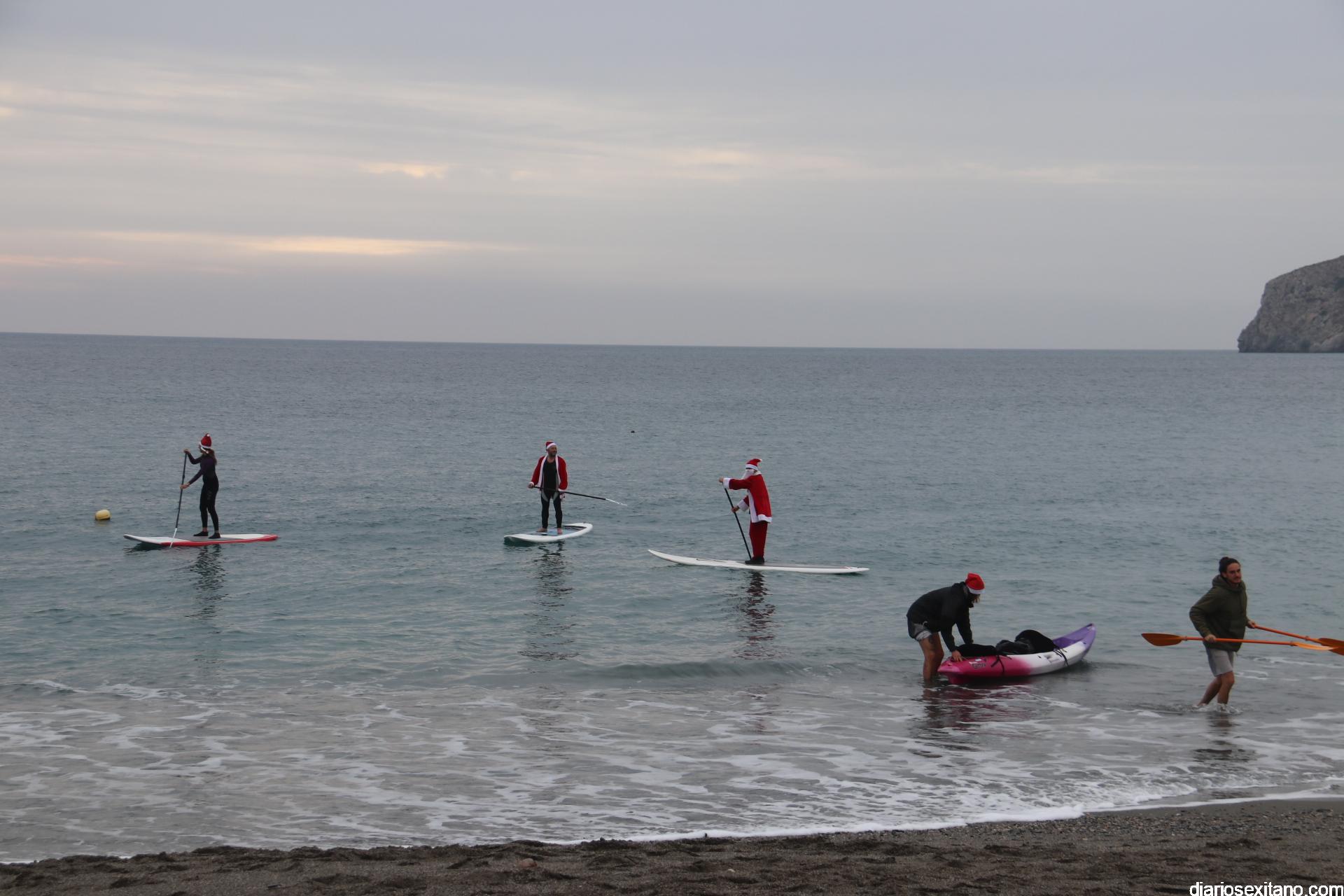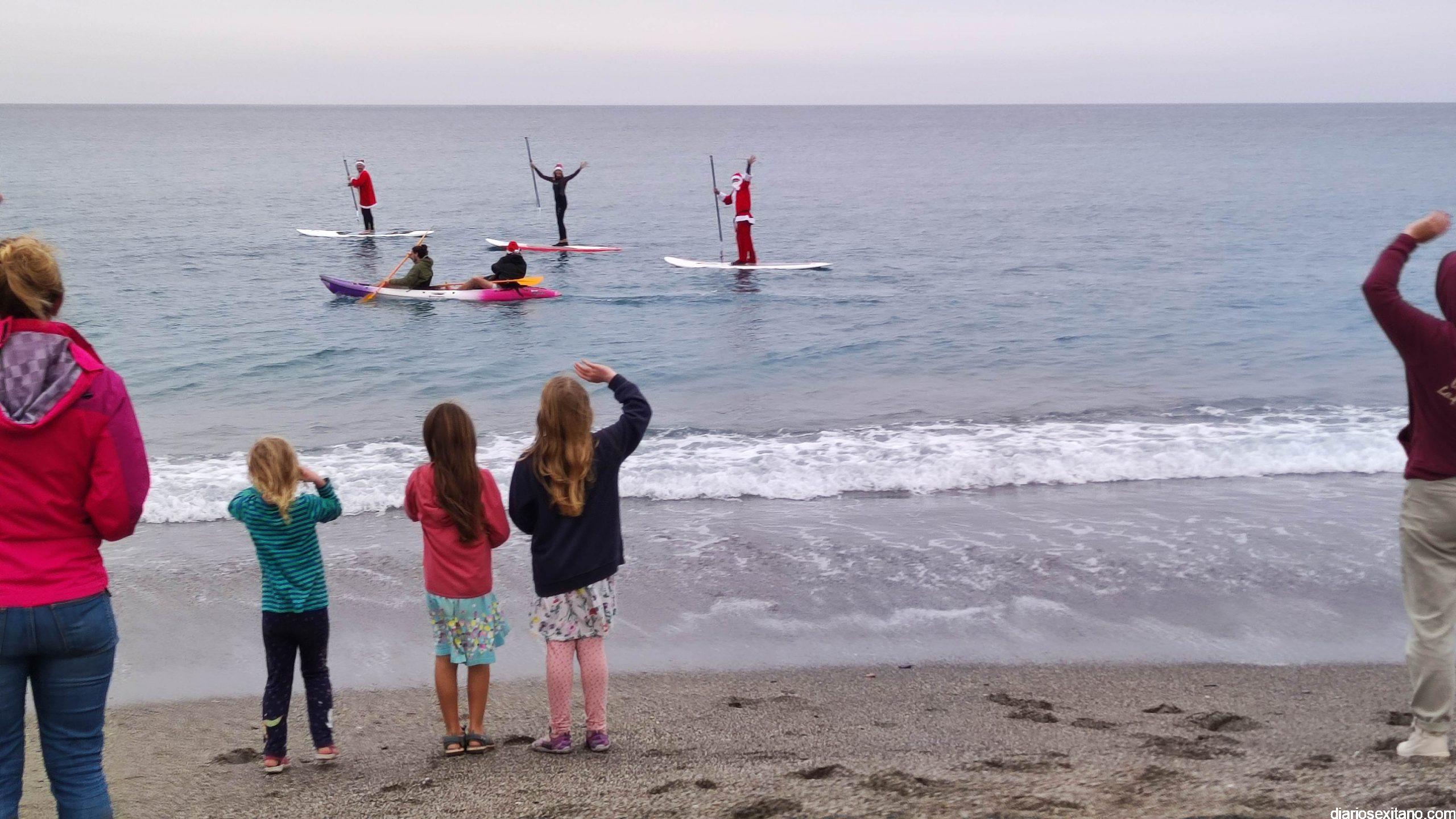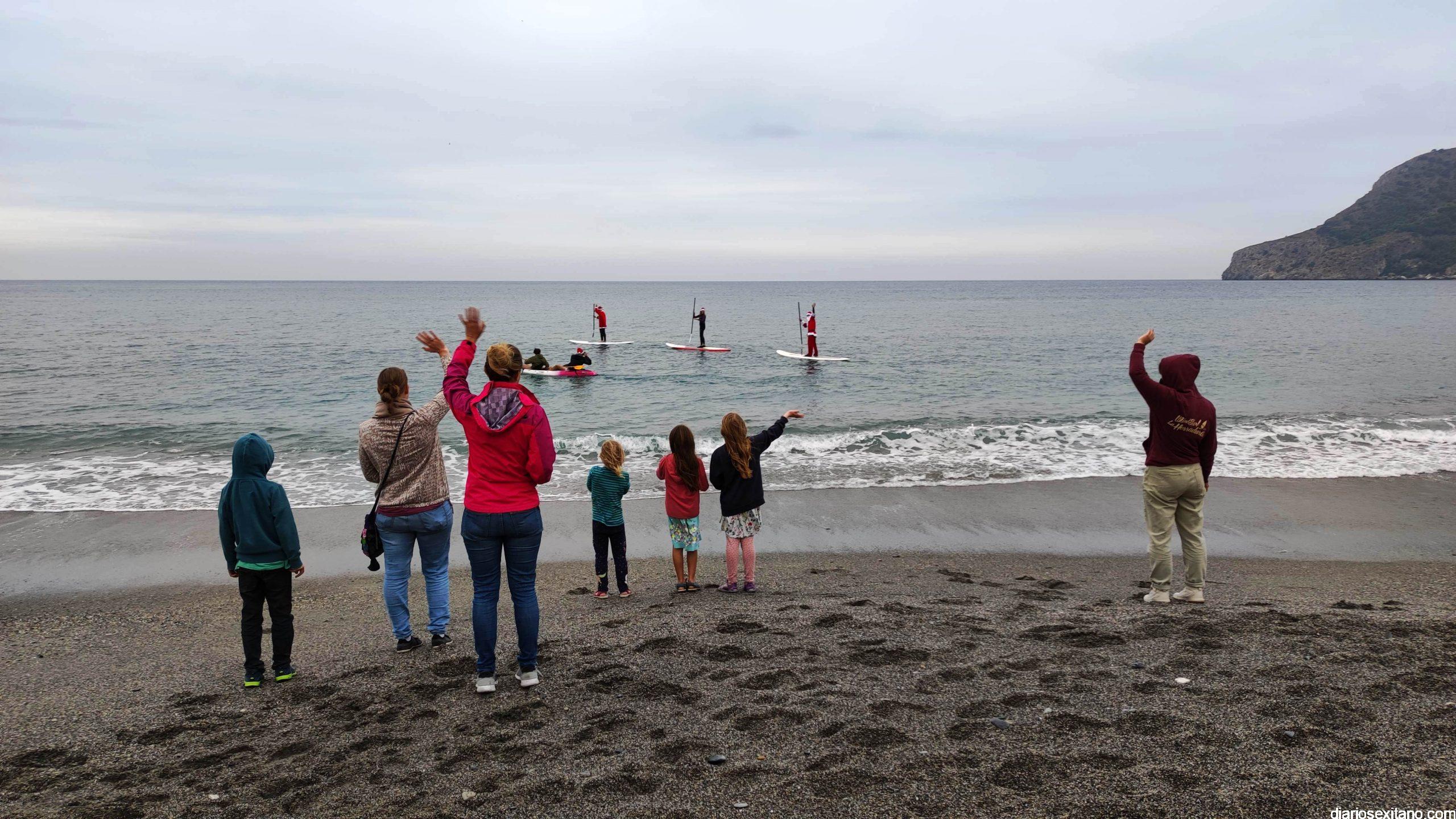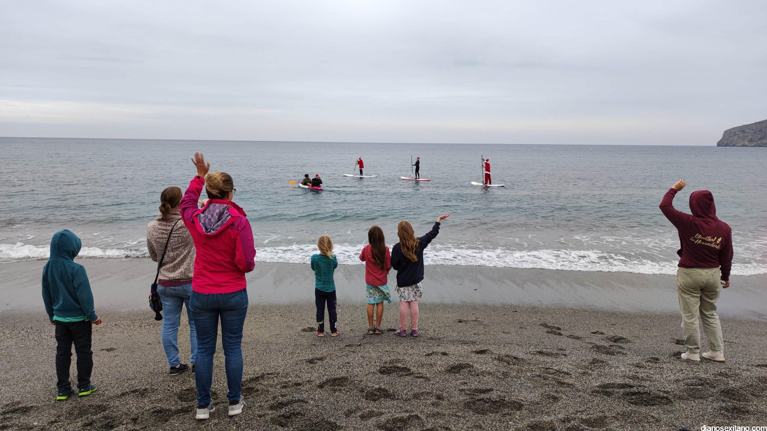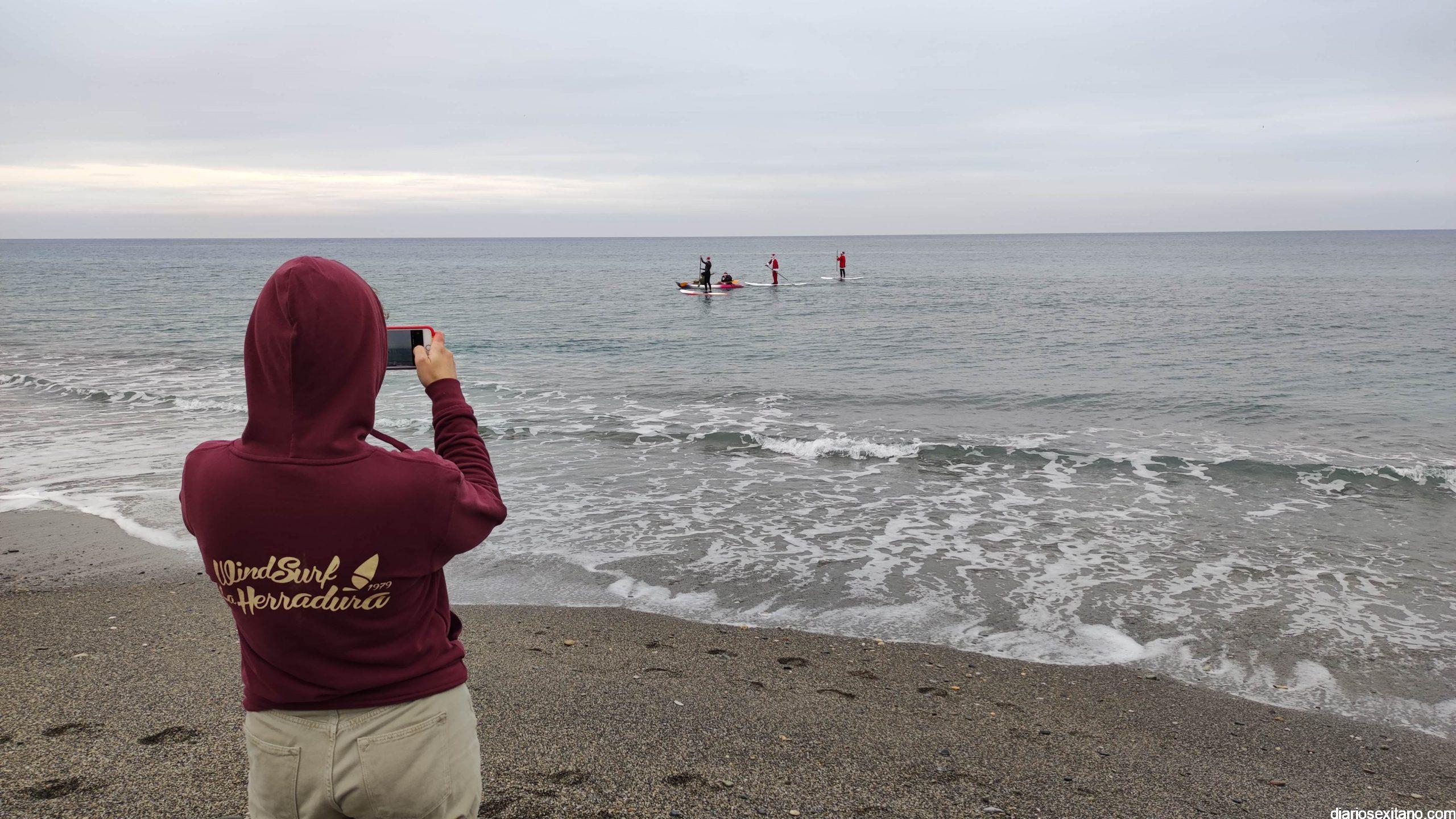 Esta tarde ha llegado Papa Noel a la playa de La Herradura en paddle surf. Las buenas condiciones del mar han permitido que tuviera un travesía tranquila sobre la bahía herradureña, tras una jornada de temporal de mar de fondo. Este jueves, a pesar de la tarde gris, algunos pequeños se acercaron hasta la orilla para saludar al famoso personaje navideño que repartirá los regalos en las próximas horas. En la playa le esperaba Manuela de Windsurf La Herradura que le facilitó, como ya hiciera el pasado año, la estancia durante el tiempo que permanecerá en la localidad.