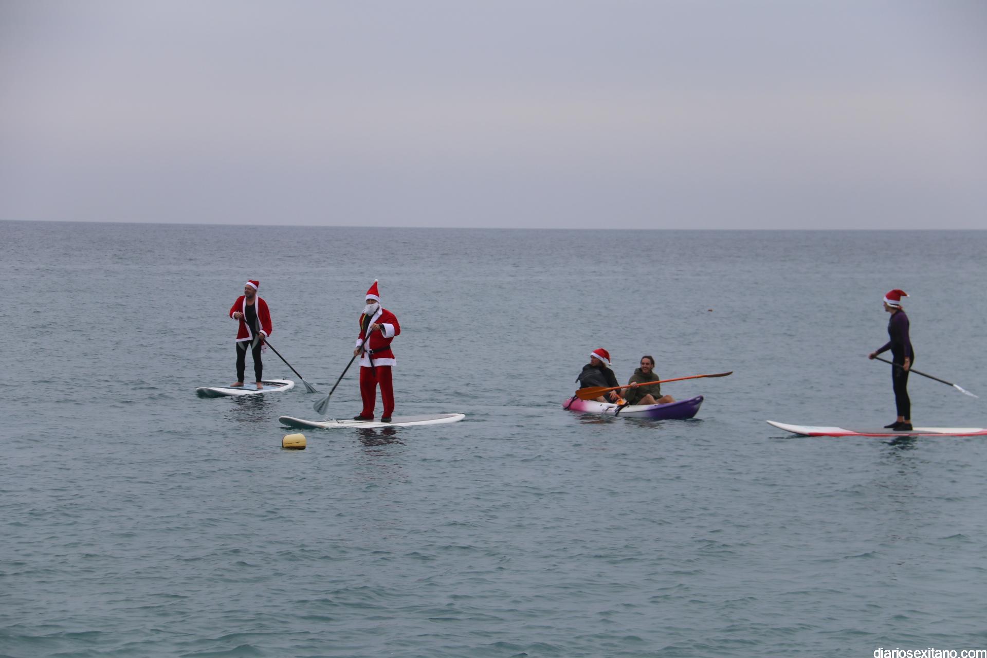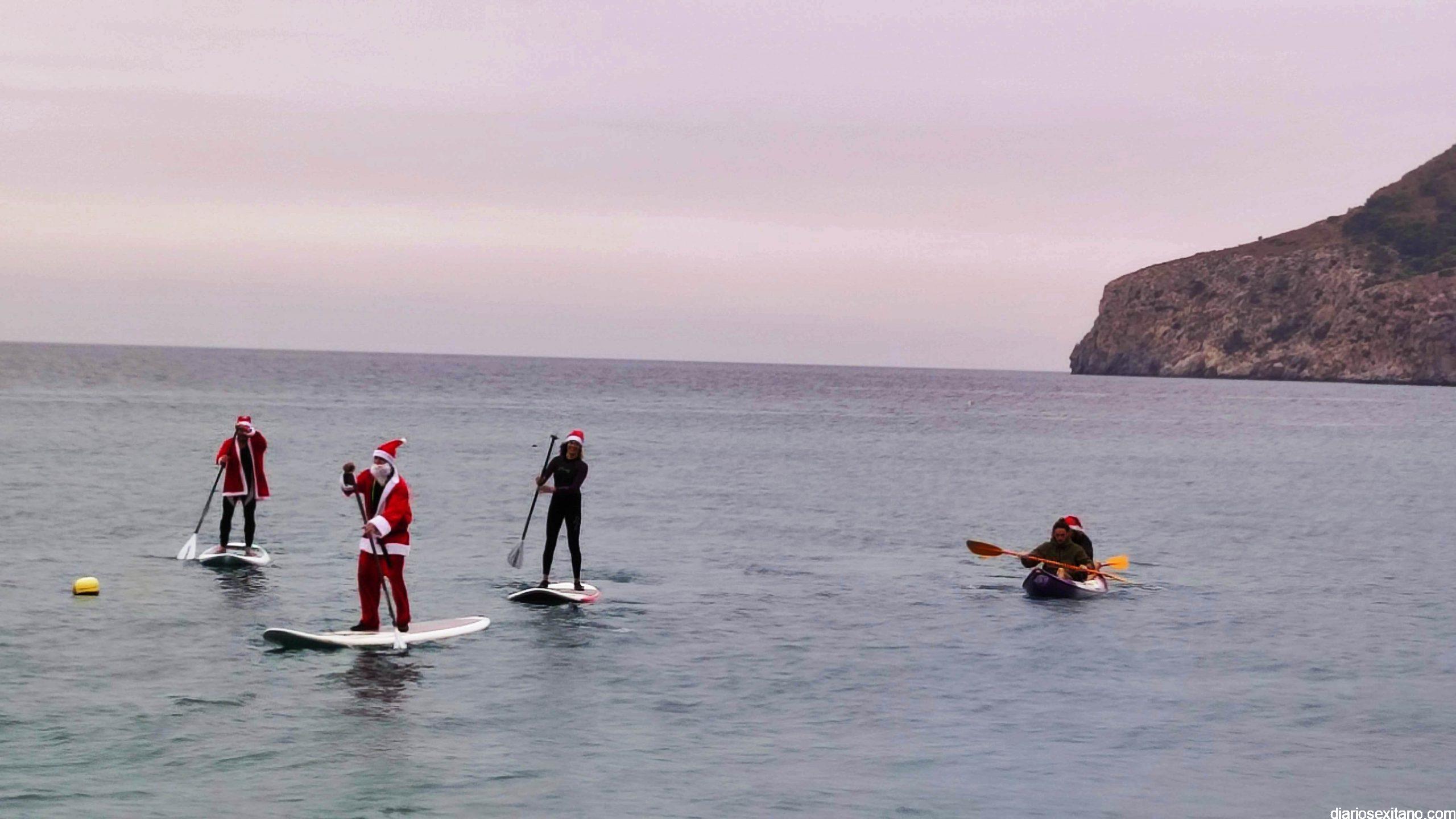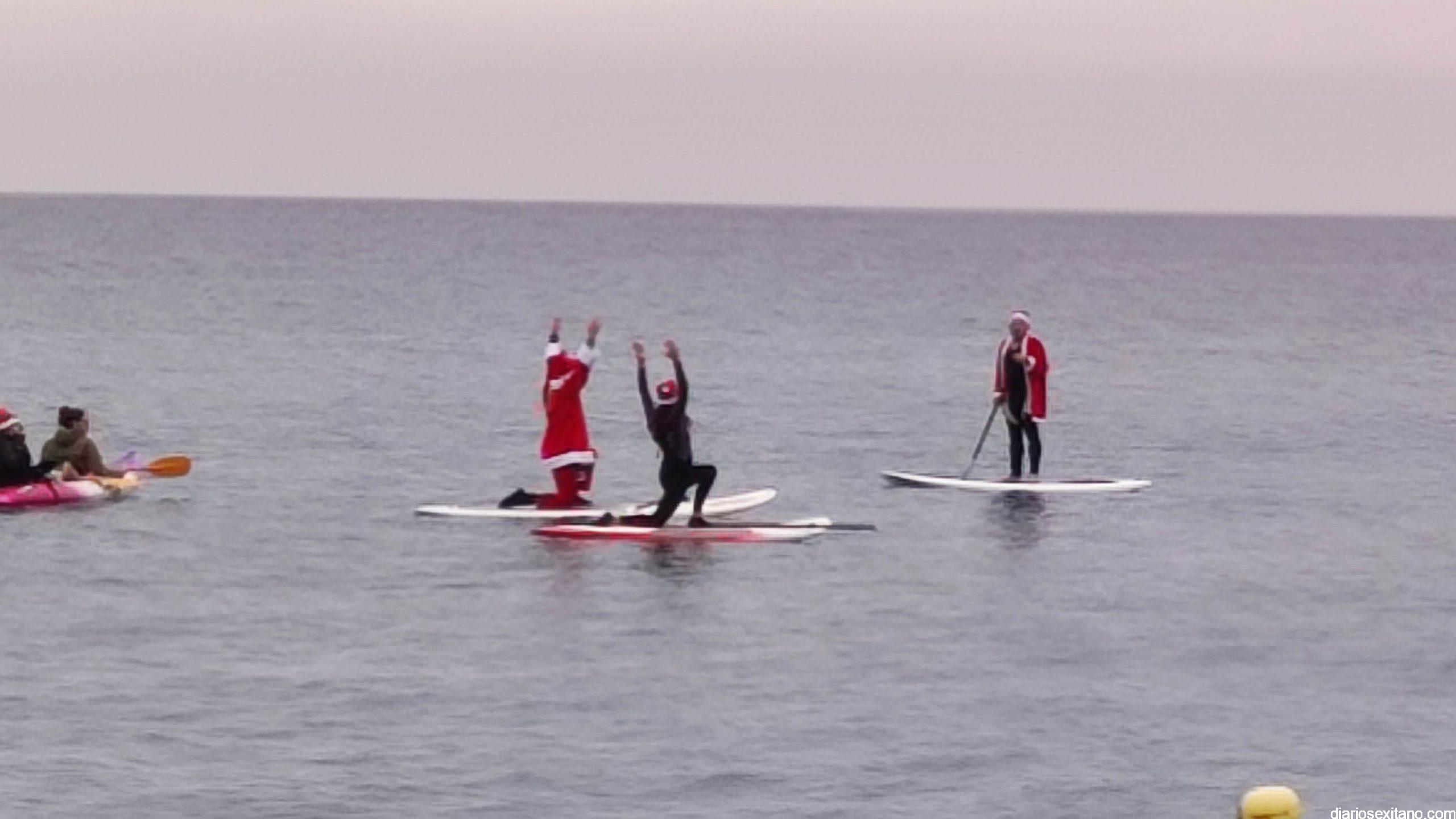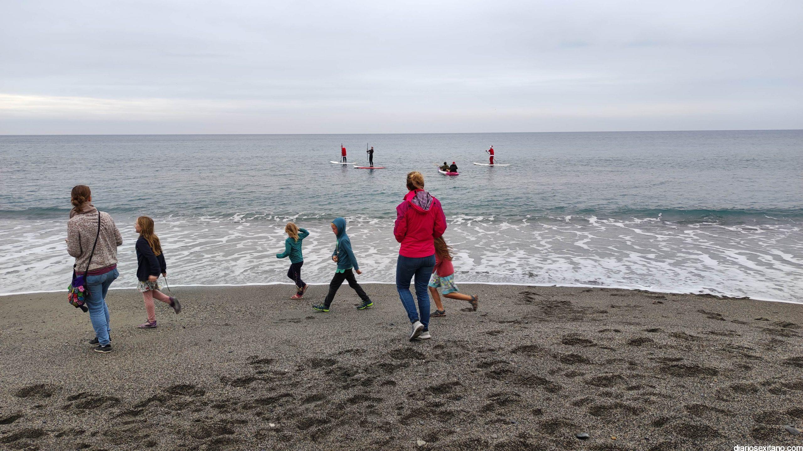 Esta tarde ha llegado Papa Noel a la playa de La Herradura en paddle surf. Las buenas condiciones del mar han permitido que tuviera un travesía tranquila sobre la bahía herradureña, tras una jornada de temporal de mar de fondo. Este jueves, a pesar de la tarde gris, algunos pequeños se acercaron hasta la orilla para saludar al famoso personaje navideño que repartirá los regalos en las próximas horas. En la playa le esperaba Manuela de Windsurf La Herradura que le facilitó, como ya hiciera el pasado año, la estancia durante el tiempo que permanecerá en la localidad.