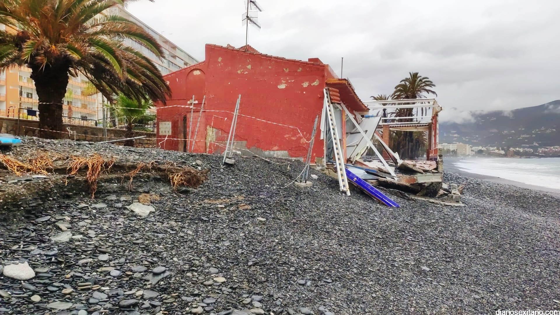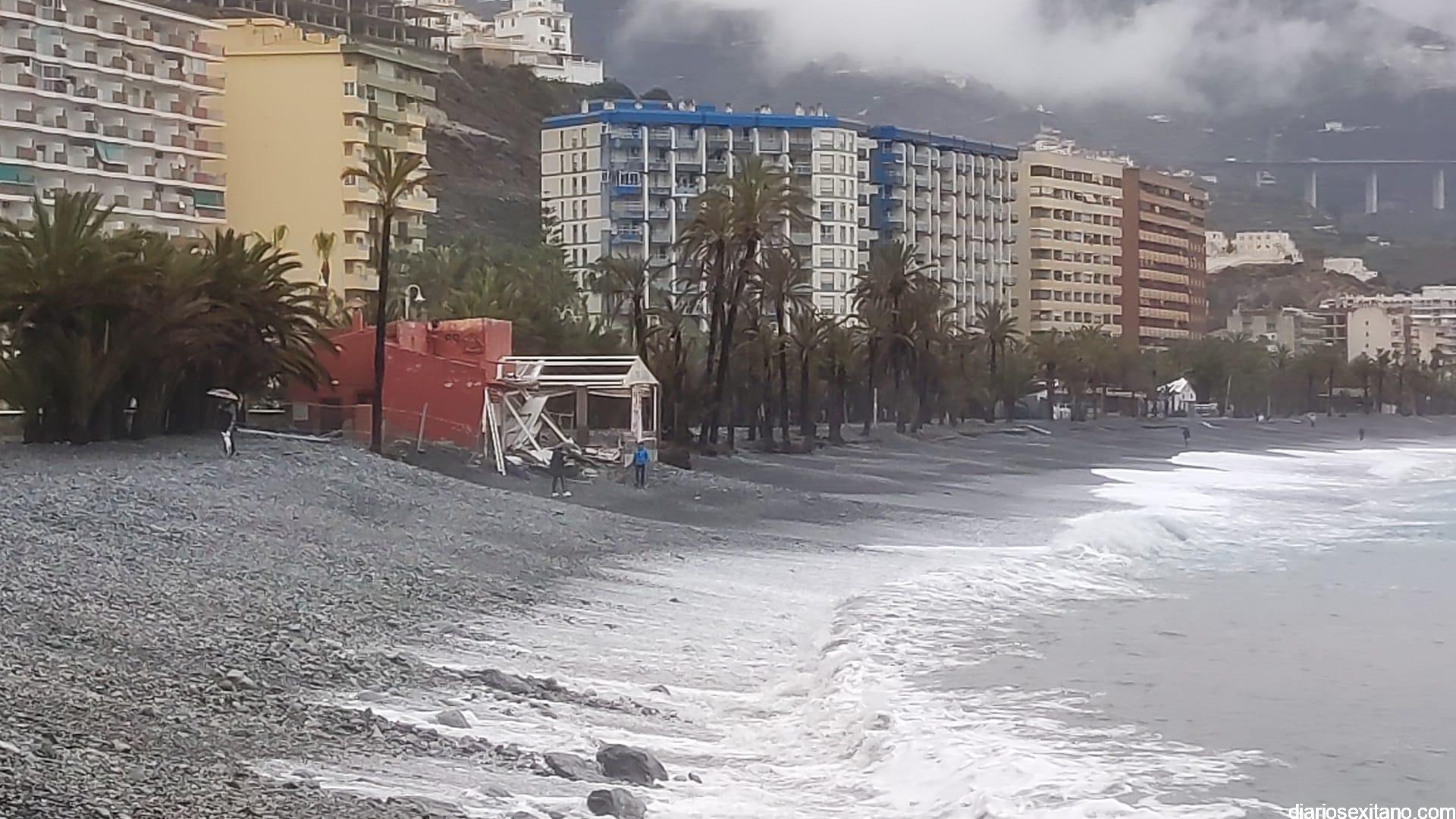 El temporal de levante se ha dejado notar en varios puntos de la costa de Almuñécar y La Herradura, siendo el efecto más destacado el derribo de buena parte del chiringuito “La Barca”, en la playa de Velilla, y se ha “comido” buena parte de la playa de Fuentepiedra de Almuñécar al superar el espigón de ésta playa sexitana, amén de los efectos en la playa de Cotobro, donde las olas saltaron al vial depositando arena sobre la misma, y también en las playas de Marina del Este y la zona de Peña Parda, en La Herradura.