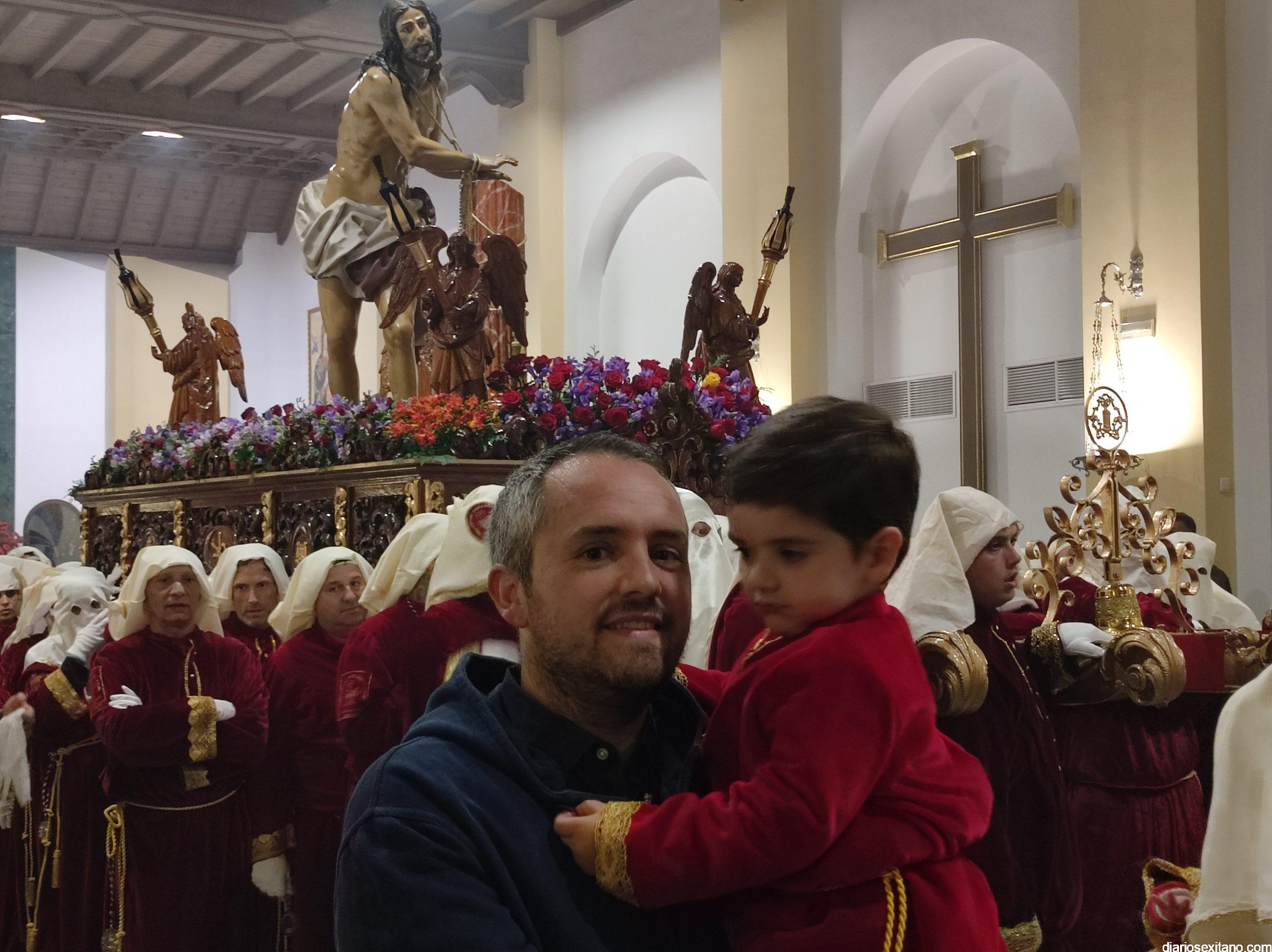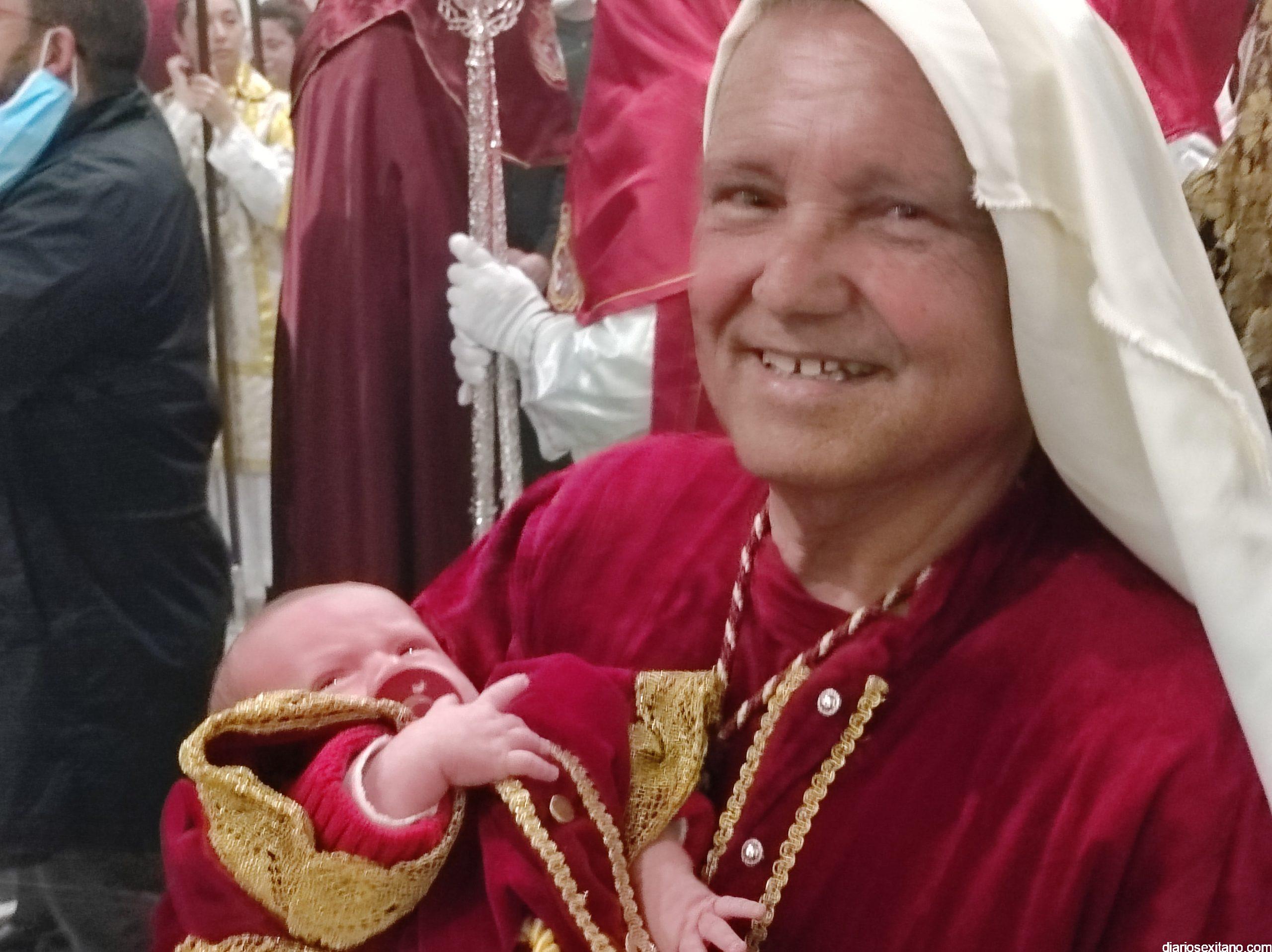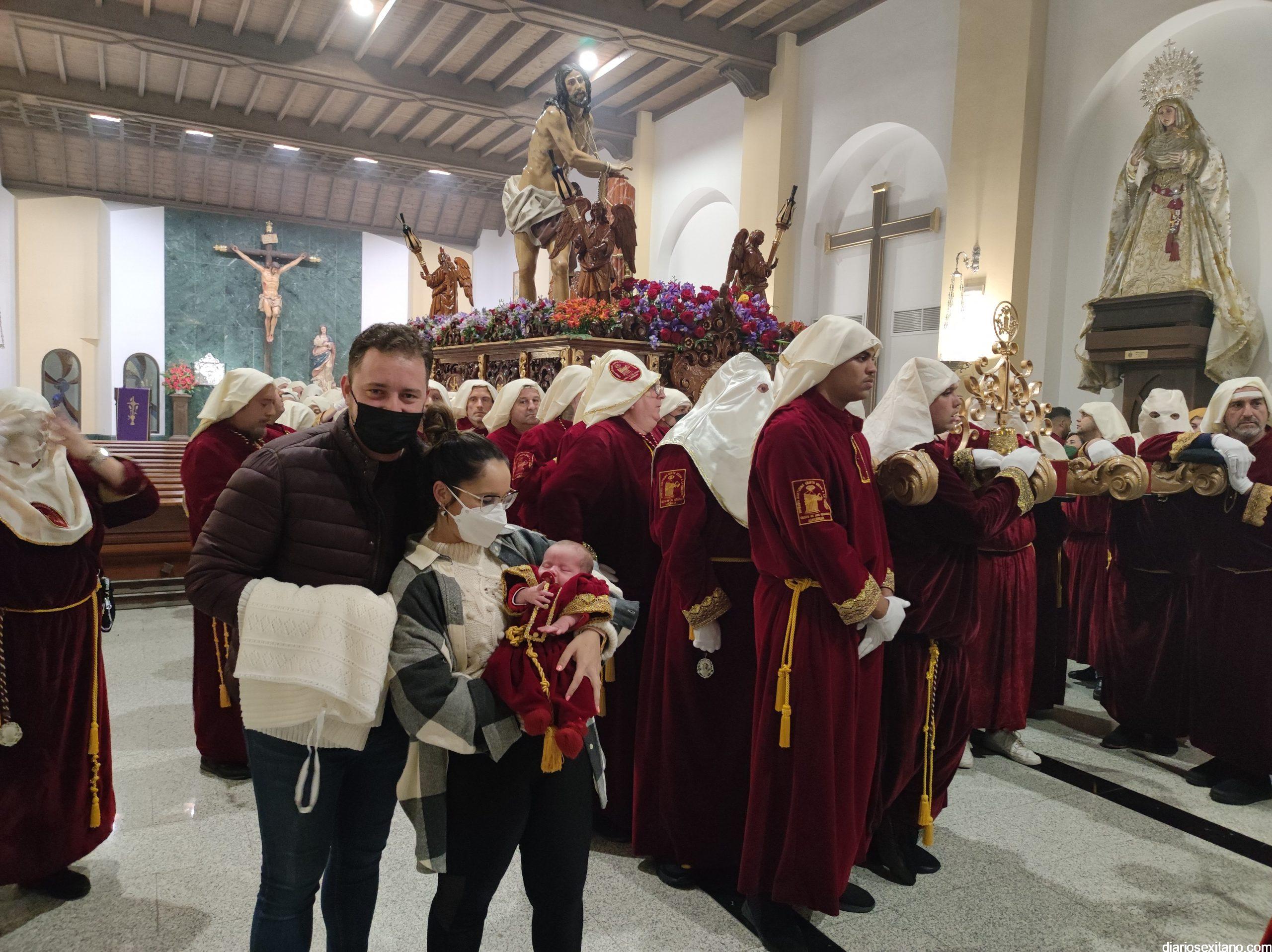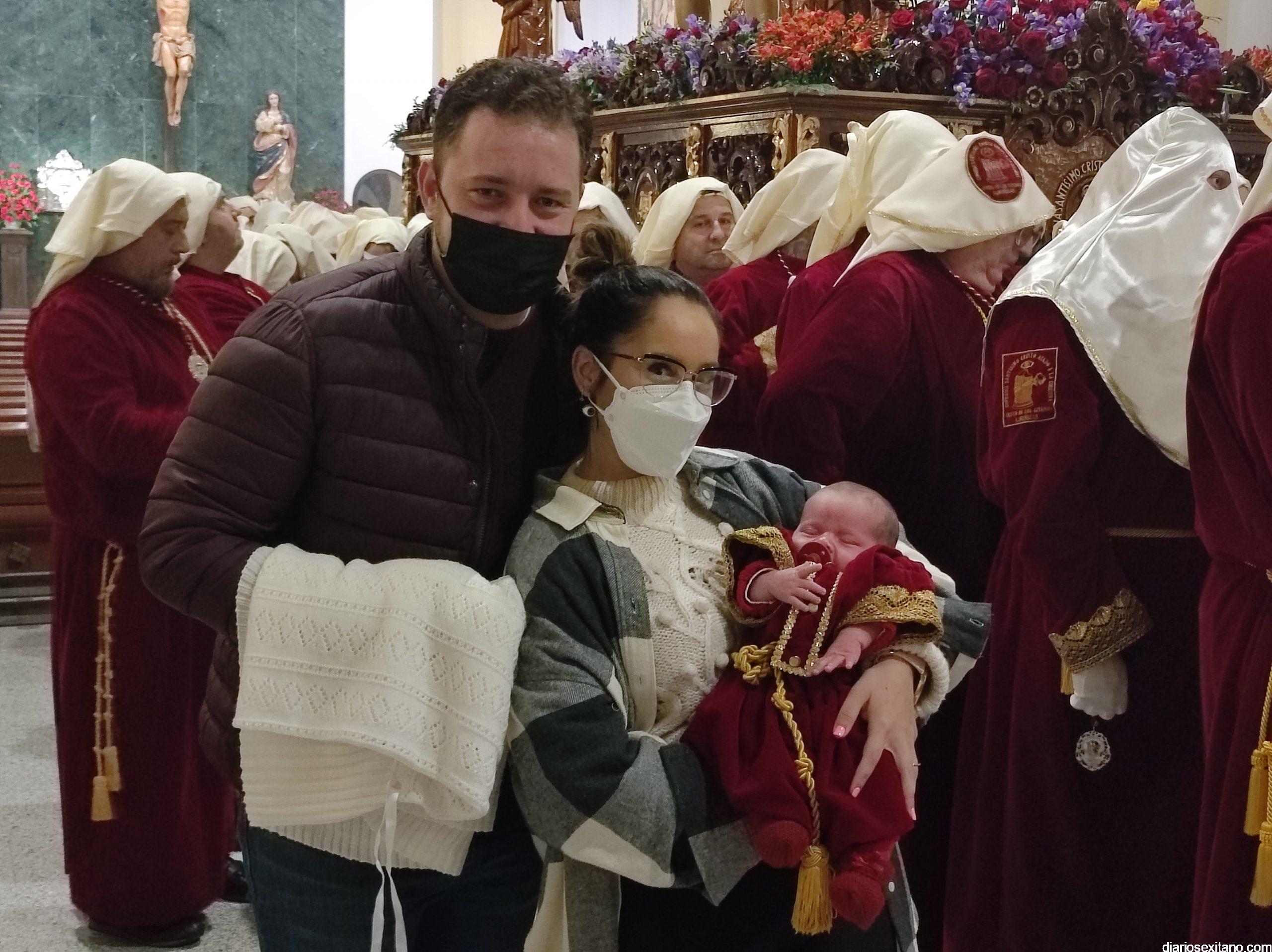 Antes, en el interior del Templo El Salvador, sede de esta Cofradía y desde donde se disponía a salir el paso, se vivieron momentos de nervios. Había que adaptar el trono lo mejor posible para que los casi 90 horquilleros, a las órdenes de Diego Jiménez, pudieran ocupar su sitio en el mismo. Momento que aprovecharon algunos hermanos para plasmar el momento o, incluso, pedir la protección del Cristo. Este fue el caso de los padres de Luca, que con tres semanas ya lucía su túnica roja de ésta cofradía. En la calle, la plaza del Cristo de la Buena Muerte, se encontraba llena de público aguardando el momento de la apertura de la puerta principal y saliera El Moreno. El alumbrado público se apagó para dar mayor realce al encuentro.