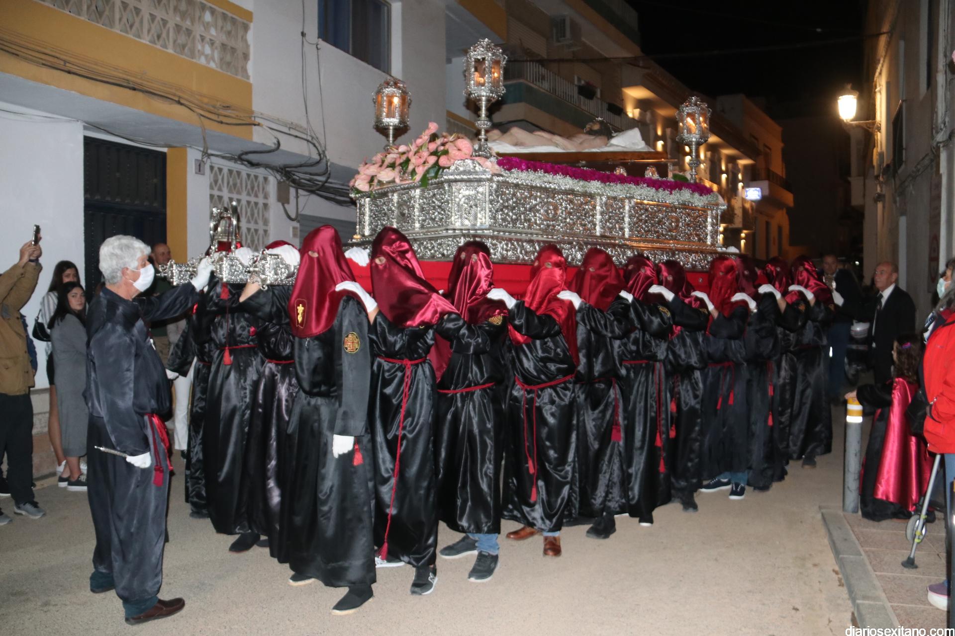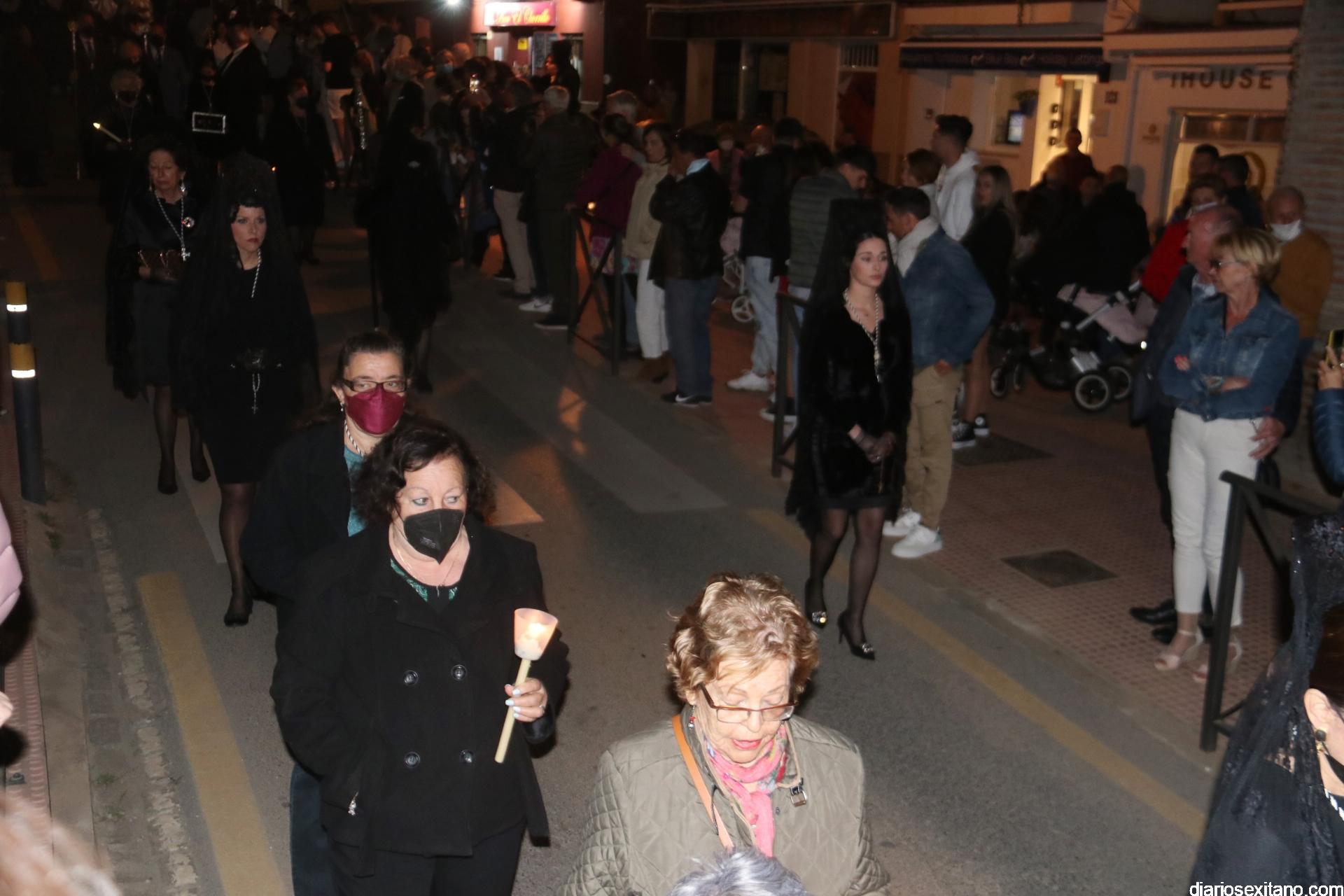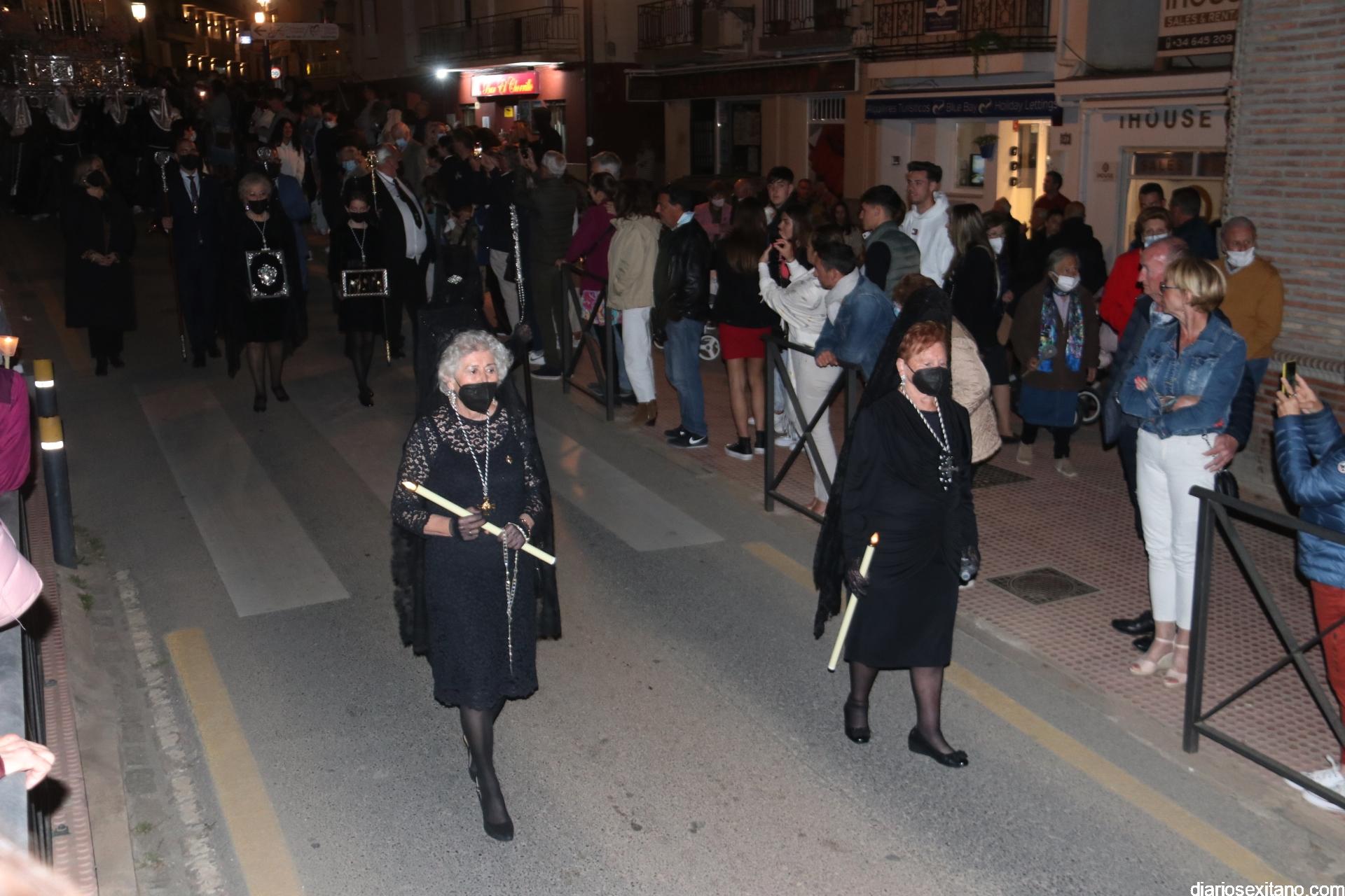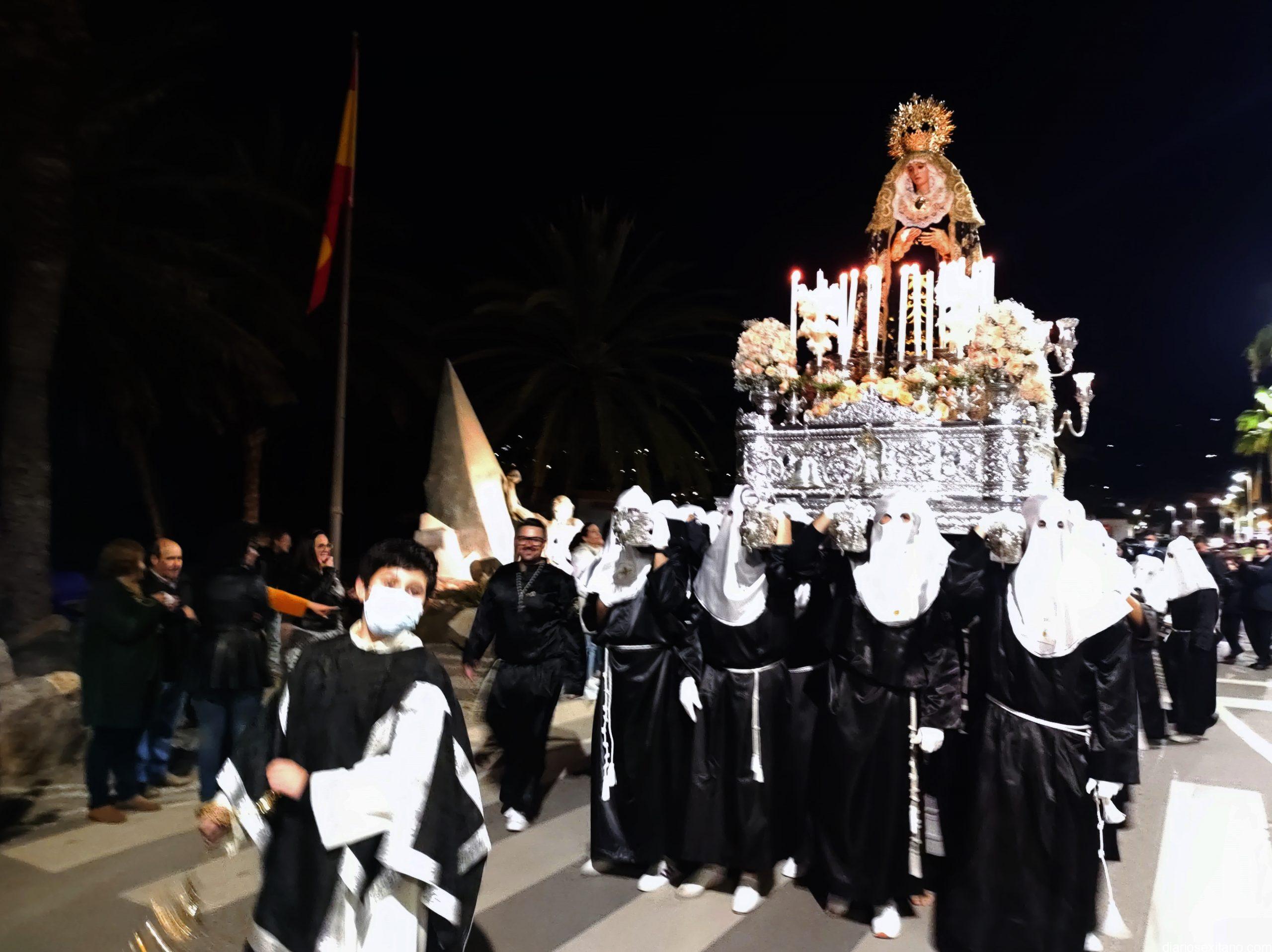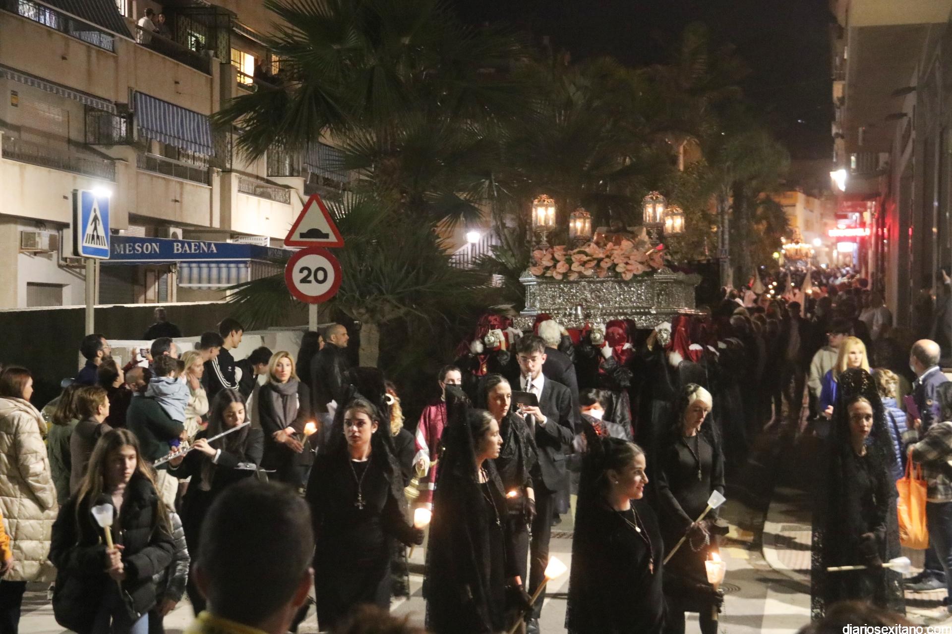 La Cofradía de La Herradura vivió este Viernes Santo su día grande de fervor al Cristo Yacente, obra del escultor local Pepe Gámez, y la Virgen de los Dolores. Penitentes y mantillas acompañaron a los titulares en el recorrido por el centro y el paseo marítimo.