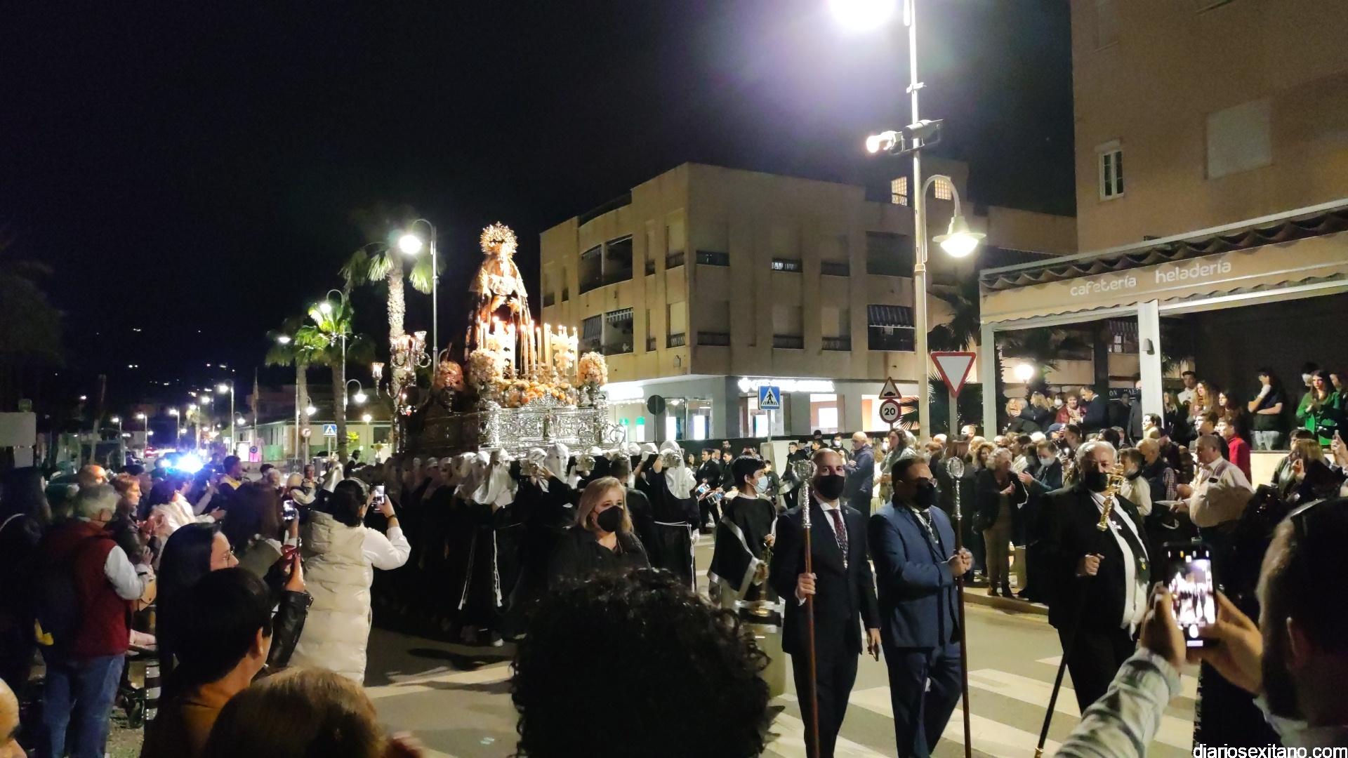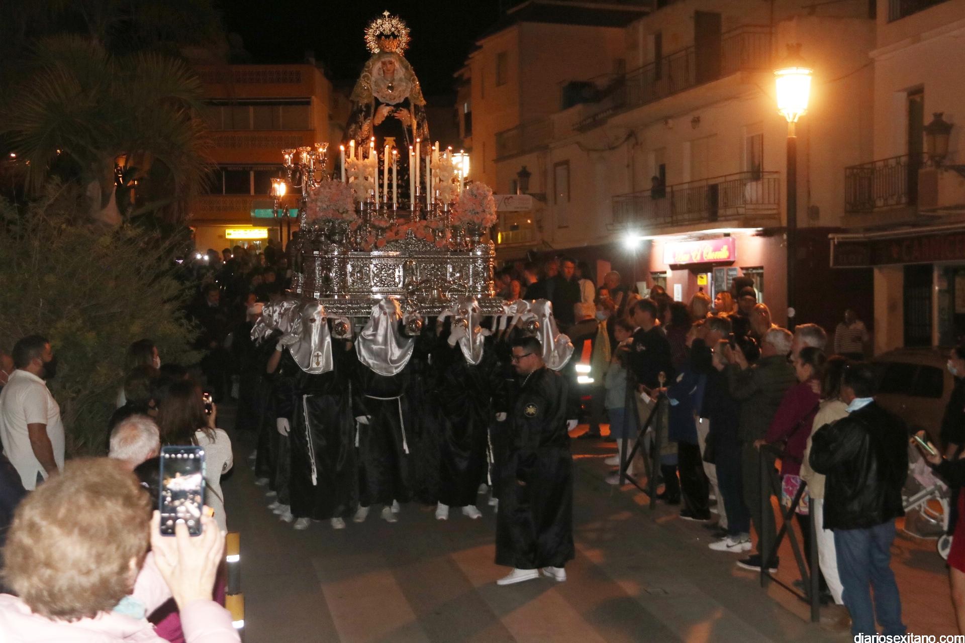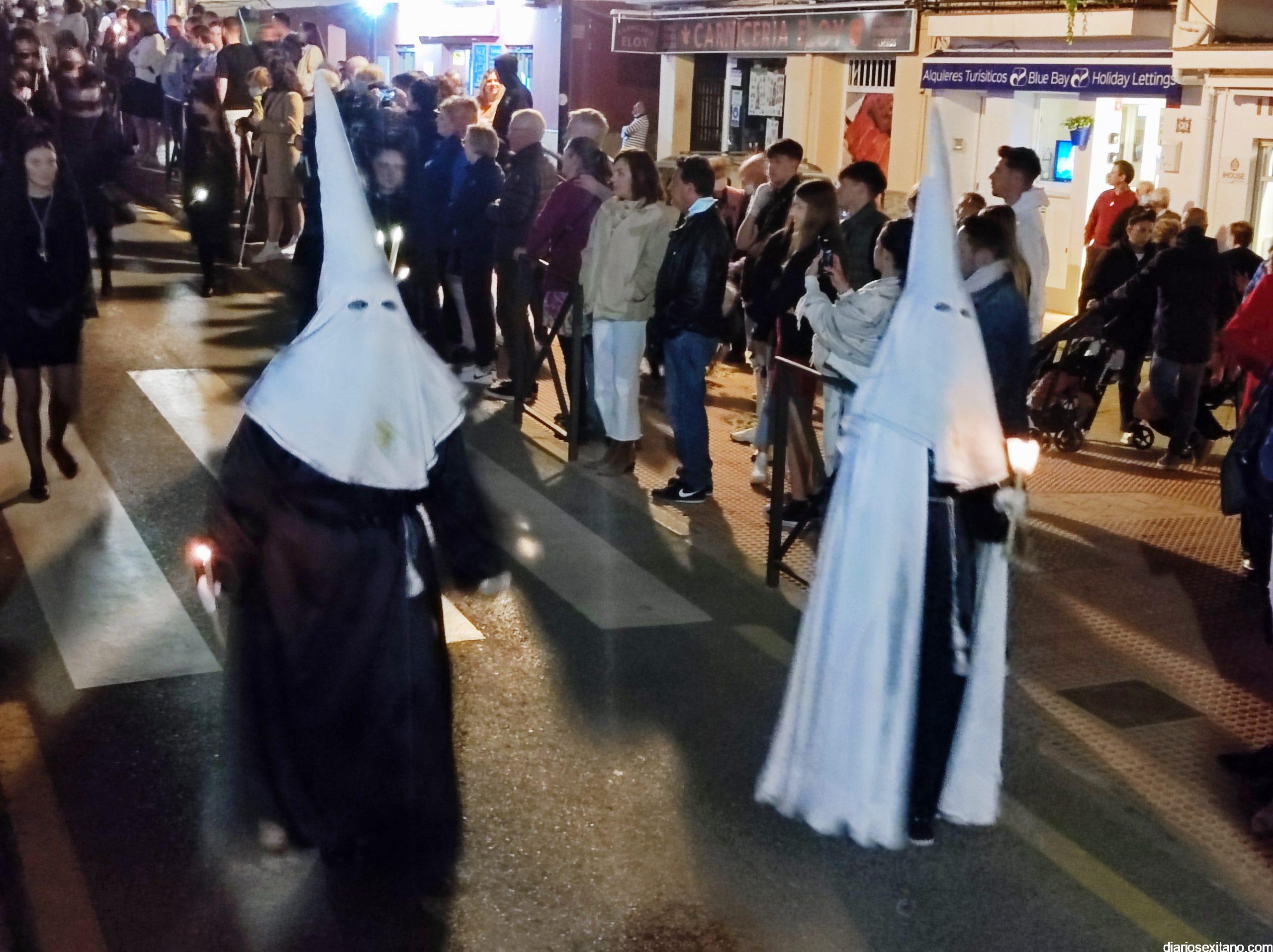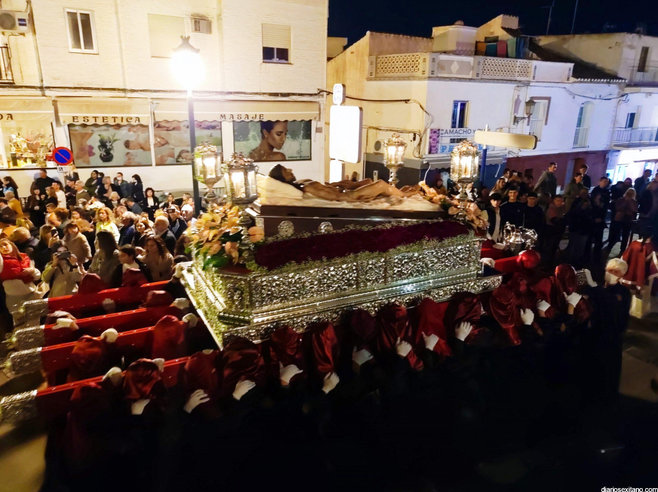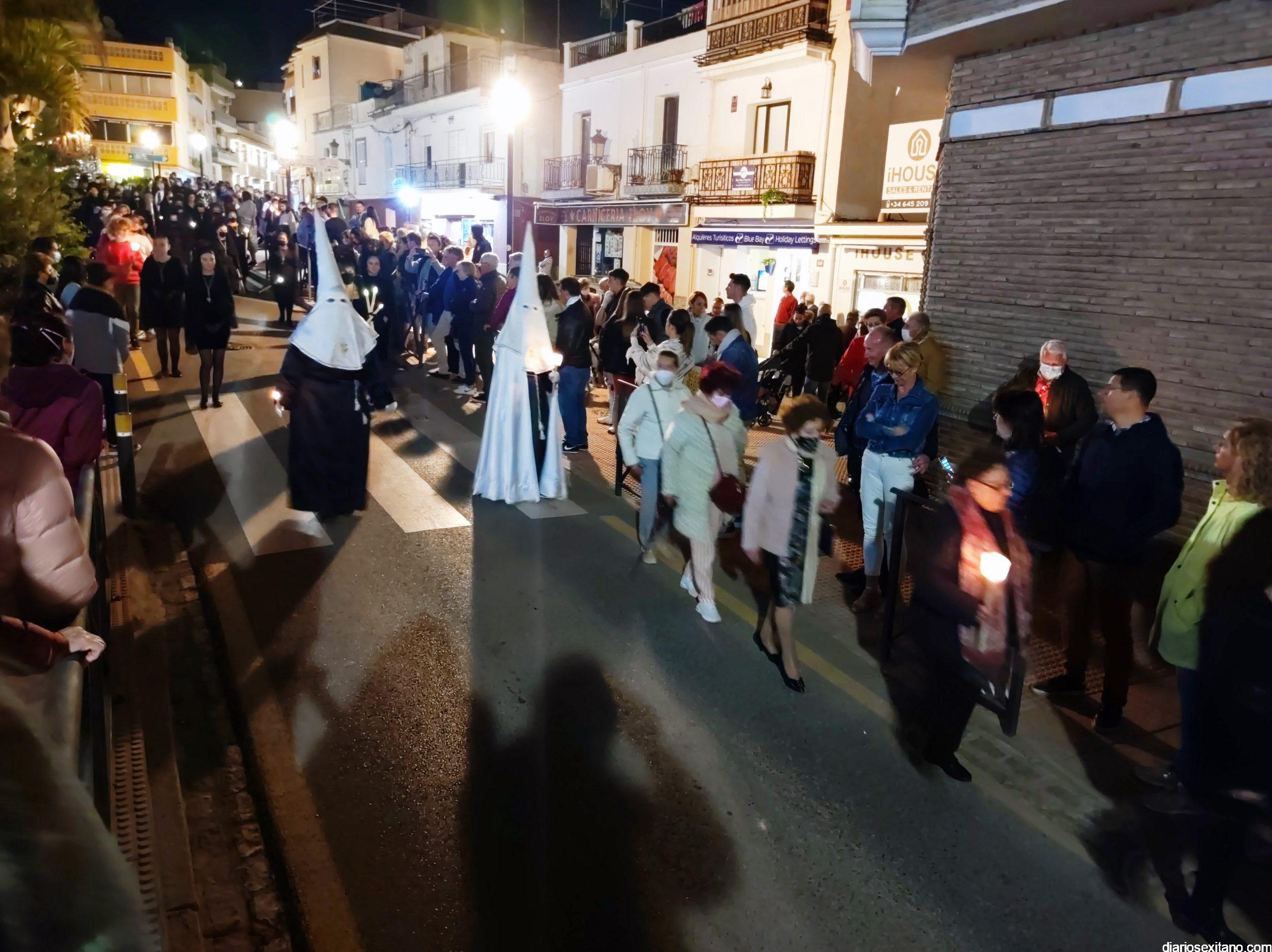 La Cofradía de La Herradura vivió este Viernes Santo su día grande de fervor al Cristo Yacente, obra del escultor local Pepe Gámez, y la Virgen de los Dolores. Penitentes y mantillas acompañaron a los titulares en el recorrido por el centro y el paseo marítimo.