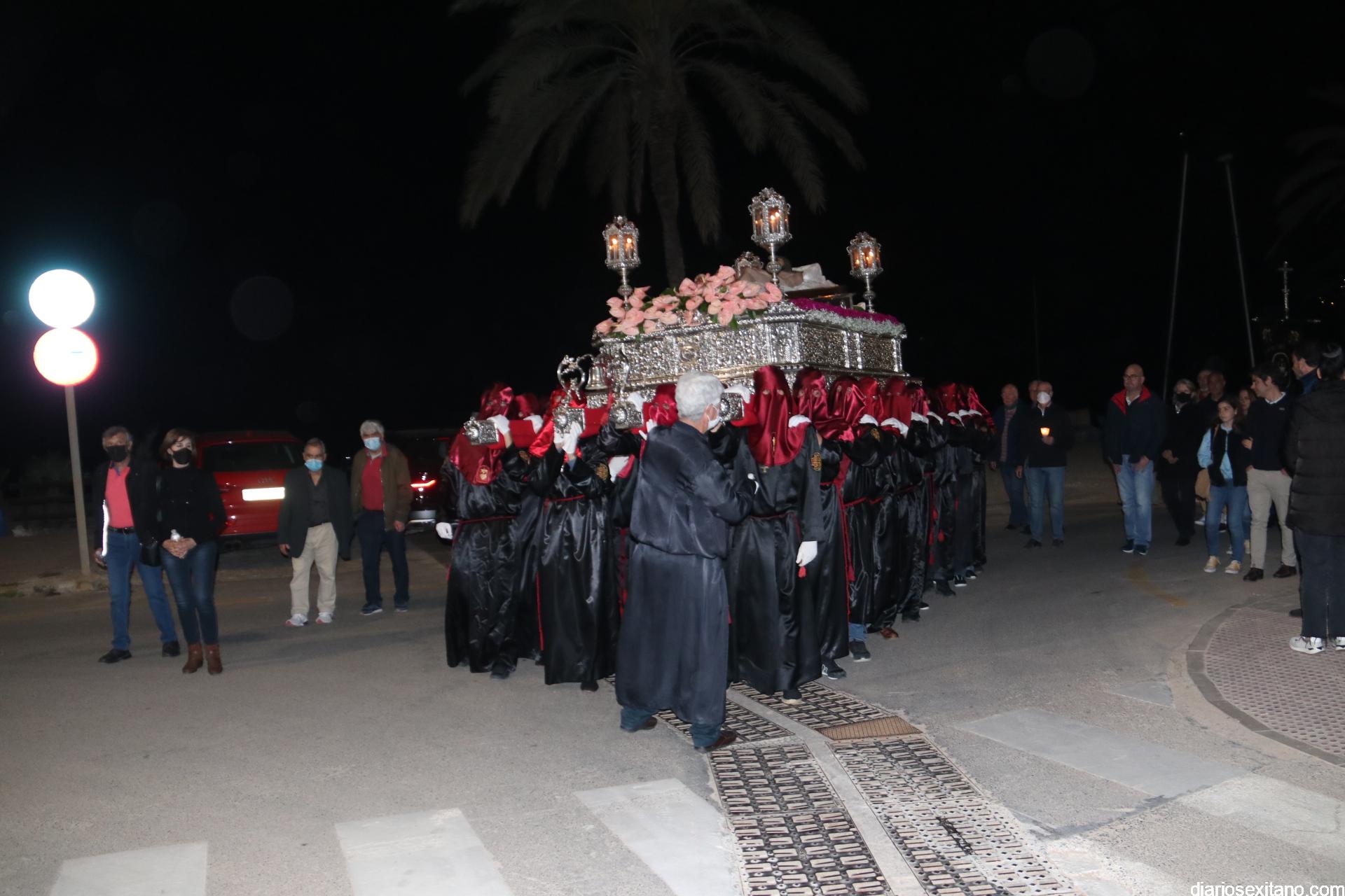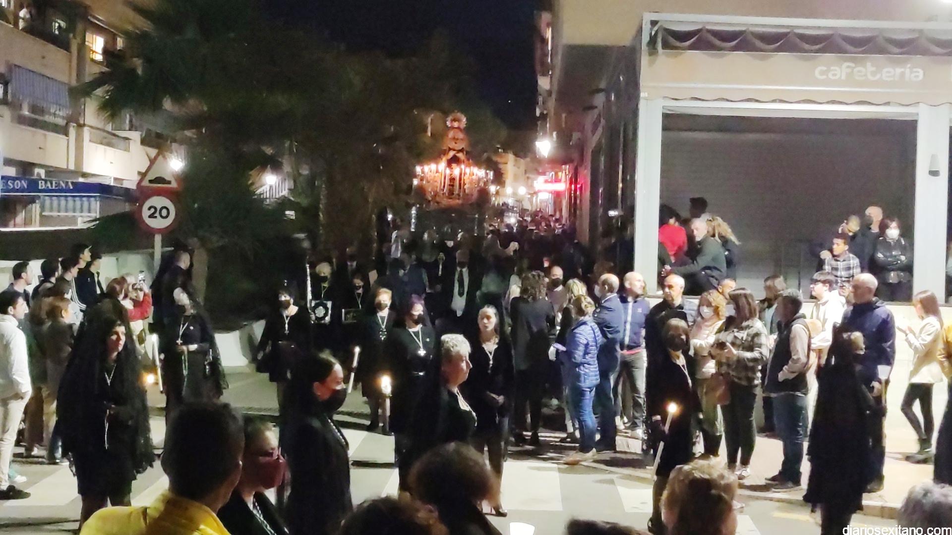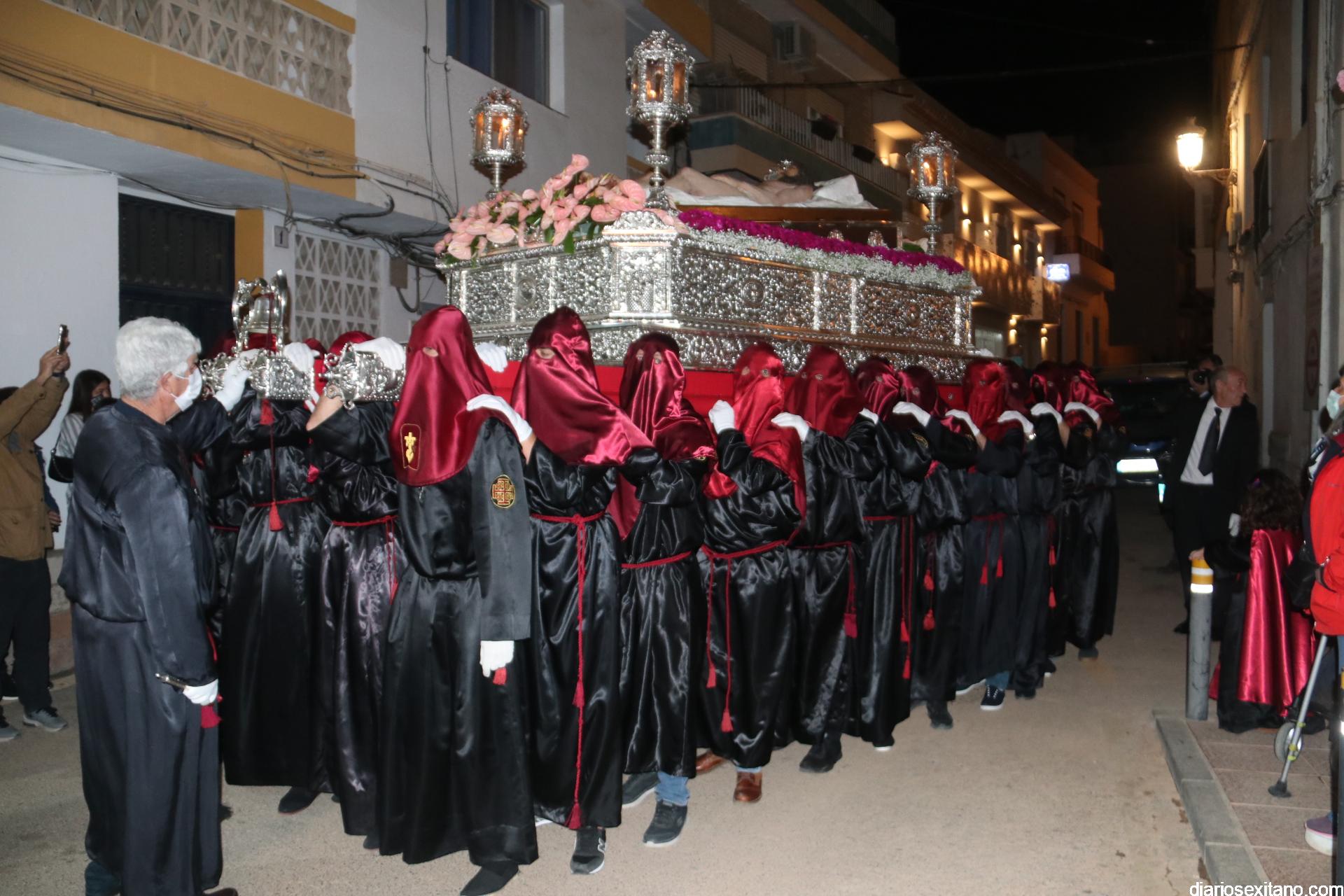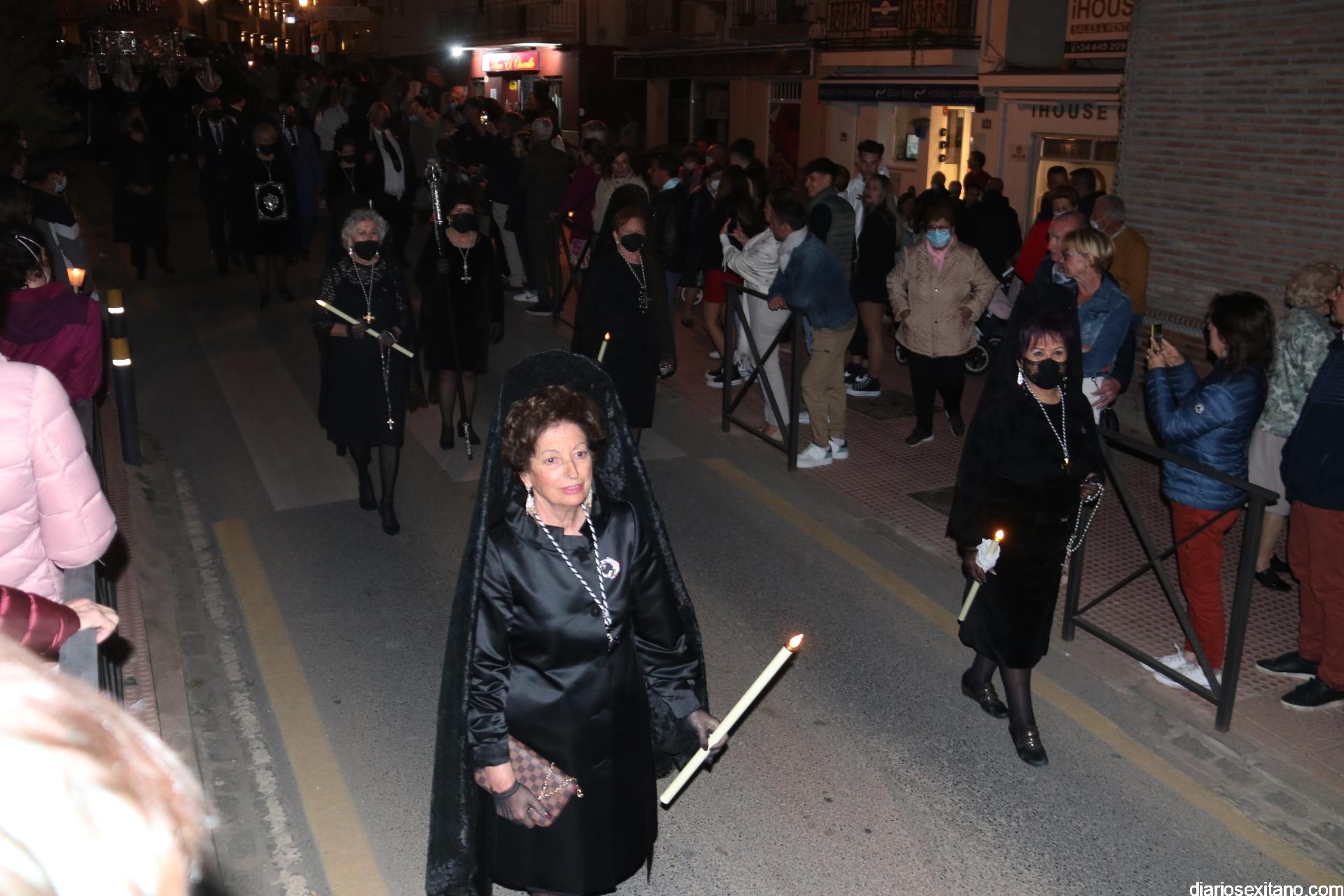 La Cofradía de La Herradura vivió este Viernes Santo su día grande de fervor al Cristo Yacente, obra del escultor local Pepe Gámez, y la Virgen de los Dolores. Penitentes y mantillas acompañaron a los titulares en el recorrido por el centro y el paseo marítimo.