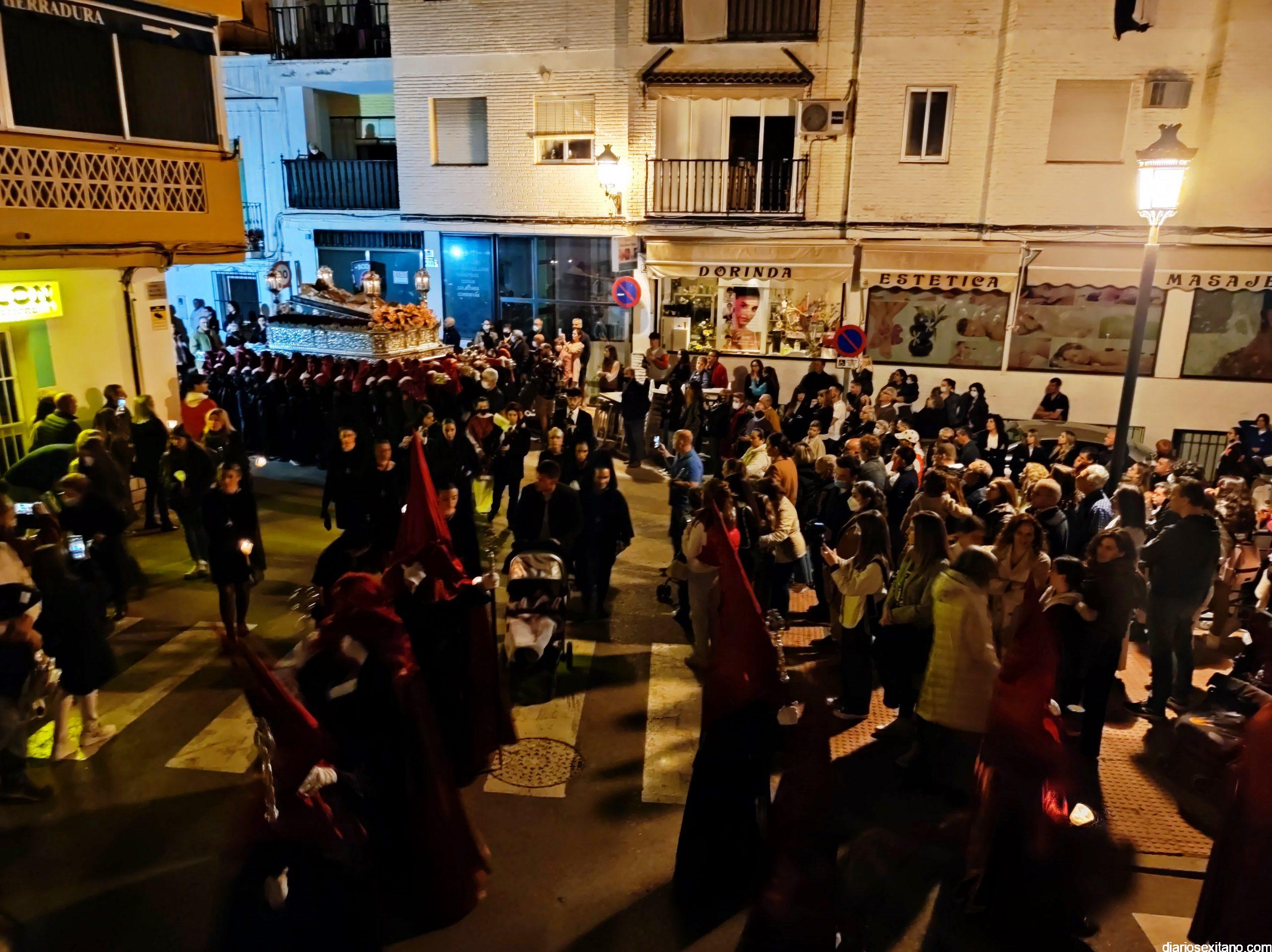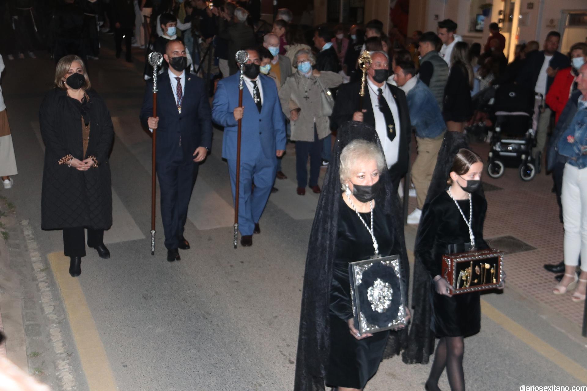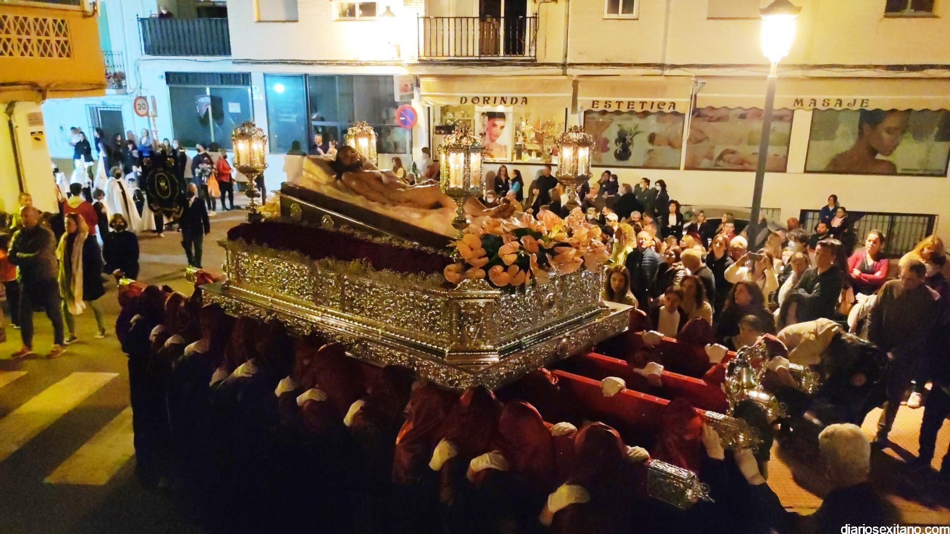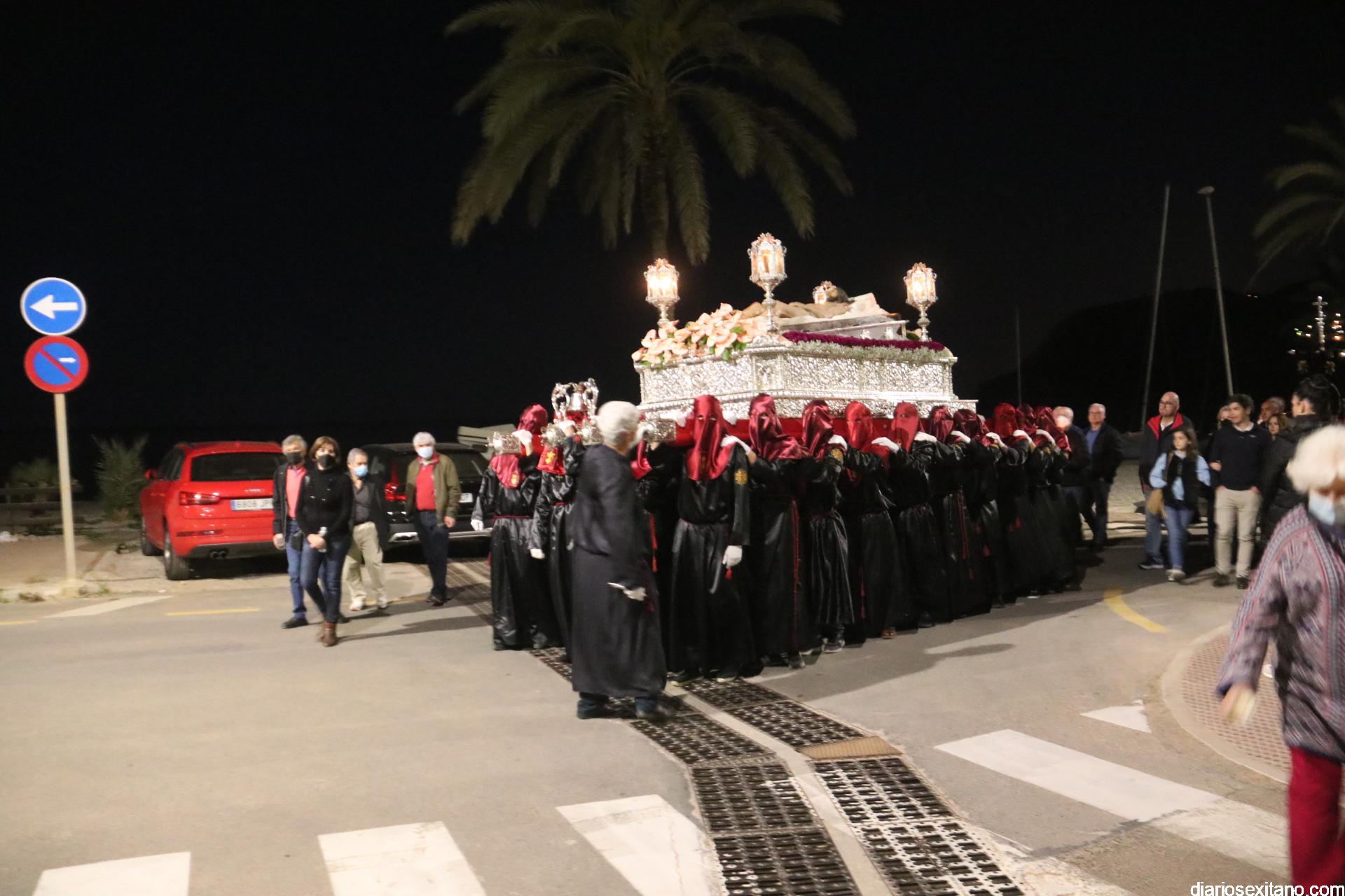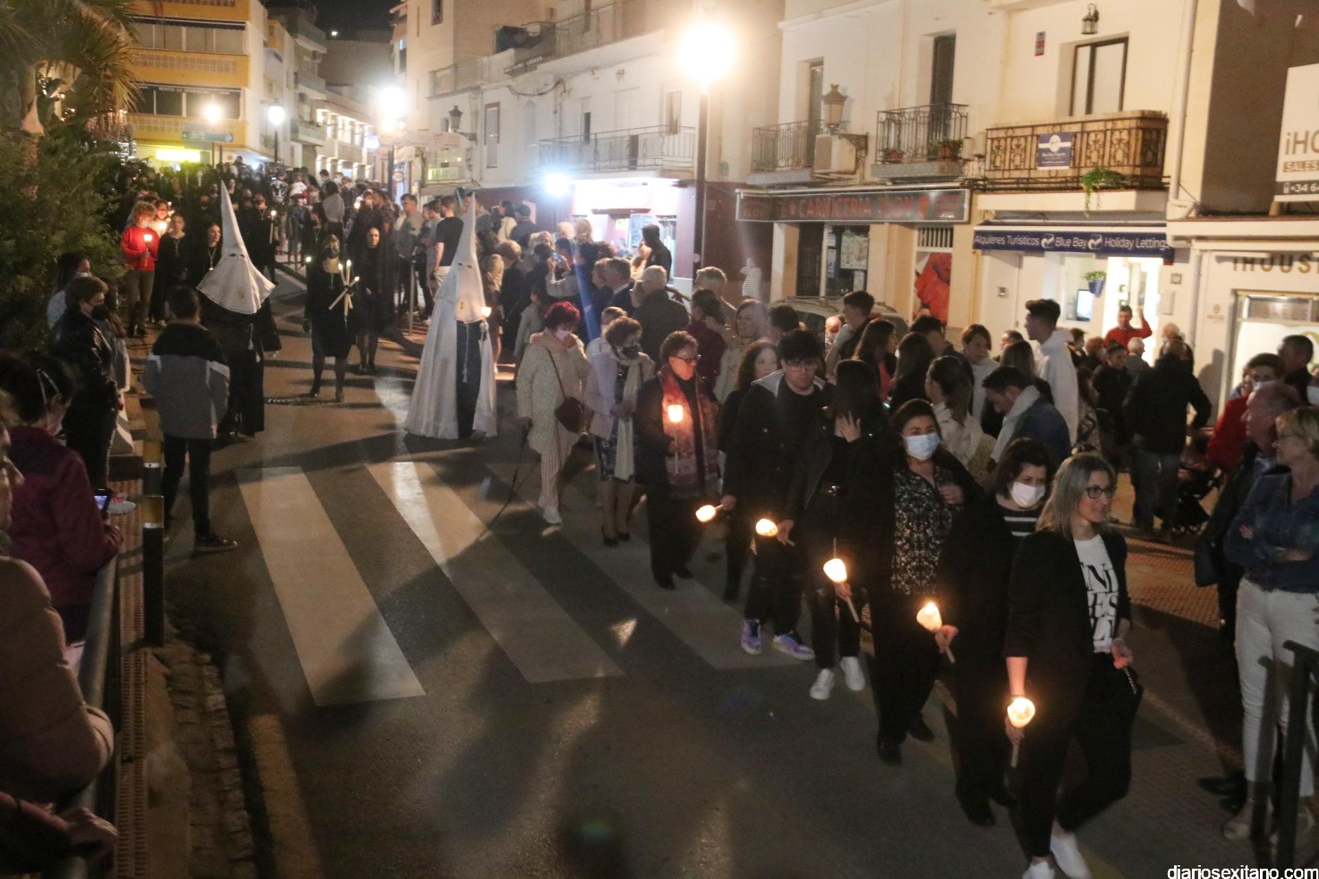 La Cofradía de La Herradura vivió este Viernes Santo su día grande de fervor al Cristo Yacente, obra del escultor local Pepe Gámez, y la Virgen de los Dolores. Penitentes y mantillas acompañaron a los titulares en el recorrido por el centro y el paseo marítimo.