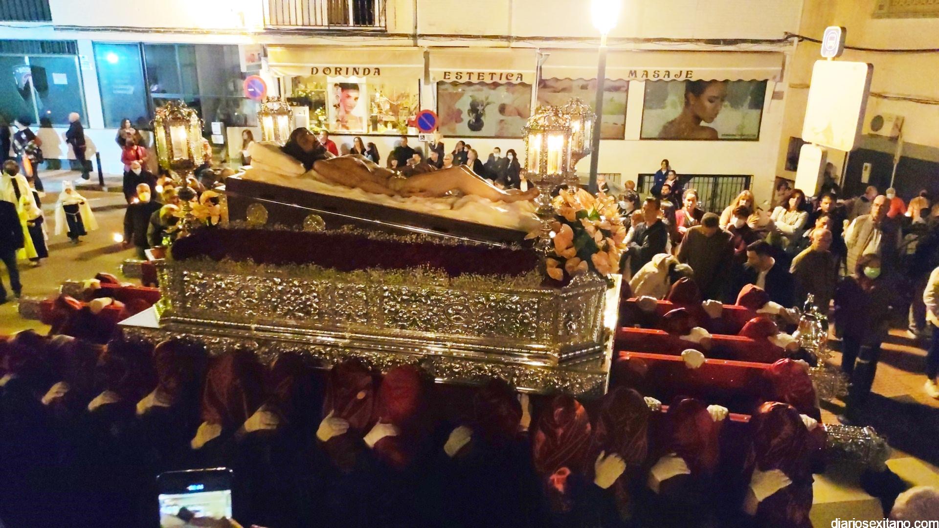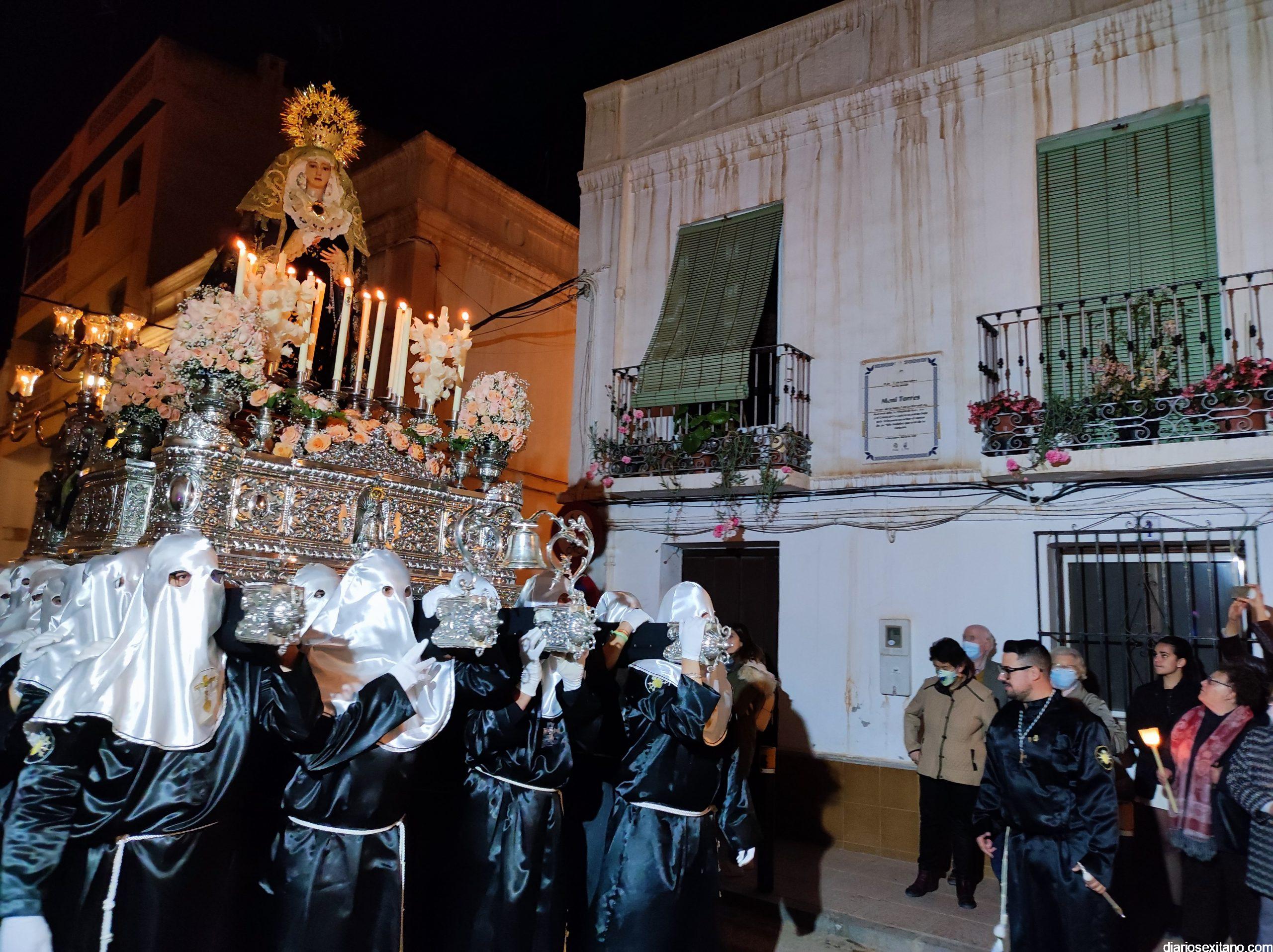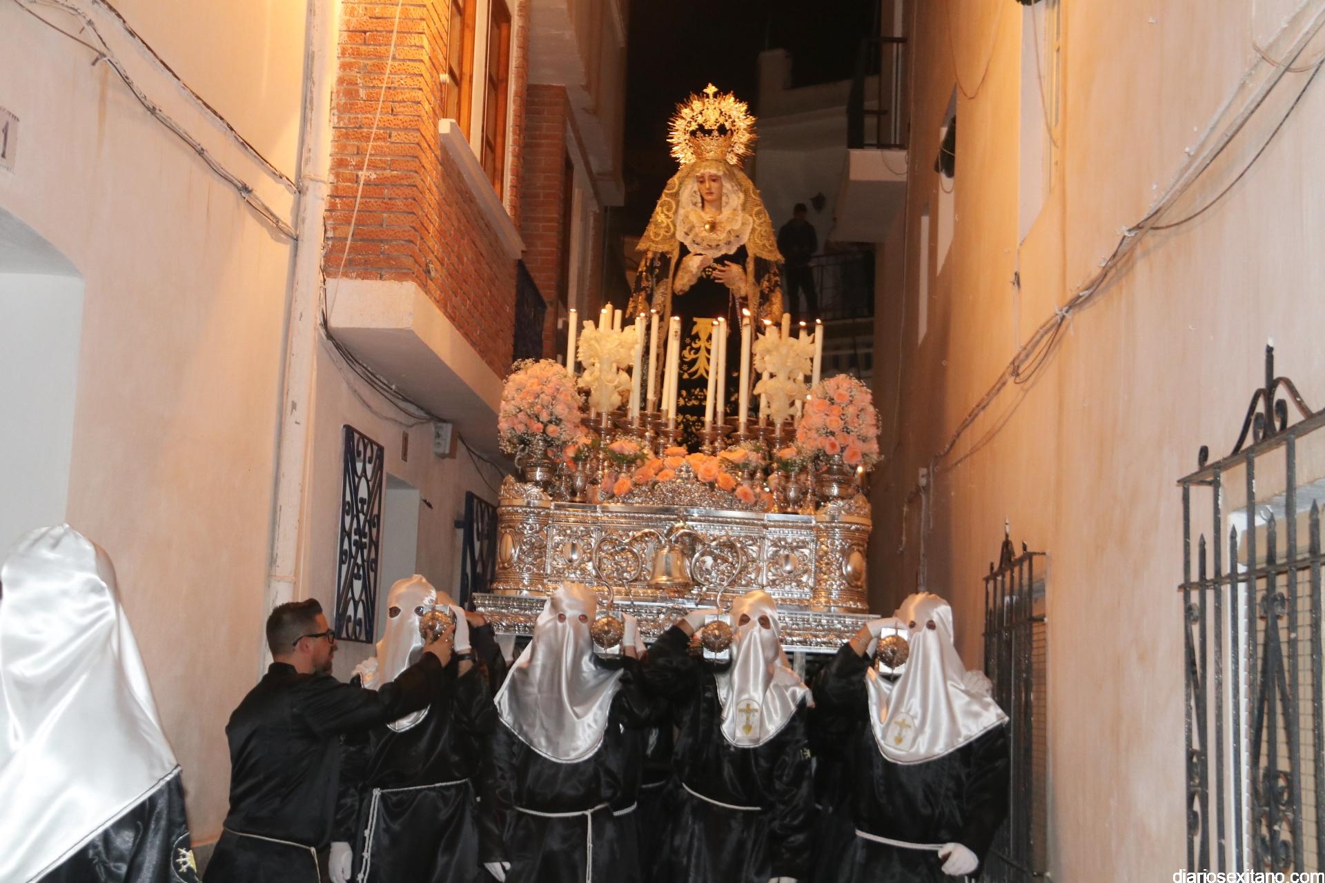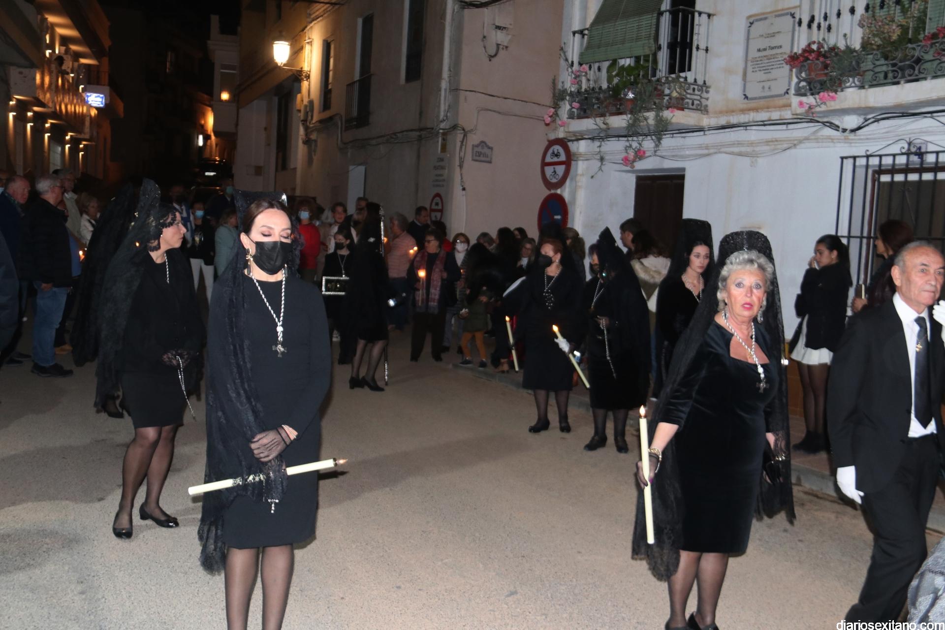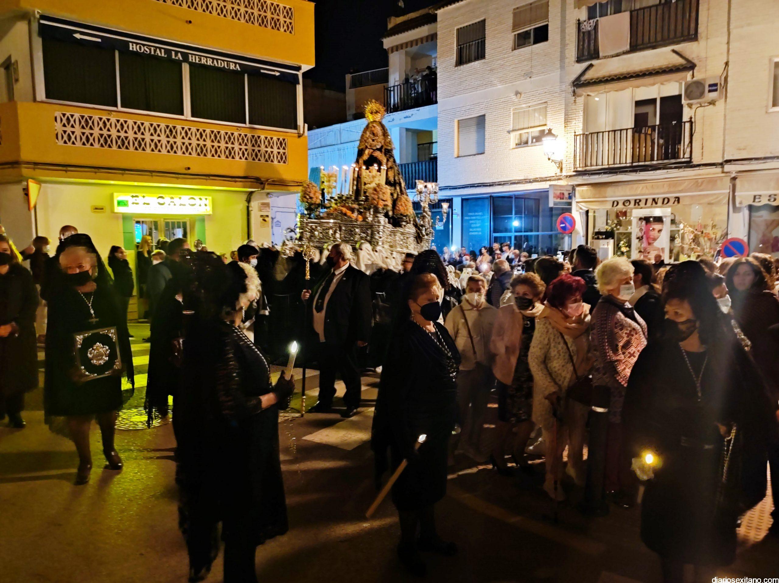 La Cofradía de La Herradura vivió este Viernes Santo su día grande de fervor al Cristo Yacente, obra del escultor local Pepe Gámez, y la Virgen de los Dolores. Penitentes y mantillas acompañaron a los titulares en el recorrido por el centro y el paseo marítimo.