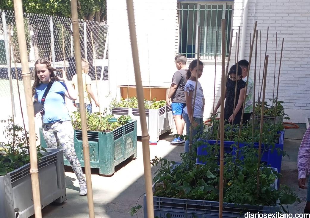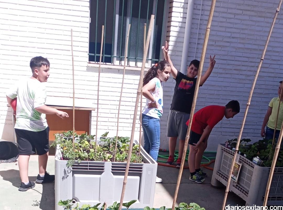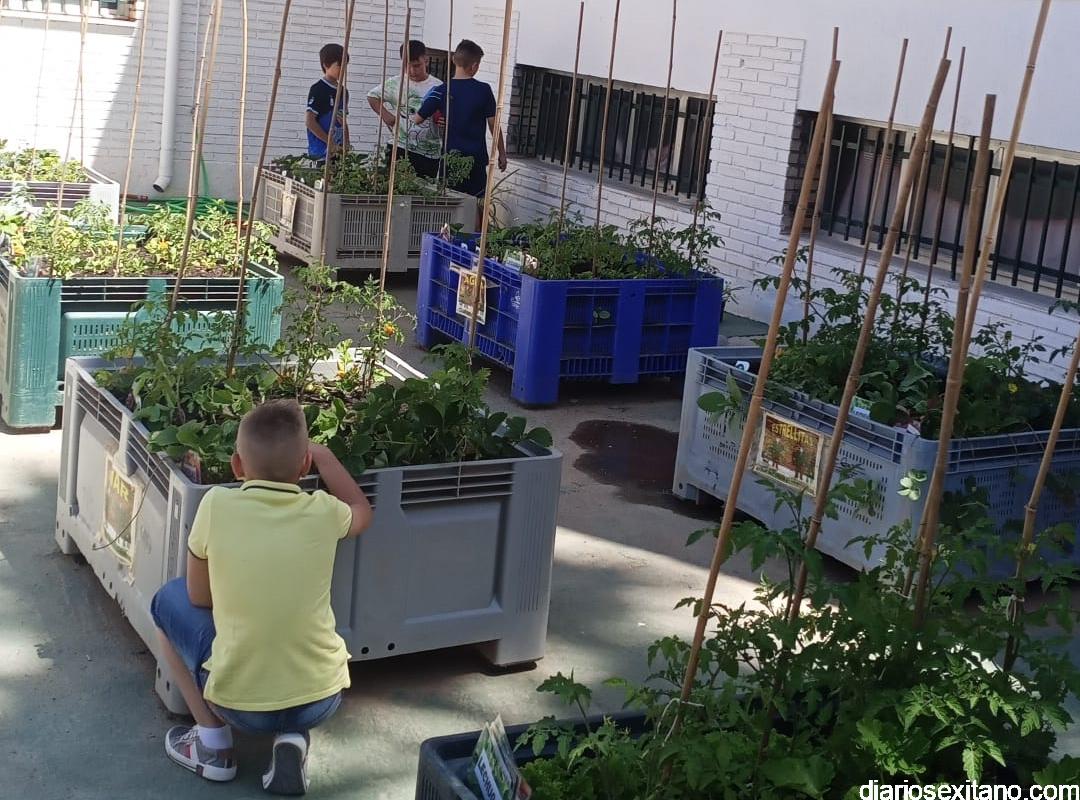 Un Huerto Escolar donde tienen la oportunidad de cuidar una superficie de 150 metros cuadrados, que ha sido habilitado e impulsado definitivamente por el AMPA del centro, como recurso destacado y con el objetivo prioritario en el Proyecto Educativo de este colegio en el presente curso escolar, según su director, Jesús Carretero, quien agradece el apoyo y colaboración del Ayuntamiento sexitano en la instalación de riego y el aporte de tierra y turba para la plantación.