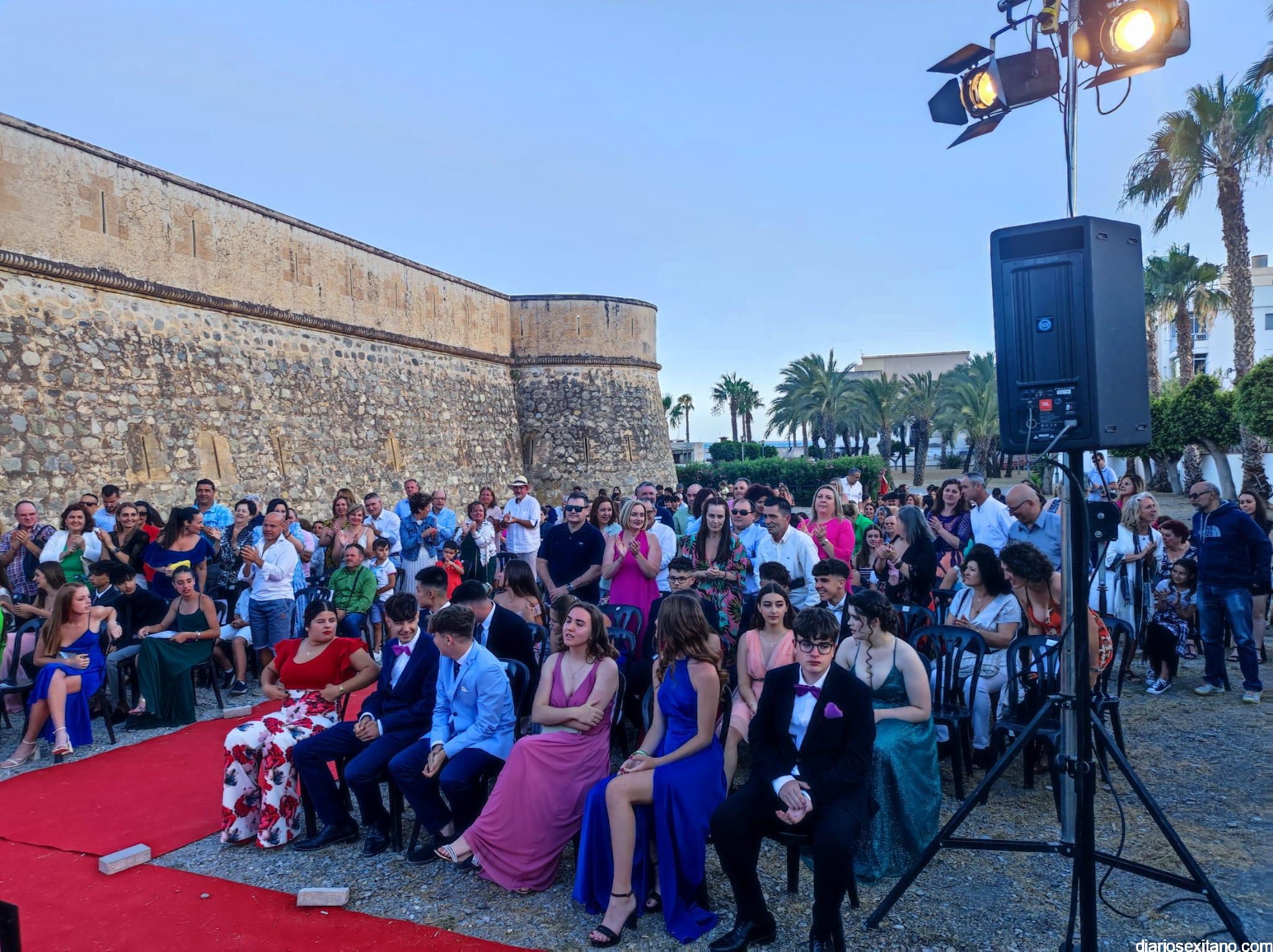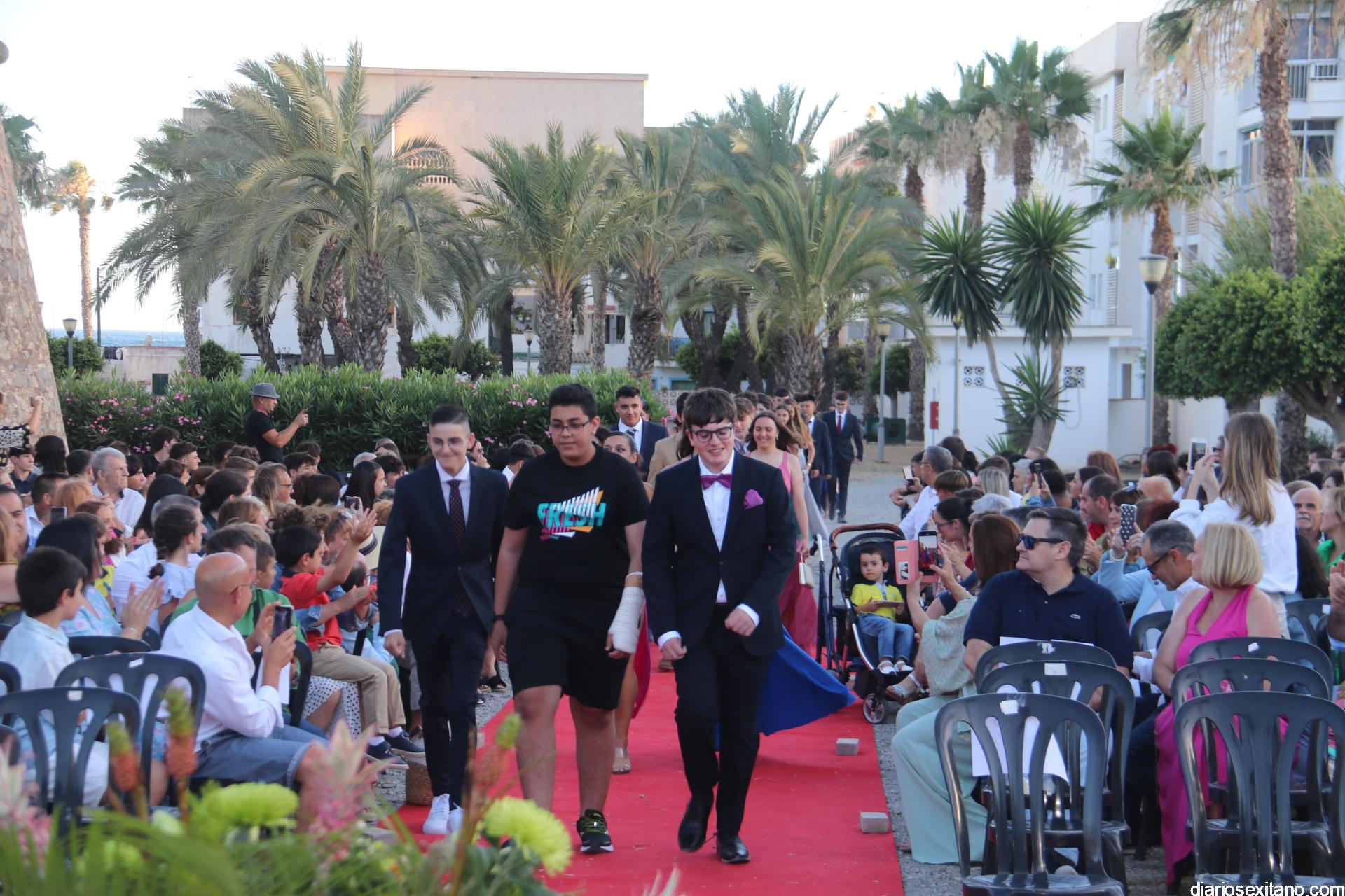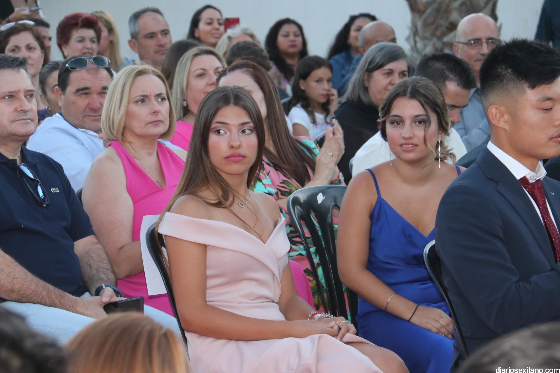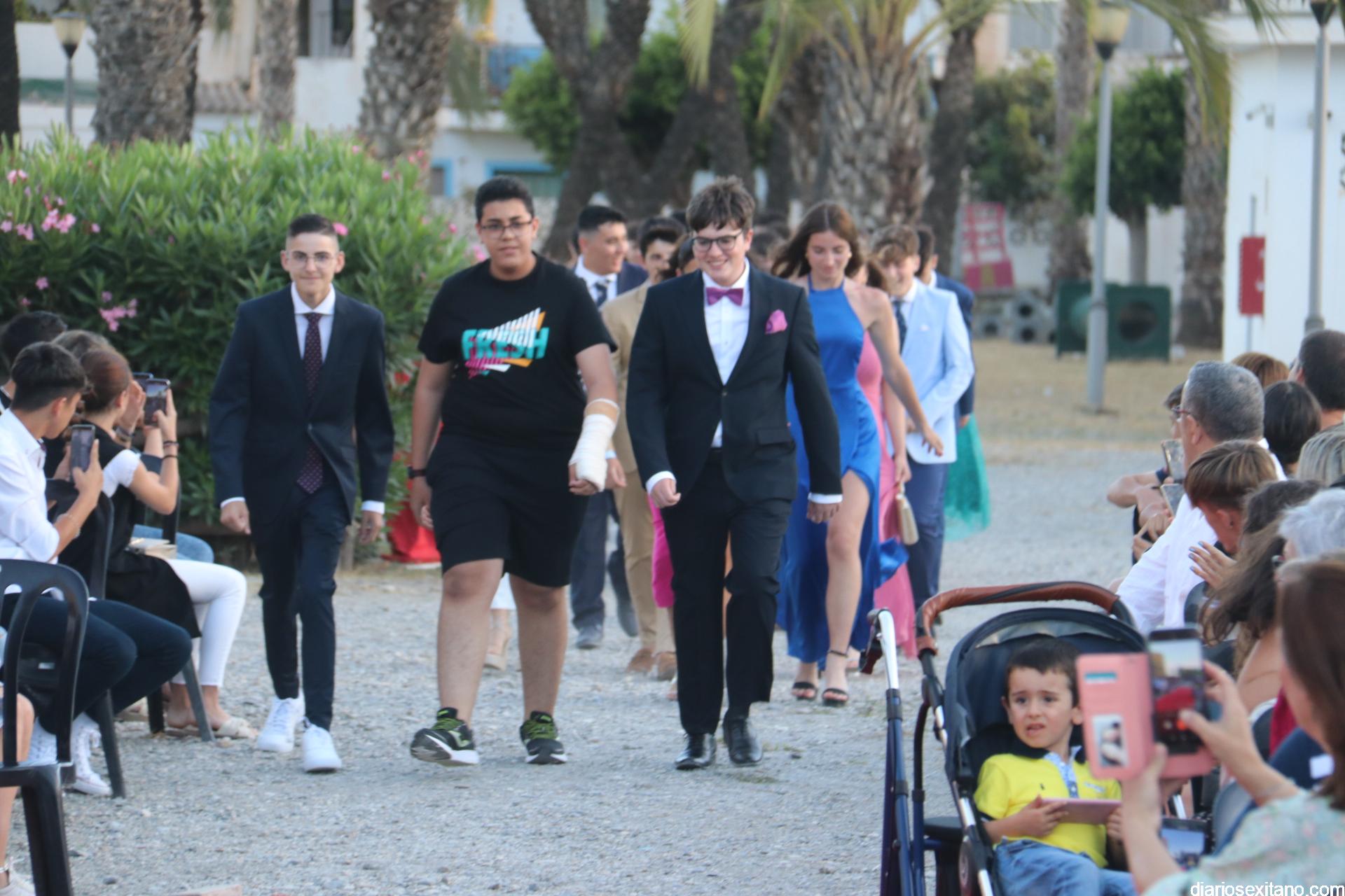 El acto, tras unos minutos de retraso debido al aire desapacible de poniente que obligó a ello, se celebró la Graduación con la entrada de los casi 40 alumnos que ha tenido esta promoción y que ocuparon los primeros asientos, cerca de padres y familiares que, con la correspondiente invitación fueron testigos de un bonito y emotivo momento.