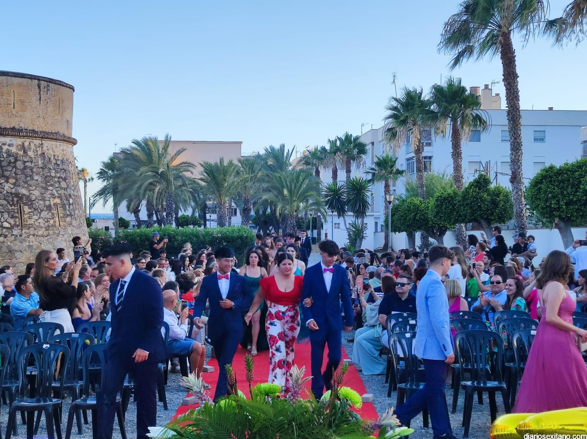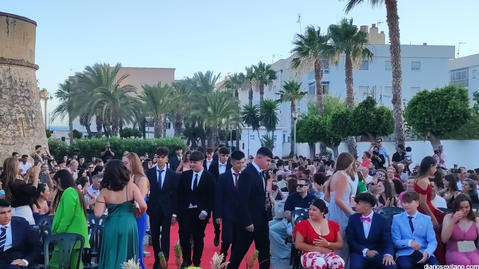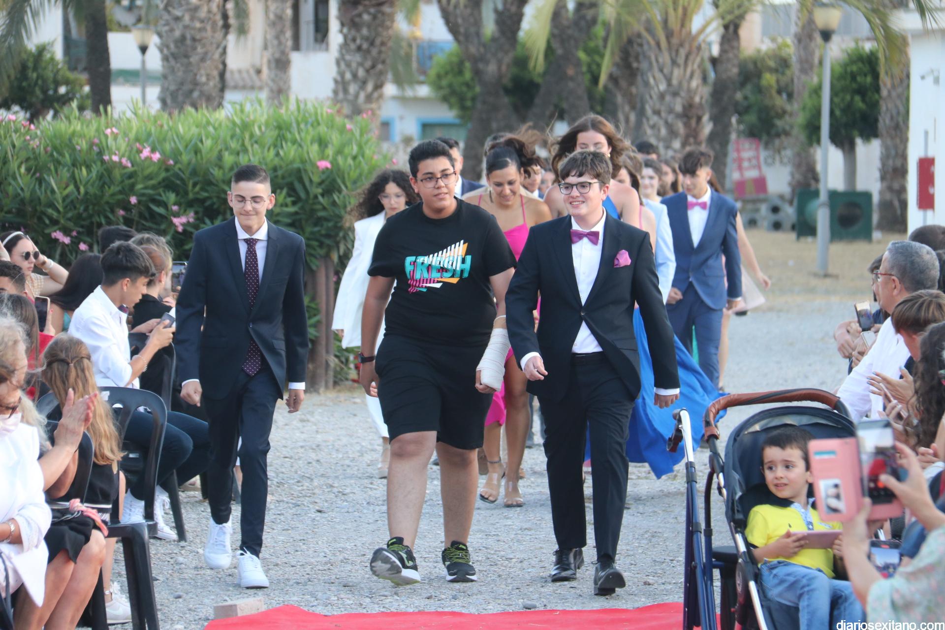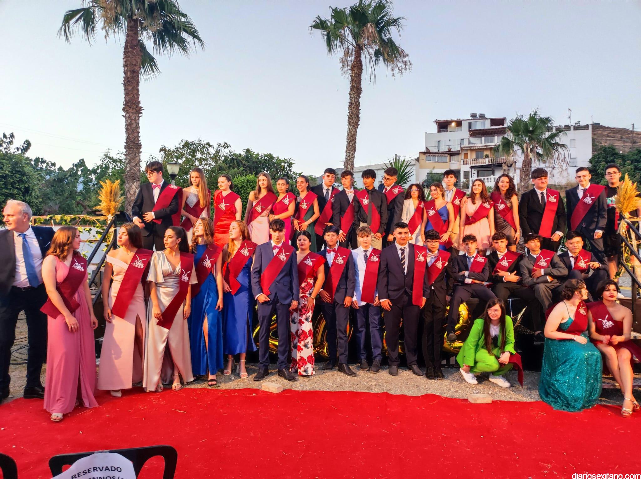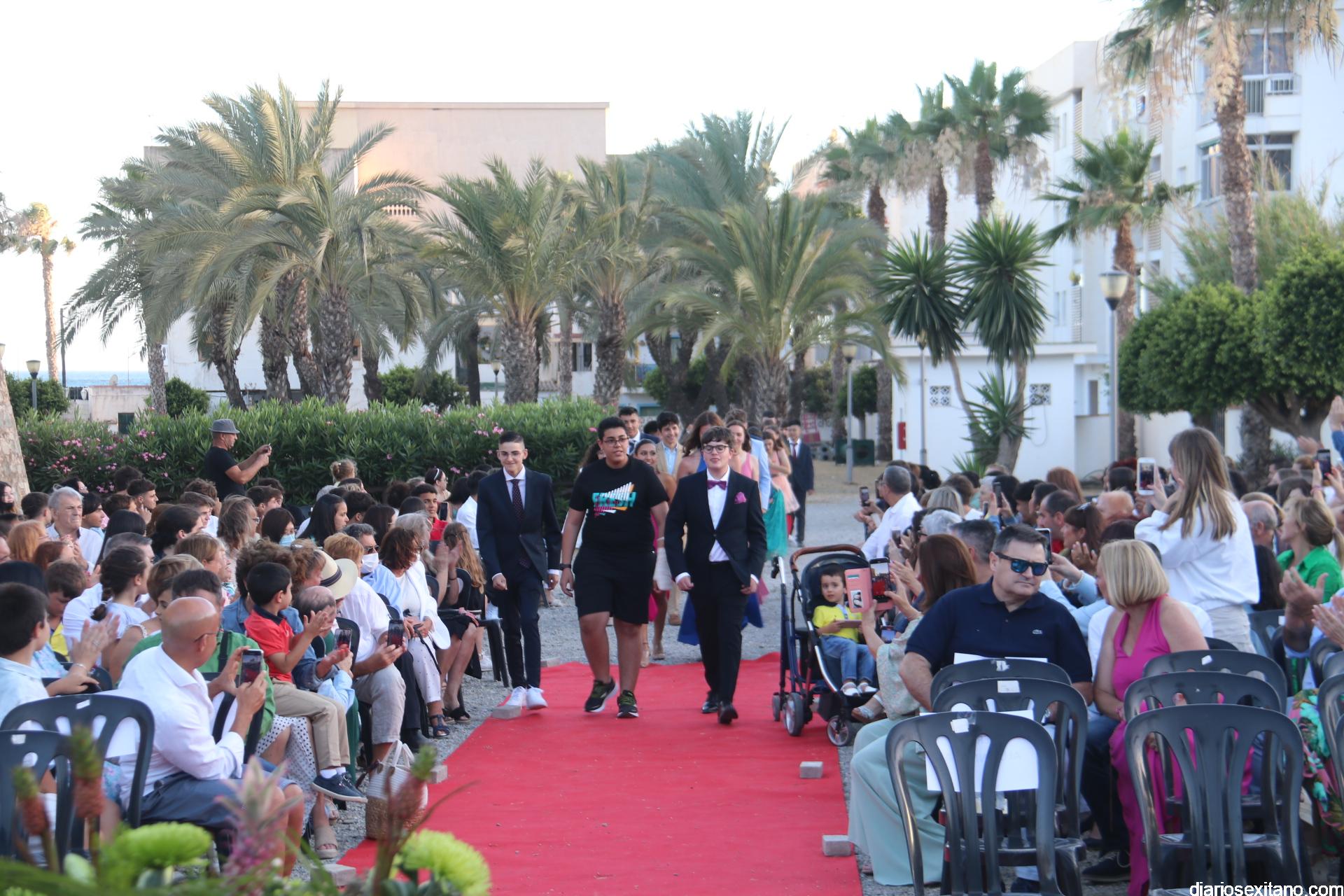 El acto, tras unos minutos de retraso debido al aire desapacible de poniente que obligó a ello, se celebró la Graduación con la entrada de los casi 40 alumnos que ha tenido esta promoción y que ocuparon los primeros asientos, cerca de padres y familiares que, con la correspondiente invitación fueron testigos de un bonito y emotivo momento.