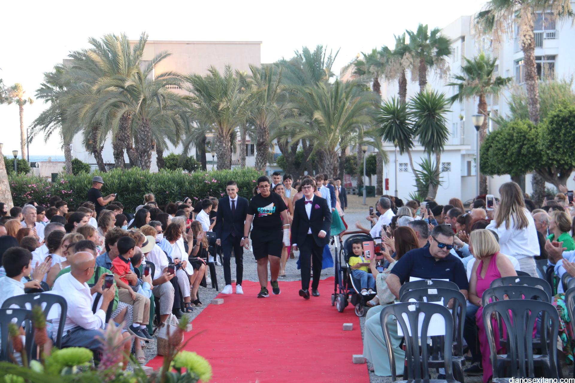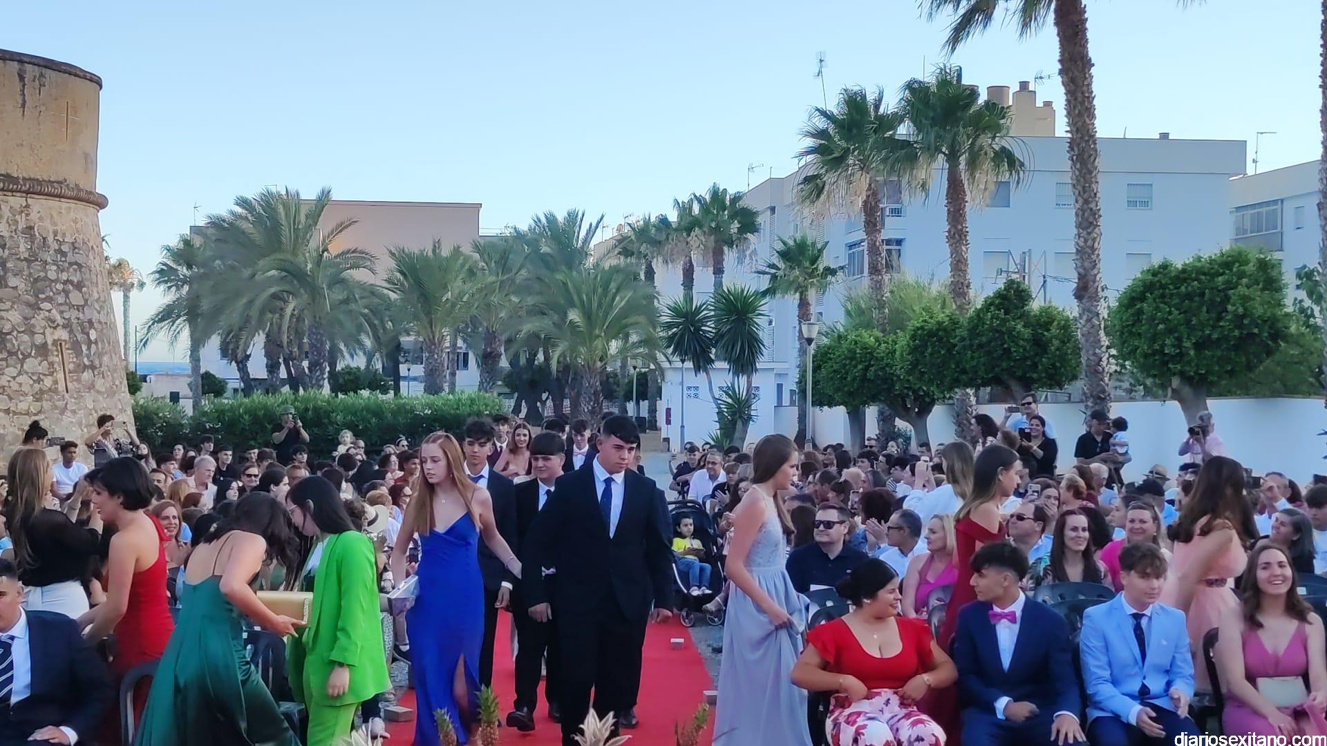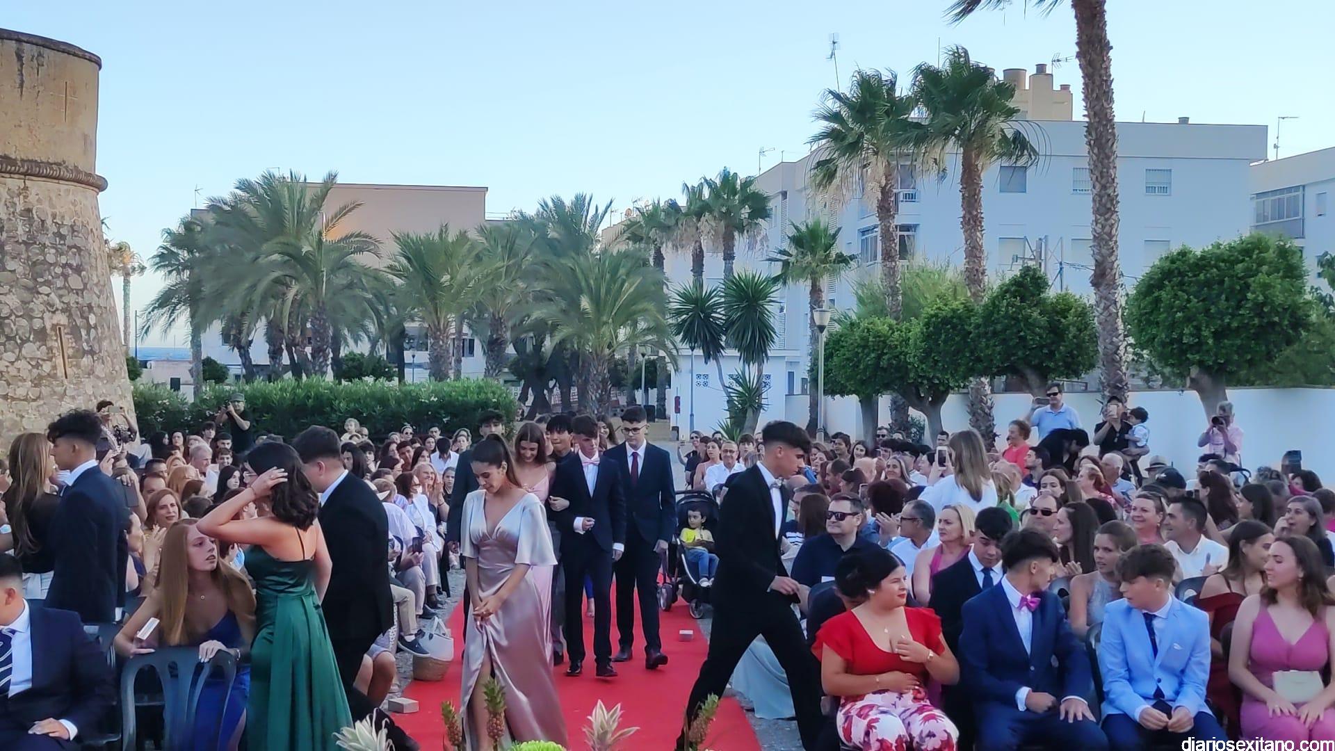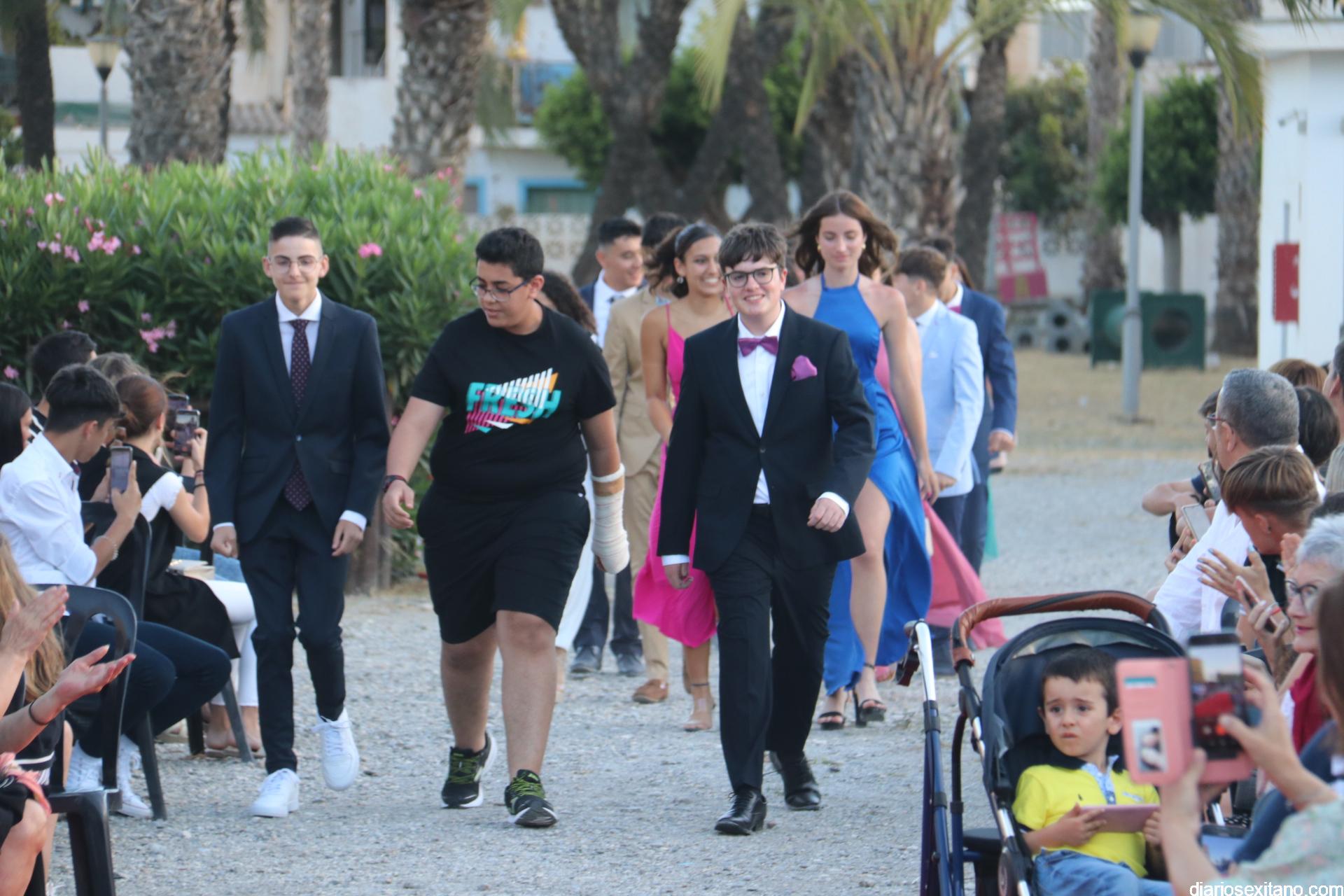 El acto, tras unos minutos de retraso debido al aire desapacible de poniente que obligó a ello, se celebró la Graduación con la entrada de los casi 40 alumnos que ha tenido esta promoción y que ocuparon los primeros asientos, cerca de padres y familiares que, con la correspondiente invitación fueron testigos de un bonito y emotivo momento.