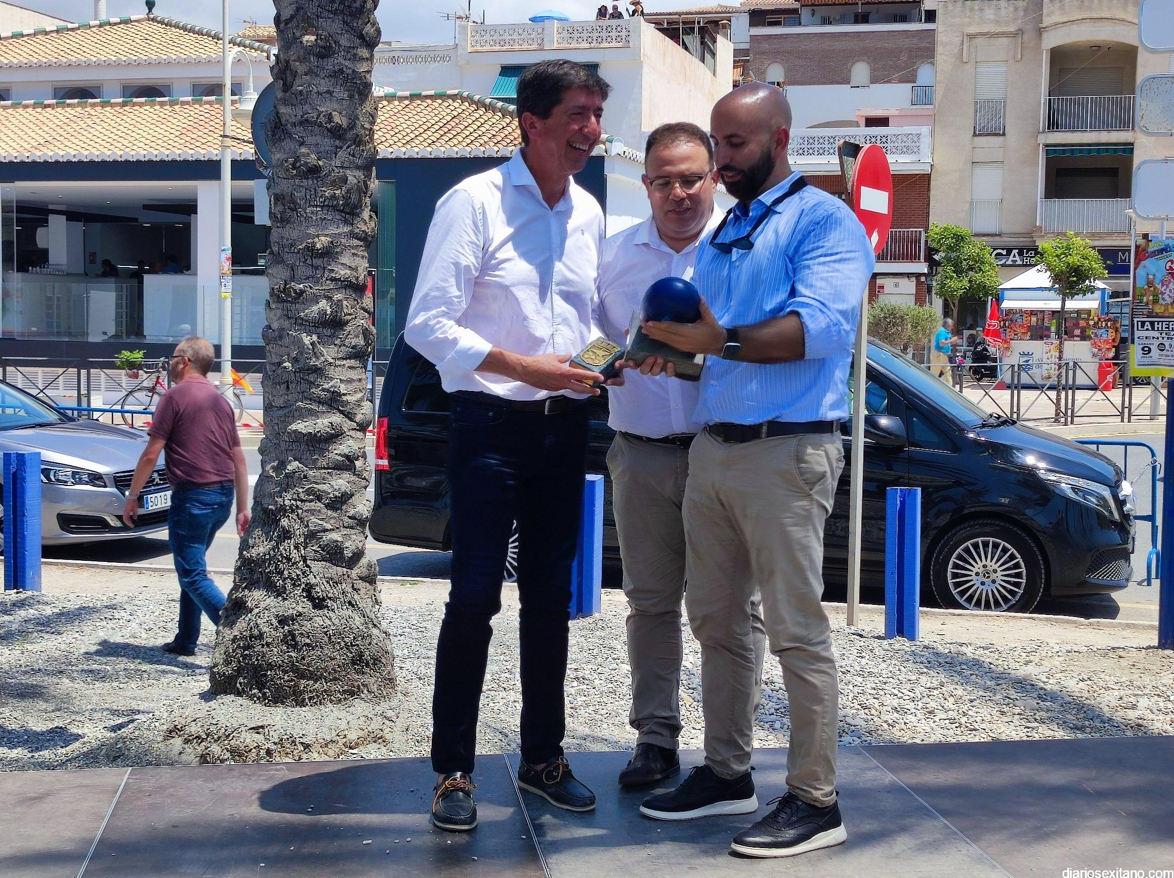 Antes del corte de la cinta de inauguración y visitar la oficina de turismo y recorrer el Mercado Gourmet, Juan Marín, recibió por parte del alcalde, Juan José Ruiz Joya, un escudo de Almuñécar y el “corazón de La Herradura” diseñado por los hermanos Moreno, de manos del teniente de alcalde de Turismo y Playas, Daniel Barbero.