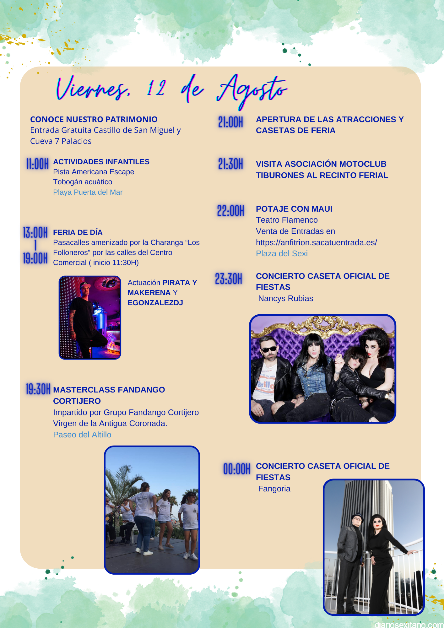 Hoy la animación en la Caseta Municipal la pondrán el grupo “Los Rebujitos” y el cantante “Sergio Contreras”. Dos actuaciones que han despertado gran interés. Será a partir de las 23,30 horas. Antes, desde las 21 horas, se celebrará el musical infantil Disneymanía.