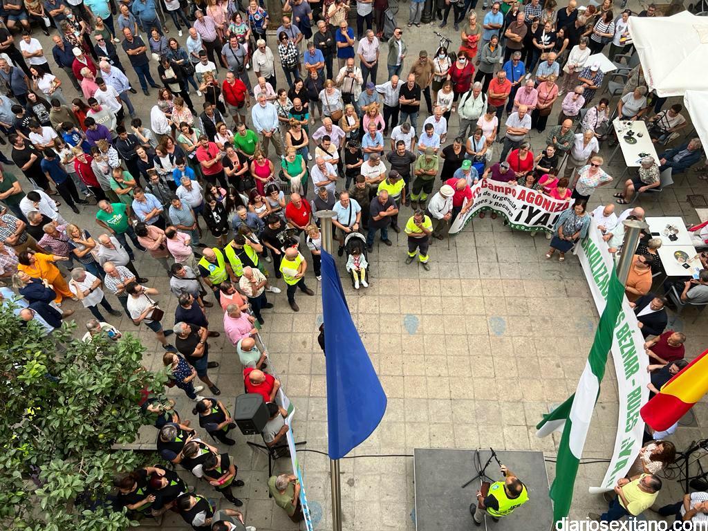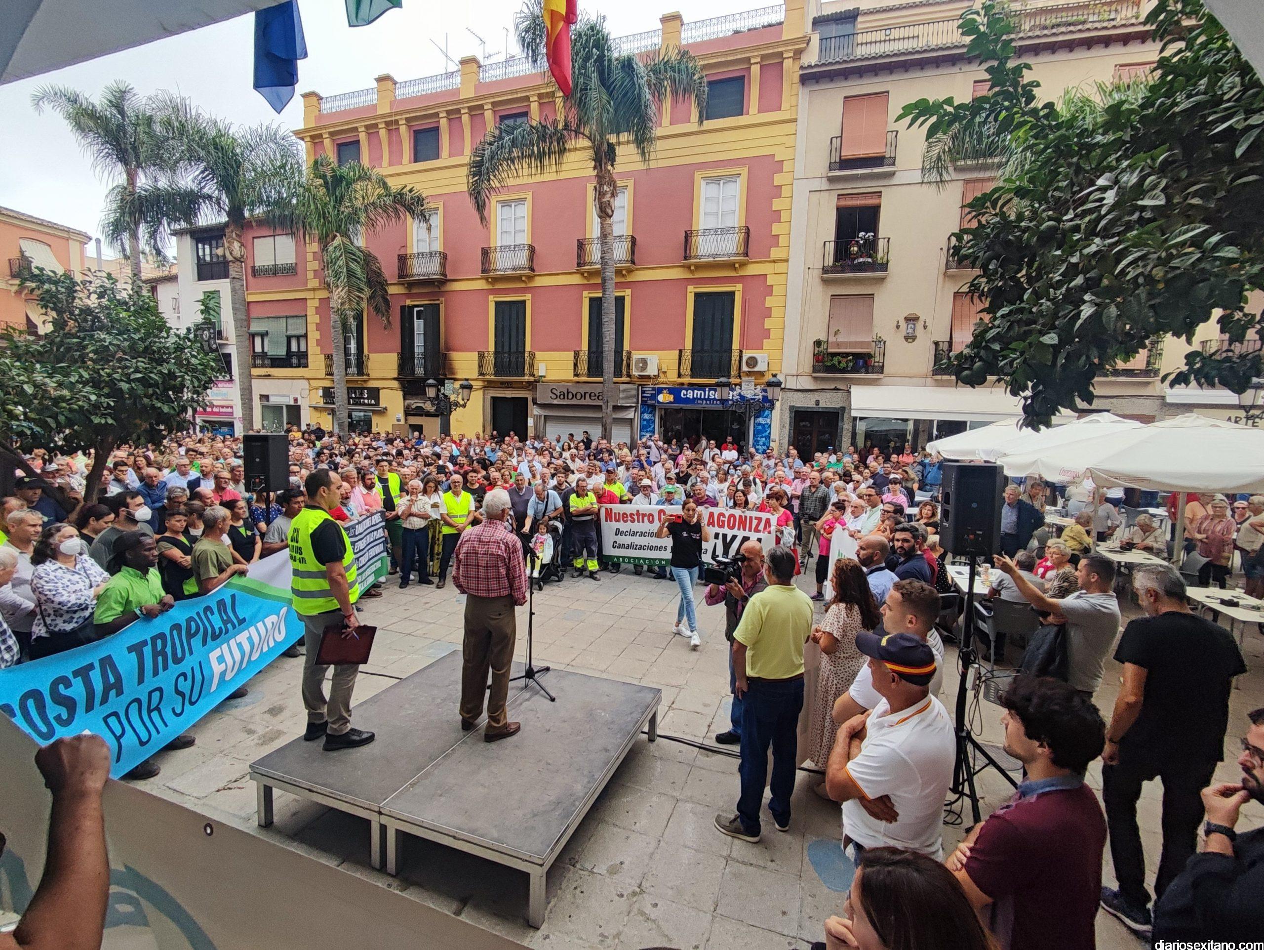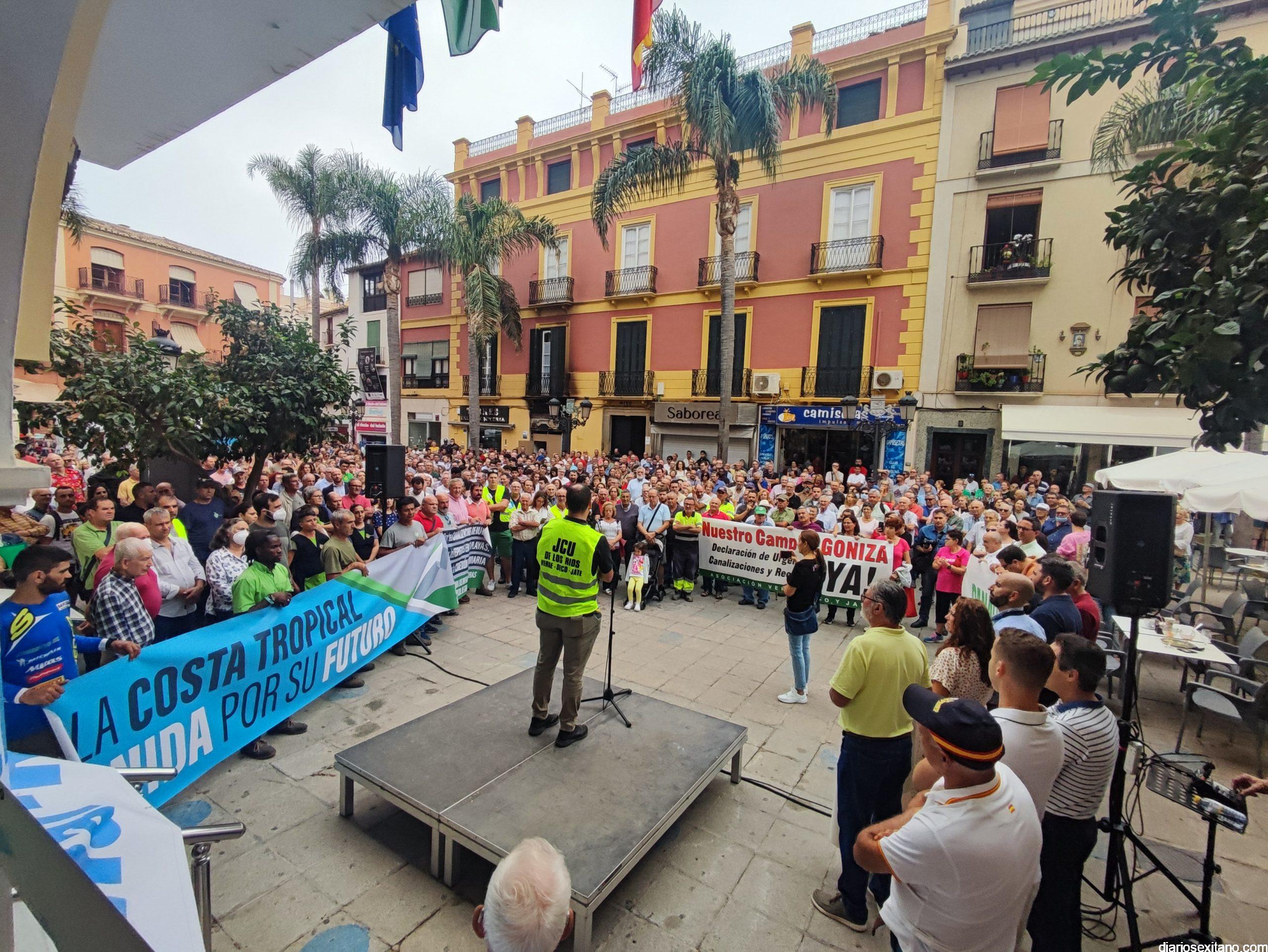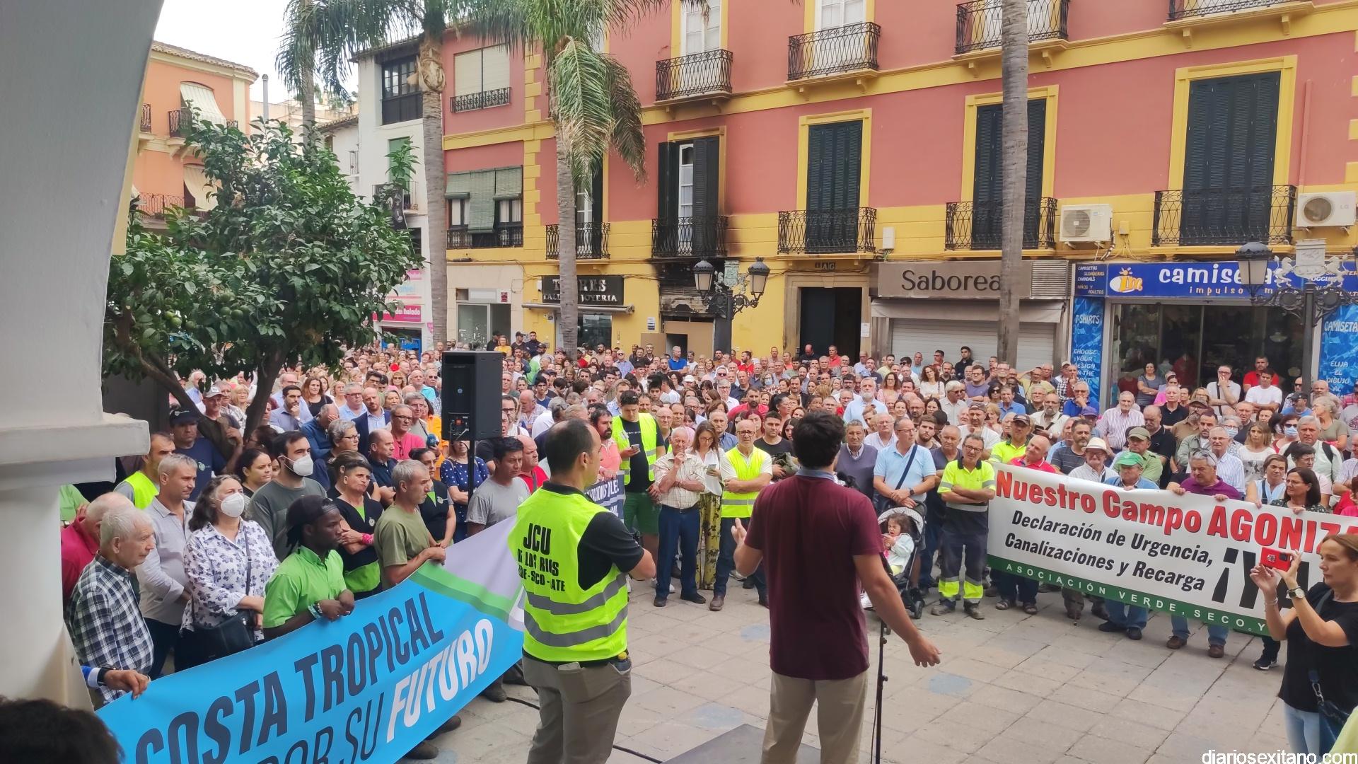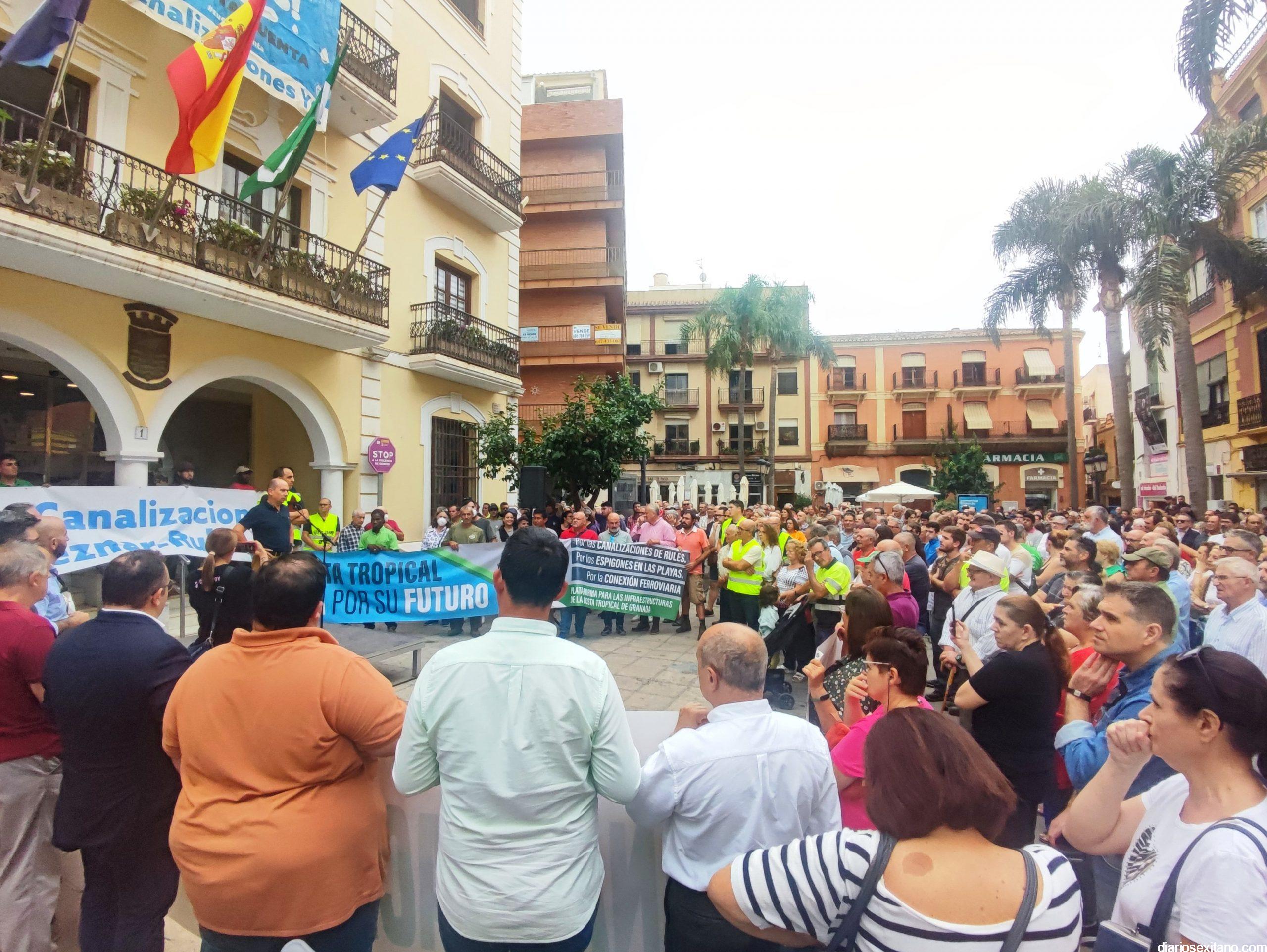 Cientos de vecinos y representantes de todos los sectores económicos locales y comarcales se han concentrado este mediodía en la plaza de la Constitución de Almuñécar ante la convocatoria lanzada desde la Junta Central de Usuarios Ríos Verde Seco y Jate para reivindicar “Agua ya” para la agricultura.
