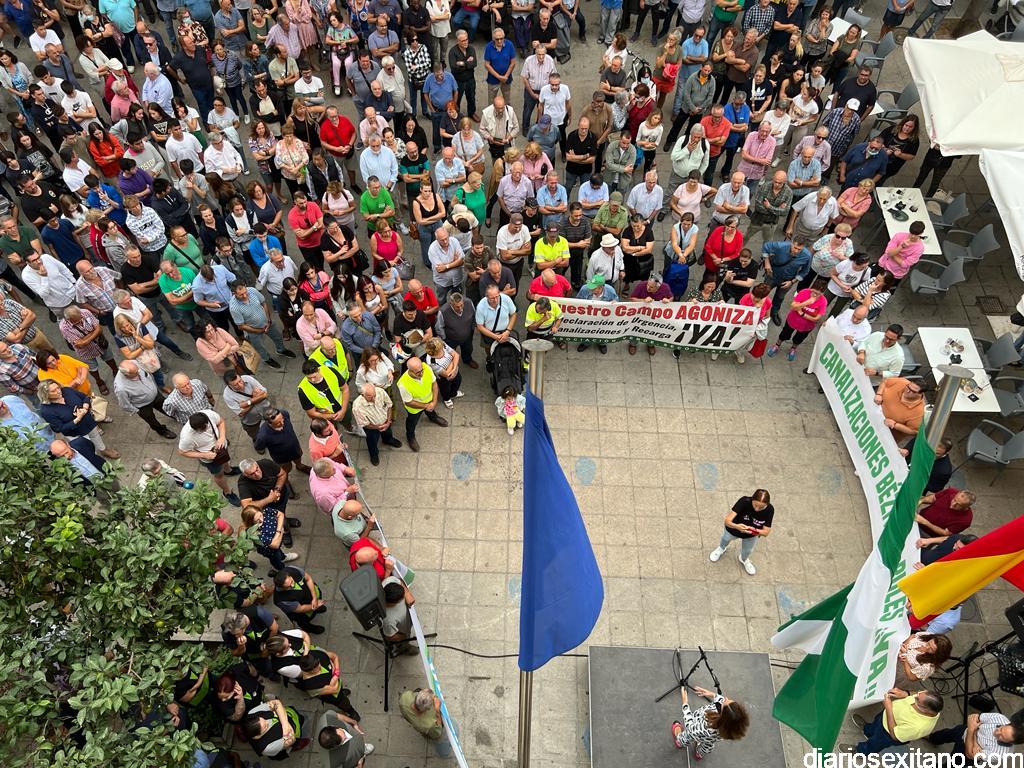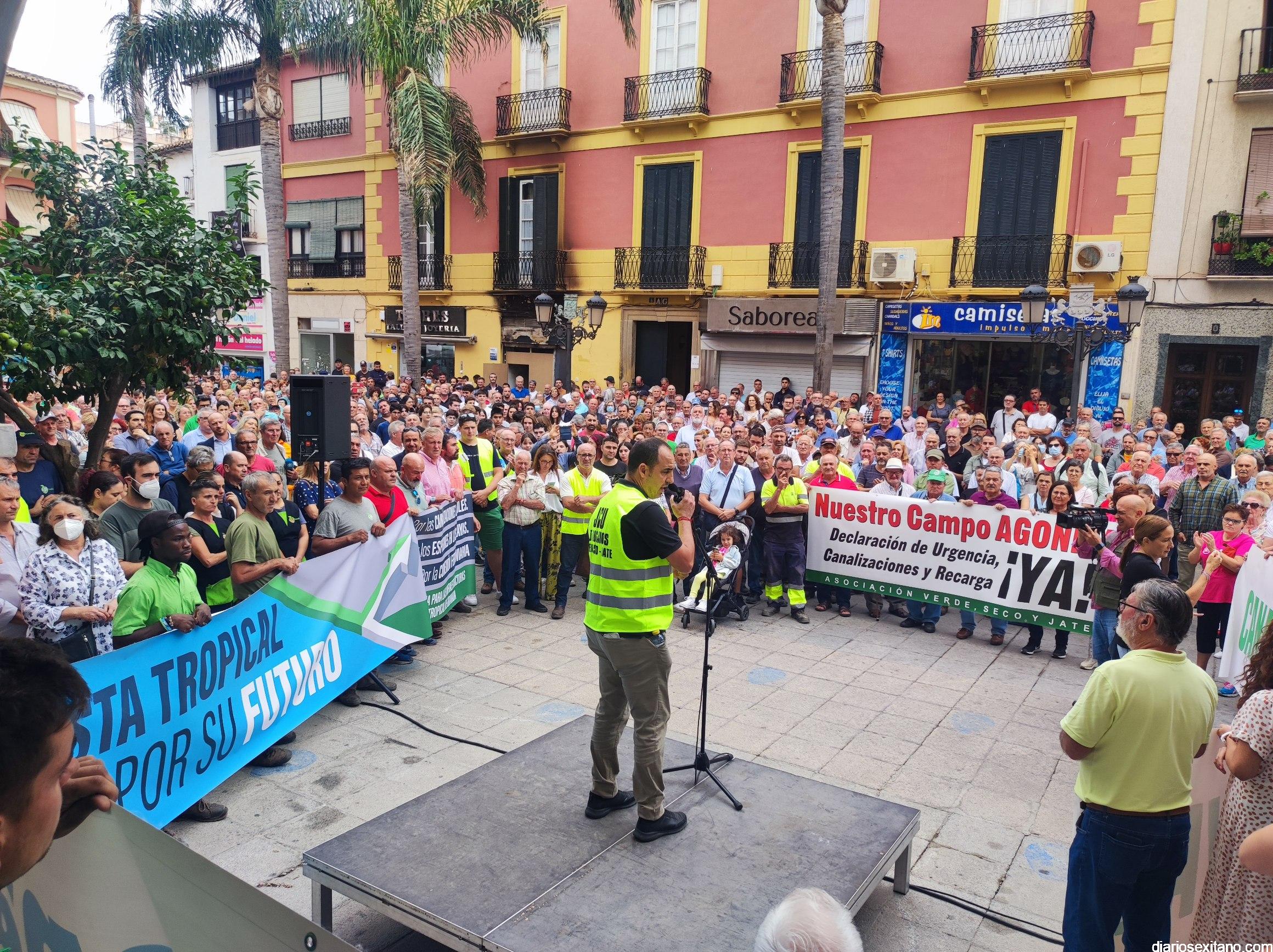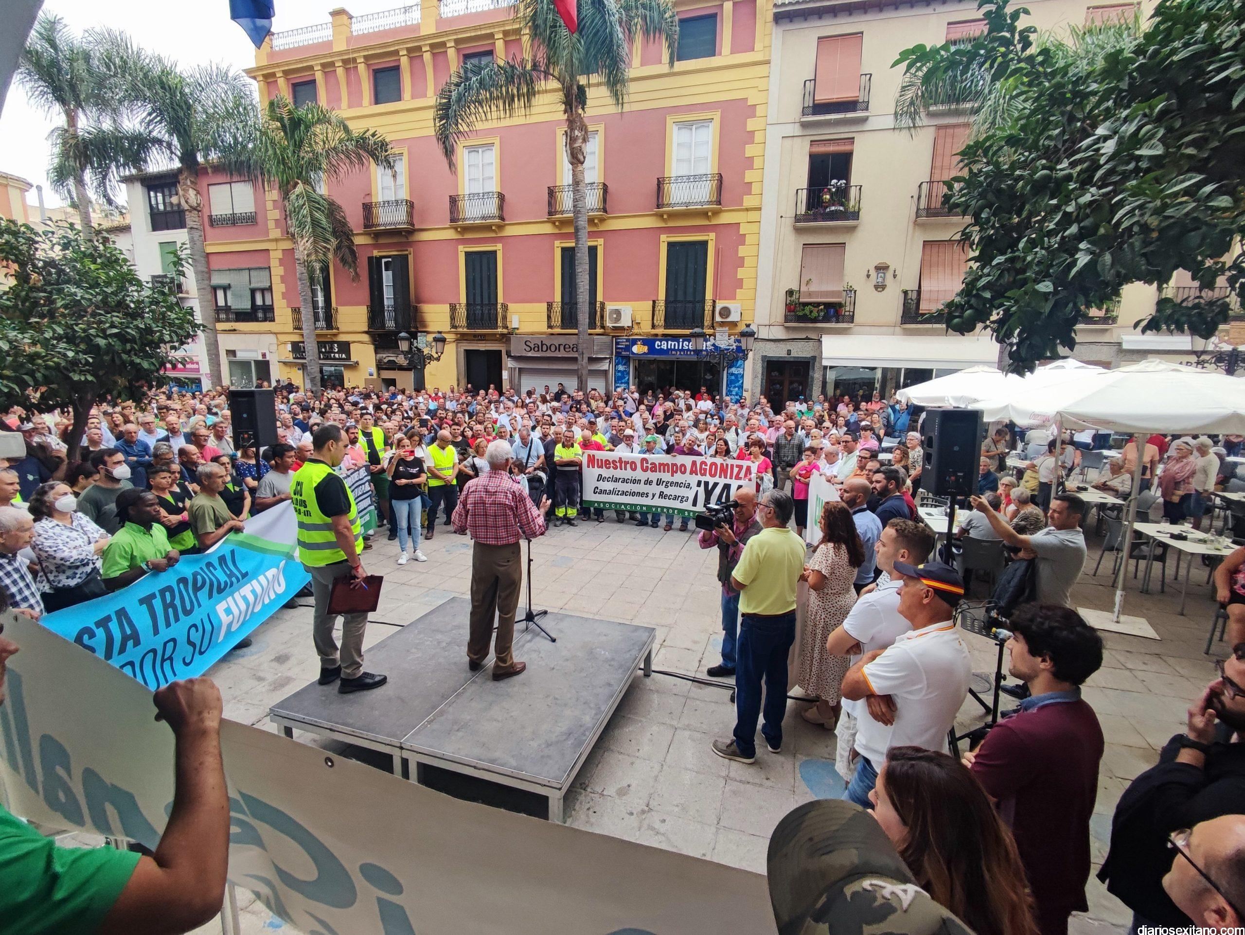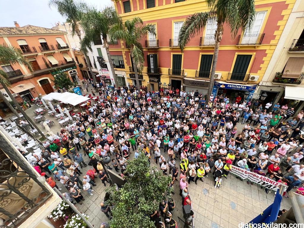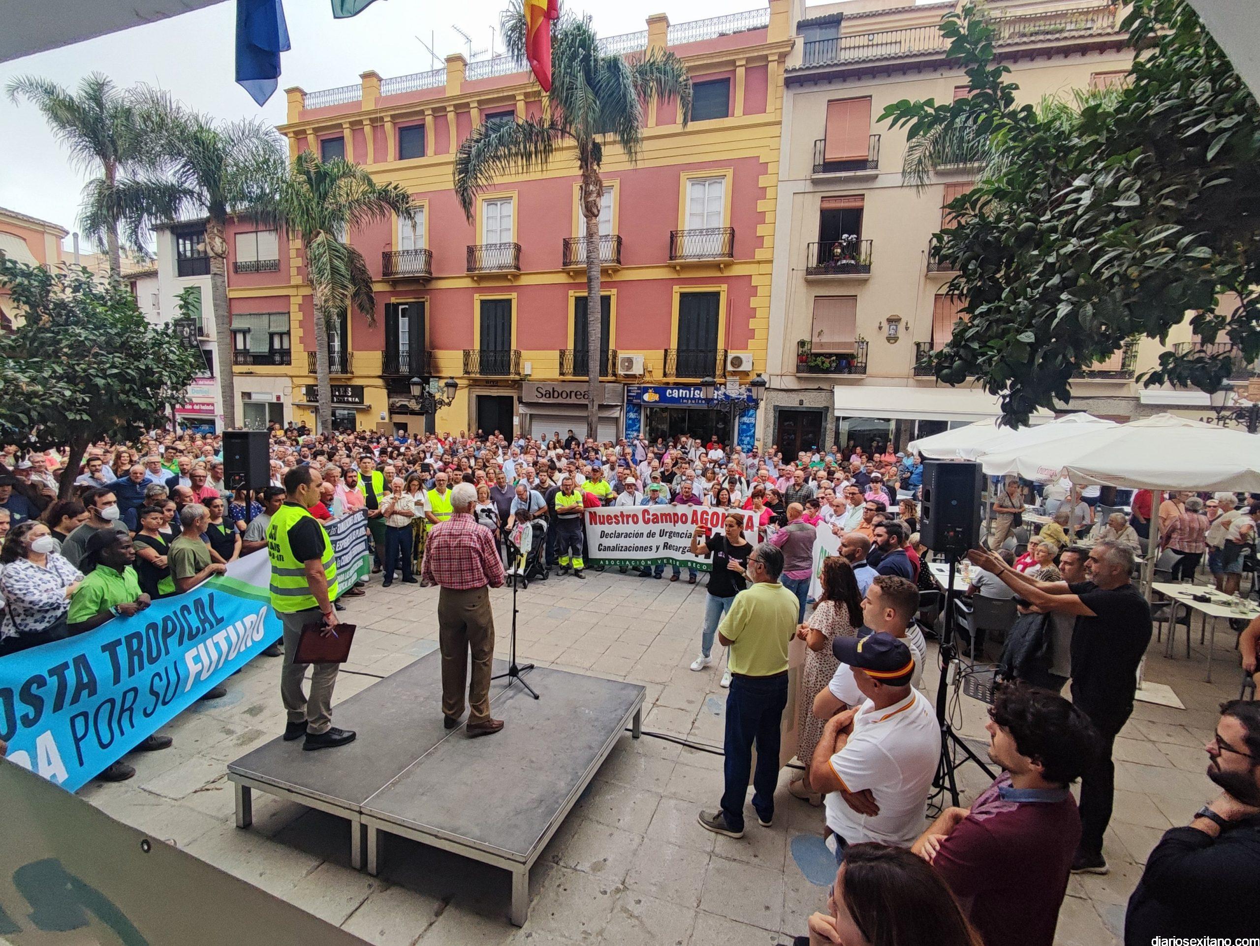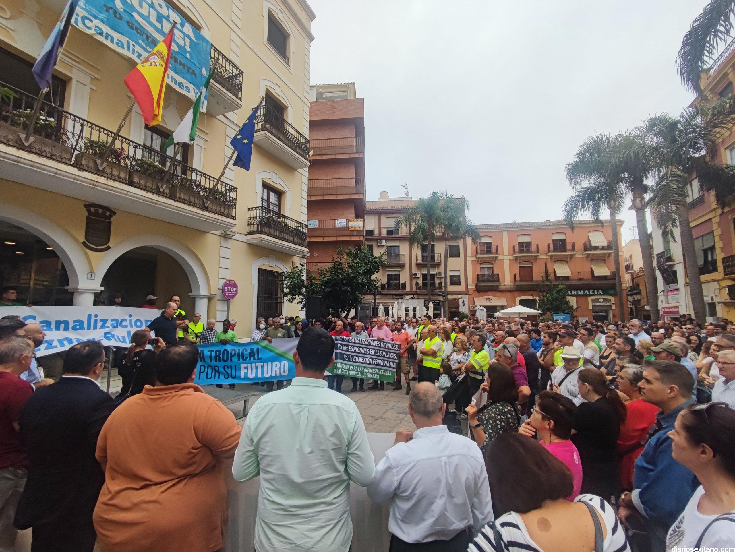 Cientos de vecinos y representantes de todos los sectores económicos locales y comarcales se han concentrado este mediodía en la plaza de la Constitución de Almuñécar ante la convocatoria lanzada desde la Junta Central de Usuarios Ríos Verde Seco y Jate para reivindicar “Agua ya” para la agricultura.