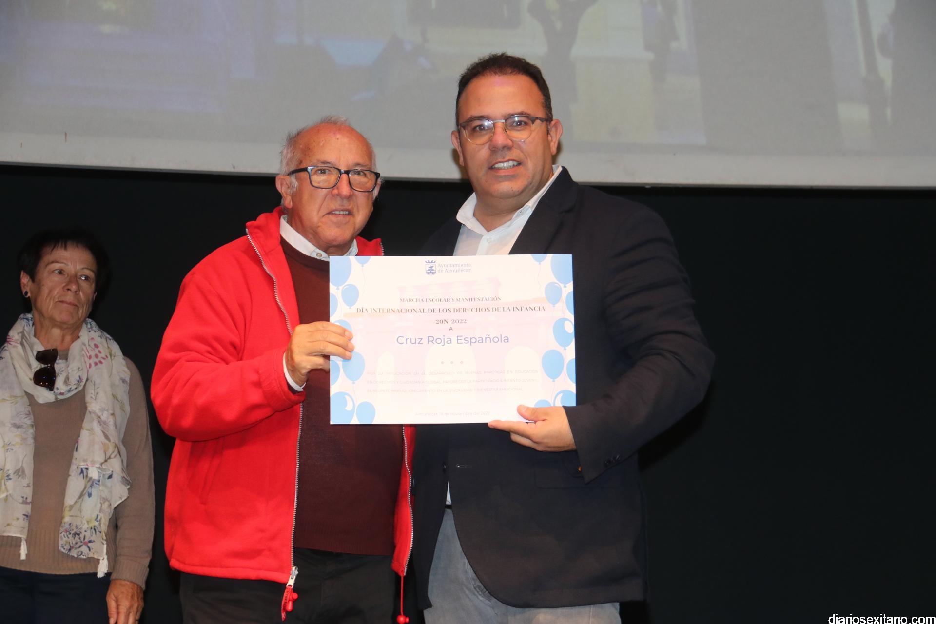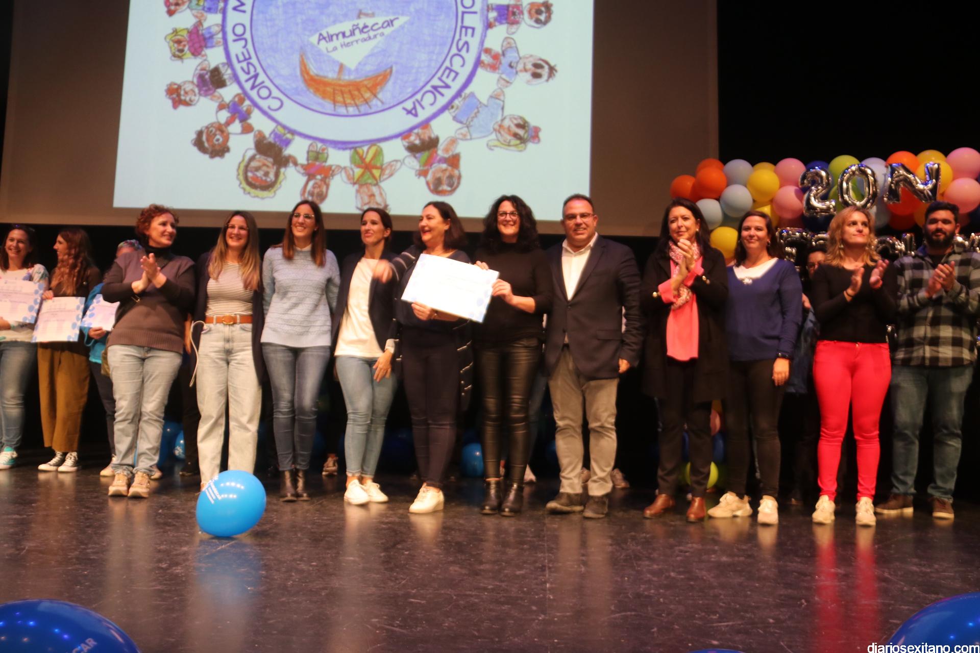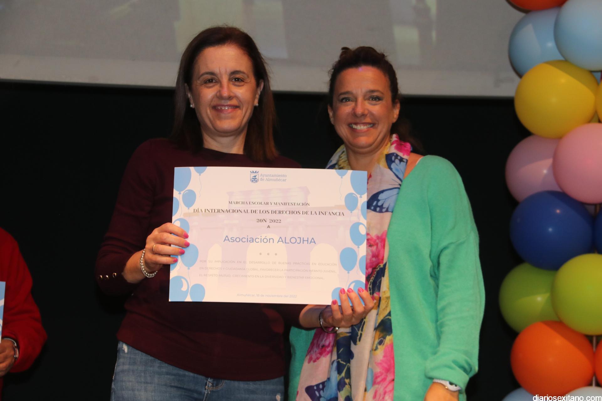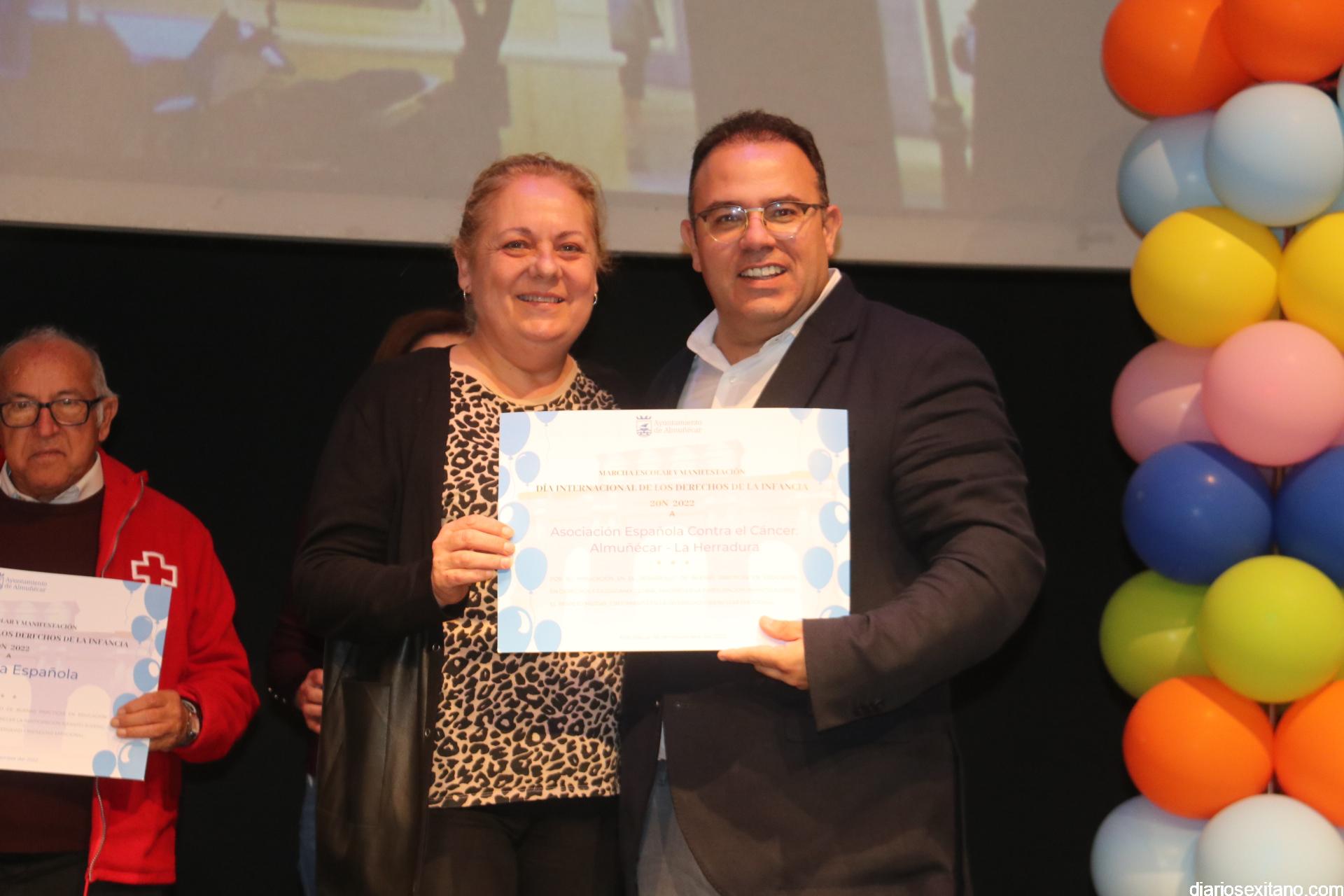 Tras la lectura de los Derechos y Responsabilidades por parte del alumnado, donde recordaron que se cumplen 33 años de éstos, se procedió al reconocimiento a los centros educativos participantes y asociaciones locales como: UNICEF, Asociación Española contra el Cáncer, Manos Unidas, Madres Solas, Cáritas Parroquial, Cruz Roja, ASINAL y ALOJHA. A todos ellos les fue entregado un diploma por su participación.